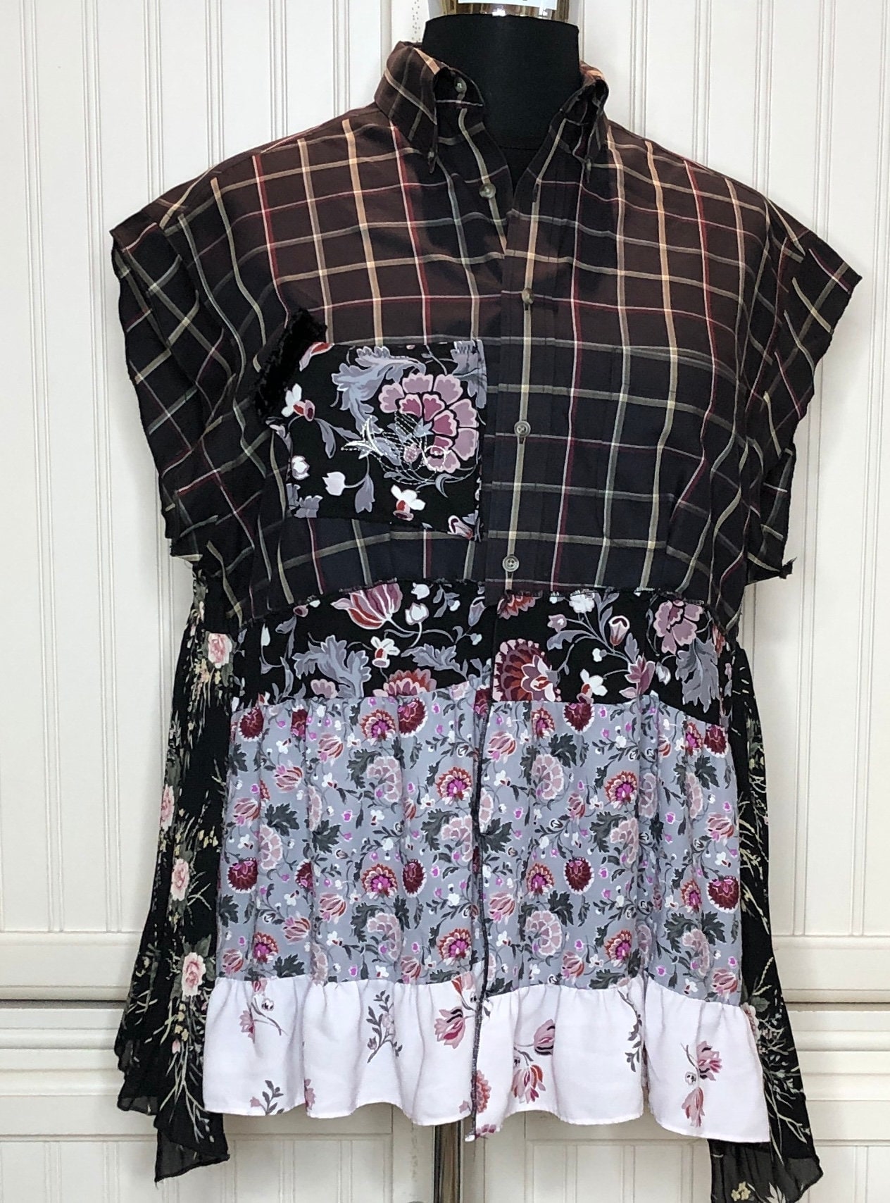 This beautiful women’s shirt was upcycled from a mens black, white, and burgundy plaid cotton shirt and several soft polyester flowered blouses. These were fashioned into this easy fitting 2X shirt. The main body is the cotton shirt with 5 button front close, but th3 flowered skirt front is open. The bottom back and sides of the shirt area soft polyester black with floral print. The shirt has small band sleeves that slightly cover the arms. This is all fashioned into a beautiful flattering style. You can wear this as a shirt or pair it with a turtleneck and wear it as an open vest. The possibilities to style are open to your imagination.