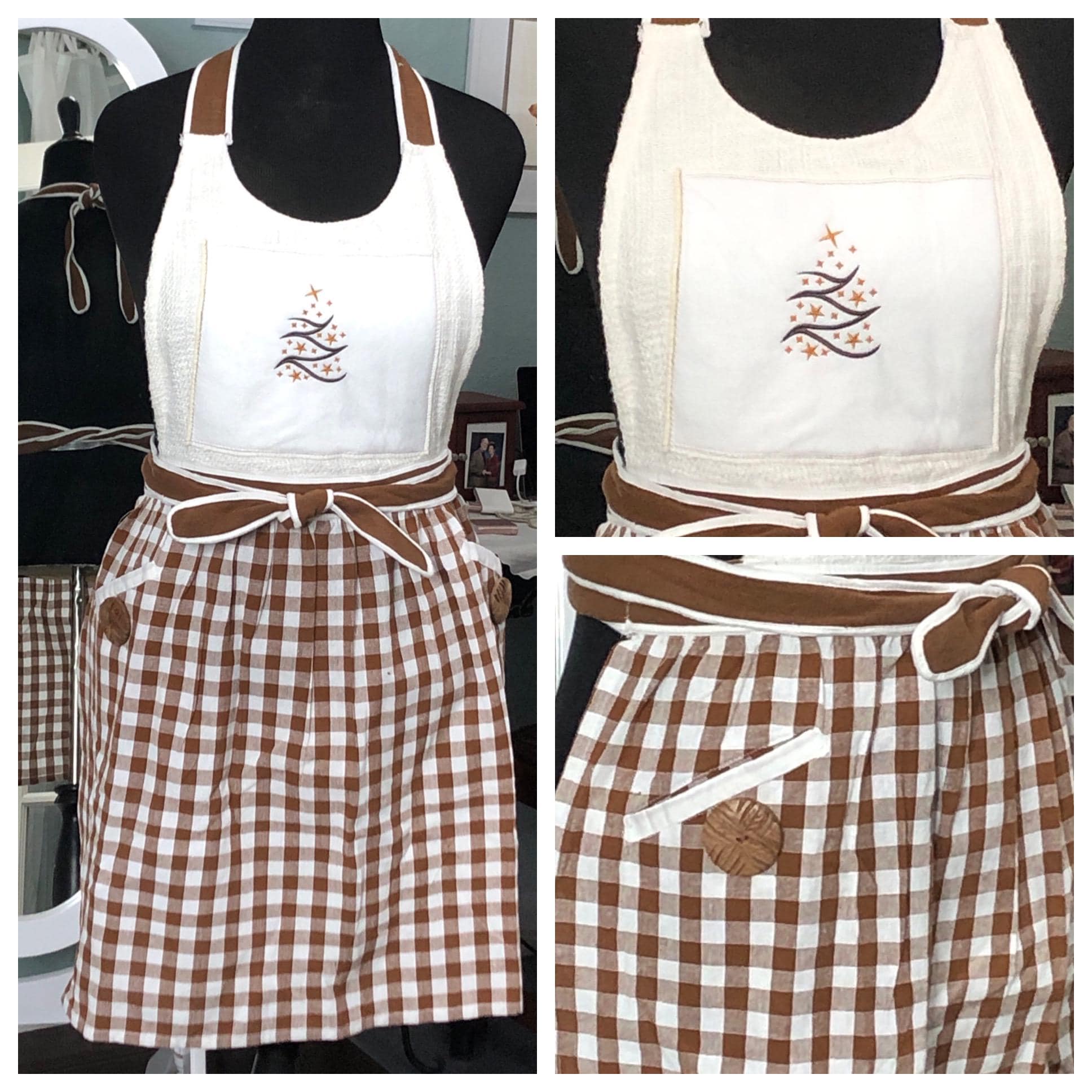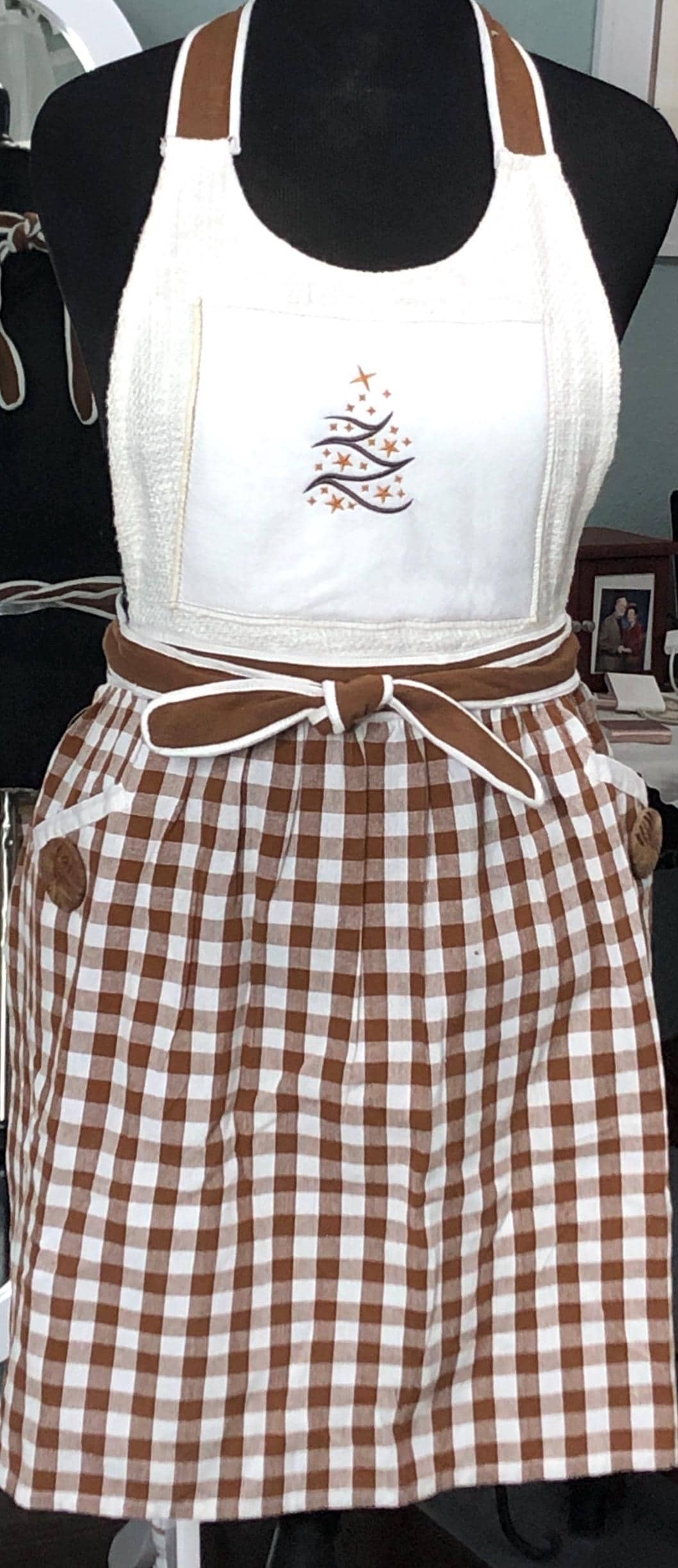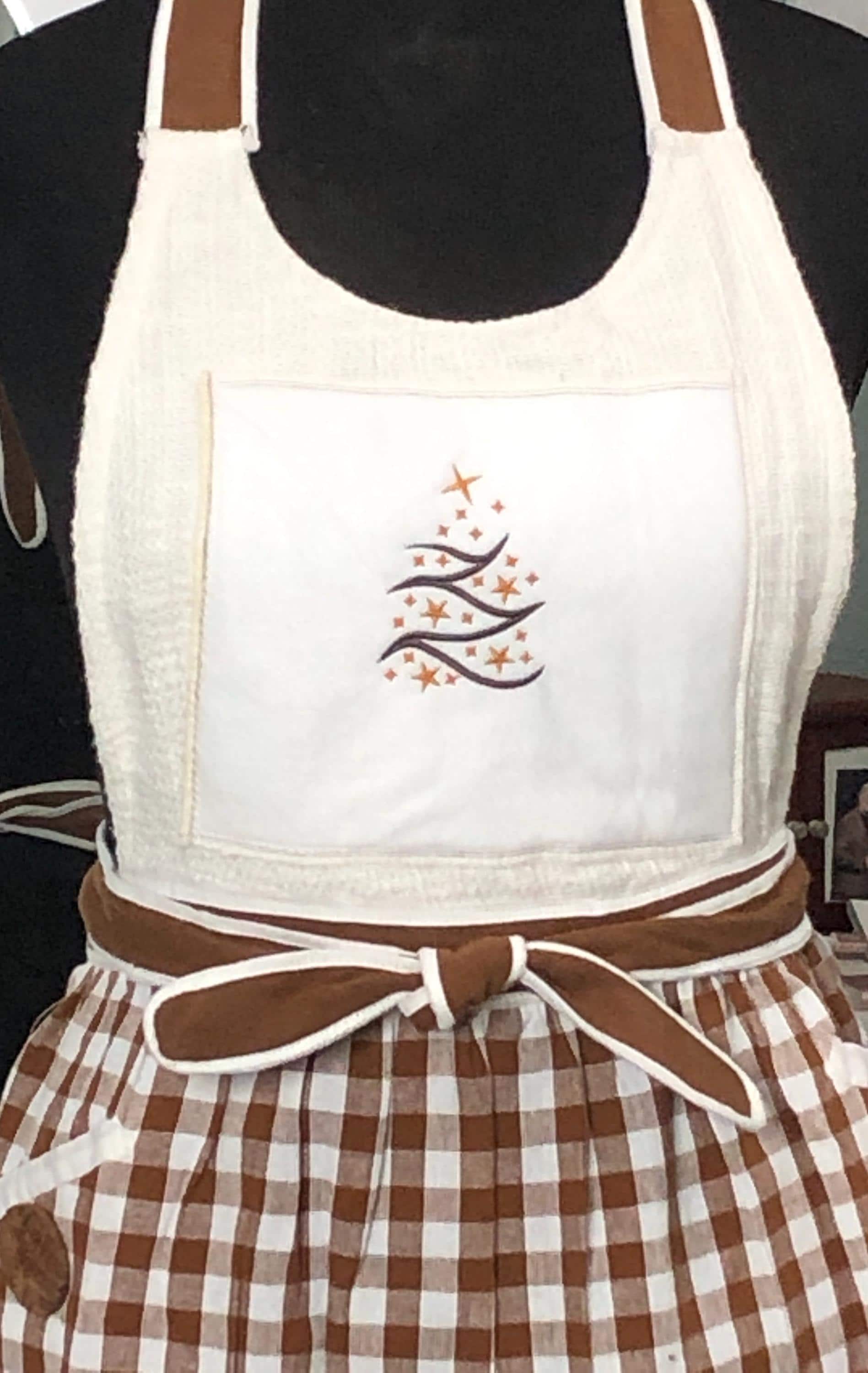 This is the perfect Christmas baking apron. It has a large brown vintage button on each pocket.  The front bodice is embroidered with a Christmas tree on an off white square. The skirt of the apron is a gingerbread brown and cream check fabric.