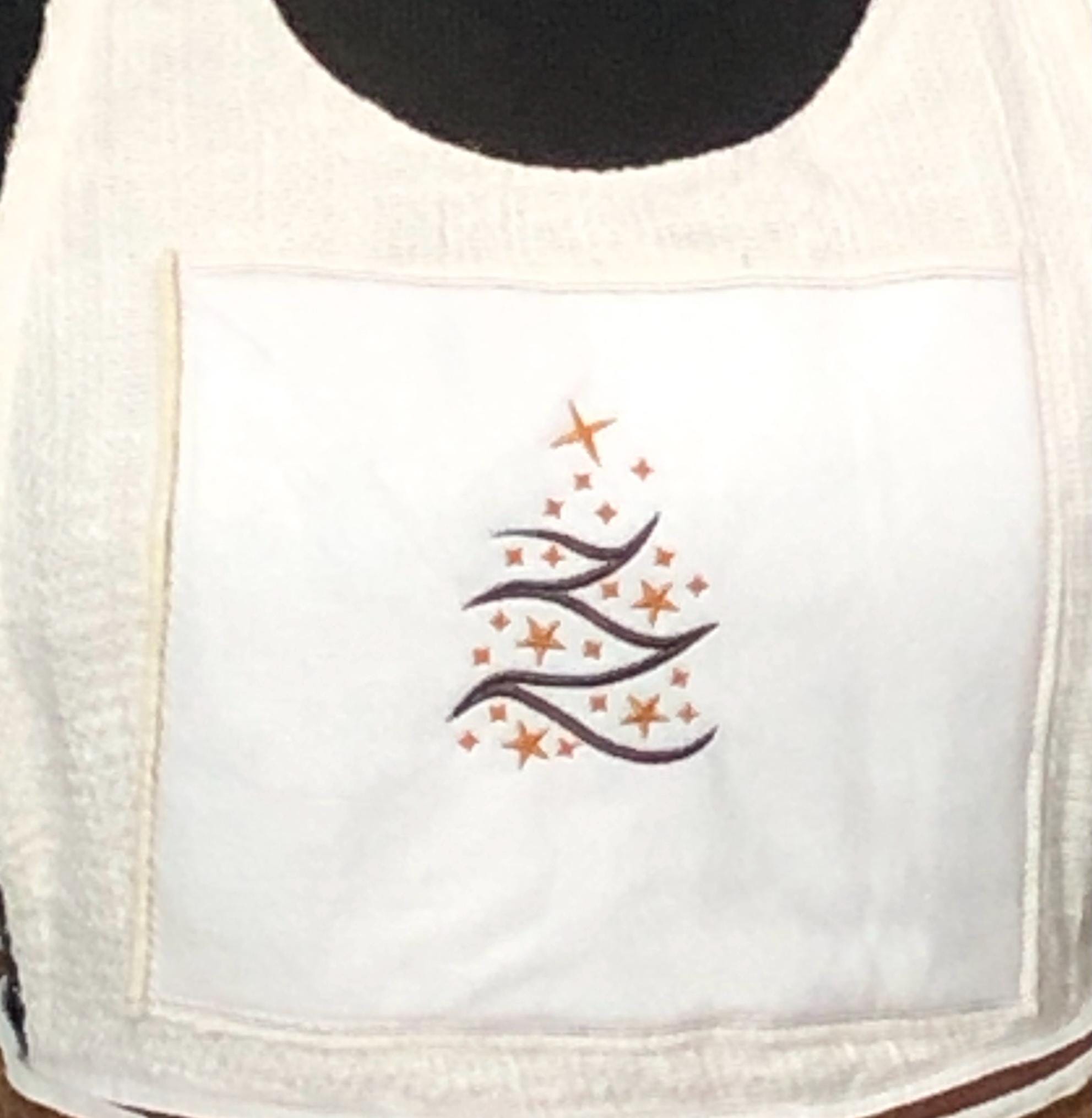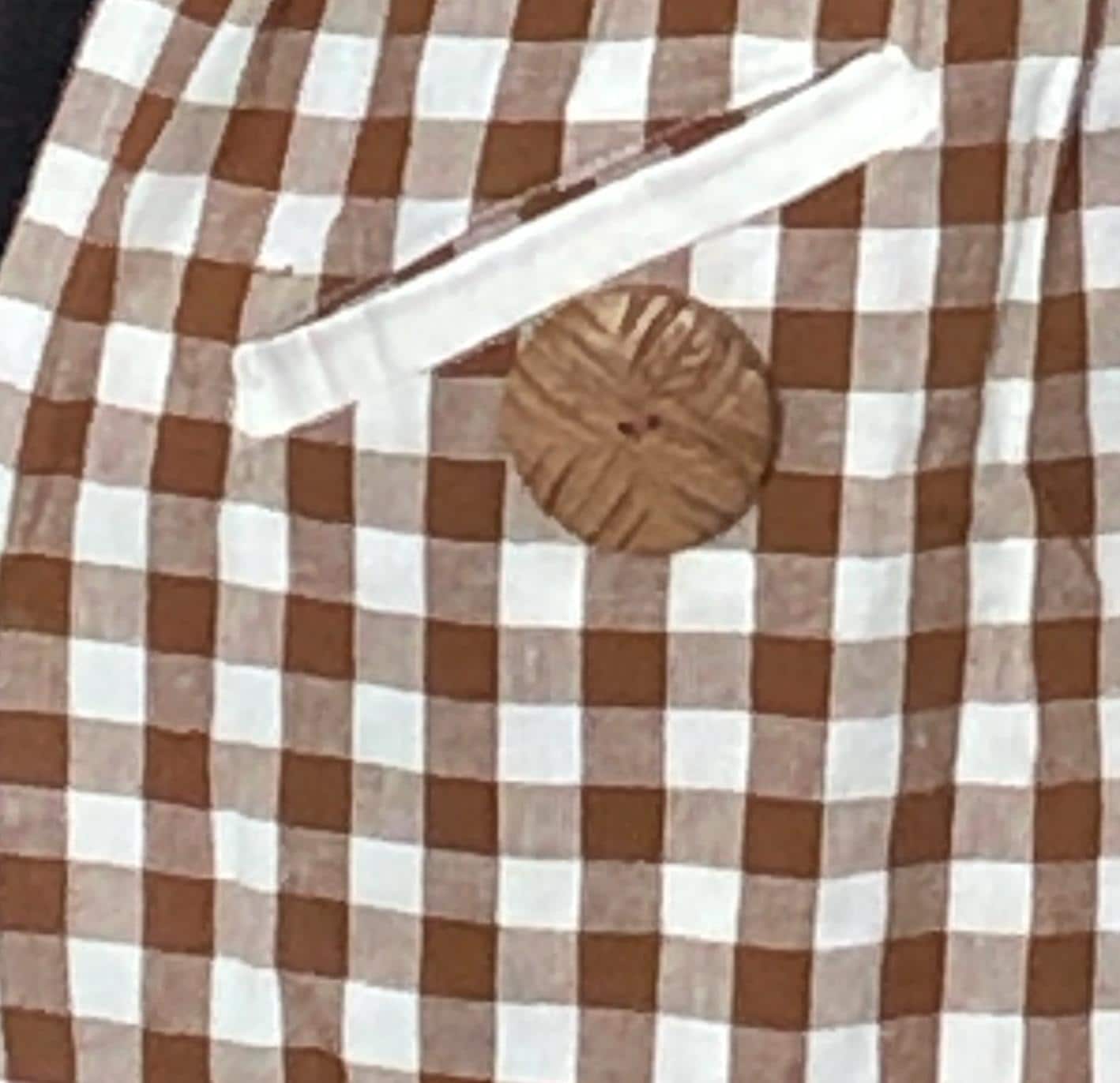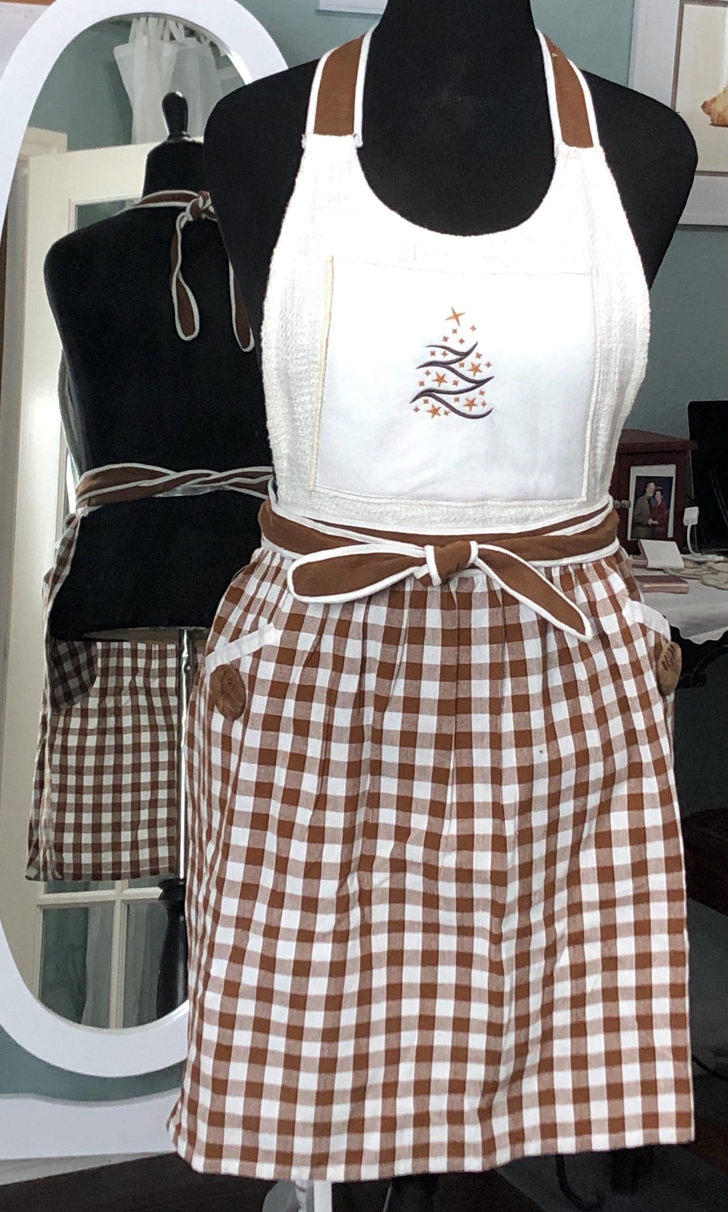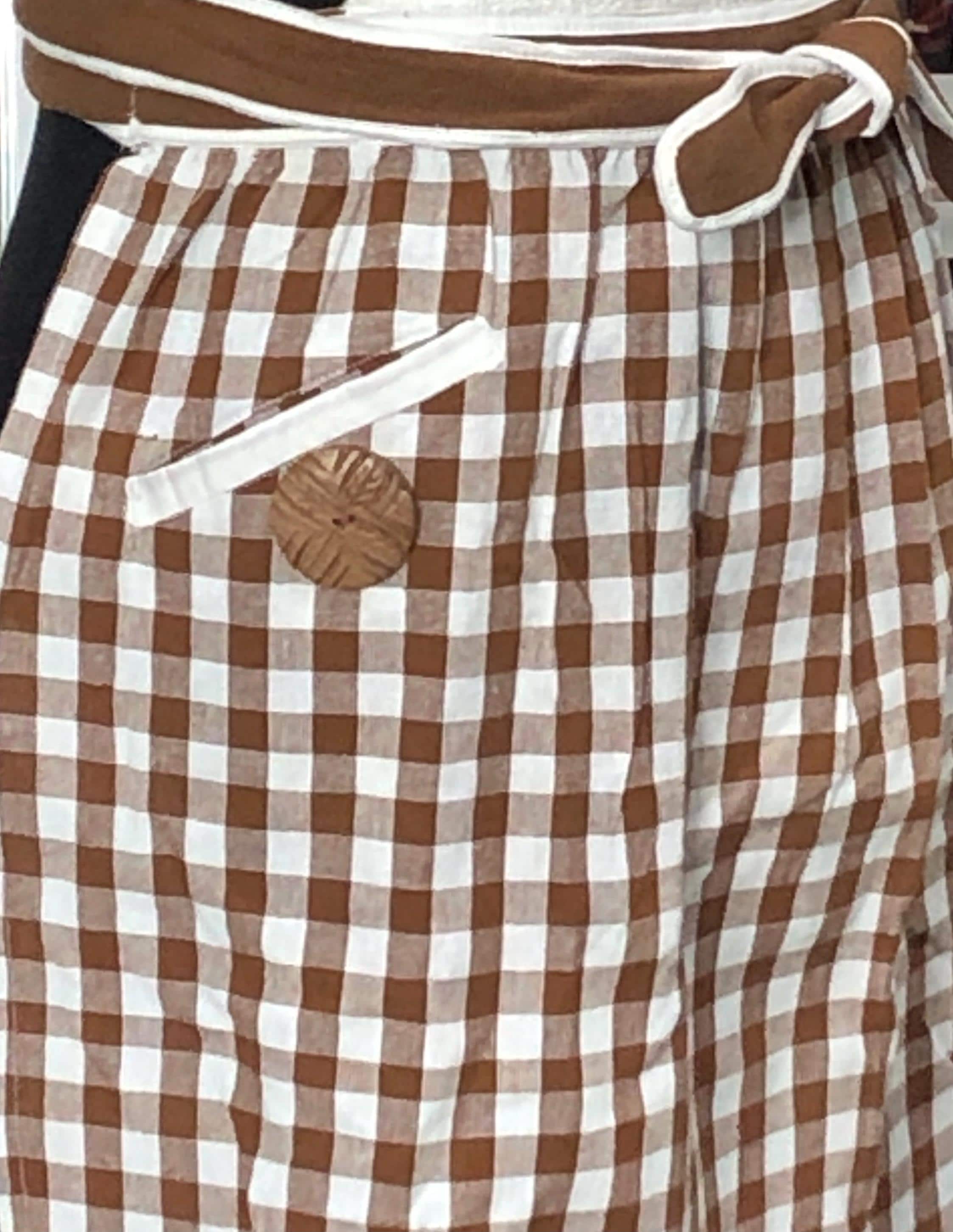 This is the perfect Christmas baking apron. It has a large brown vintage button on each pocket.  The front bodice is embroidered with a Christmas tree on an off white square. The skirt of the apron is a gingerbread brown and cream check fabric.