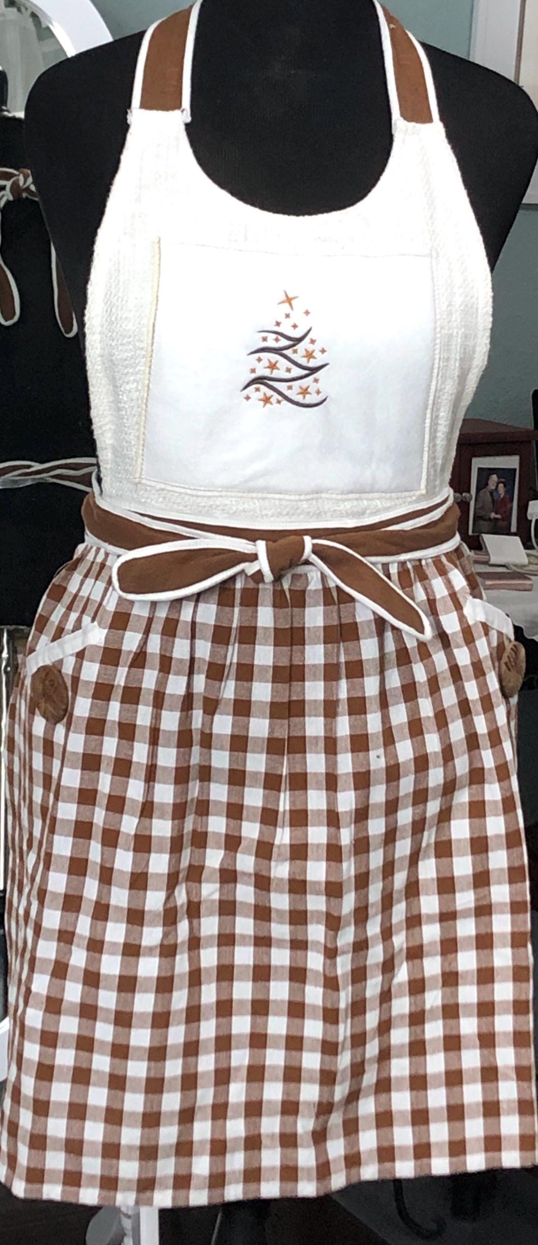 Womens Christmas apron holiday christmas tree embroidered apron gingerbread brown cream check apron vintage button pocket trim