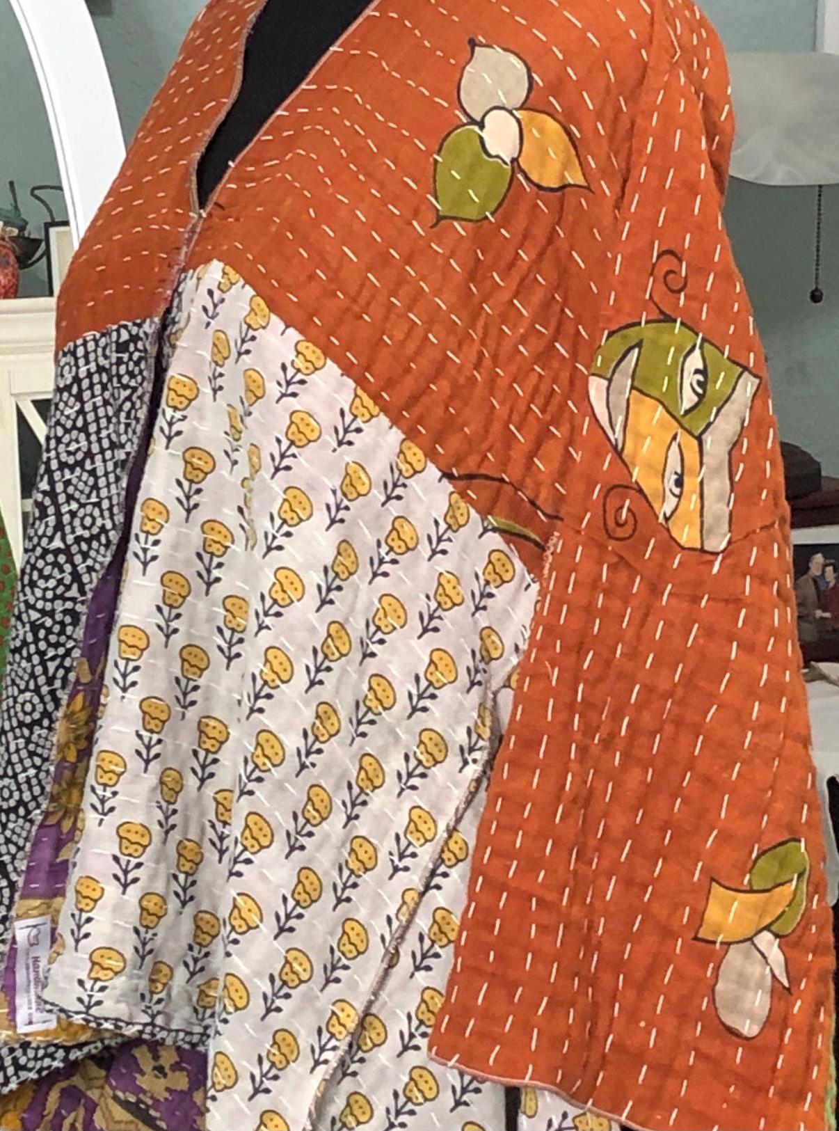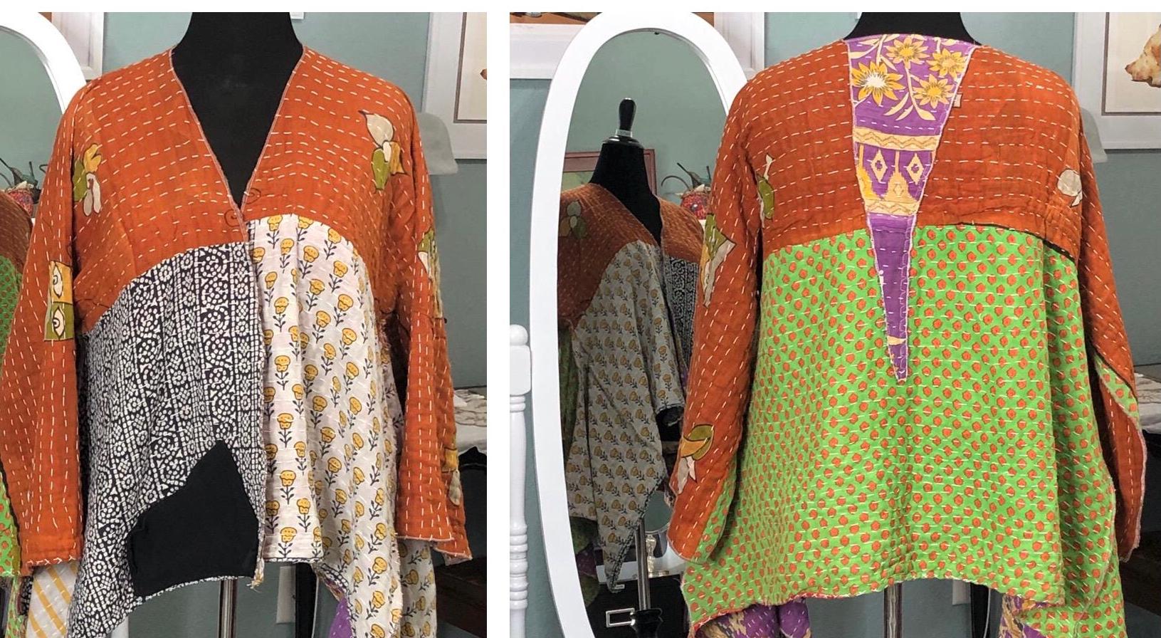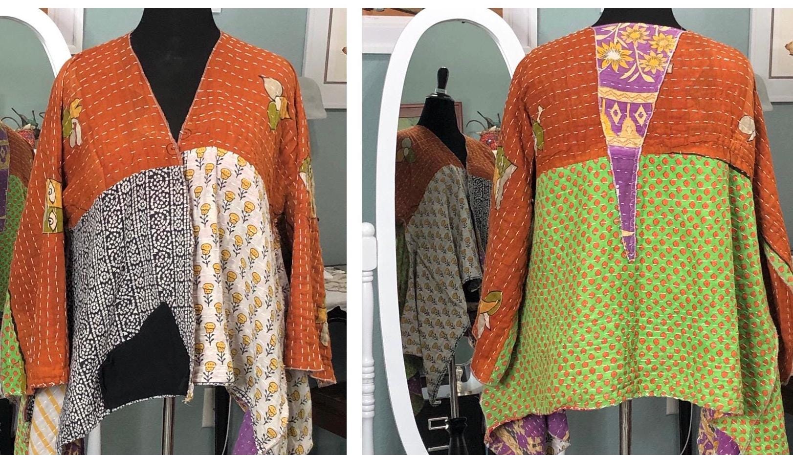 This beautiful one of a kind handmade short shrug jacket is a special statement piece. It’s reversible and just as beautiful on the purple with sunflower print side as it is on the orange and green side, double beauty however you choose to wear it. It’s perfect to wear for casual with jeans or dress it up for dinner out. The pattern is what is called a Zero Waste French Fold Shrug. It is made from soft kantha cotton quilts . The 3/4 sleeves are a kimono style. this shrug style is free size and will fit from a Small to a 2X easily. Please check the measurements below to ensure a perfect fit.