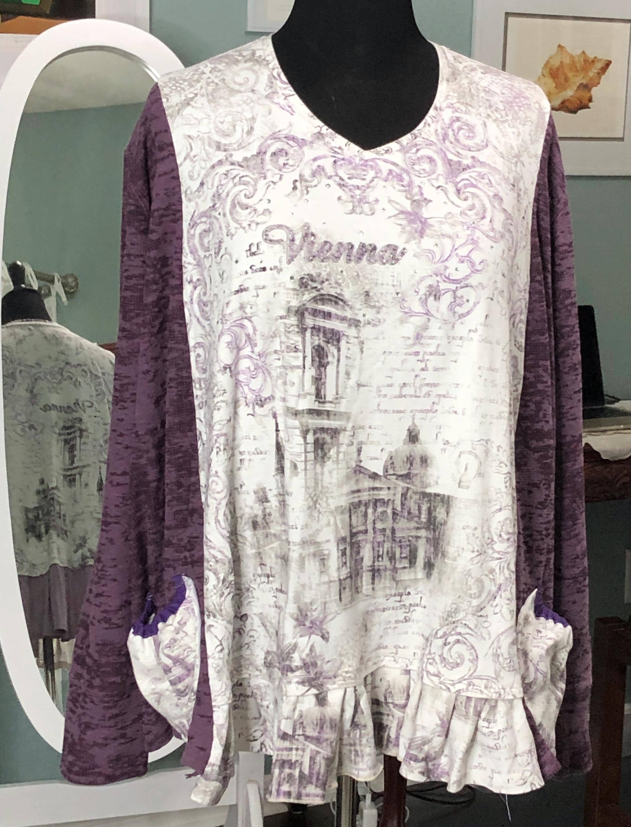 This easy fitting women's tee shirt tunic is a pairing of a soft light weight tee shirt and a Vienna graphic print with rhinestones tee shirt. The top is a colorful scenic print print on white with light weight purple sides and long sleeves with a ruffled hem in a flattering A line style. The top is made from several different upcycled pieces, but the inspiration started with the front piece. I wanted to keep the beauty of this themed print, but upcycled it to a more comfortable fitting piece.