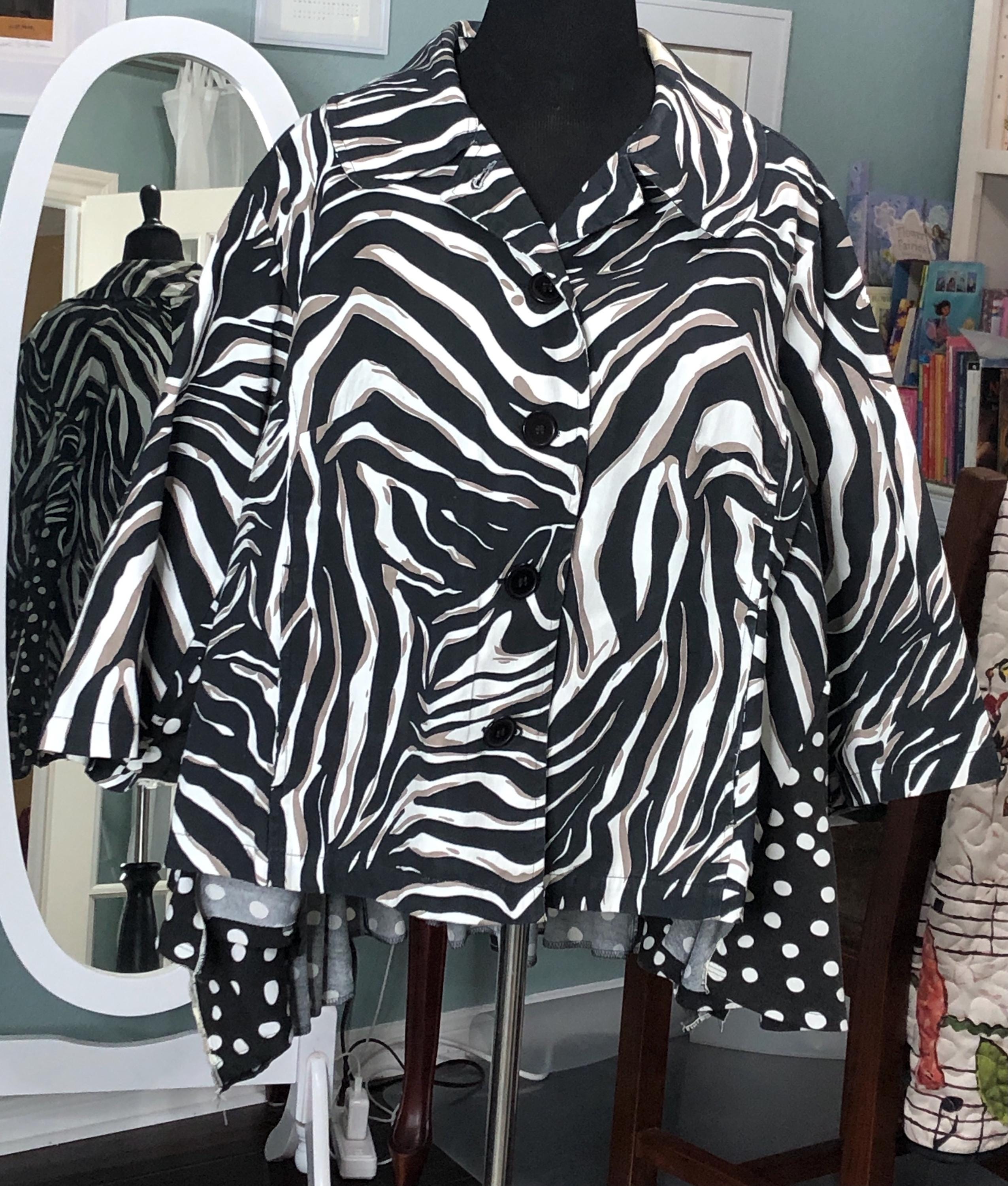 This zebra striped cotton jacket with its assymetric hem and polka dot sides is one of a kind beautiful. The sides and sleeves have been opened up and a silky black and white polyester dress has been upcycled to make it into a cape like fit. This is a stylish shorter jacket with a polka dot ruffle adorning the back hemline. Itβs stylish for any occasion.