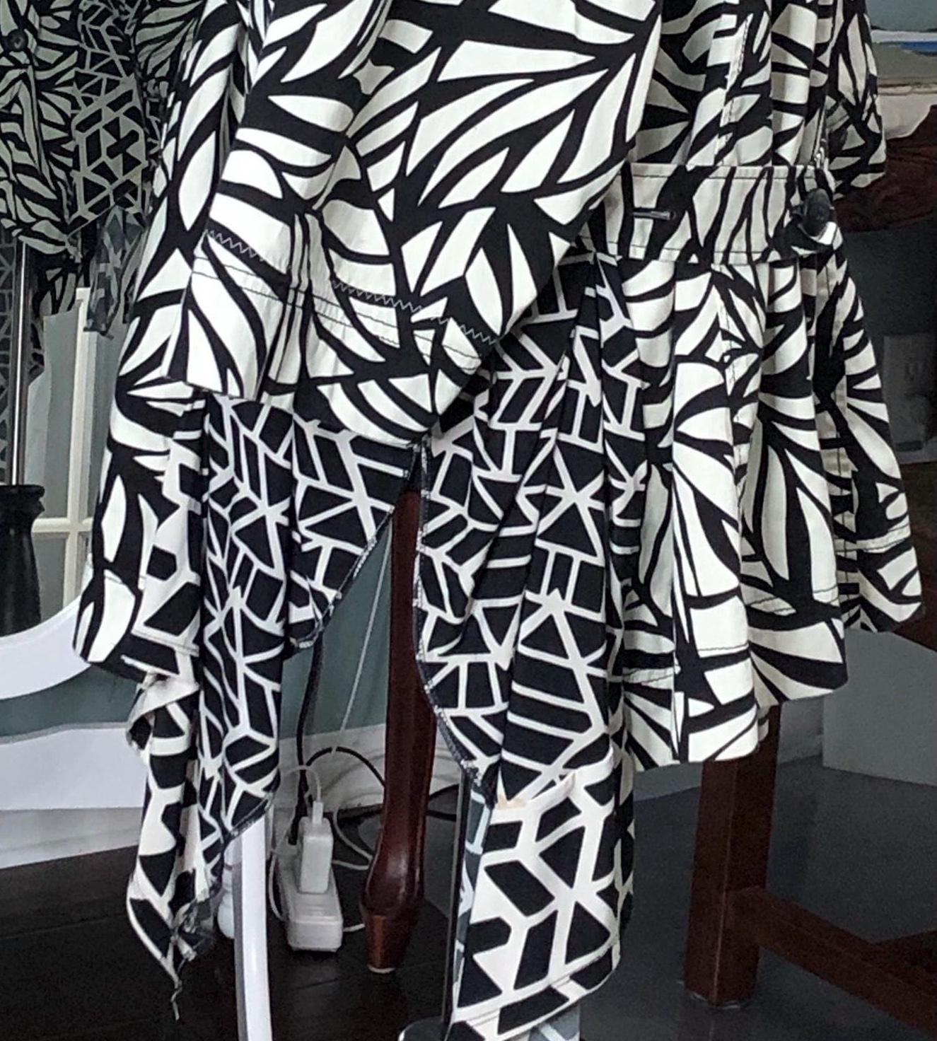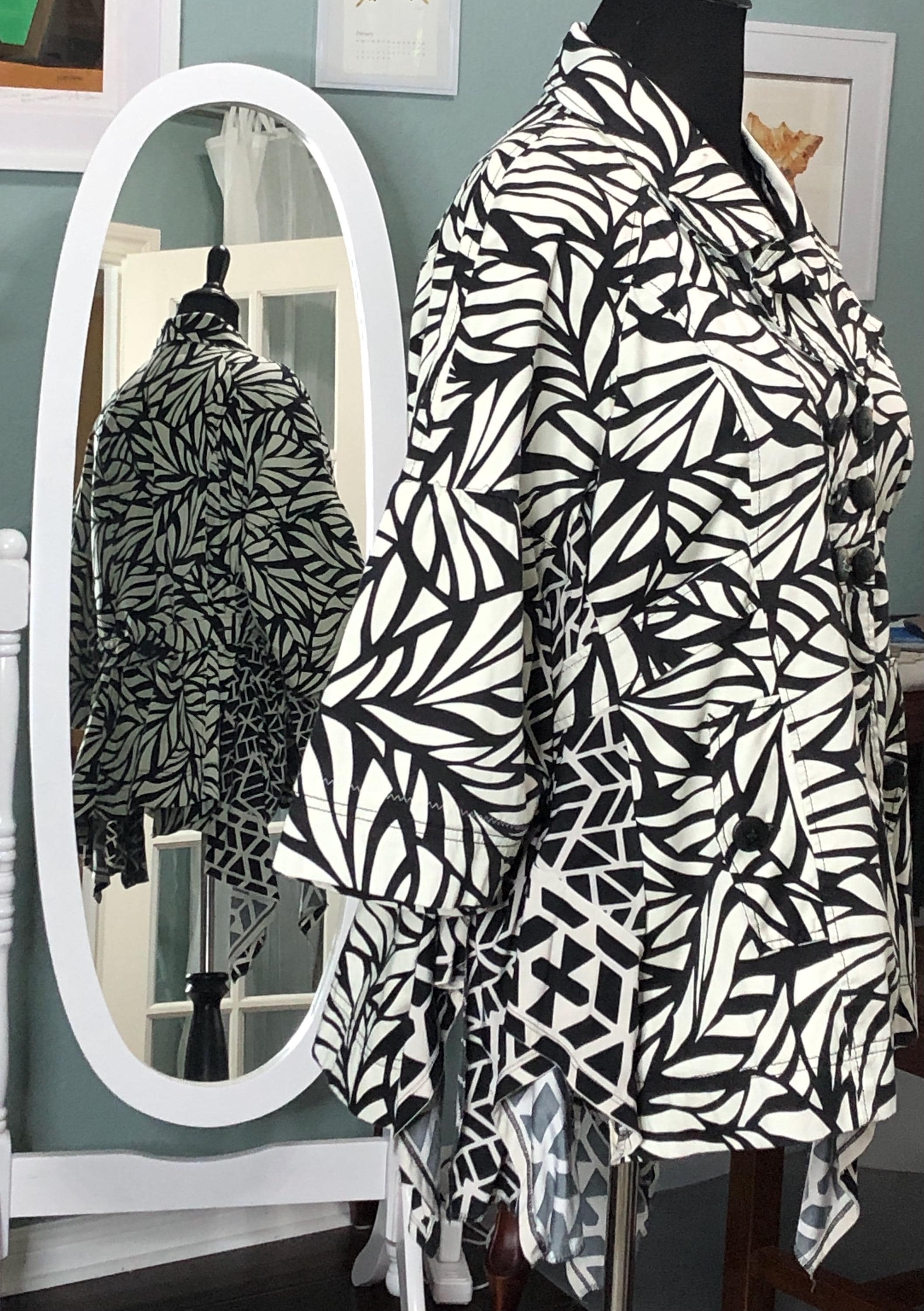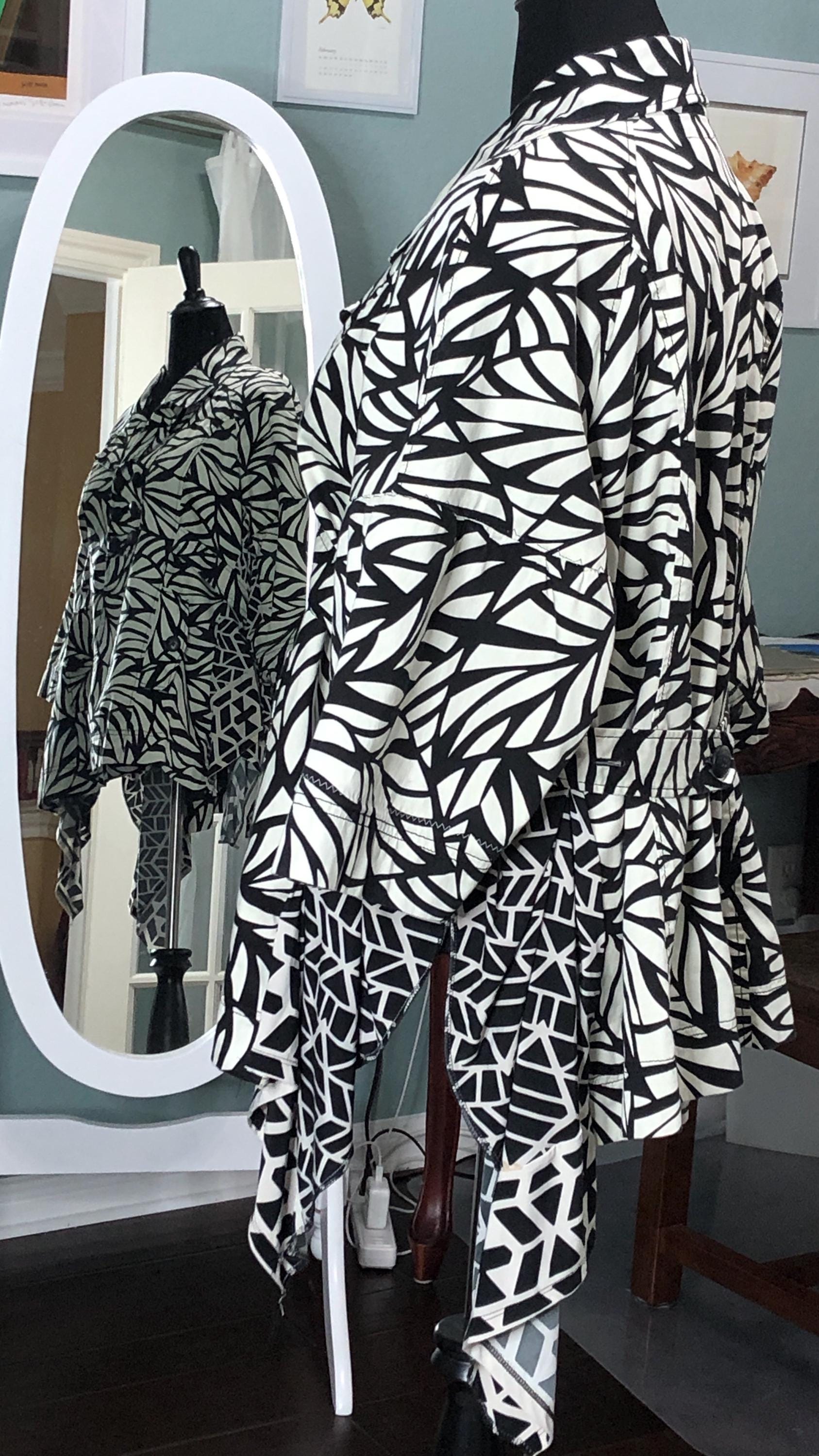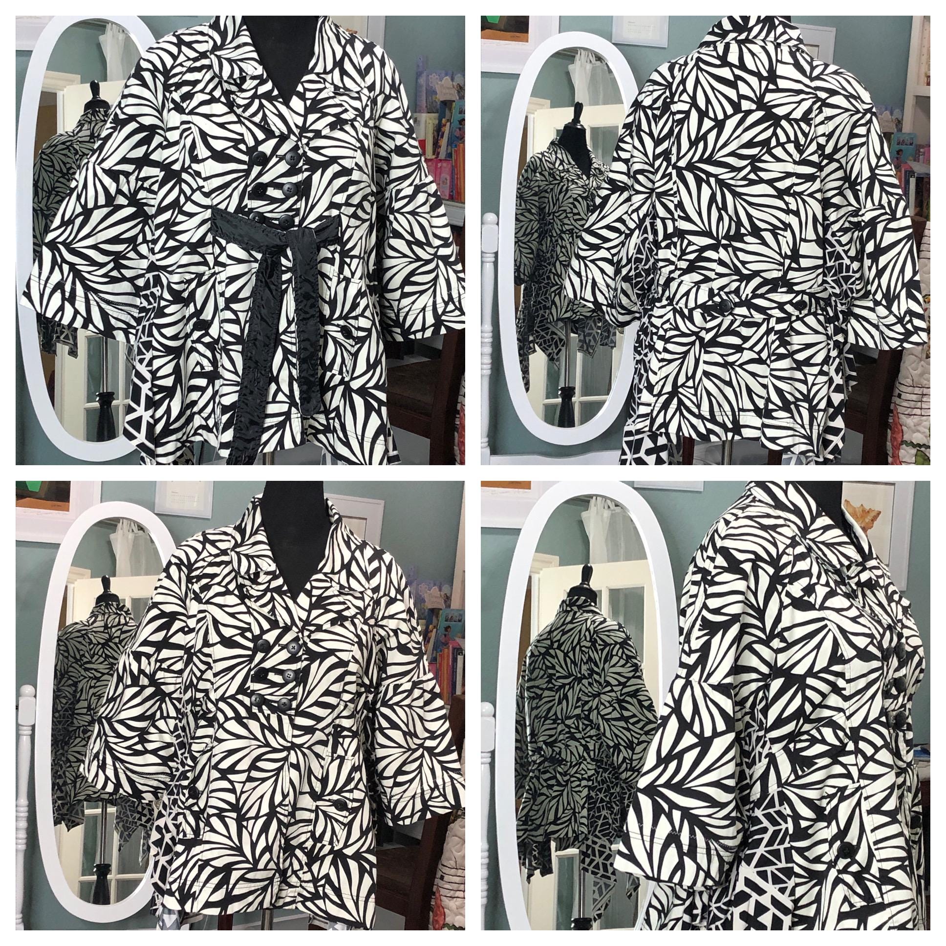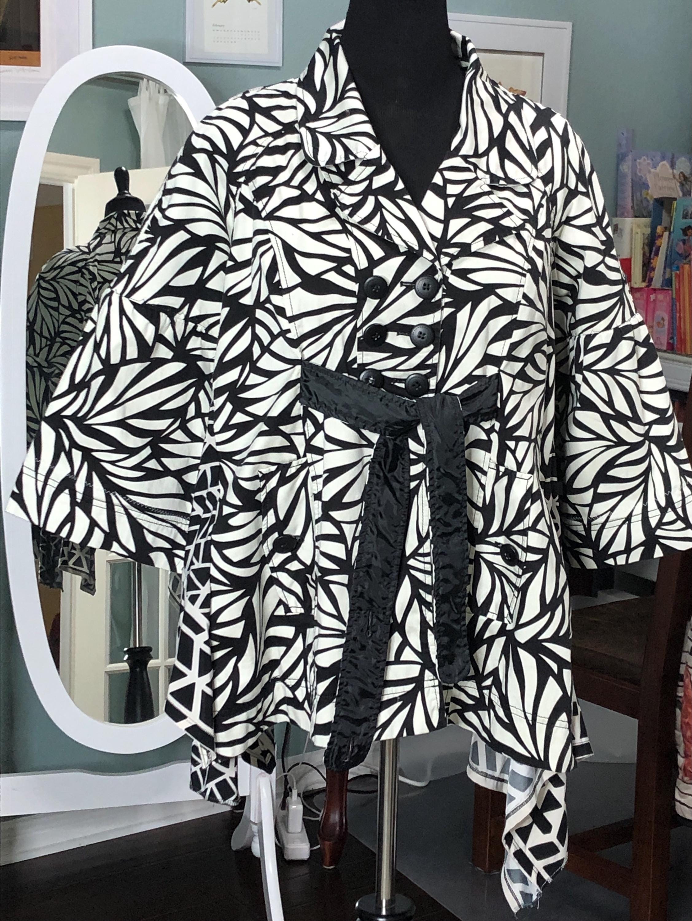 This beautiful jacket with its stow way tie and button belt in an abstract print is a one of a kind beautiful. The sides and sleeves have been opened up and a silky black and white polyester dress has been upcycled to make it into a cape like fit. There is even a special belt/ tie front added to make this an adjustable fitting piece.