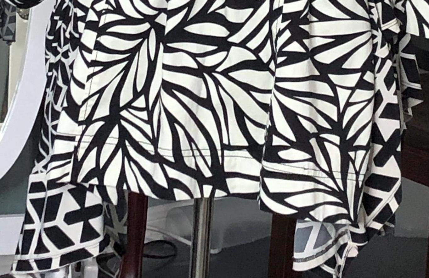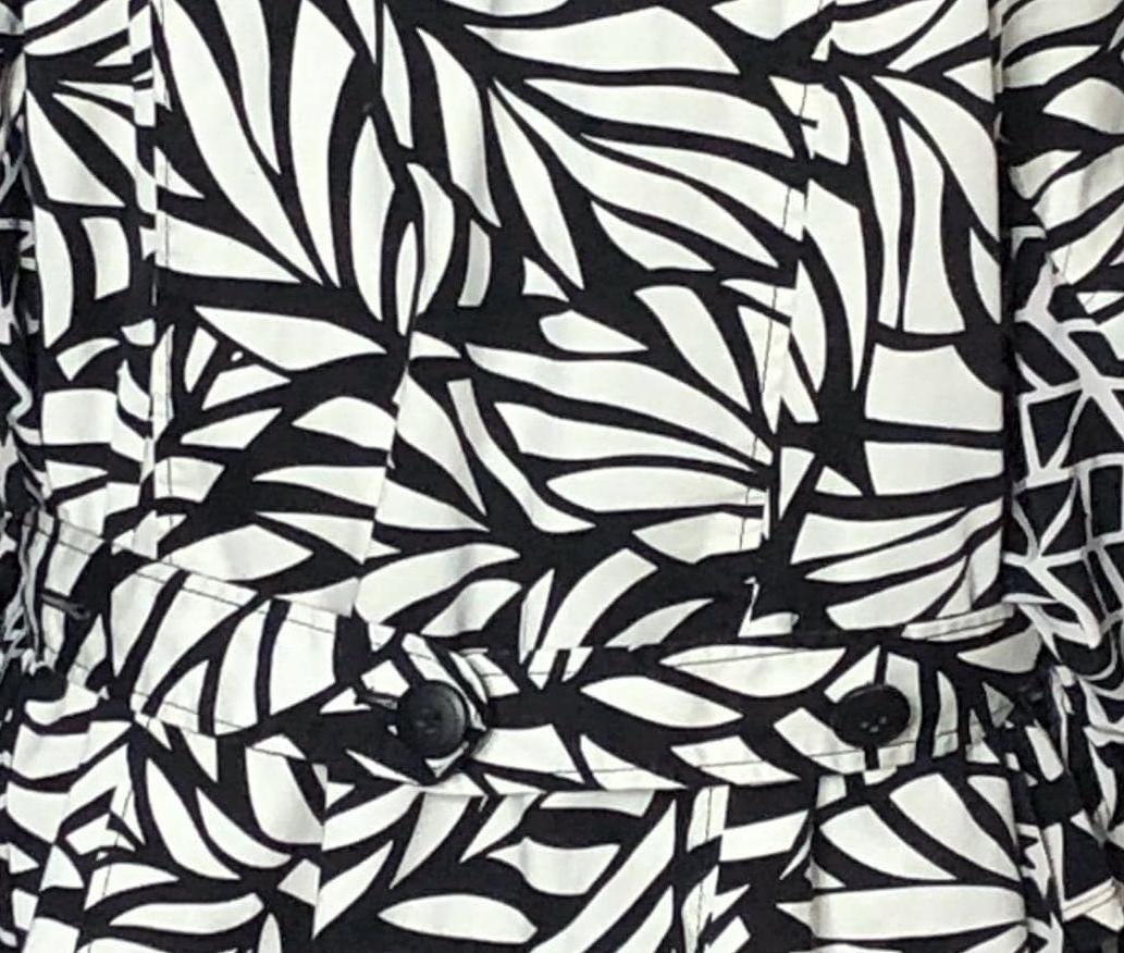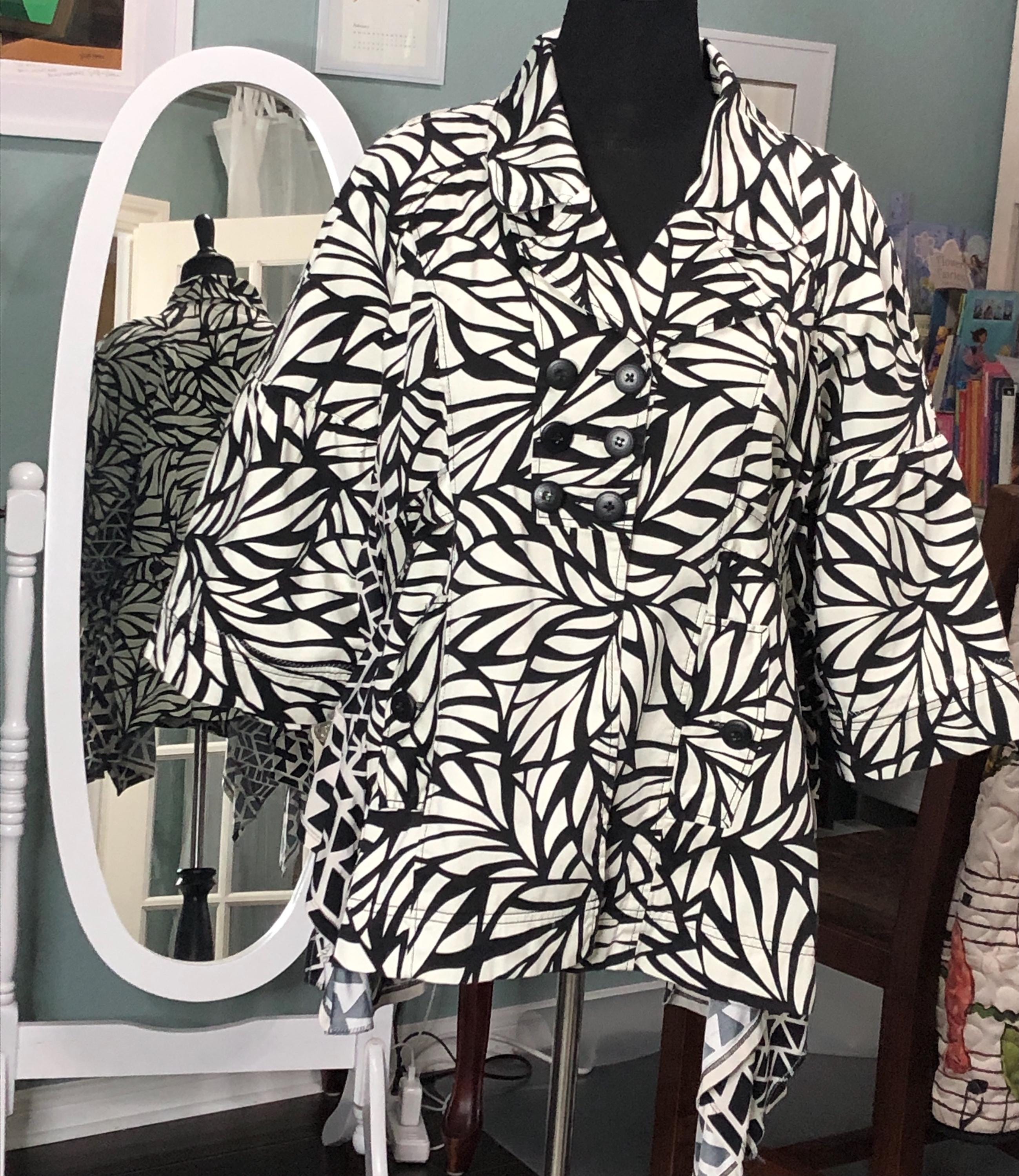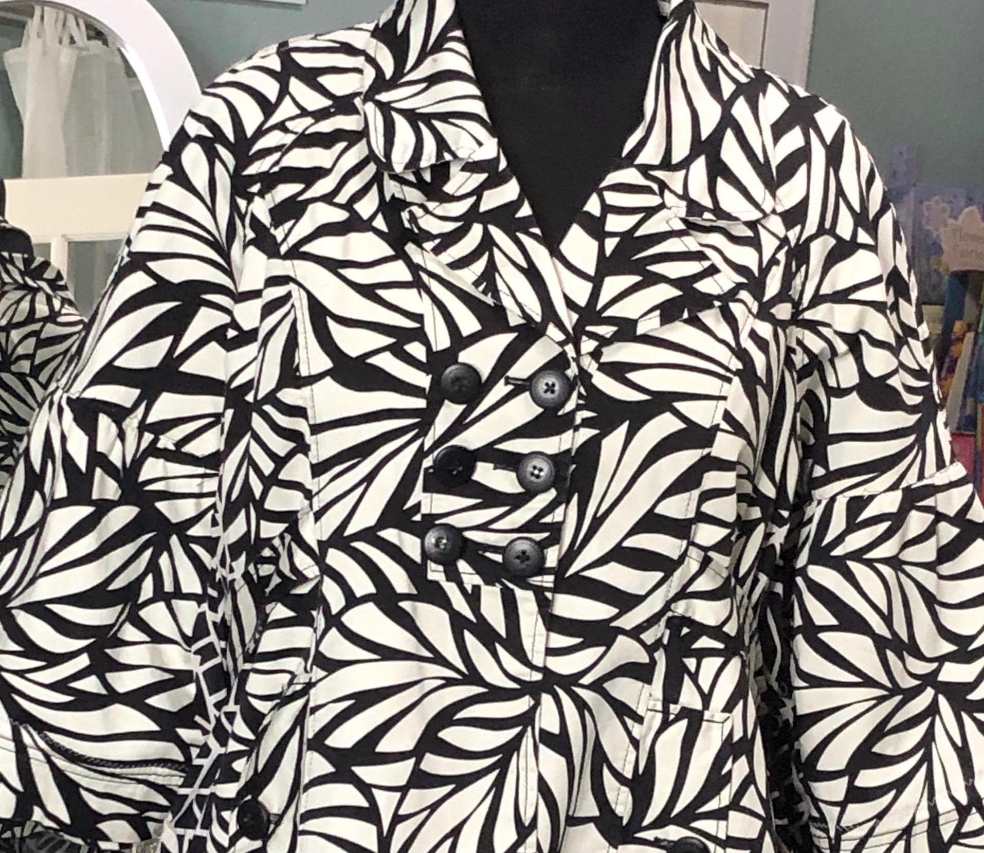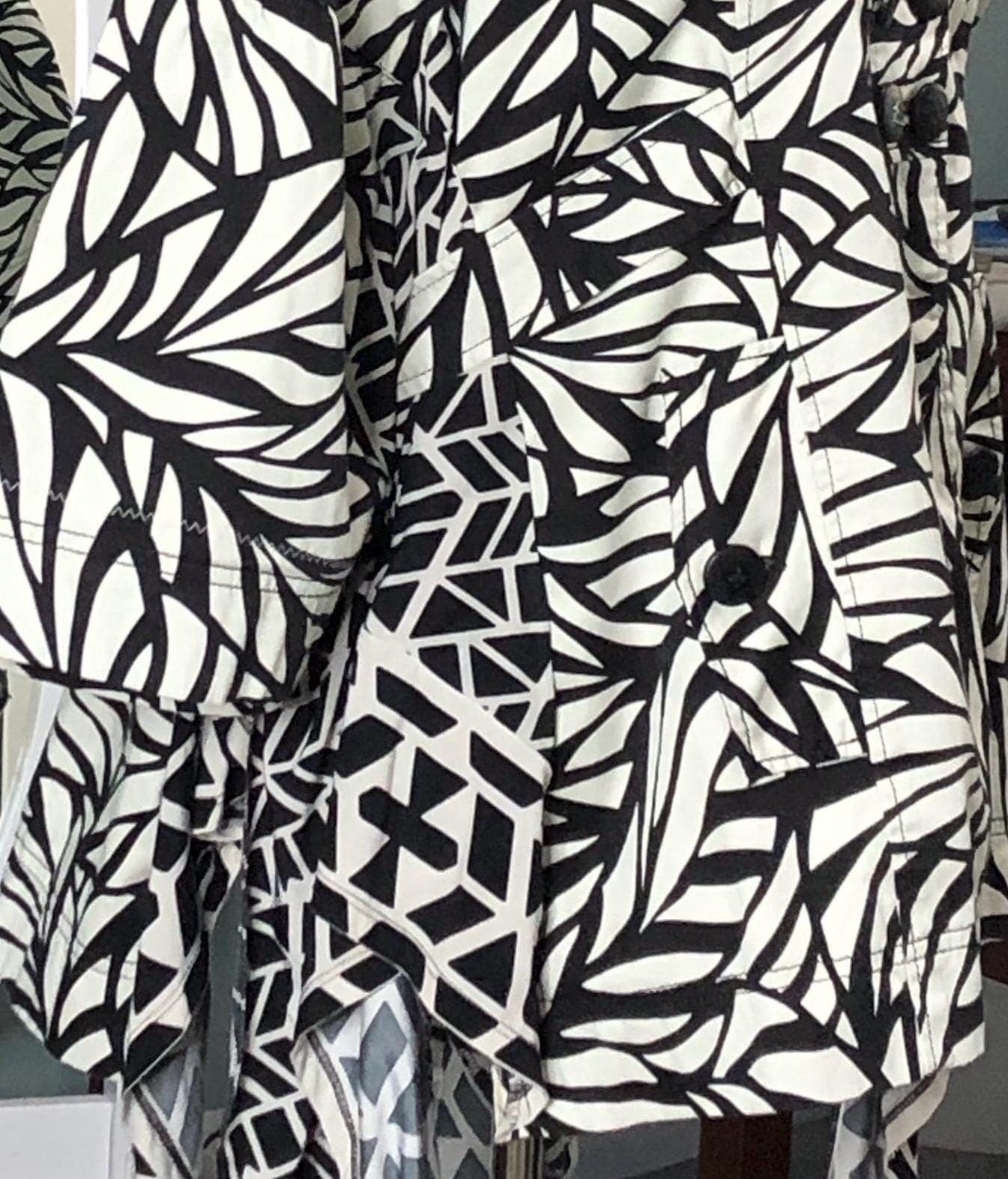 This beautiful jacket with its stow way tie and button belt in an abstract print is a one of a kind beautiful. The sides and sleeves have been opened up and a silky black and white polyester dress has been upcycled to make it into a cape like fit. There is even a special belt/ tie front added to make this an adjustable fitting piece.