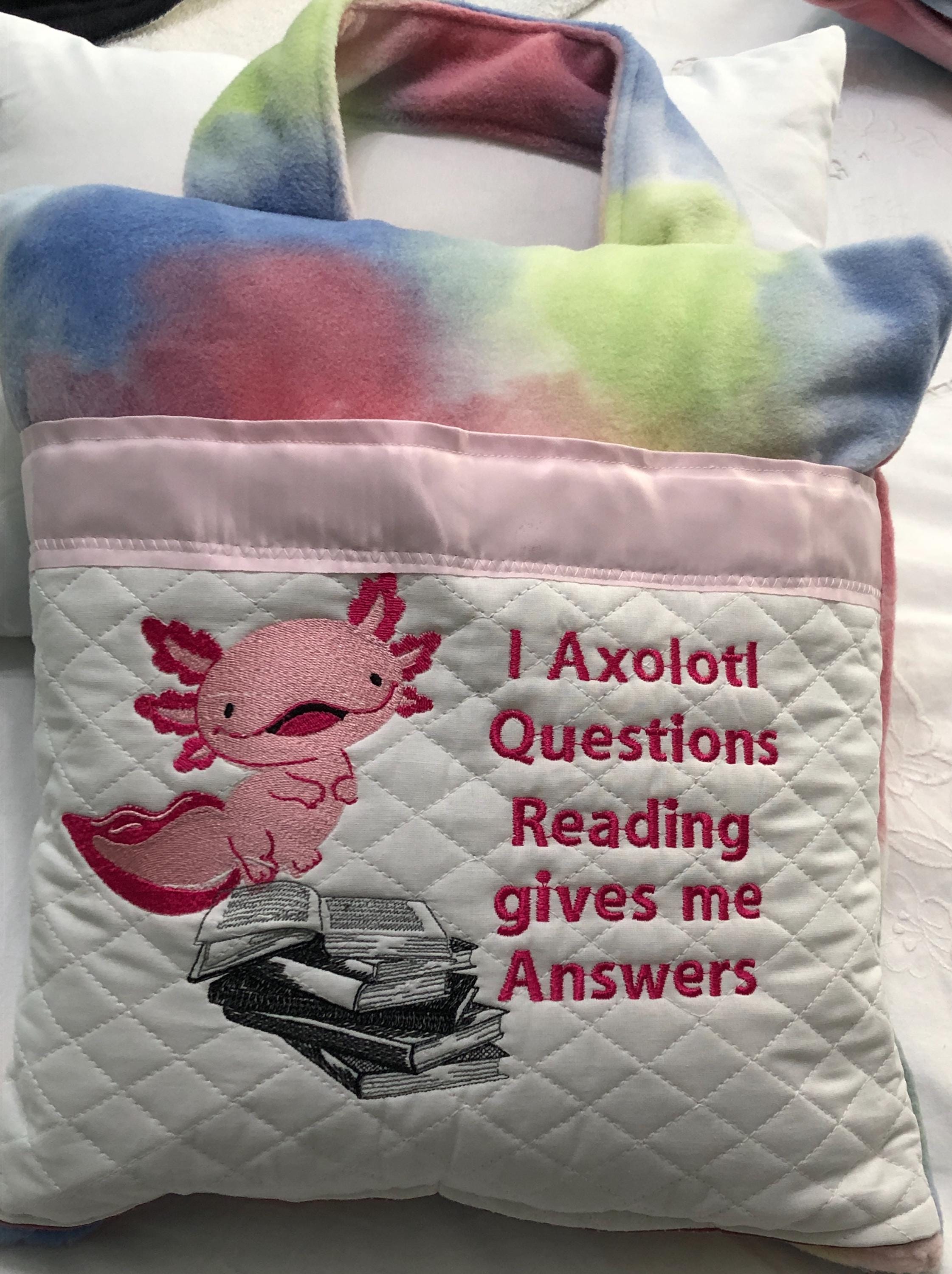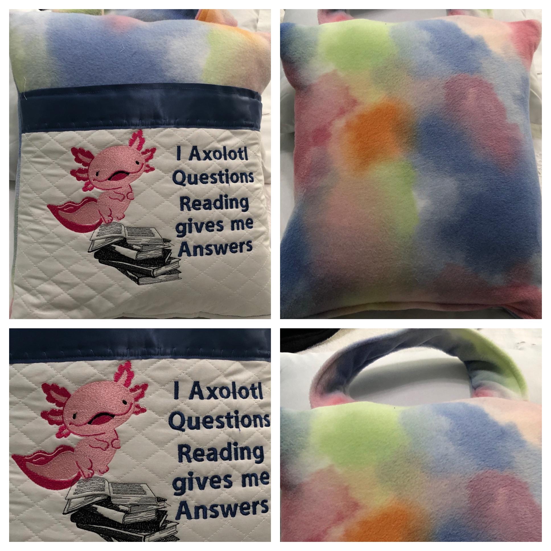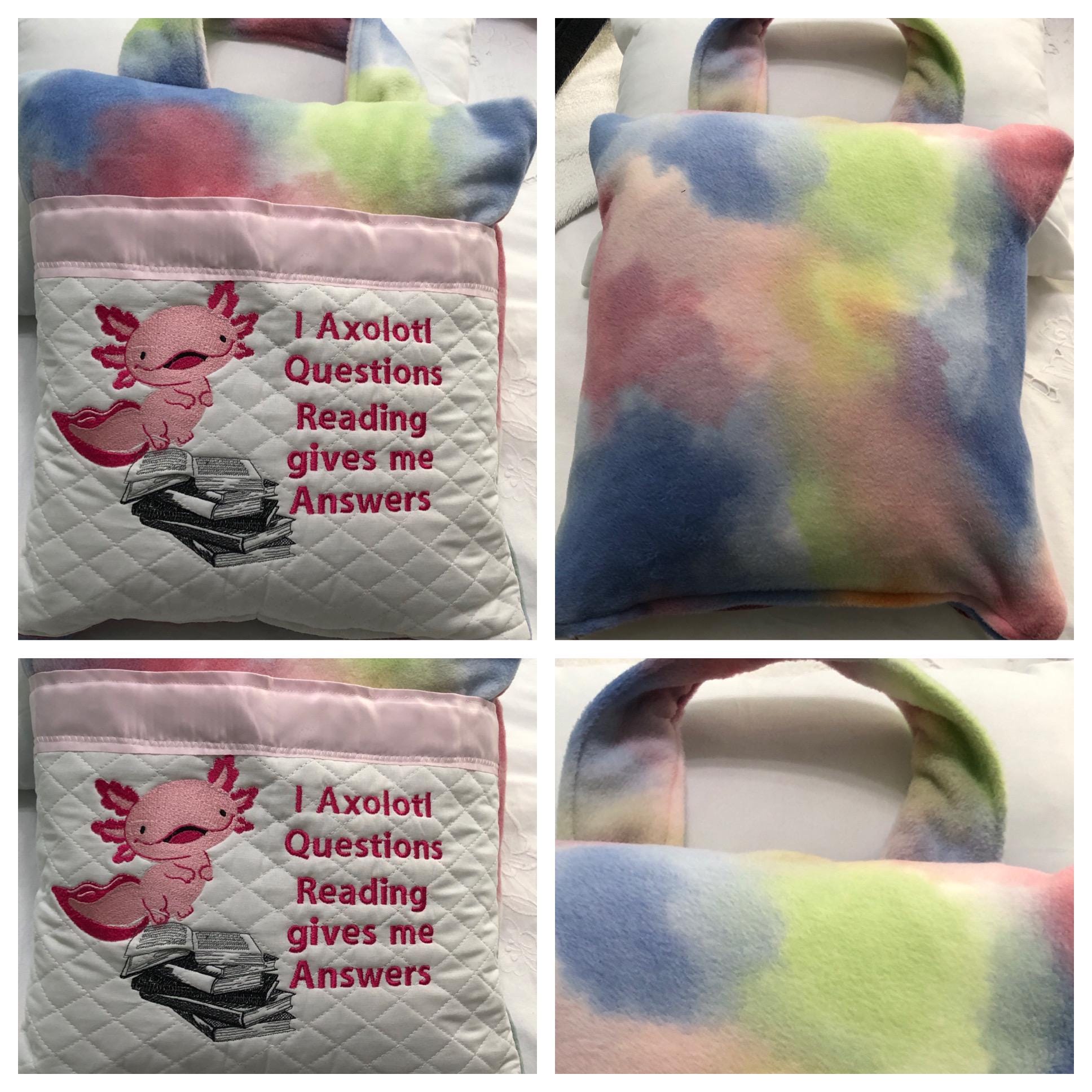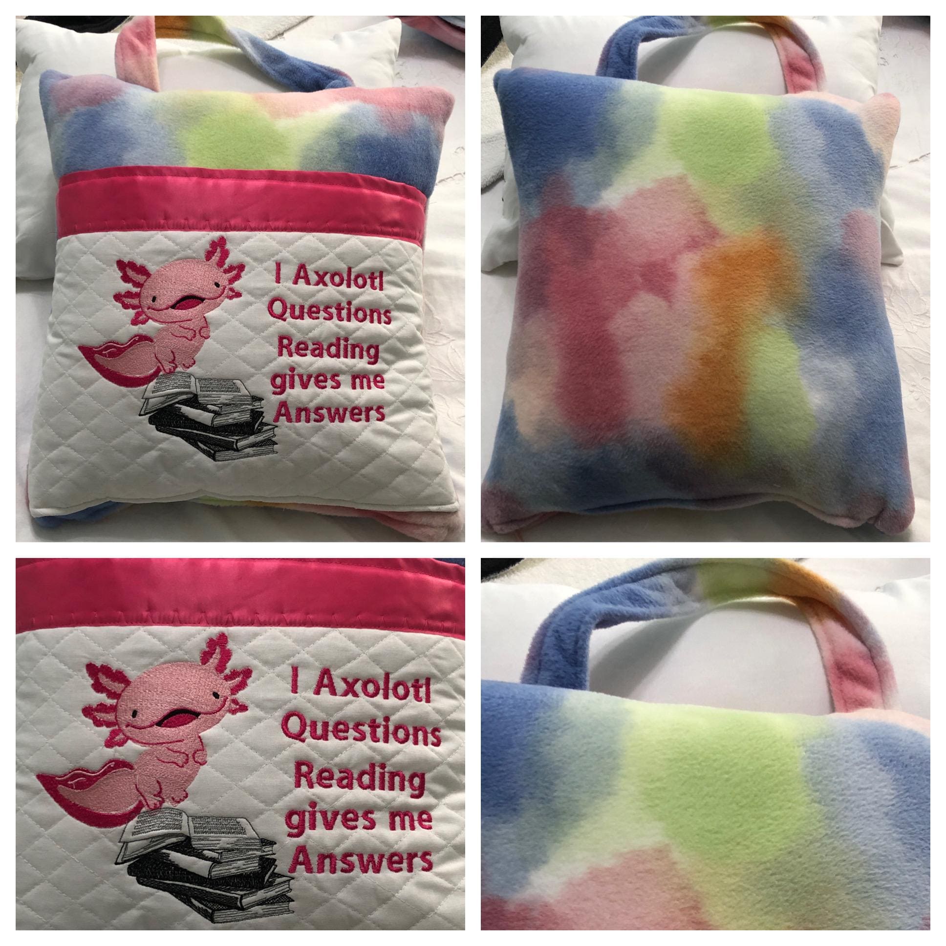 This beautiful pillow is made from pre washed soft no pill multicolor fleece and white pre-quilted cotton. The white quilted pocket is embroidered with a little pink axolitl with a reading saying. The top of the pocket is trimmed in satin blanket binding . The bottom of the pillow has a hidden zipper closure so that you can easily take your pillow form out to launder the cover. The top of the pillow has a fabric handle. This is just perfect for carrying the pillow around. This very special pocket pillow will make a memorable gift for some little reader.