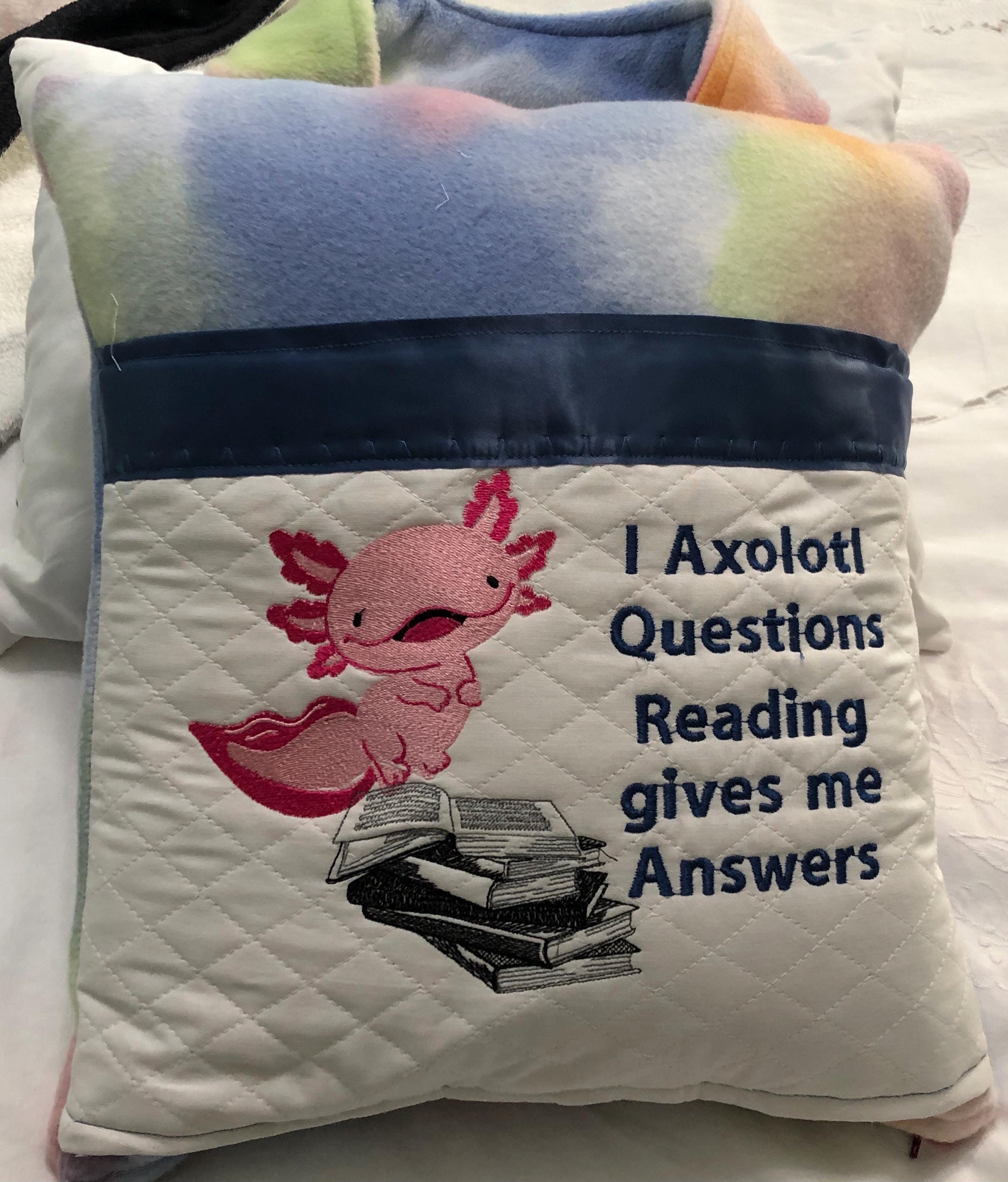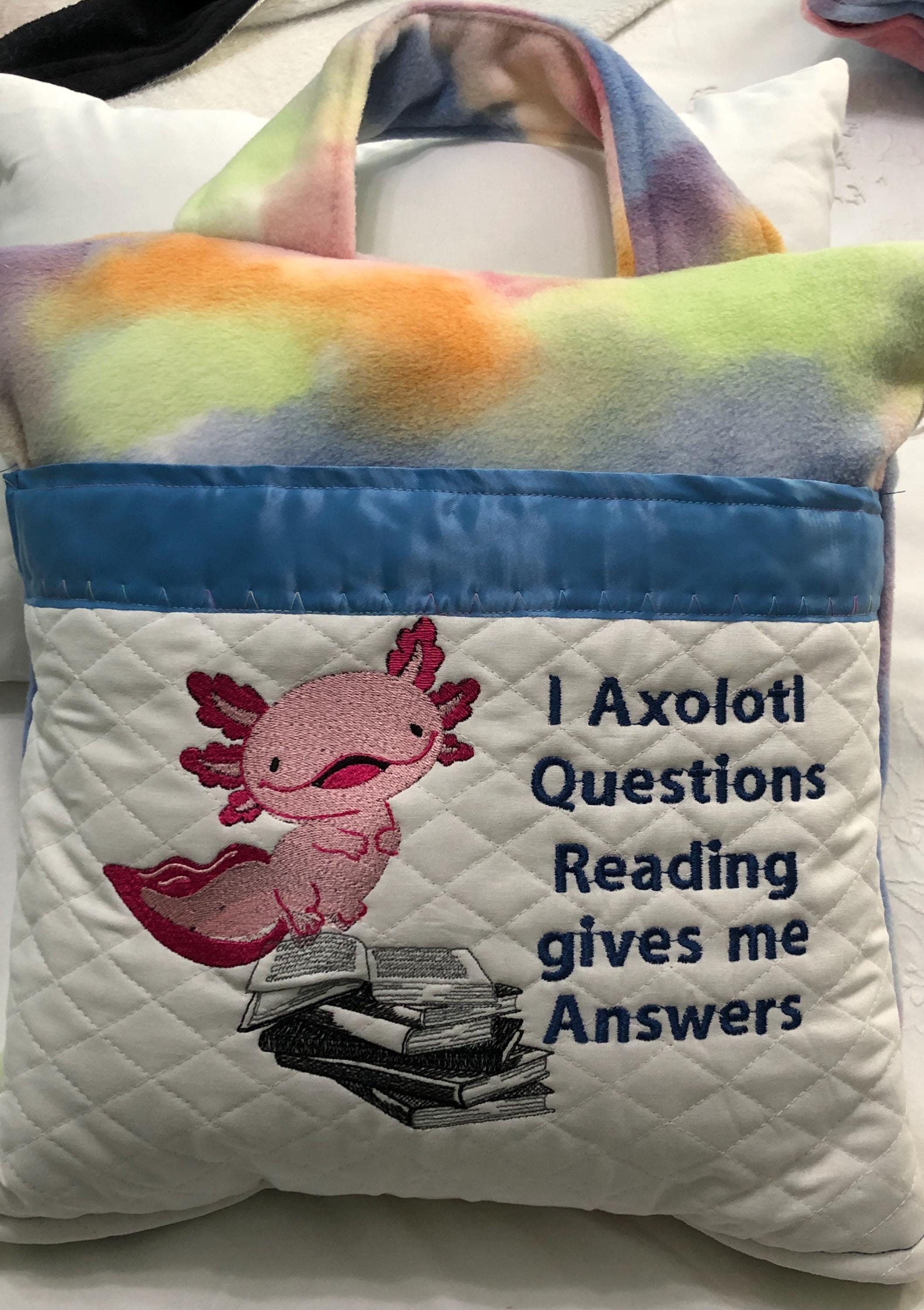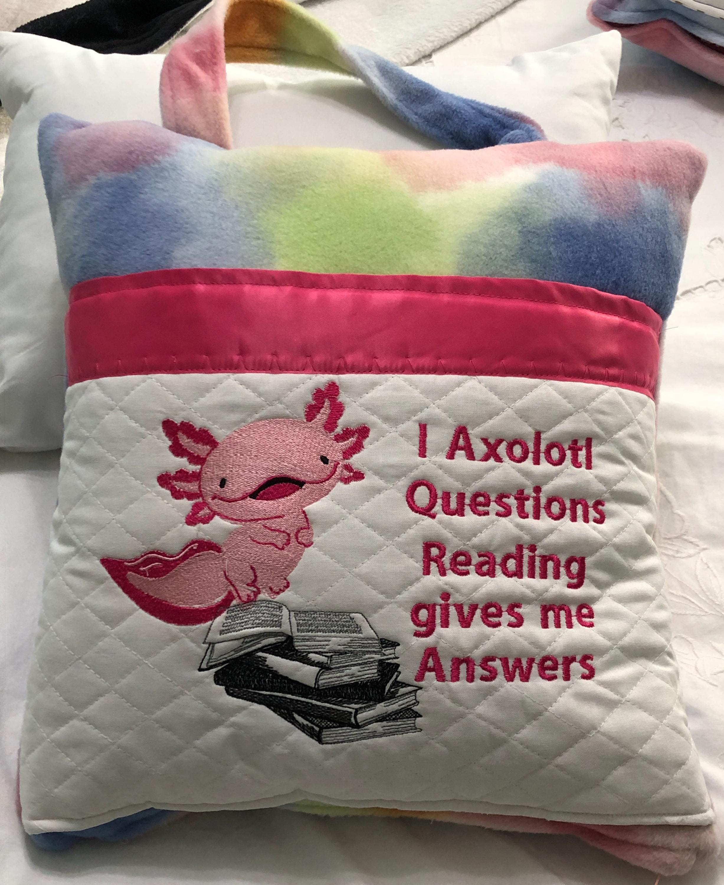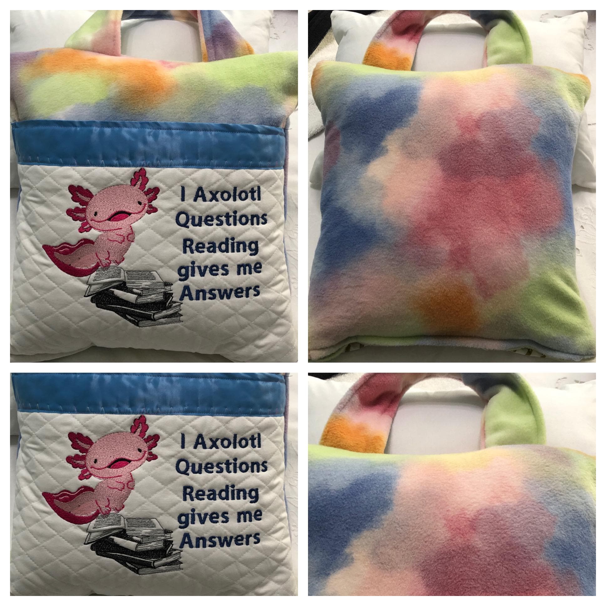 This beautiful pillow is made from pre washed soft no pill multicolor fleece and white pre-quilted cotton. The white quilted pocket is embroidered with a little pink axolitl with a reading saying. The top of the pocket is trimmed in satin blanket binding . The bottom of the pillow has a hidden zipper closure so that you can easily take your pillow form out to launder the cover. The top of the pillow has a fabric handle. This is just perfect for carrying the pillow around. This very special pocket pillow will make a memorable gift for some little reader.