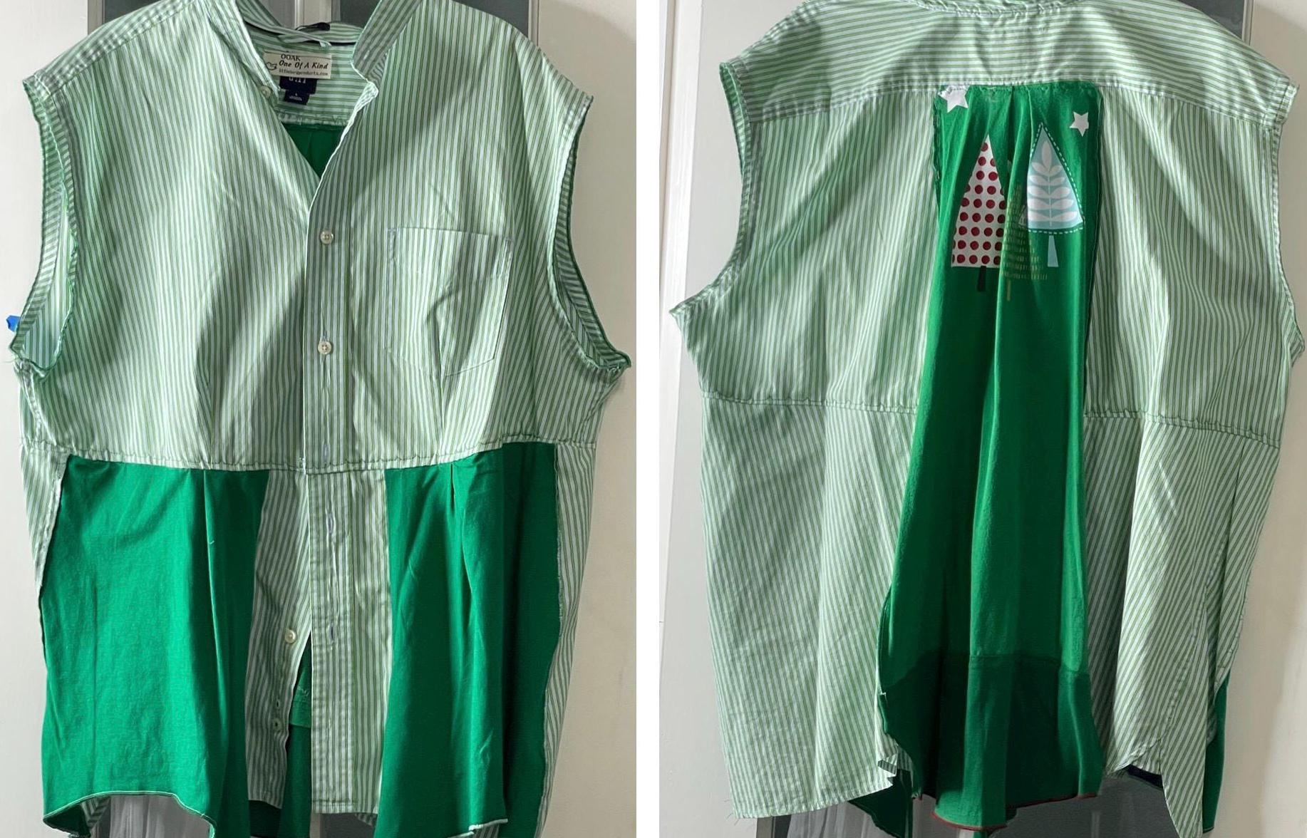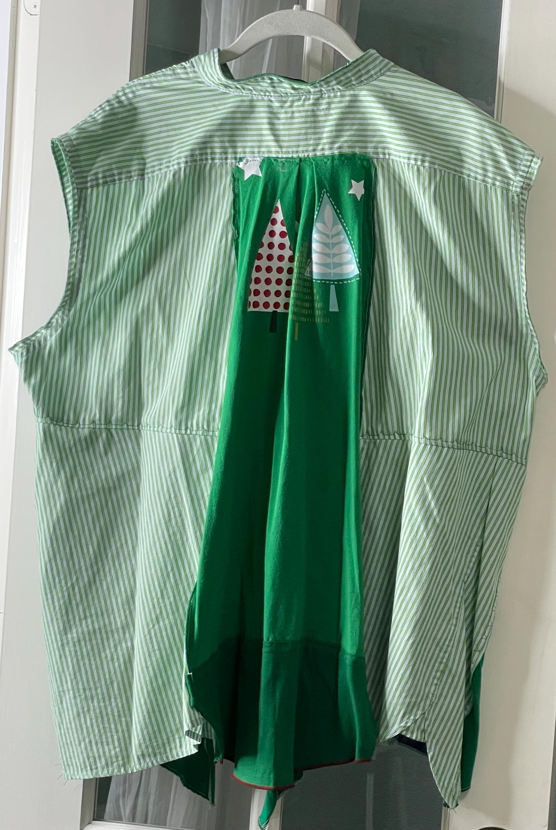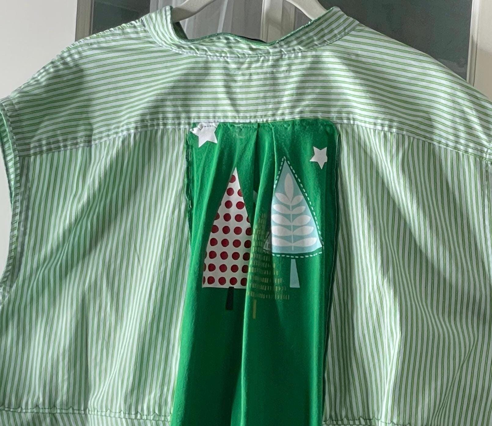 This holiday top will let you get you in the Christmas spirit! It’s a light weight green striped cotton with a lime green tee shirt bottom front, back and inset back that has Christmas trees. You can wear it as a shirt or over a tee or turtleneck as a holiday vest. This is a must have piece for your holiday wardrobe.