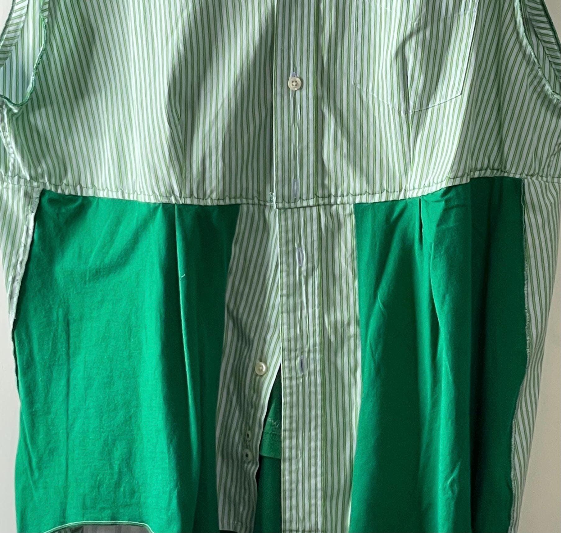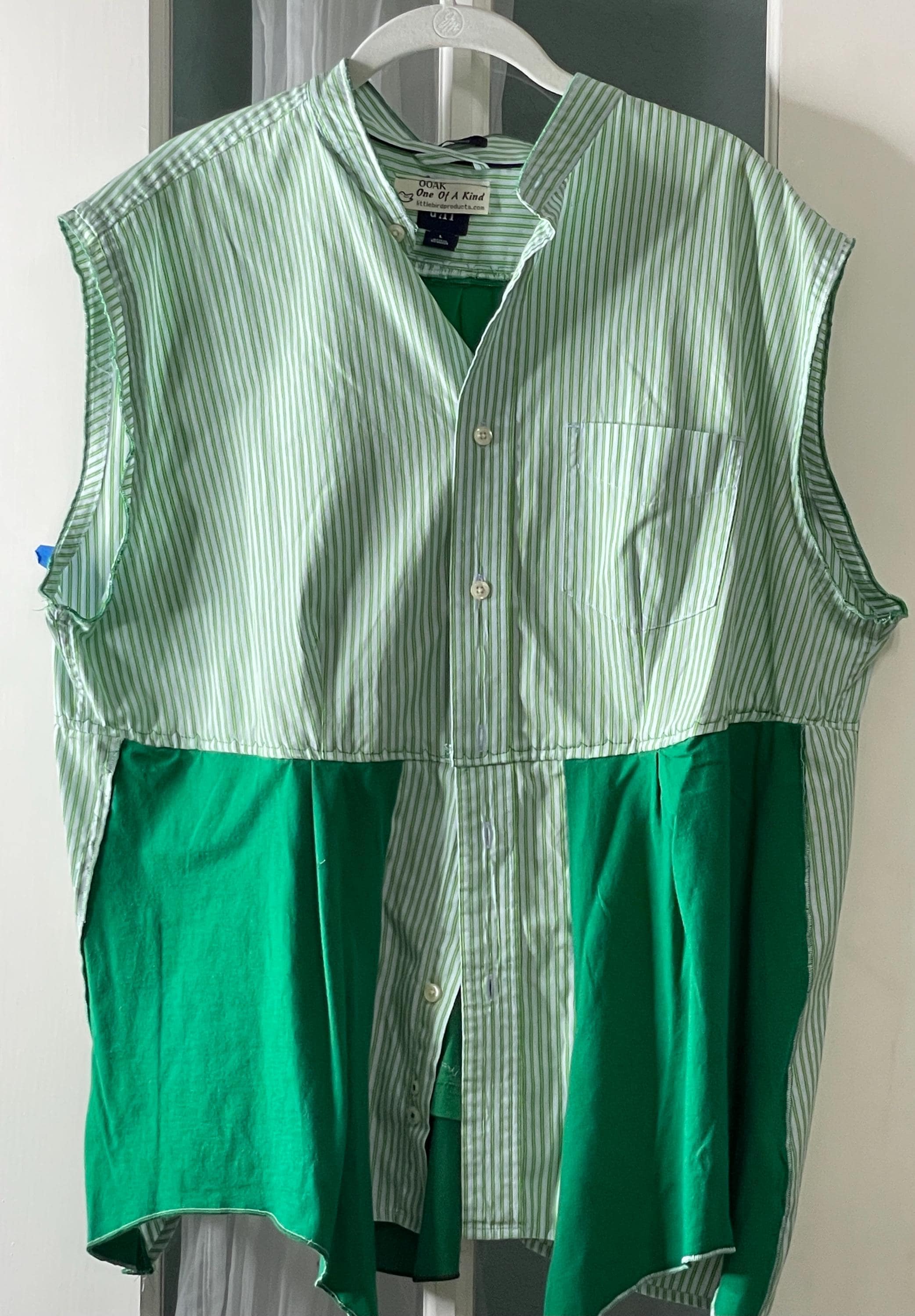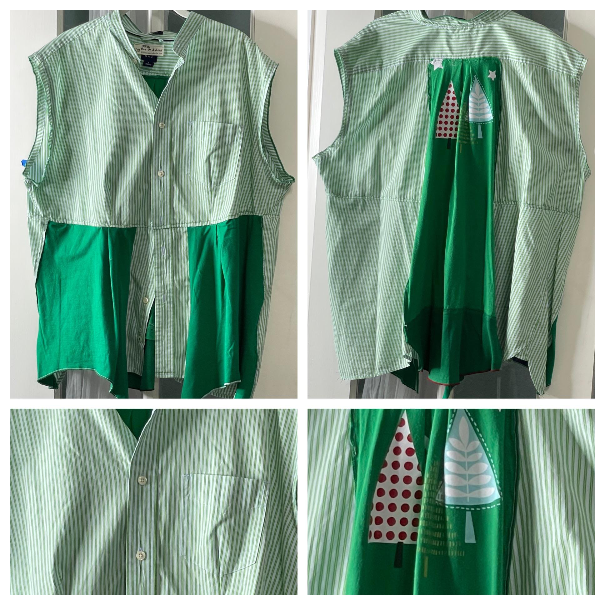 This holiday top will let you get you in the Christmas spirit! It’s a light weight green striped cotton with a lime green tee shirt bottom front, back and inset back that has Christmas trees. You can wear it as a shirt or over a tee or turtleneck as a holiday vest. This is a must have piece for your holiday wardrobe.