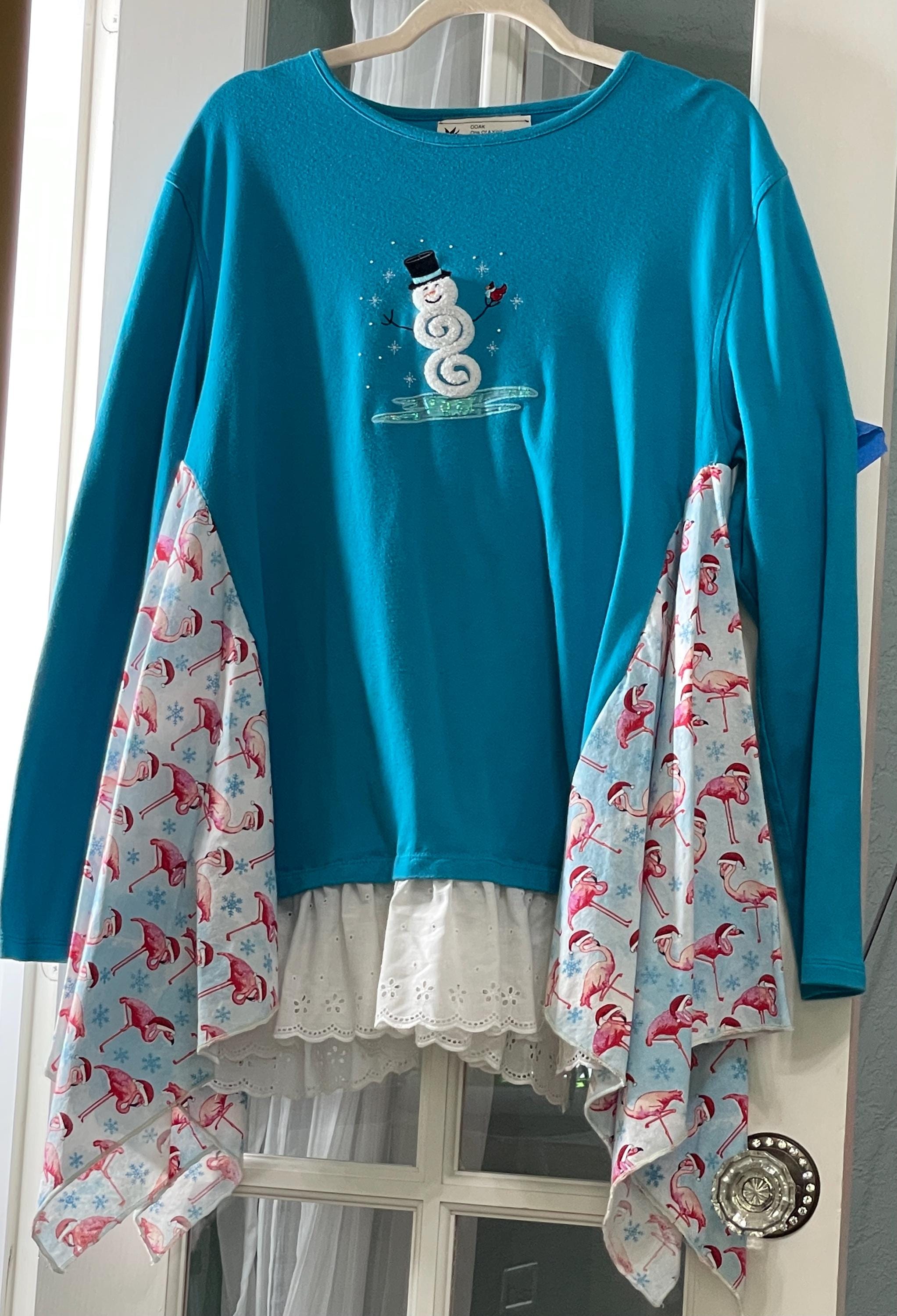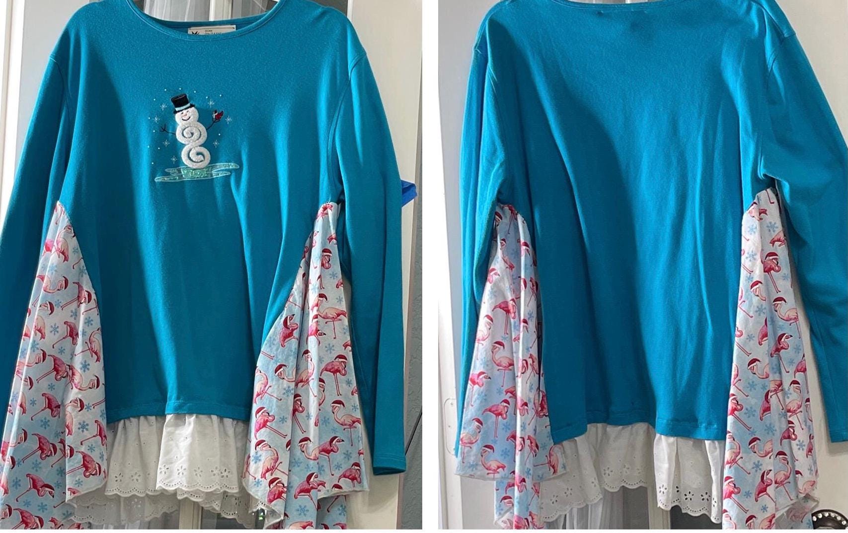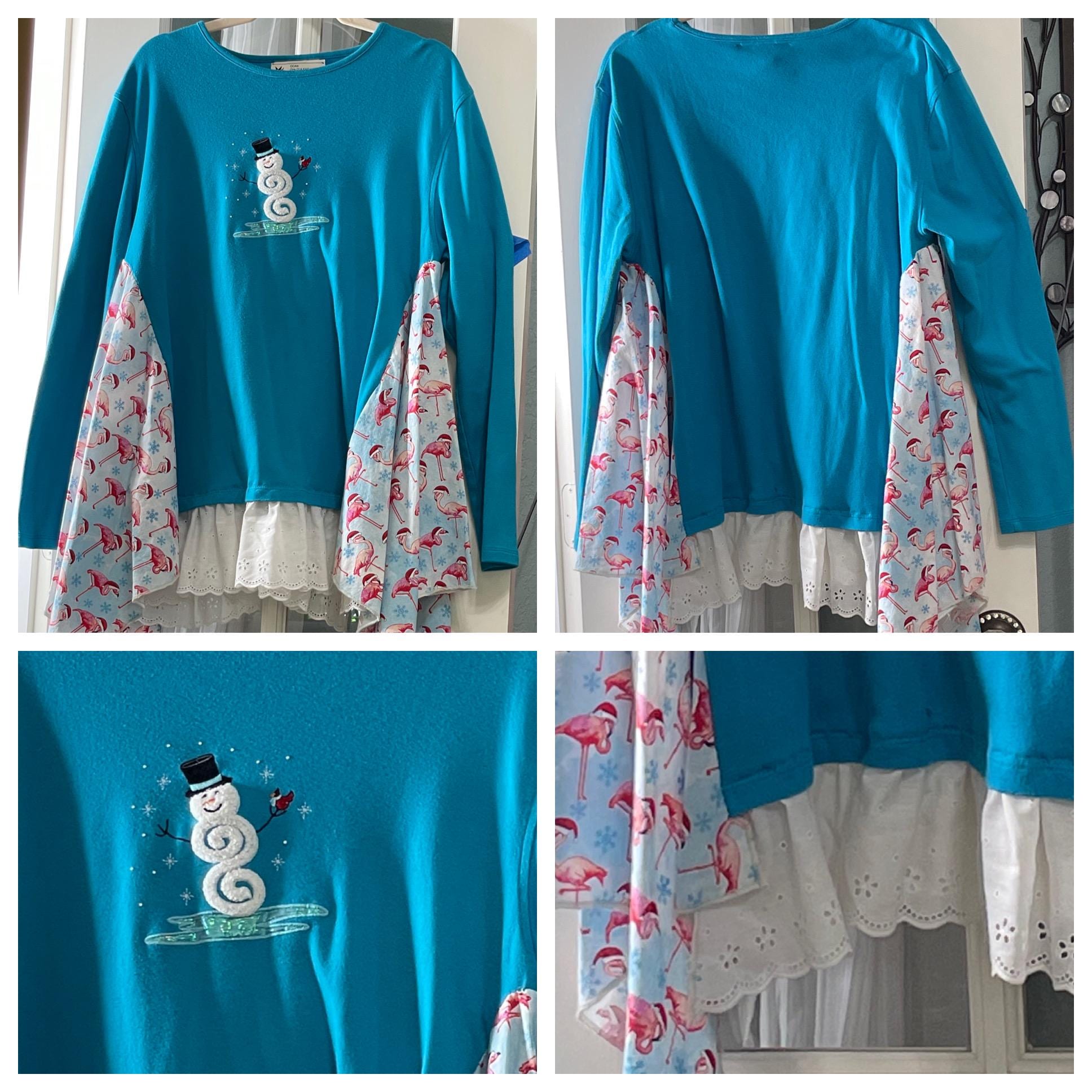 This one of a kind Christmas tunic is a perfect combination of soft pink tee shirt with a sequin Christmas tree appliqué and pink snowman print cotton. The pink tee shirt has been upcycled with the addition of the gathered cotton inset back and front ruffle.