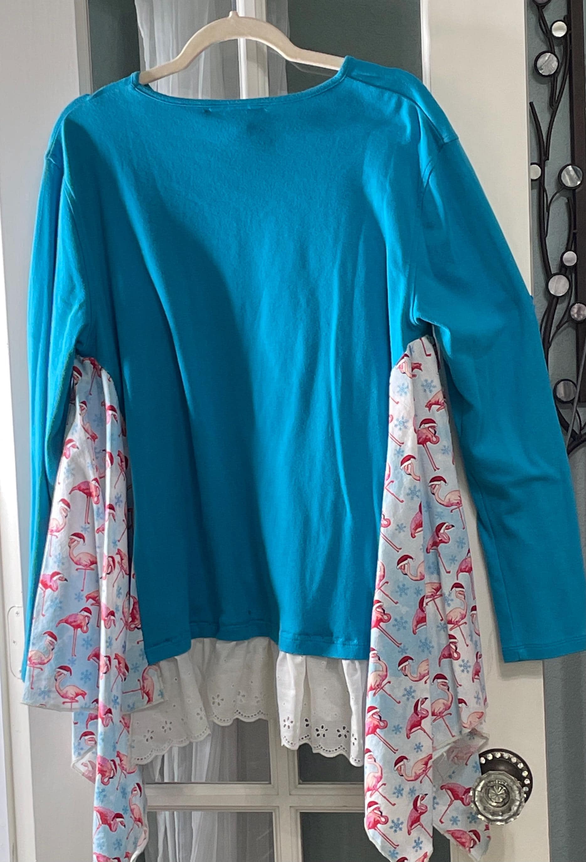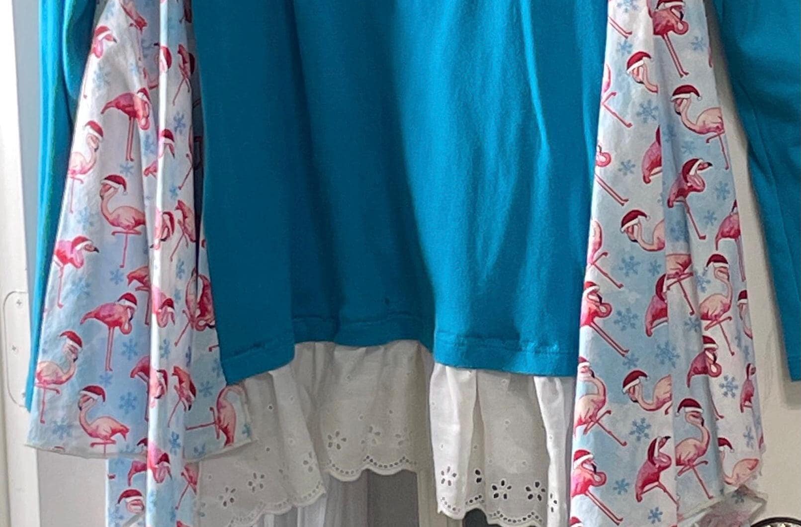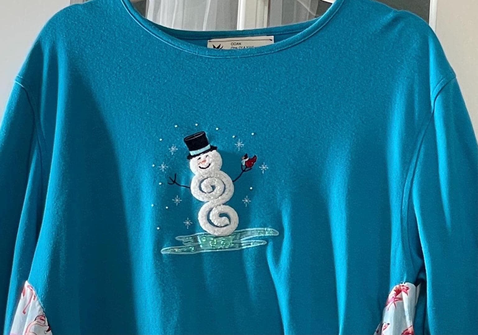 This one of a kind Christmas tunic is a perfect combination of soft pink tee shirt with a sequin Christmas tree appliqué and pink snowman print cotton. The pink tee shirt has been upcycled with the addition of the gathered cotton inset back and front ruffle.