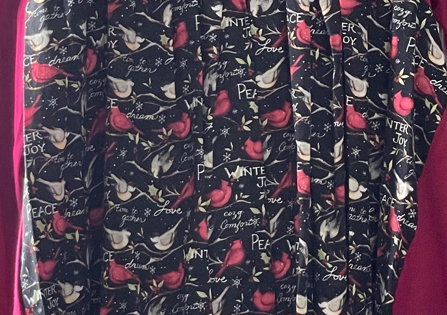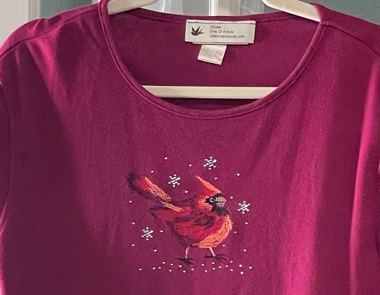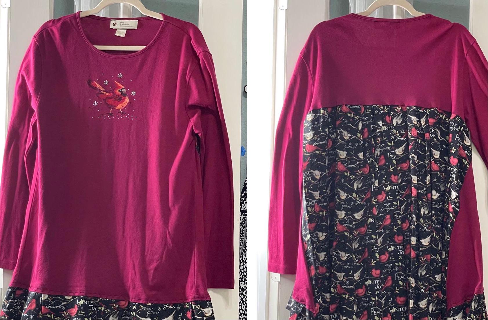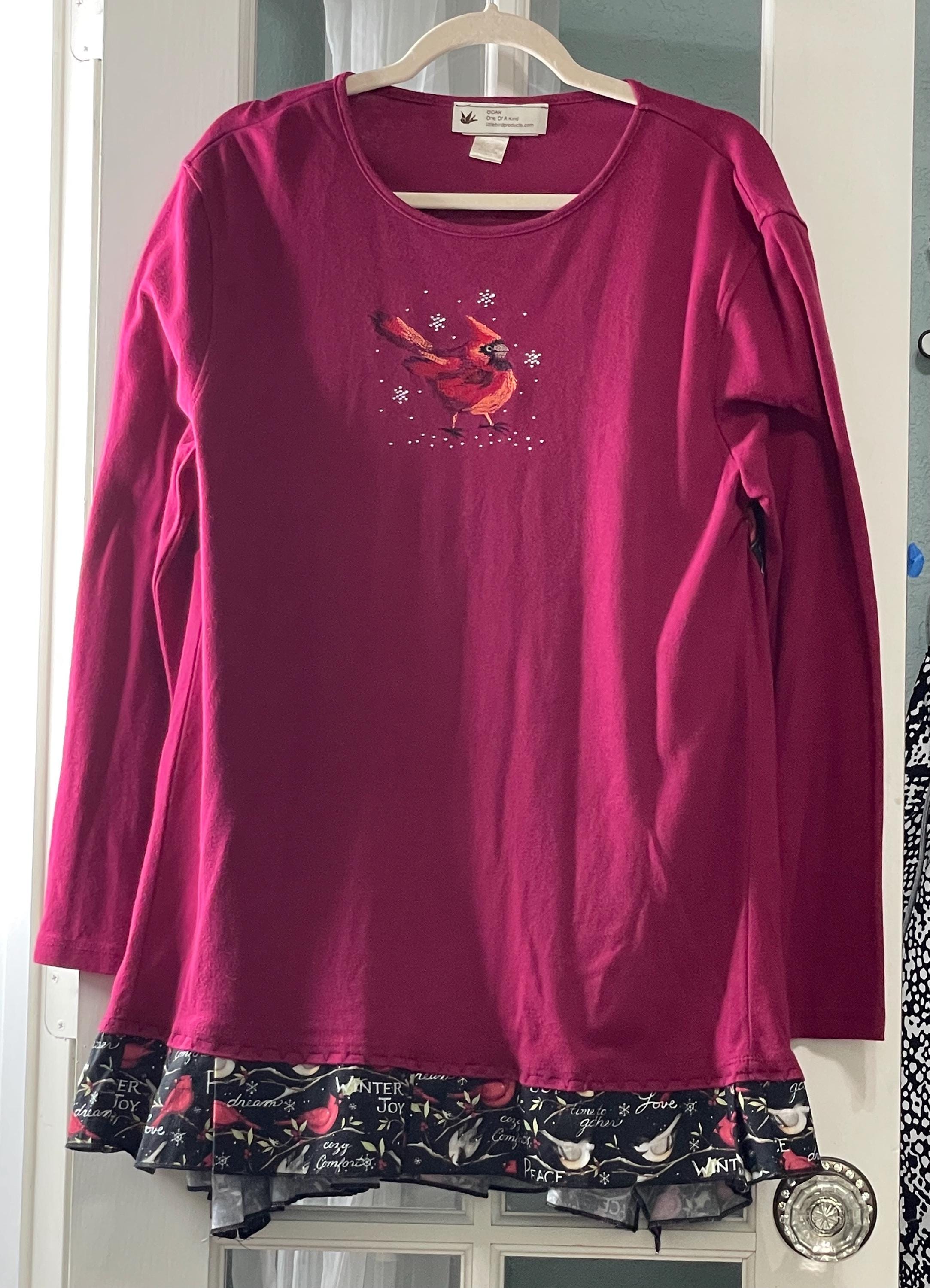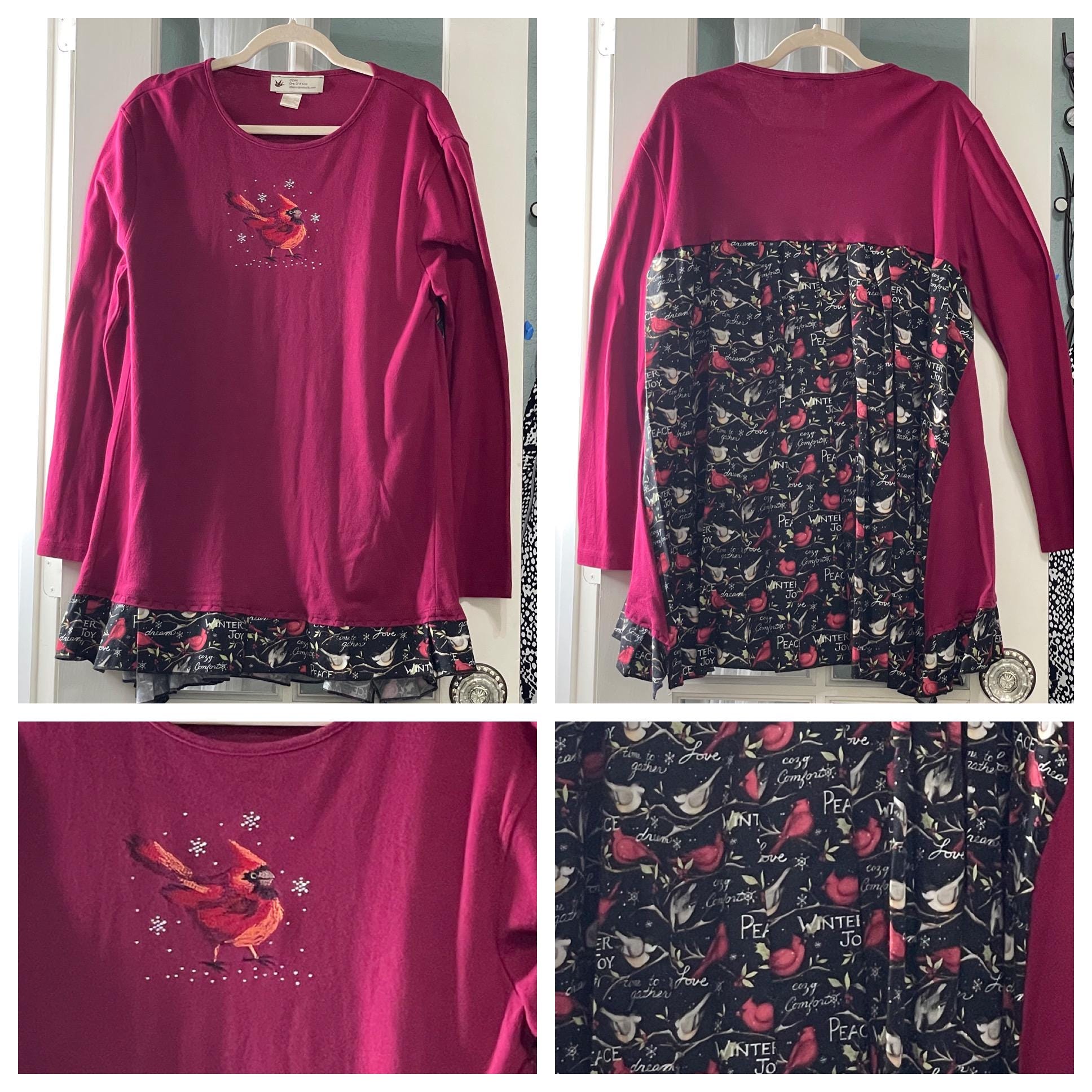 This one of a kind holiday tunic is a perfect combination of burgundy tee shirt with a cardinal appliqué and black with white partridge and red cardinal print cotton. The tee shirt has been upcycled with the addition of the gathered cotton back inset and front ruffle.