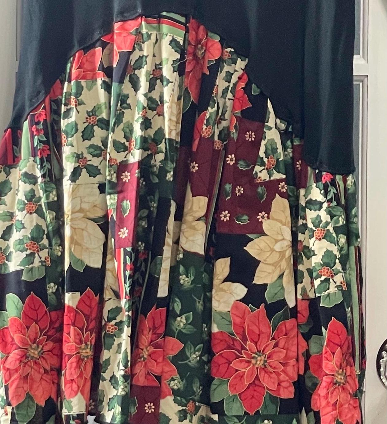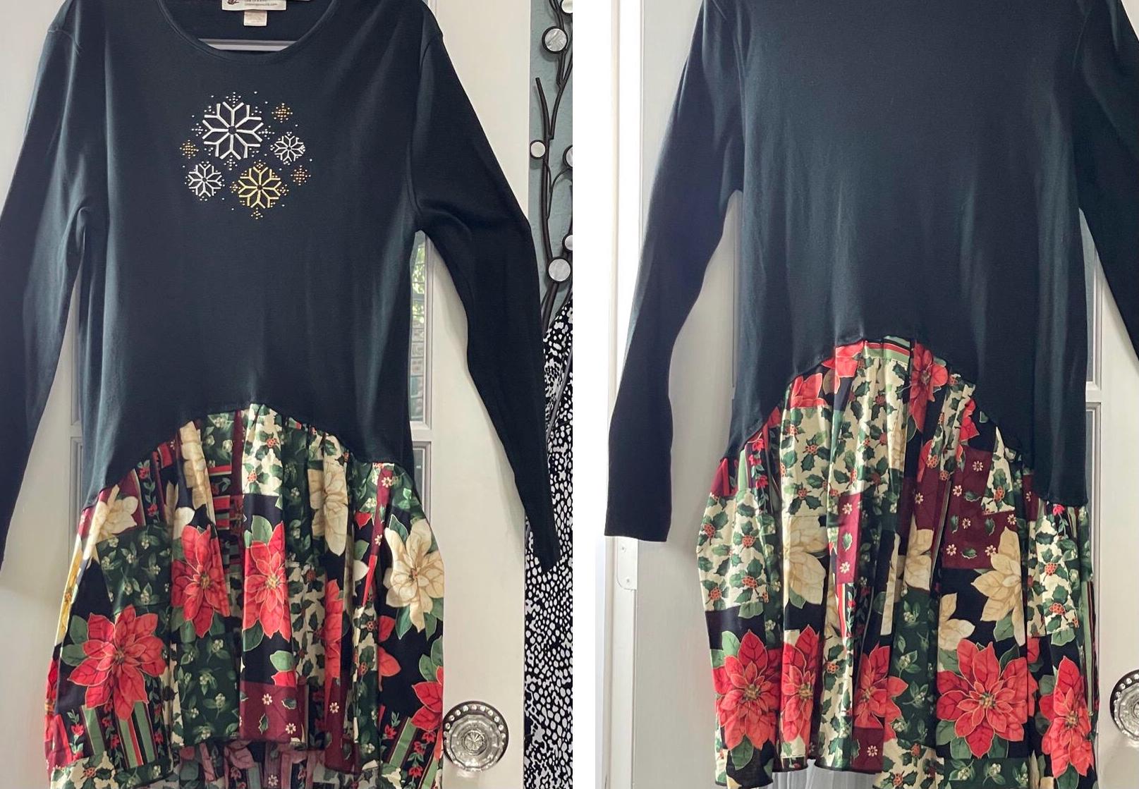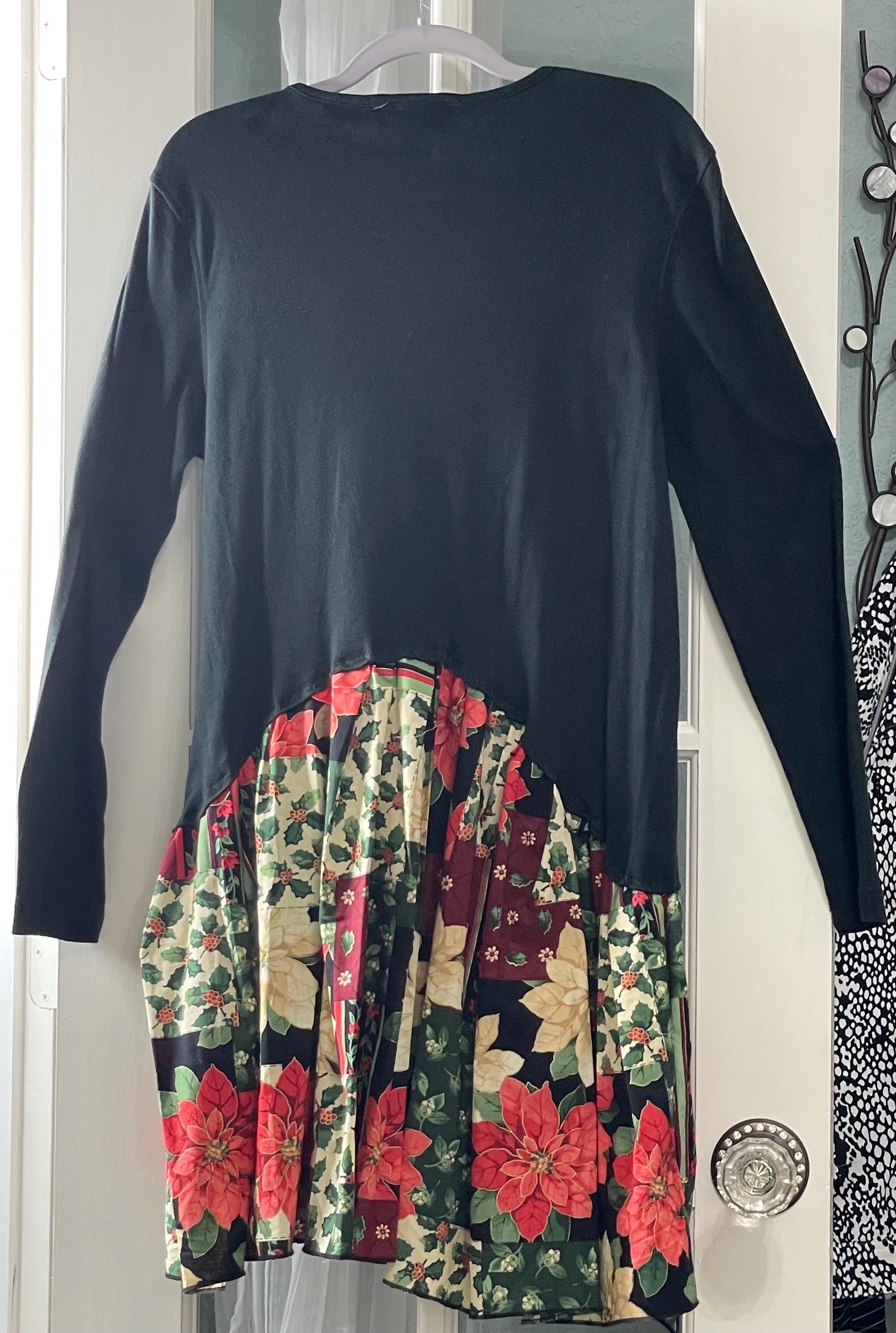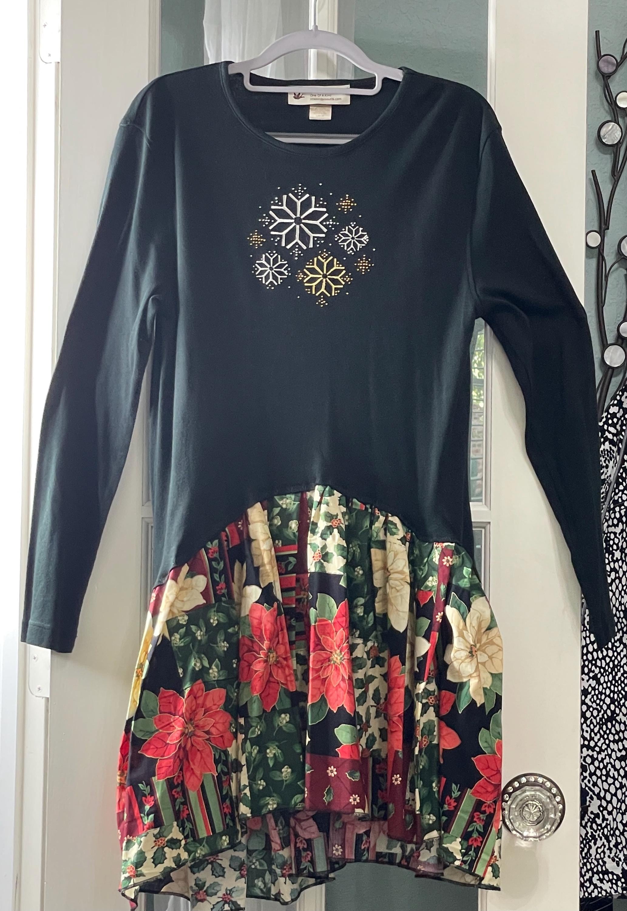 This one of a kind Christmas tunic is a perfect combination of soft dark green tee shirt with silver snowflake applique and poinsettia print cotton.
