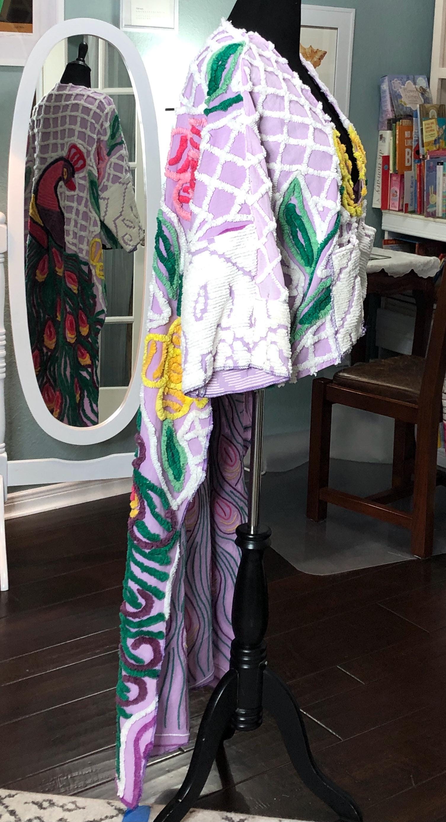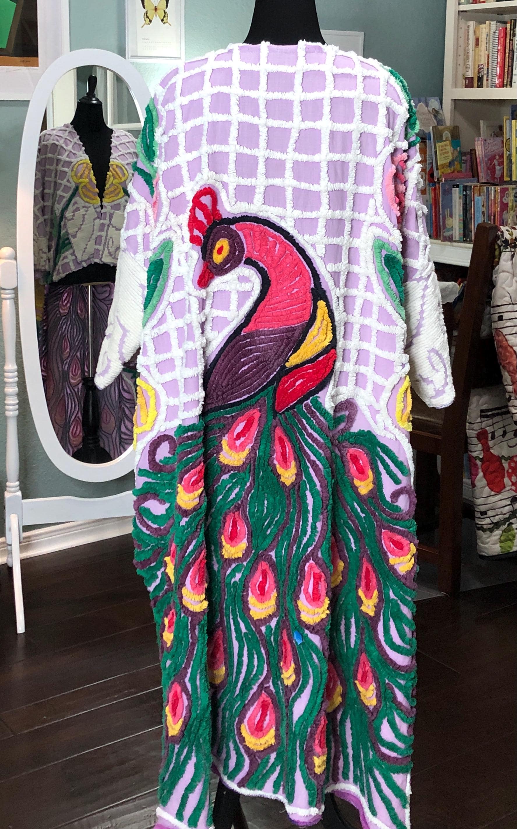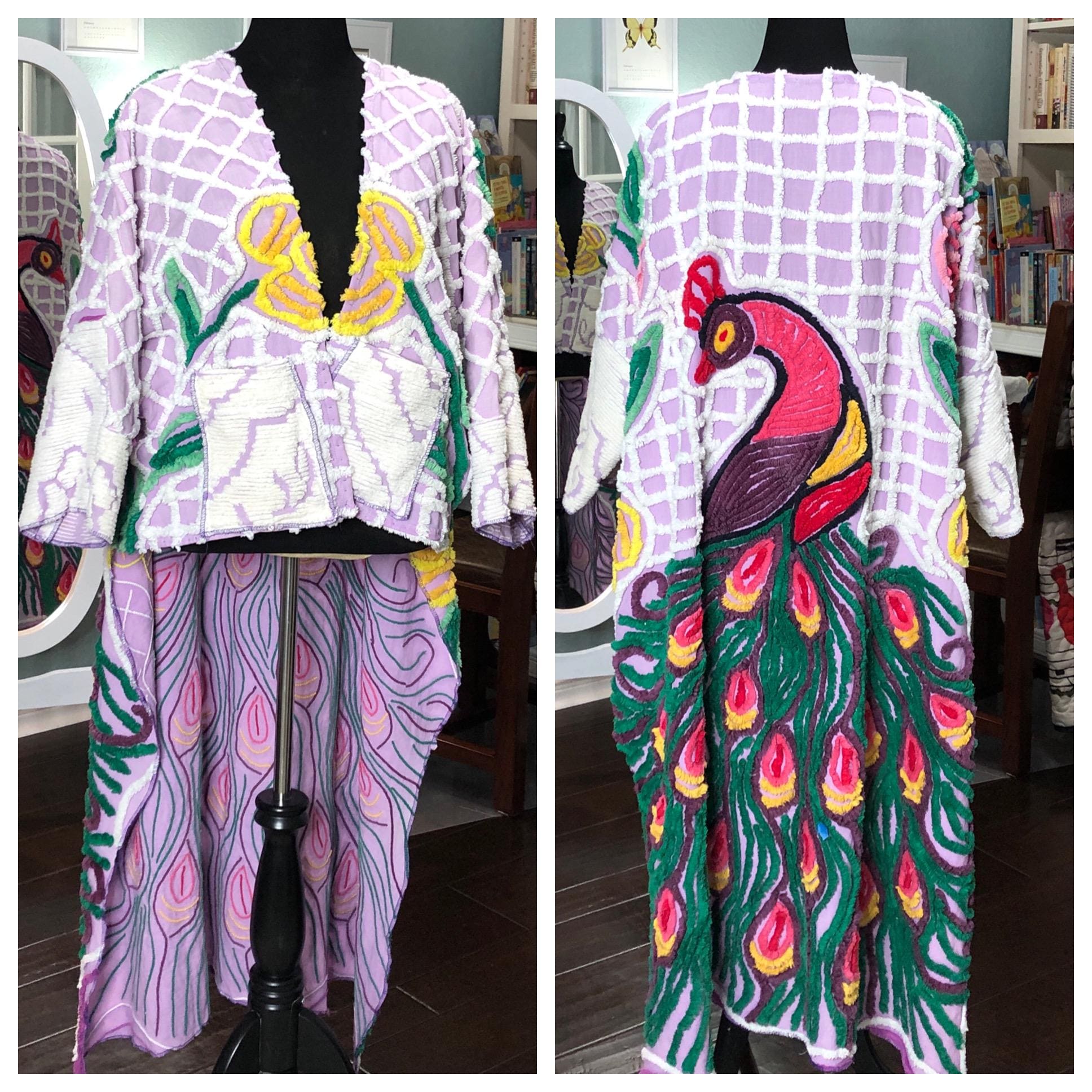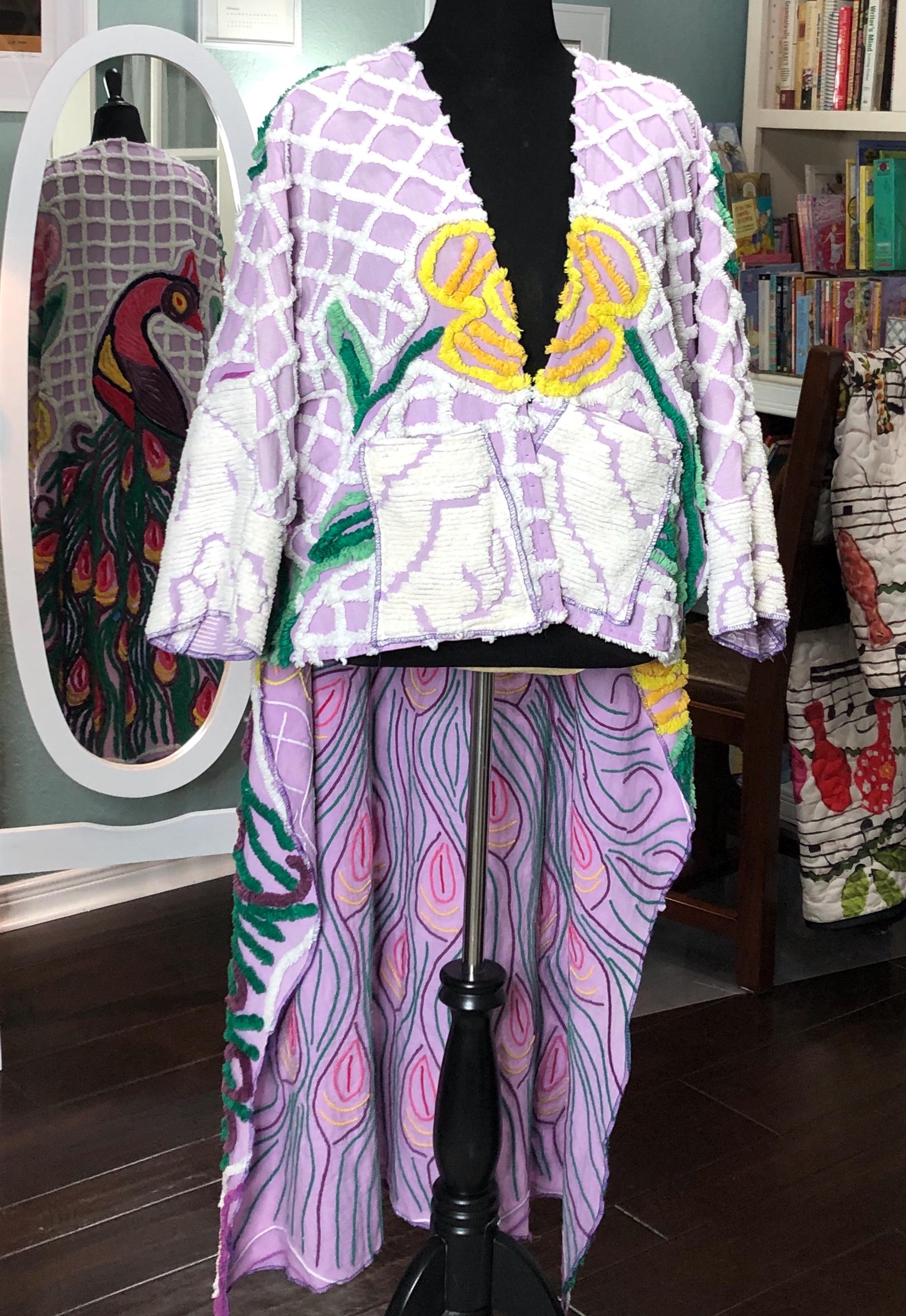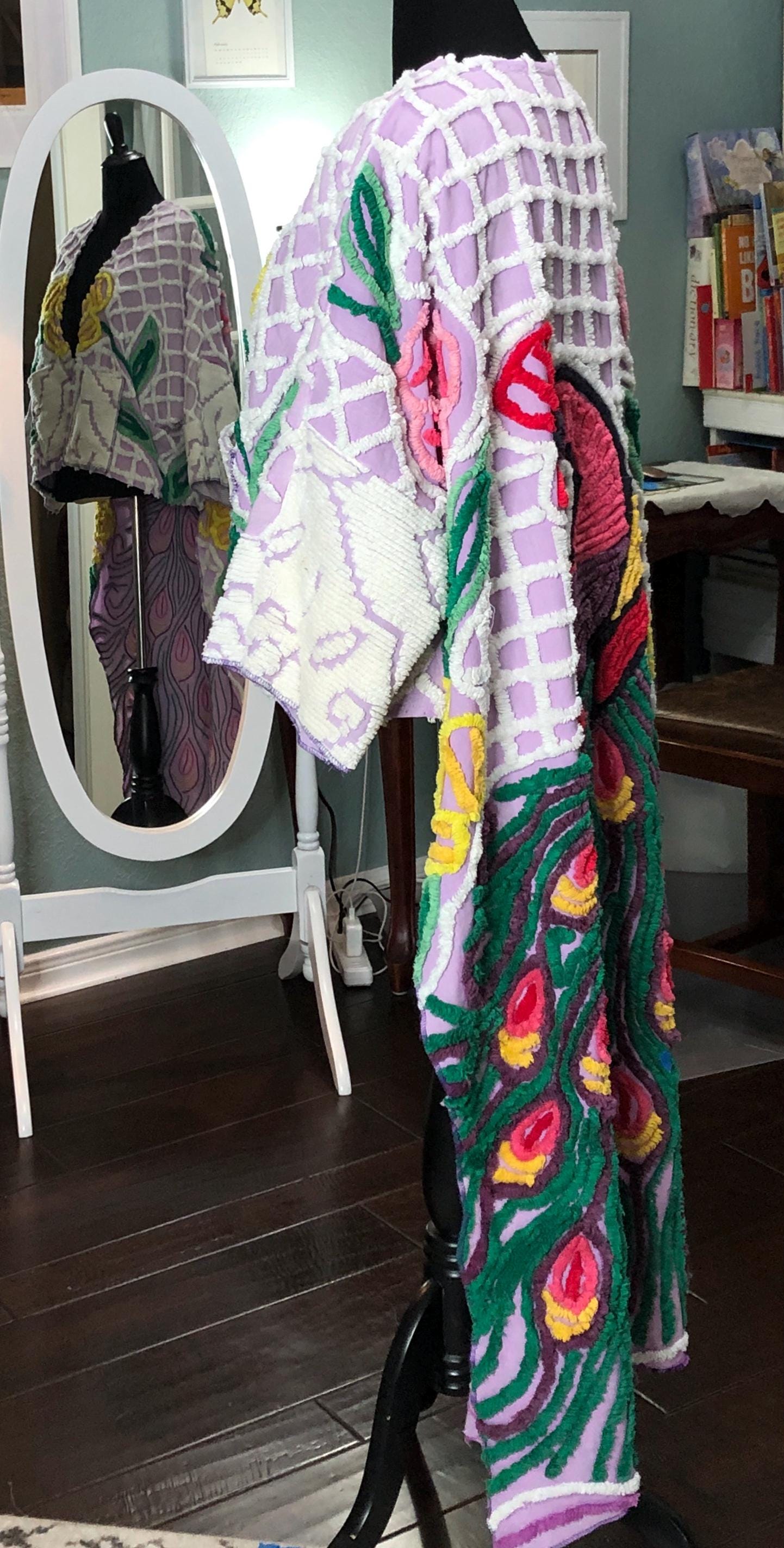 This easy fitting long kimono jacket is a must have for your wardrobe. It was made using a beautiful piece of vintage purple chenille with a full peacock on the long back. The vintage chenille is a purple and white pattern with a yellow flower on the front and added white and purple complimentary pieces to lengthen the kimono sleeves. This chenille had served its useful life as a bed spread and was fussy cut to make this one of a kind jacket. The jacket is an high low style and was lengthened in the back to give you the full peacock.