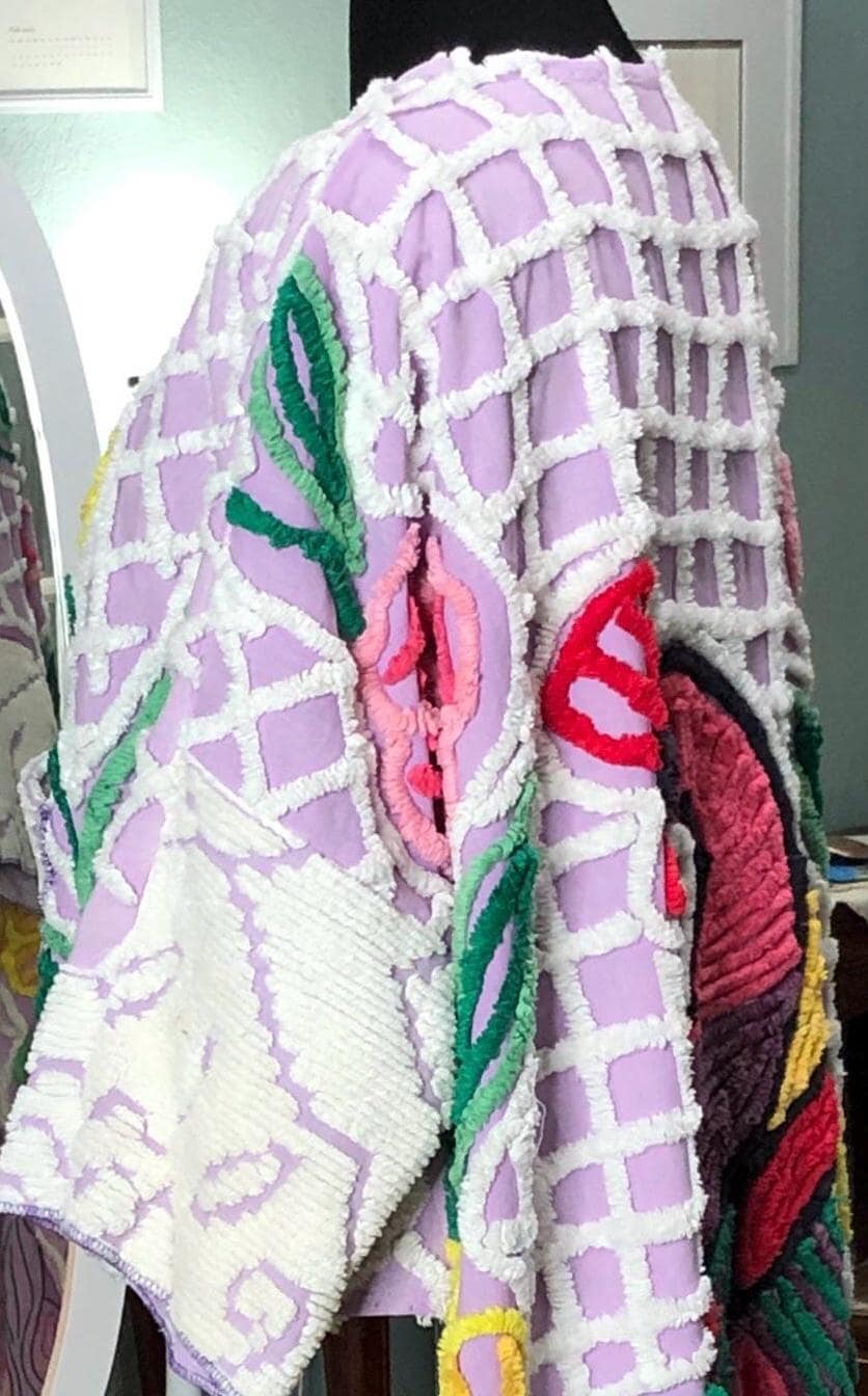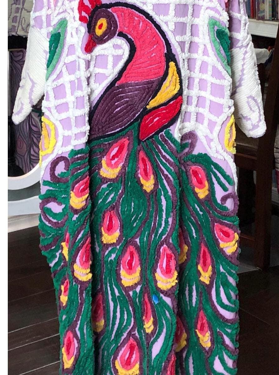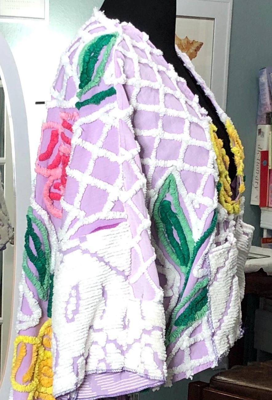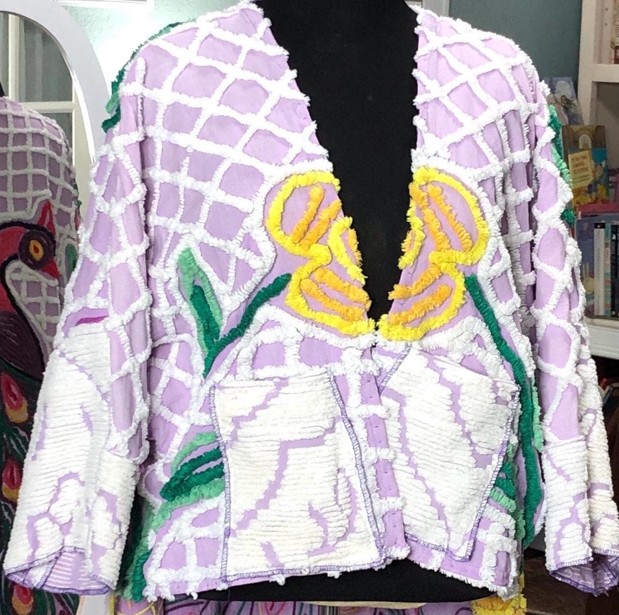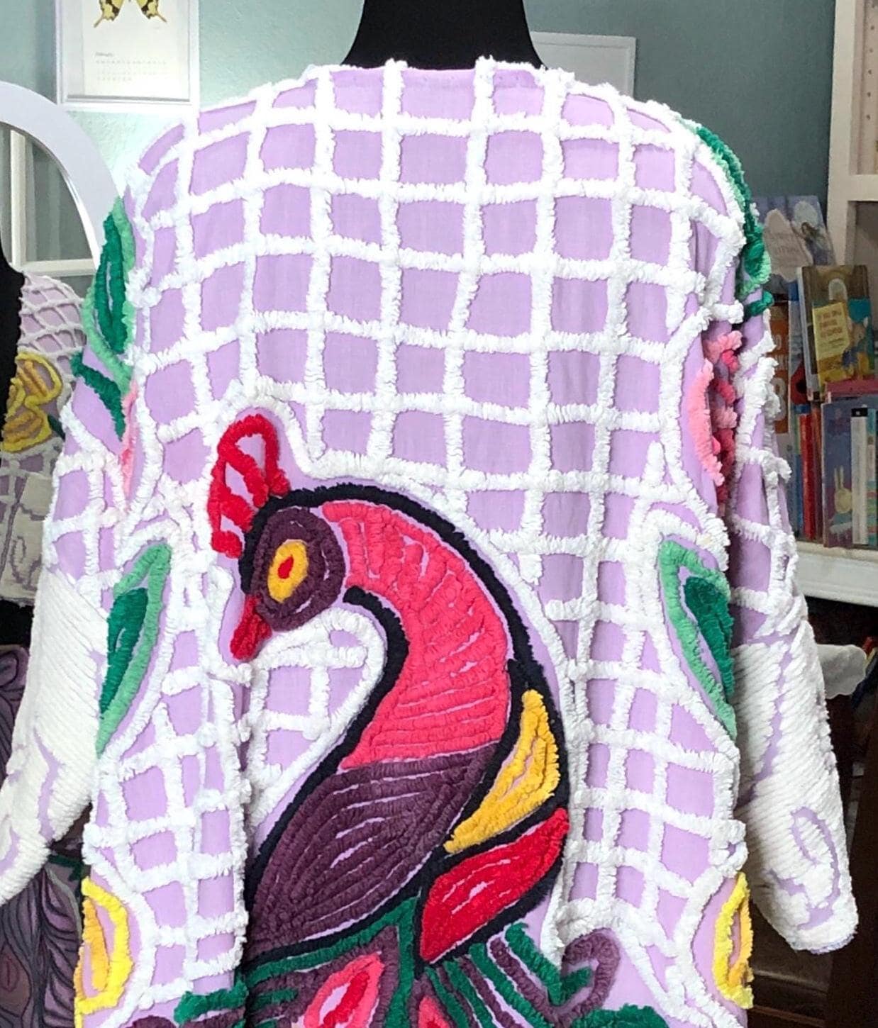 This easy fitting long kimono jacket is a must have for your wardrobe. It was made using a beautiful piece of vintage purple chenille with a full peacock on the long back. The vintage chenille is a purple and white pattern with a yellow flower on the front and added white and purple complimentary pieces to lengthen the kimono sleeves. This chenille had served its useful life as a bed spread and was fussy cut to make this one of a kind jacket. The jacket is an high low style and was lengthened in the back to give you the full peacock.