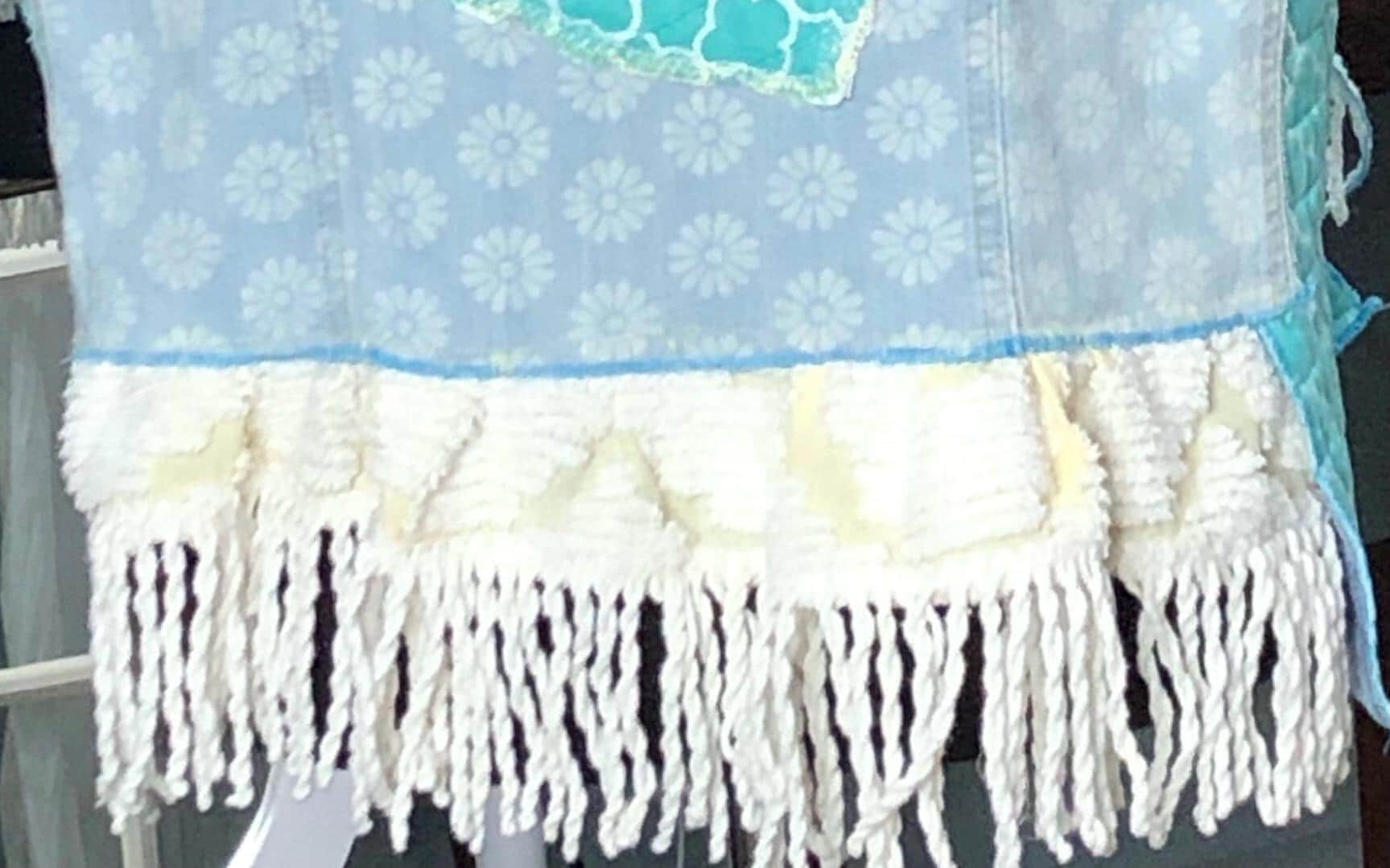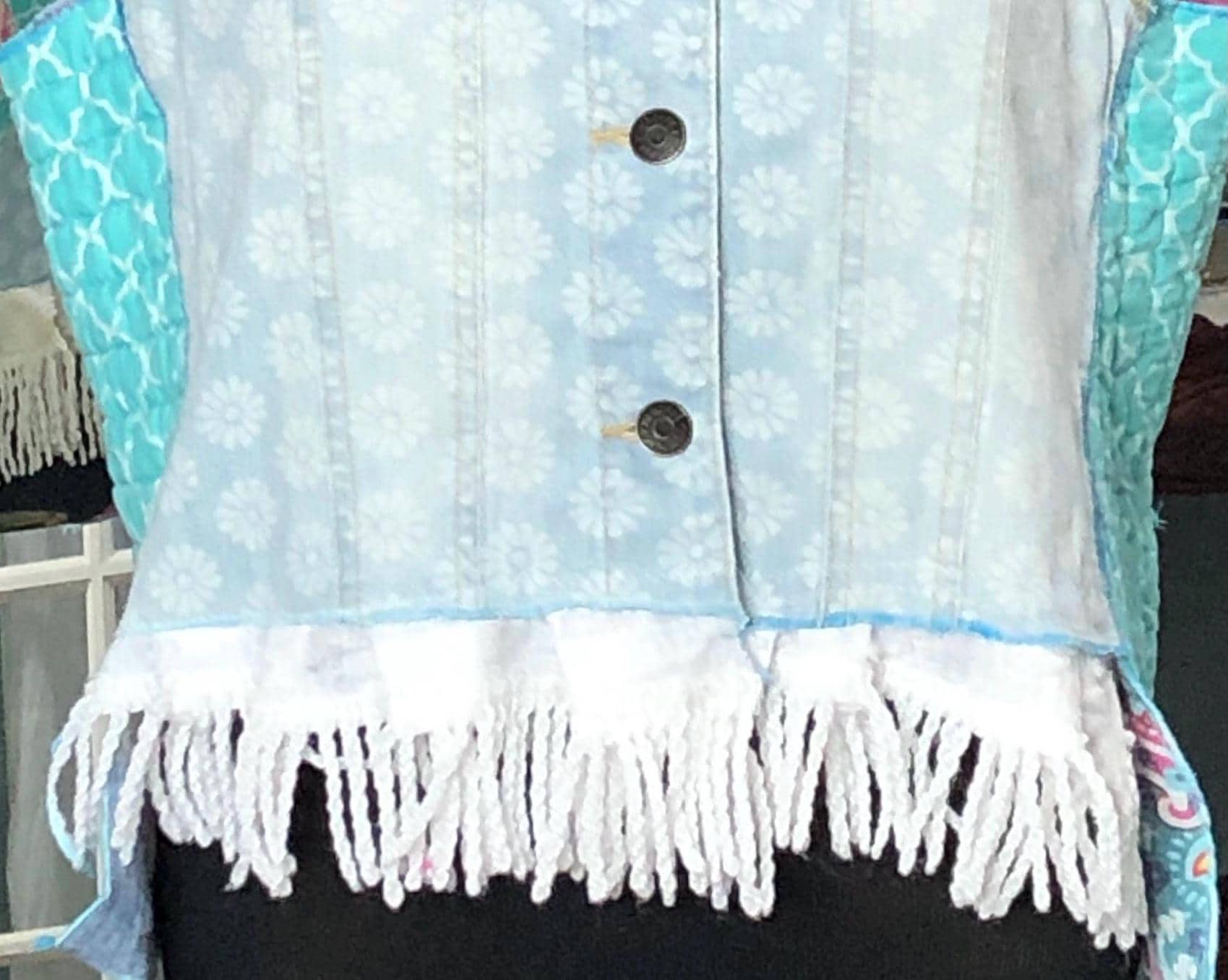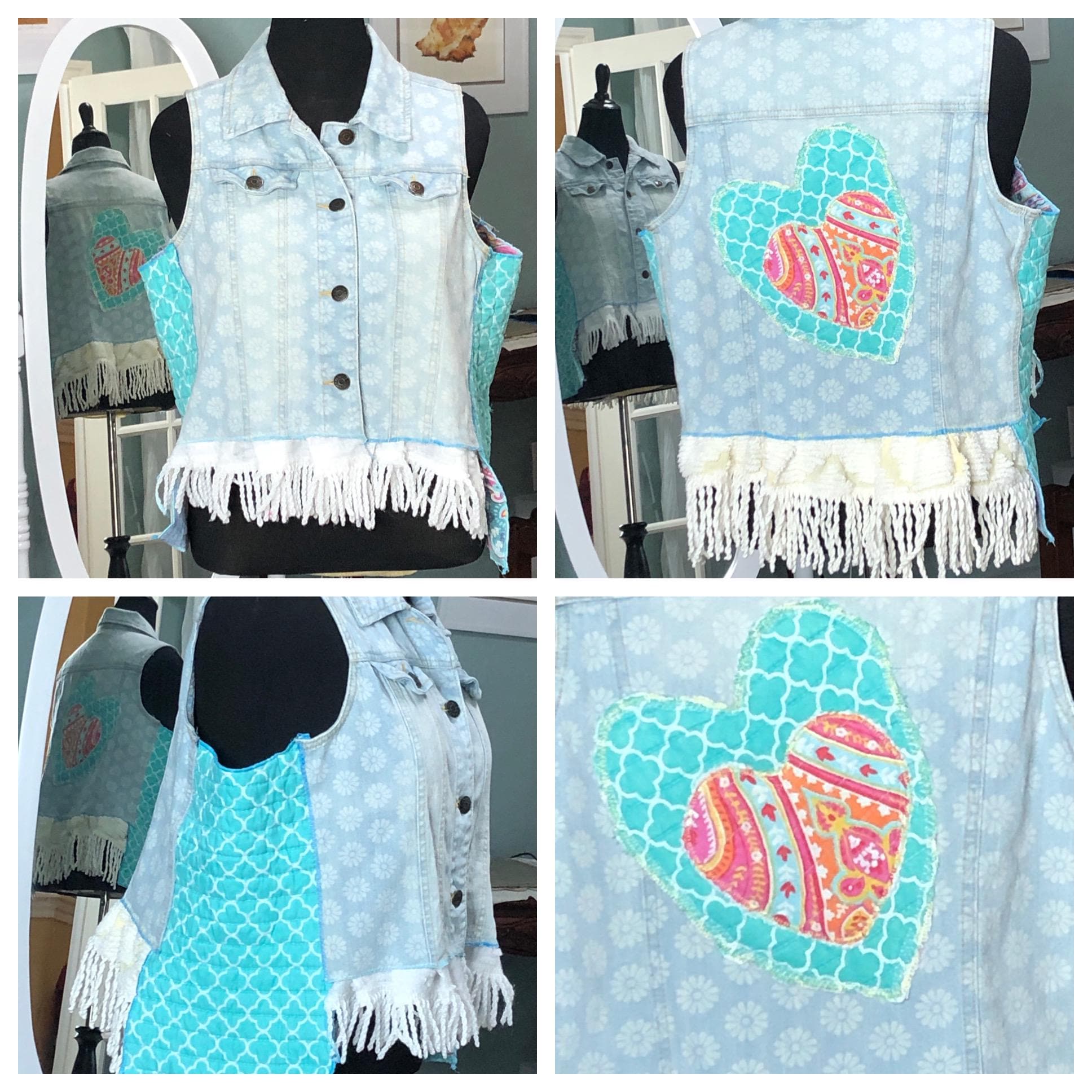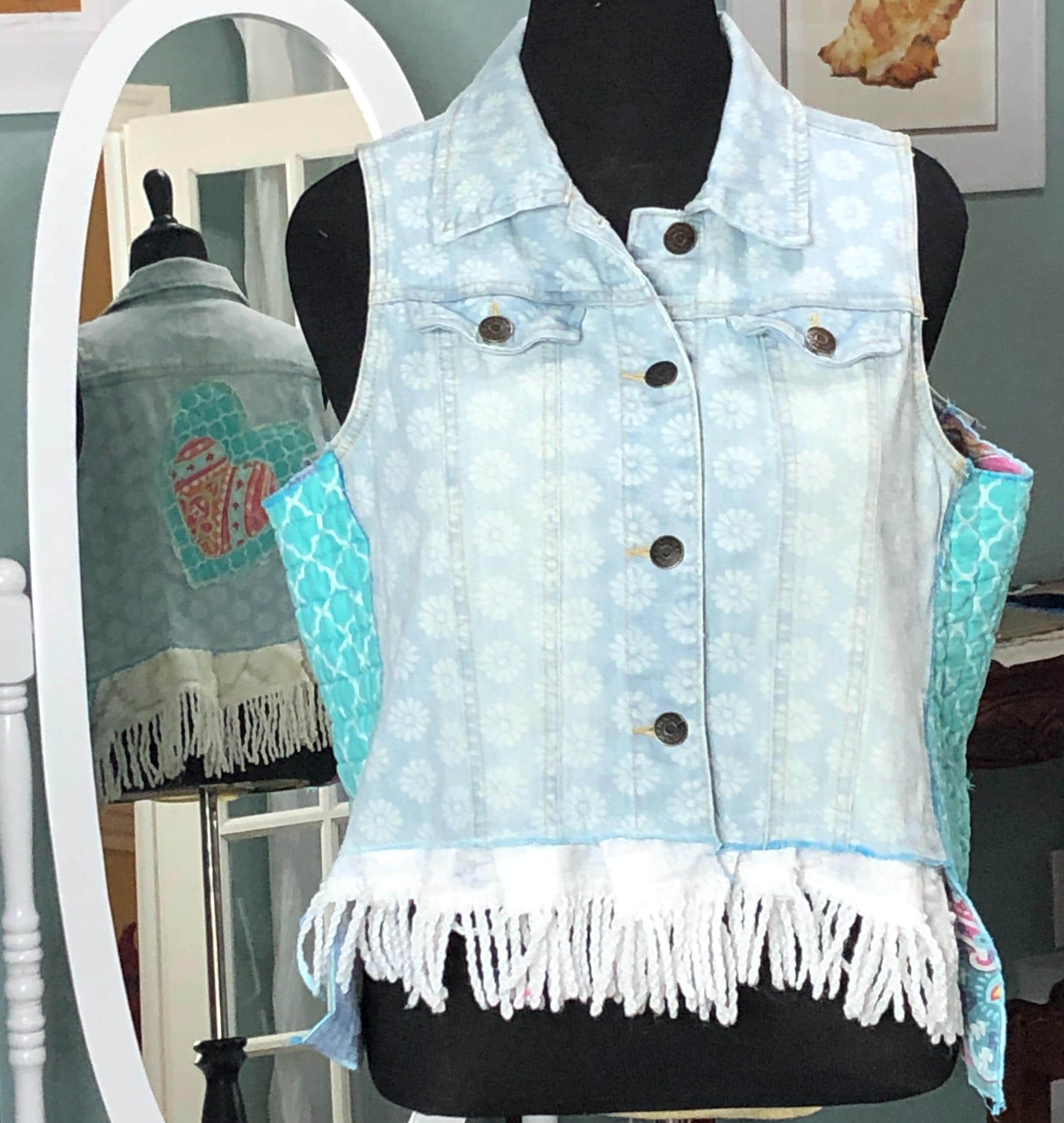 This short denim vest is the perfect piece to spice up any outfit. The light blue denim has white flowers printed on it. With the vintage chenille fringe trim, quilted side insets and heart appliqué, this one of a kind vest is sure to be a conversation starter.