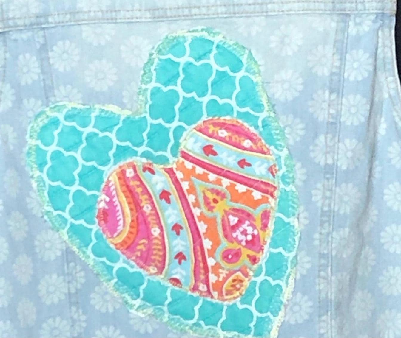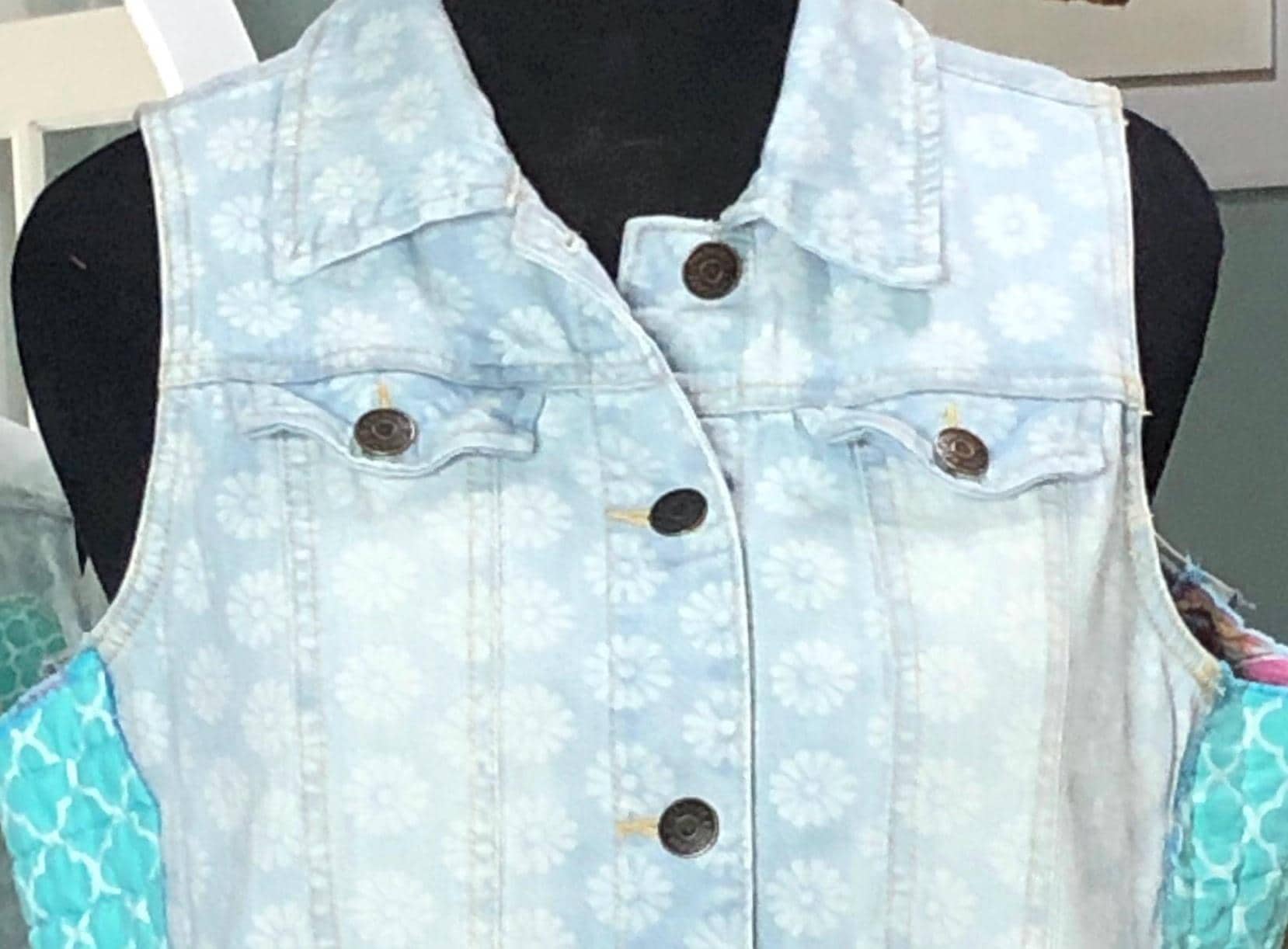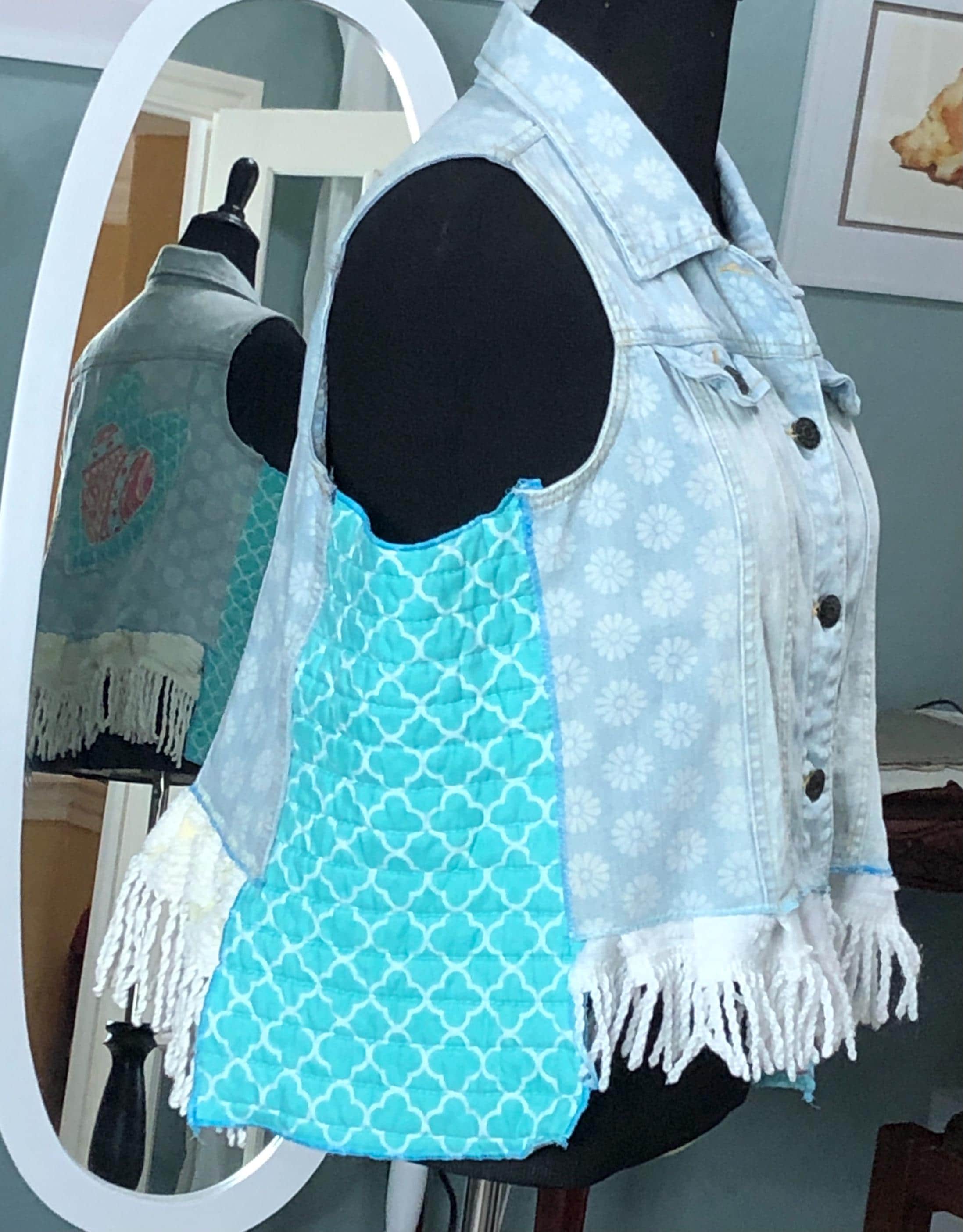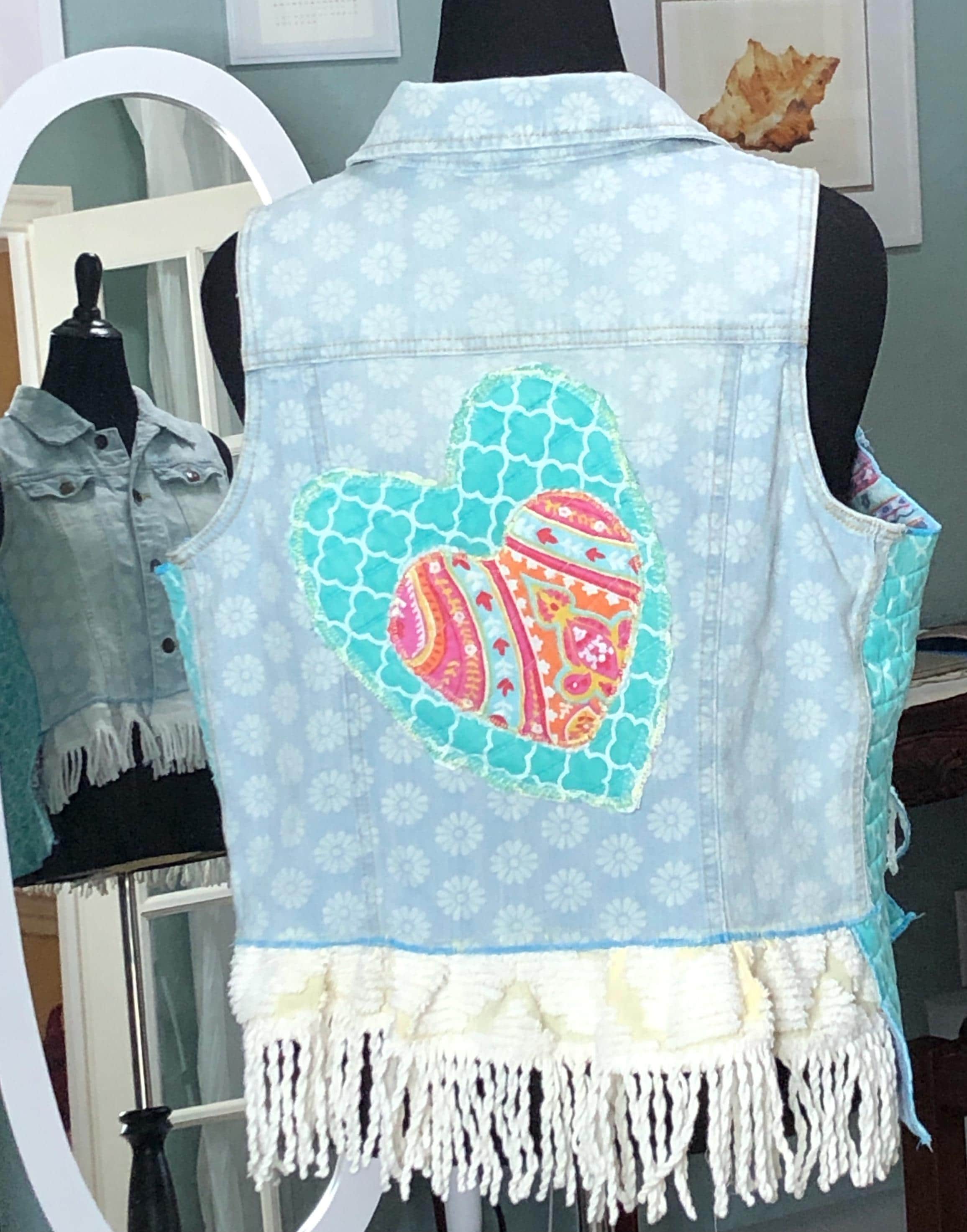 This short denim vest is the perfect piece to spice up any outfit. The light blue denim has white flowers printed on it. With the vintage chenille fringe trim, quilted side insets and heart appliqué, this one of a kind vest is sure to be a conversation starter.
