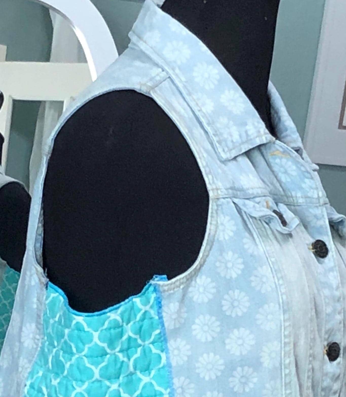 This cute vest was upcycled using a quilted bedcover and pieces from a vintage chenille bed spread.