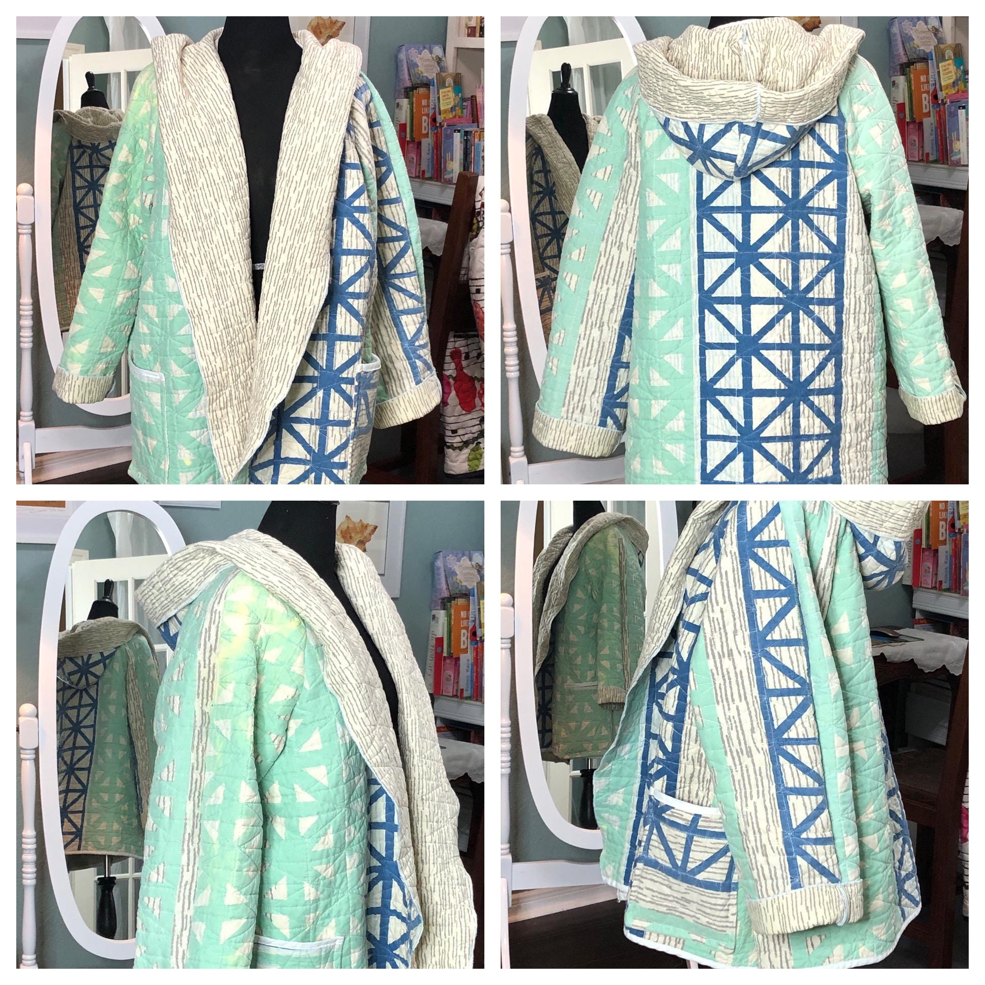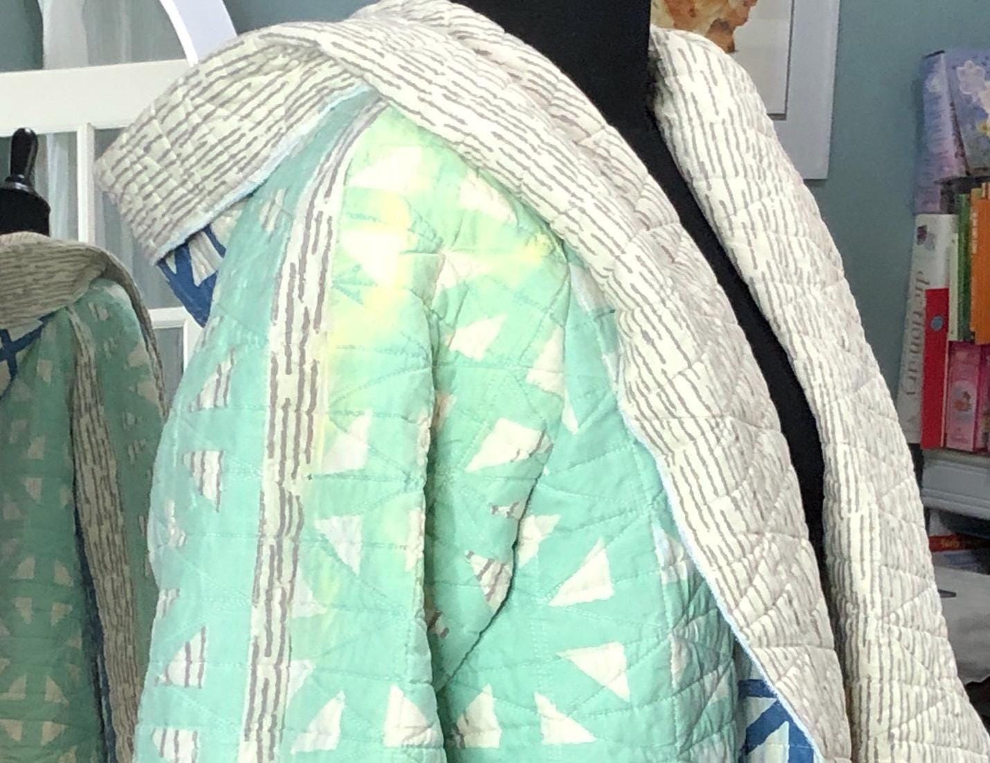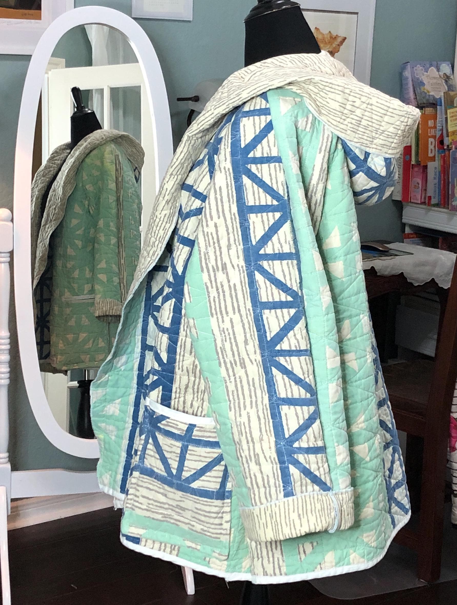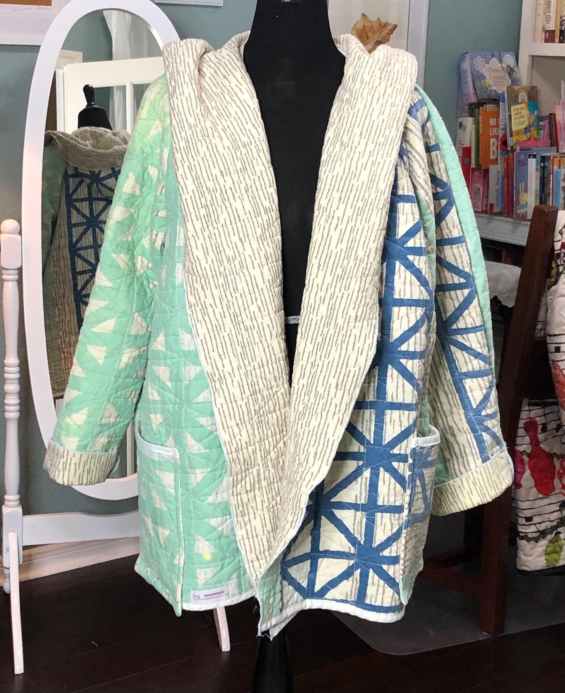 This beautiful handmade one of a kind hooded kimono coat was made from an upcycled quilted bedspread. Due to the nature of these upcycled pieces, all flaws are carefully repaired most often using creative stitching. The style is long sleeve and flexibly sized. the colors are beautiful and vivid. aqua green, cream gray stripe, and blue this quilt is warm and comfy. I have estimated this to fit a size up to 2X comfortably, but please review the measurements below to ensure a perfect fit oh and check out the two large front pockets.