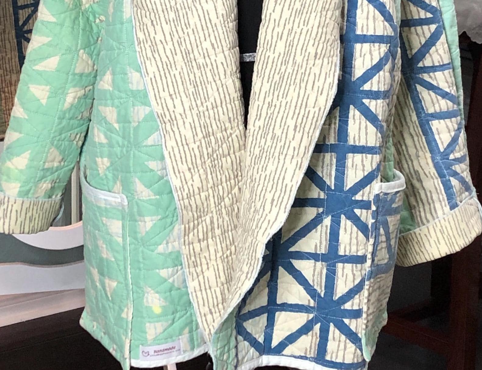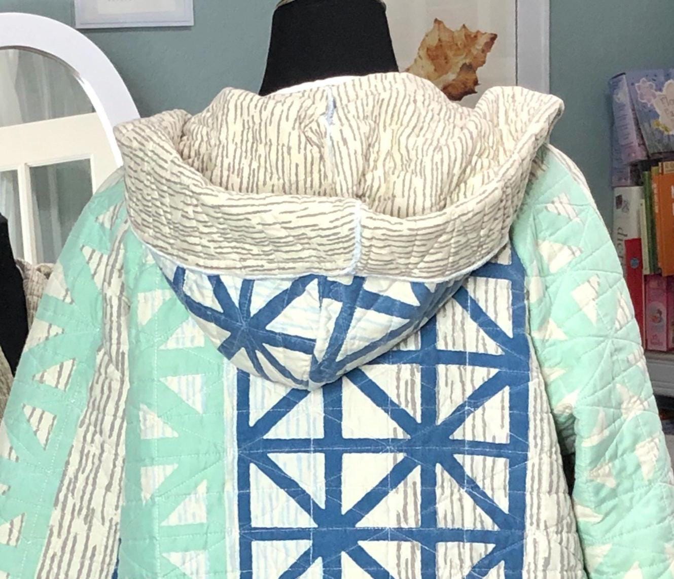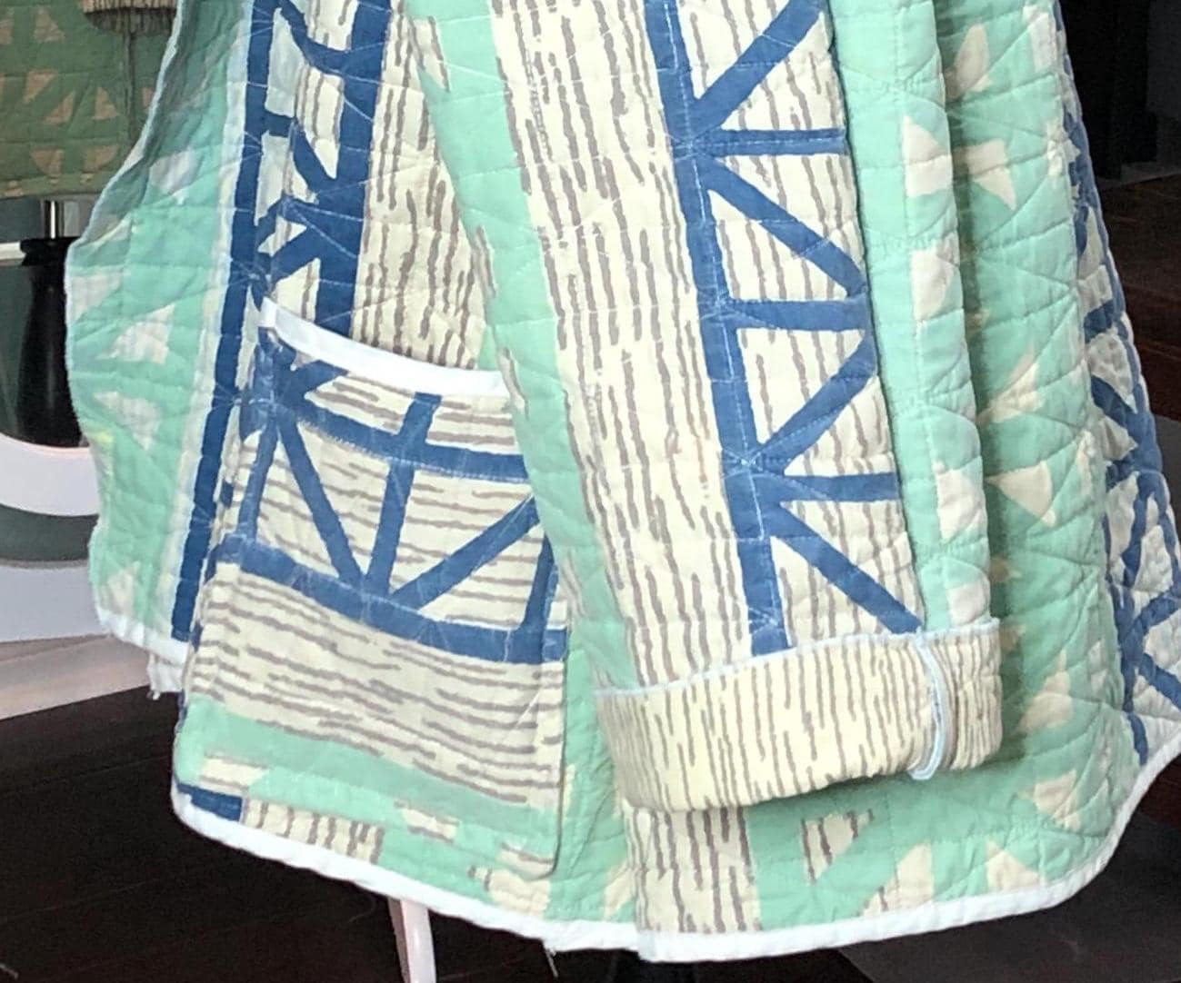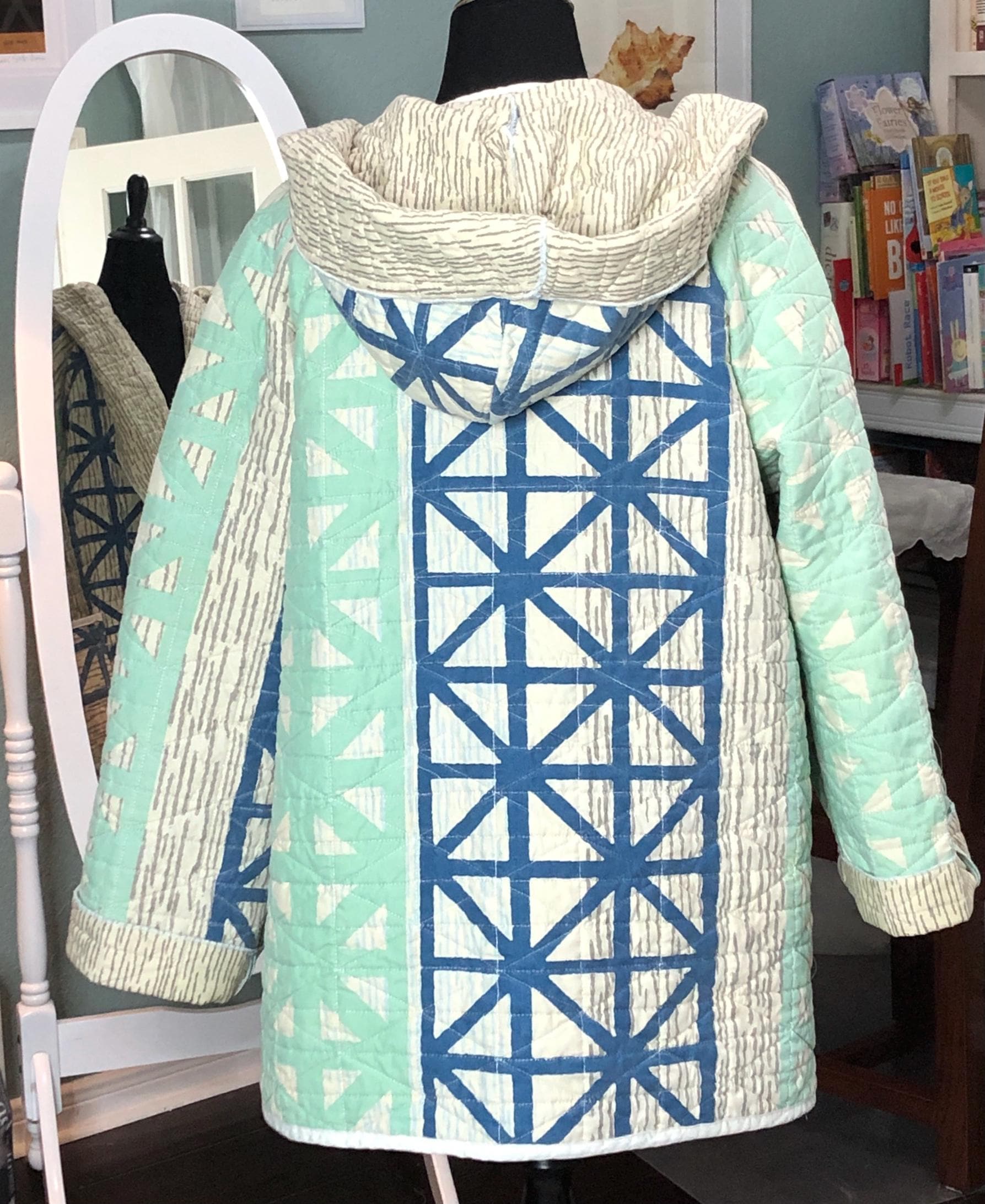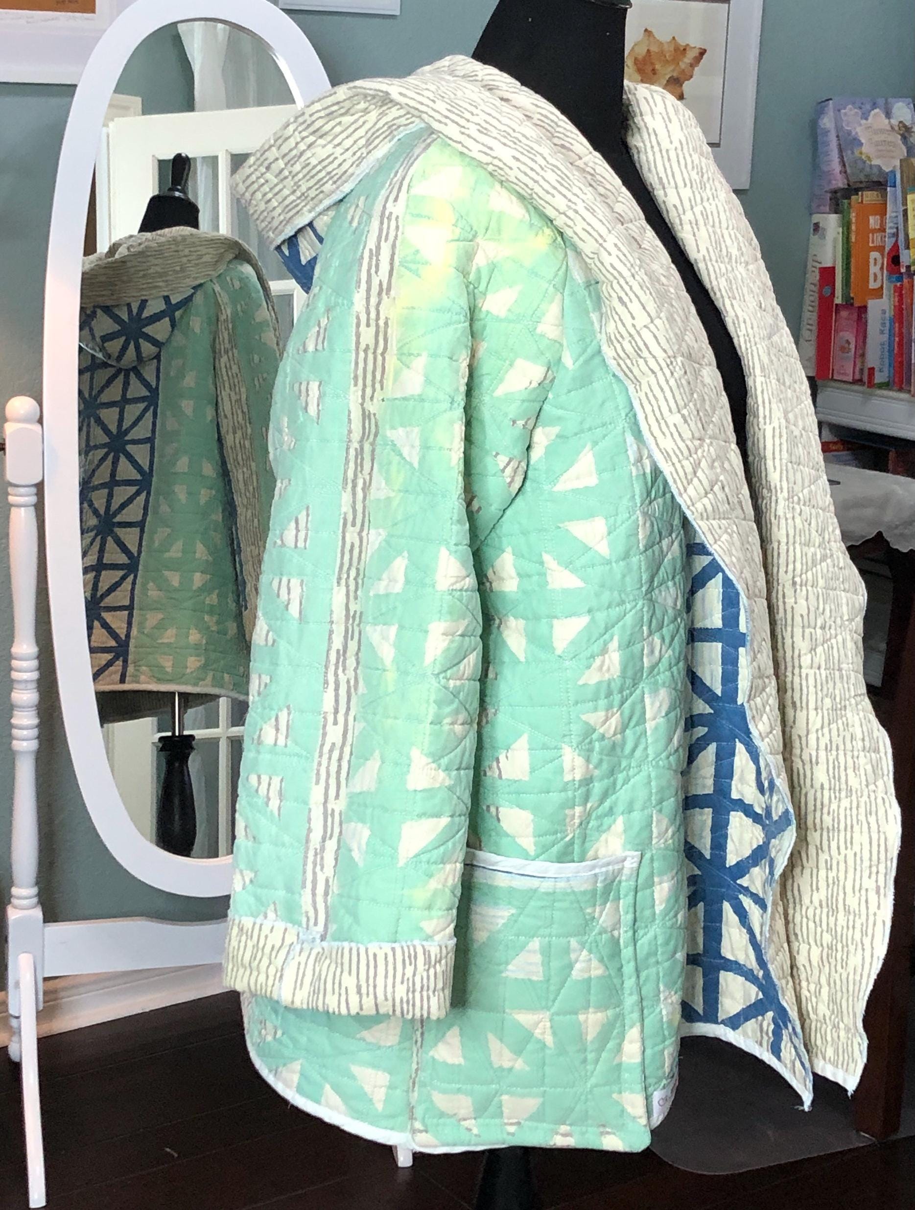 This beautiful handmade one of a kind hooded kimono coat was made from an upcycled quilted bedspread. Due to the nature of these upcycled pieces, all flaws are carefully repaired most often using creative stitching. The style is long sleeve and flexibly sized. the colors are beautiful and vivid. aqua green, cream gray stripe, and blue this quilt is warm and comfy. I have estimated this to fit a size up to 2X comfortably, but please review the measurements below to ensure a perfect fit oh and check out the two large front pockets.