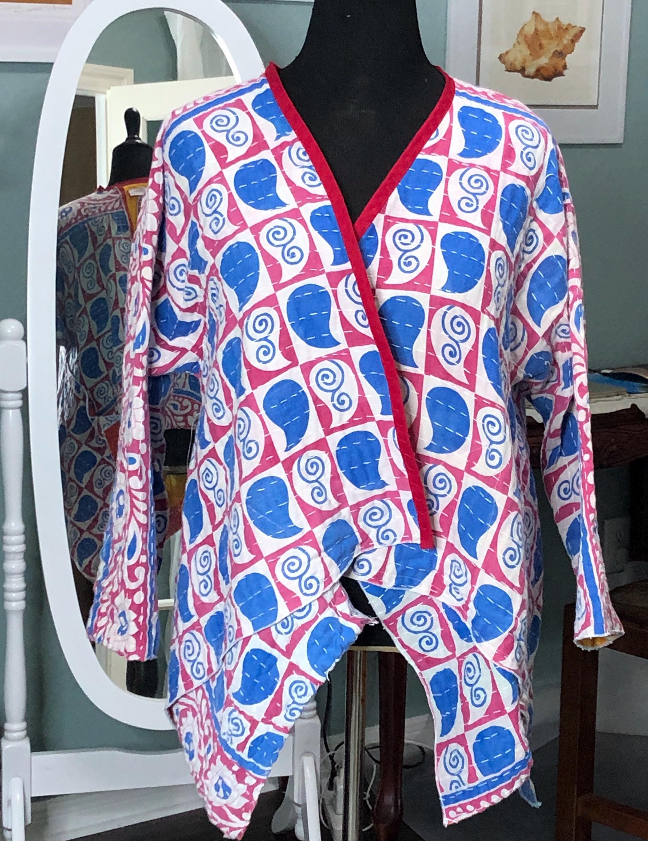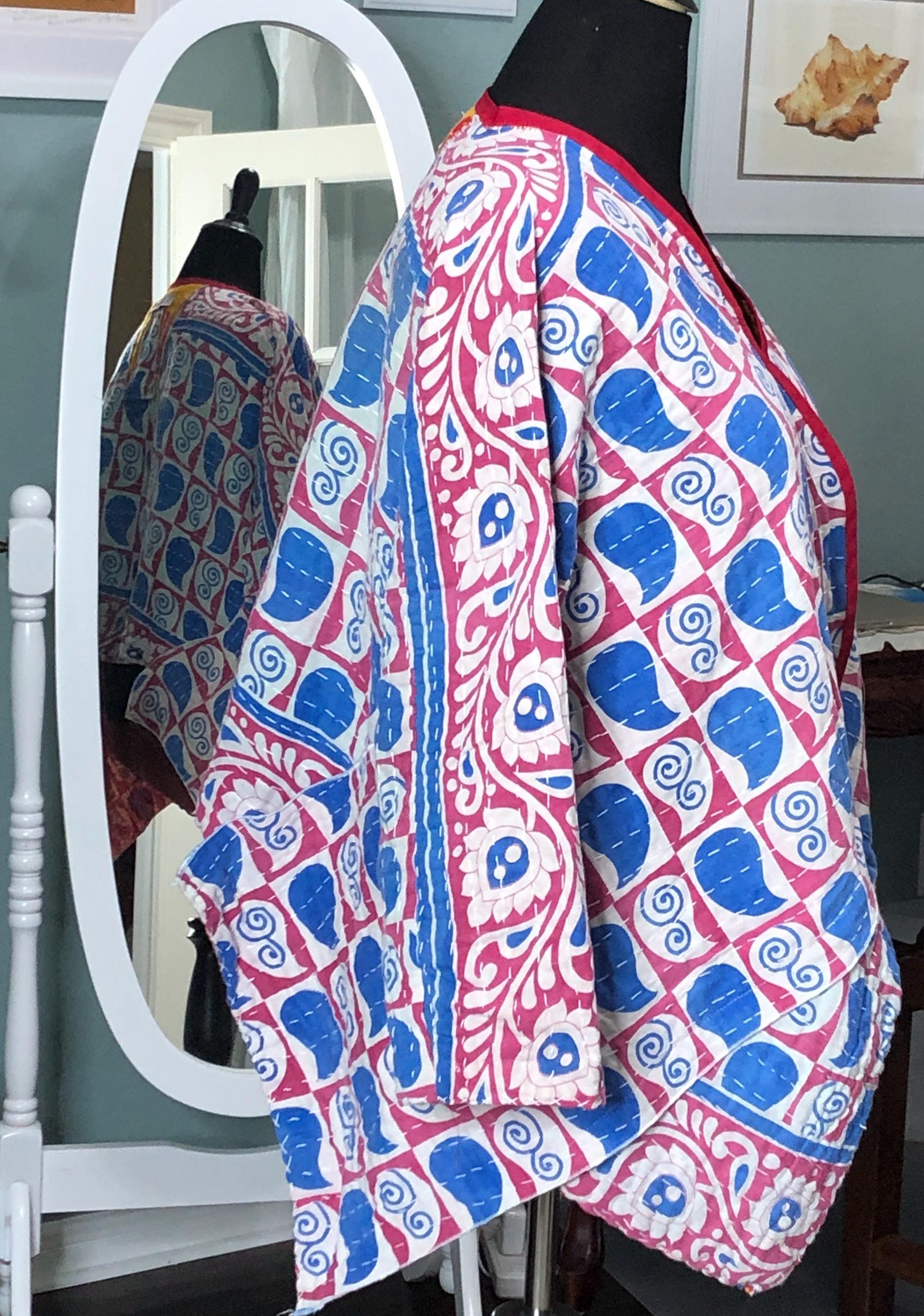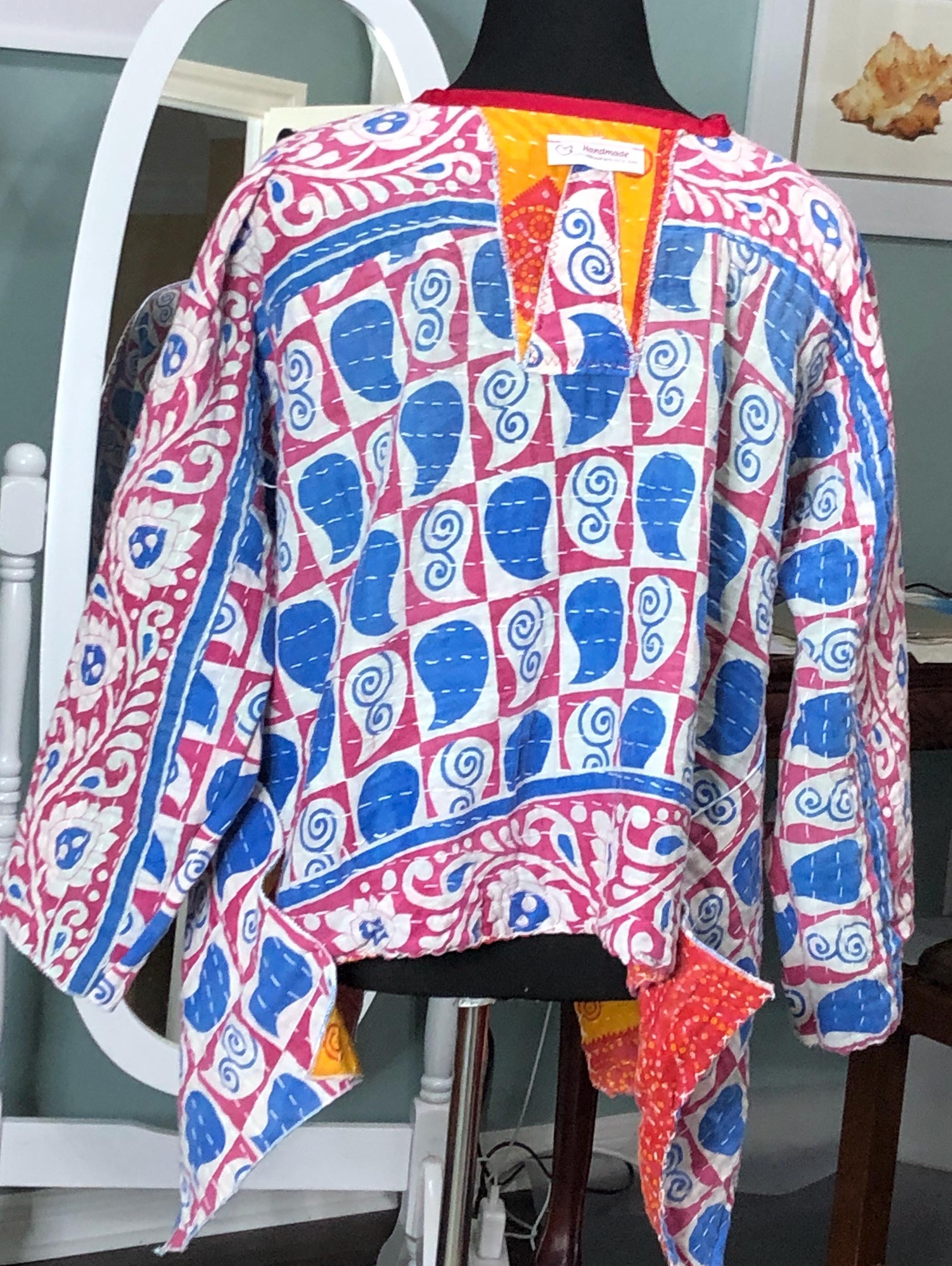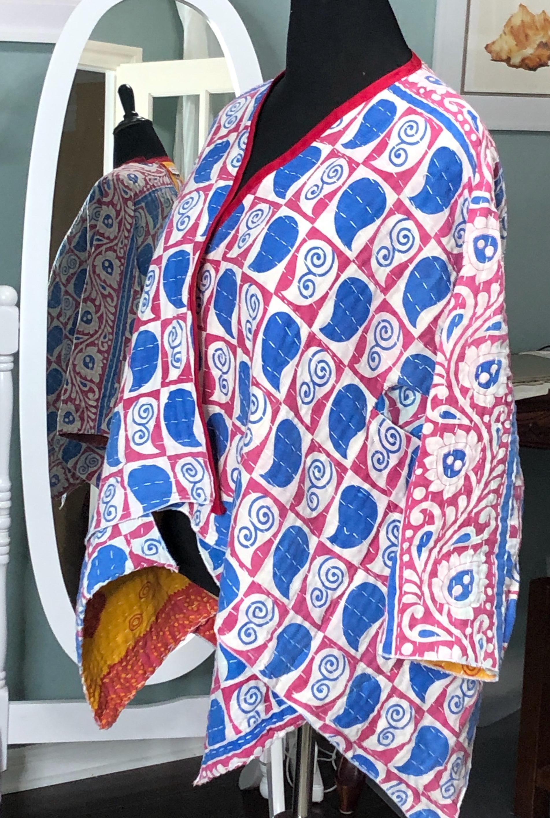 This beautiful one of a kind women’s short shrug is made of soft kantha quilted cotton. One side has a blue and red print and the other side is red with an orange print. This jacket is perfect for any occasion. The open sides and front with 3/4 length kimono sleeves is easy fitting and stylish. The sides are wrapped up in front to form large pockets.