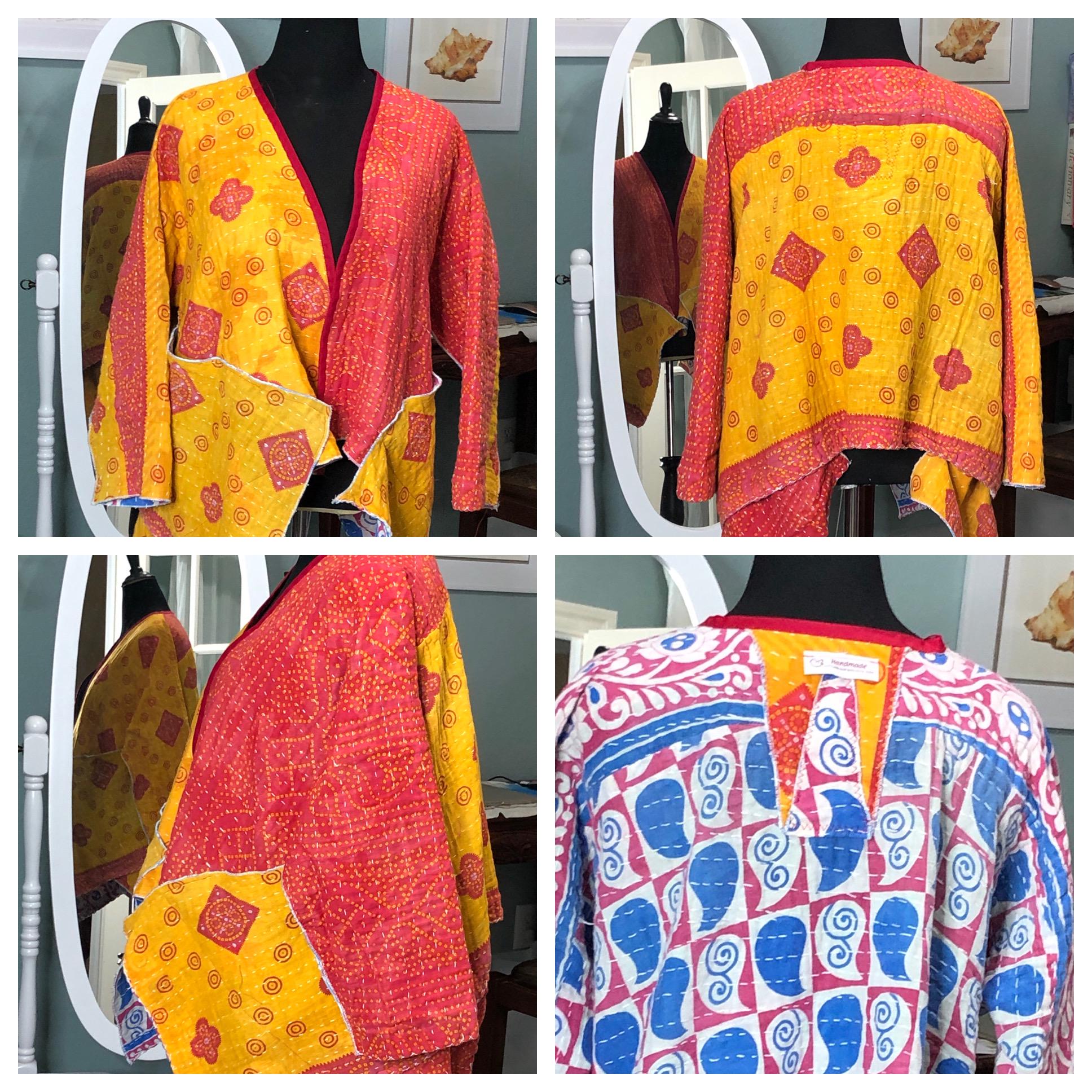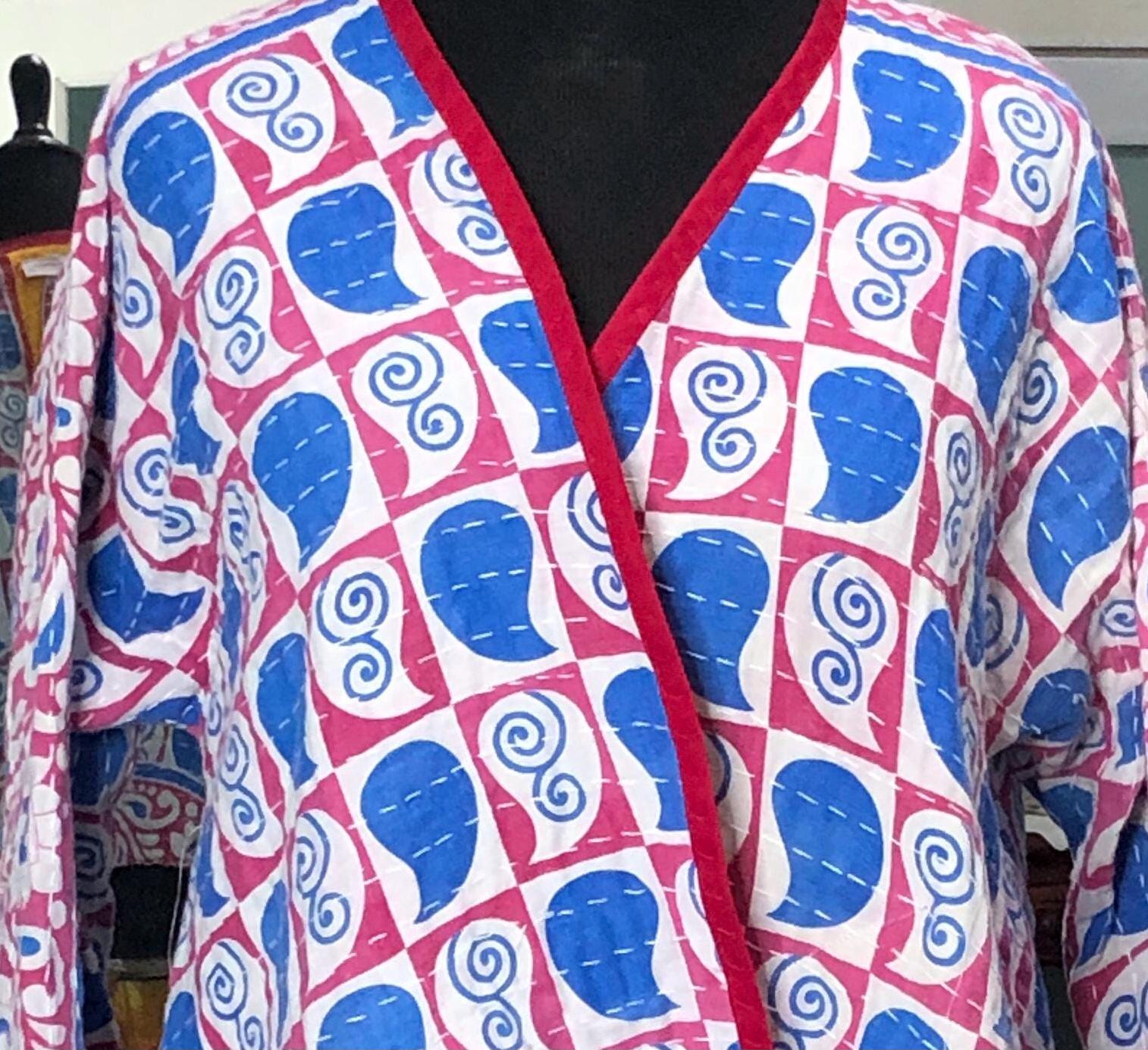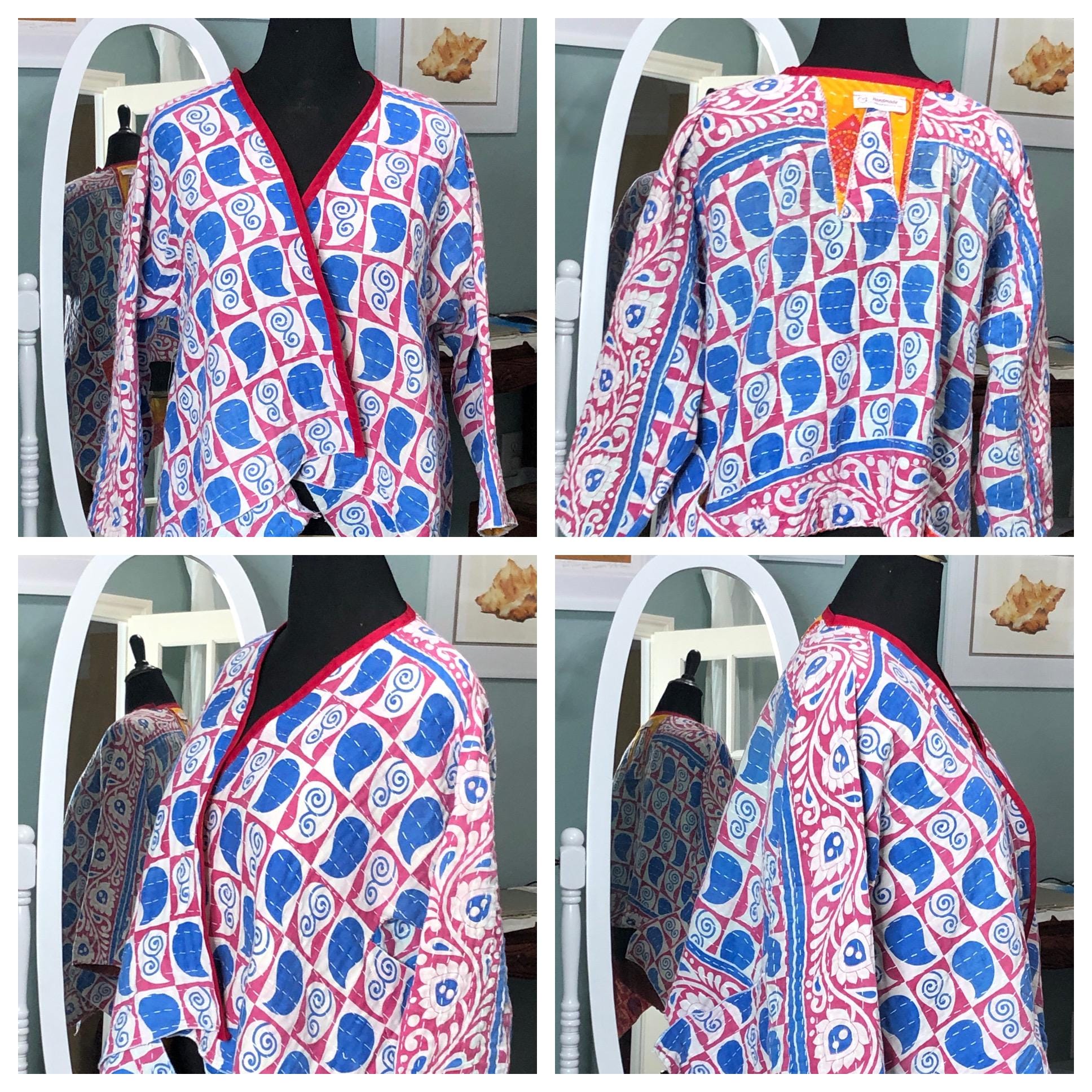 This beautiful one of a kind women’s short shrug is made of soft kantha quilted cotton. One side has a blue and red print and the other side is red with an orange print. This jacket is perfect for any occasion. The open sides and front with 3/4 length kimono sleeves is easy fitting and stylish. The sides are wrapped up in front to form large pockets.