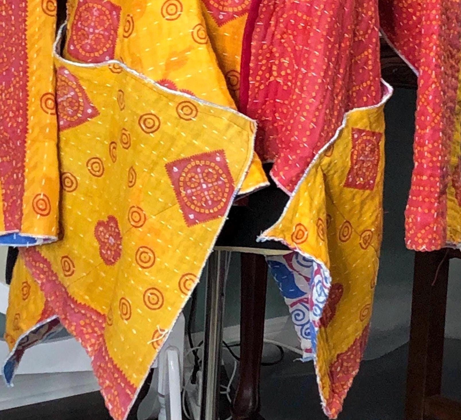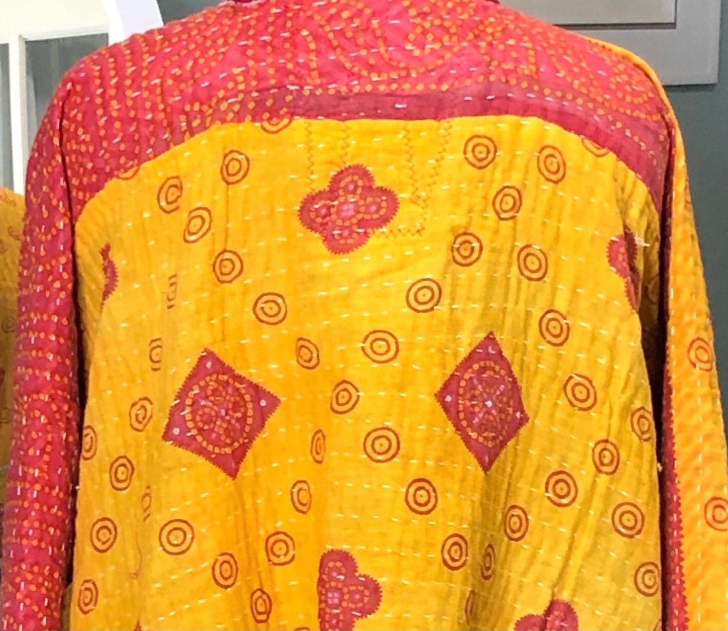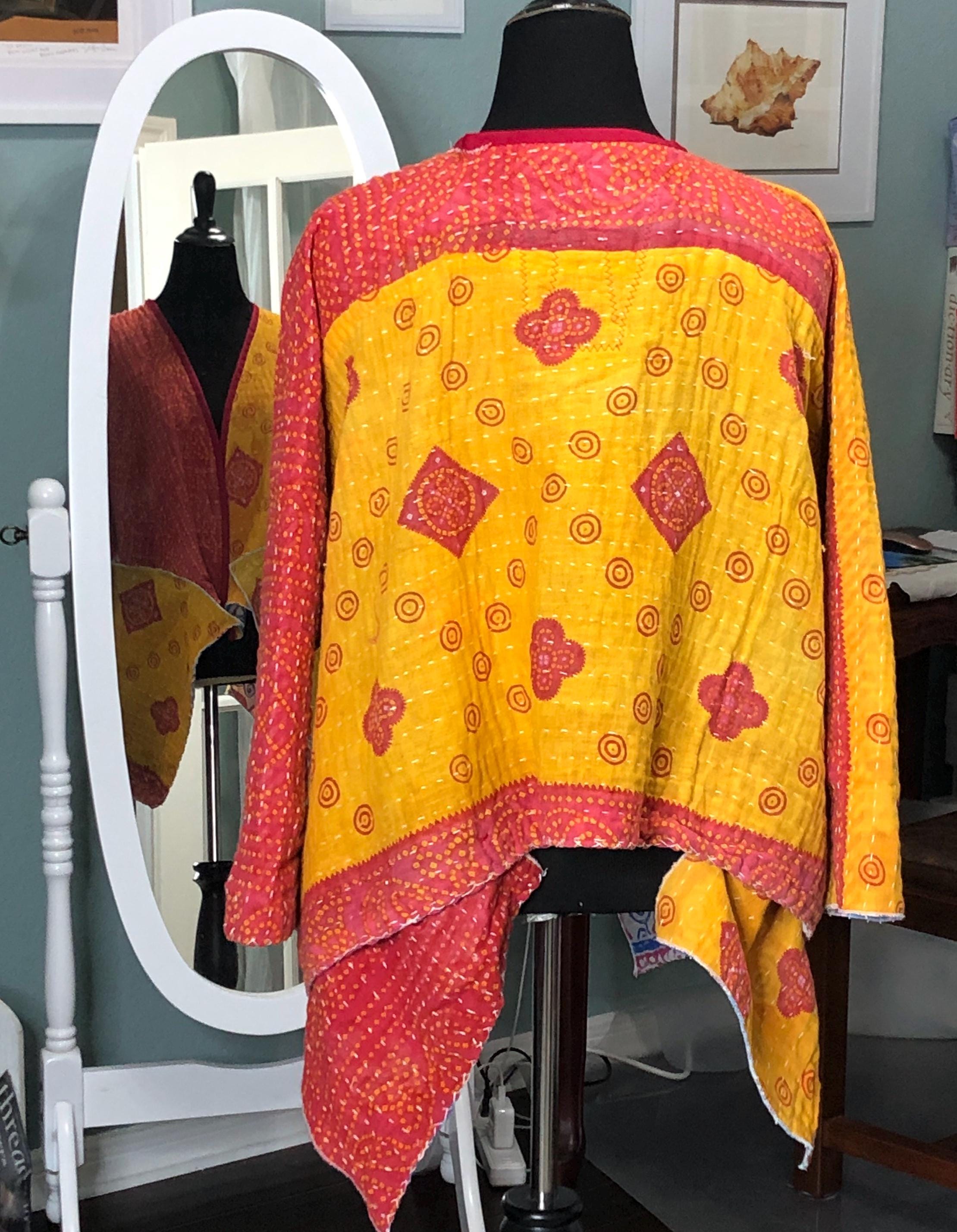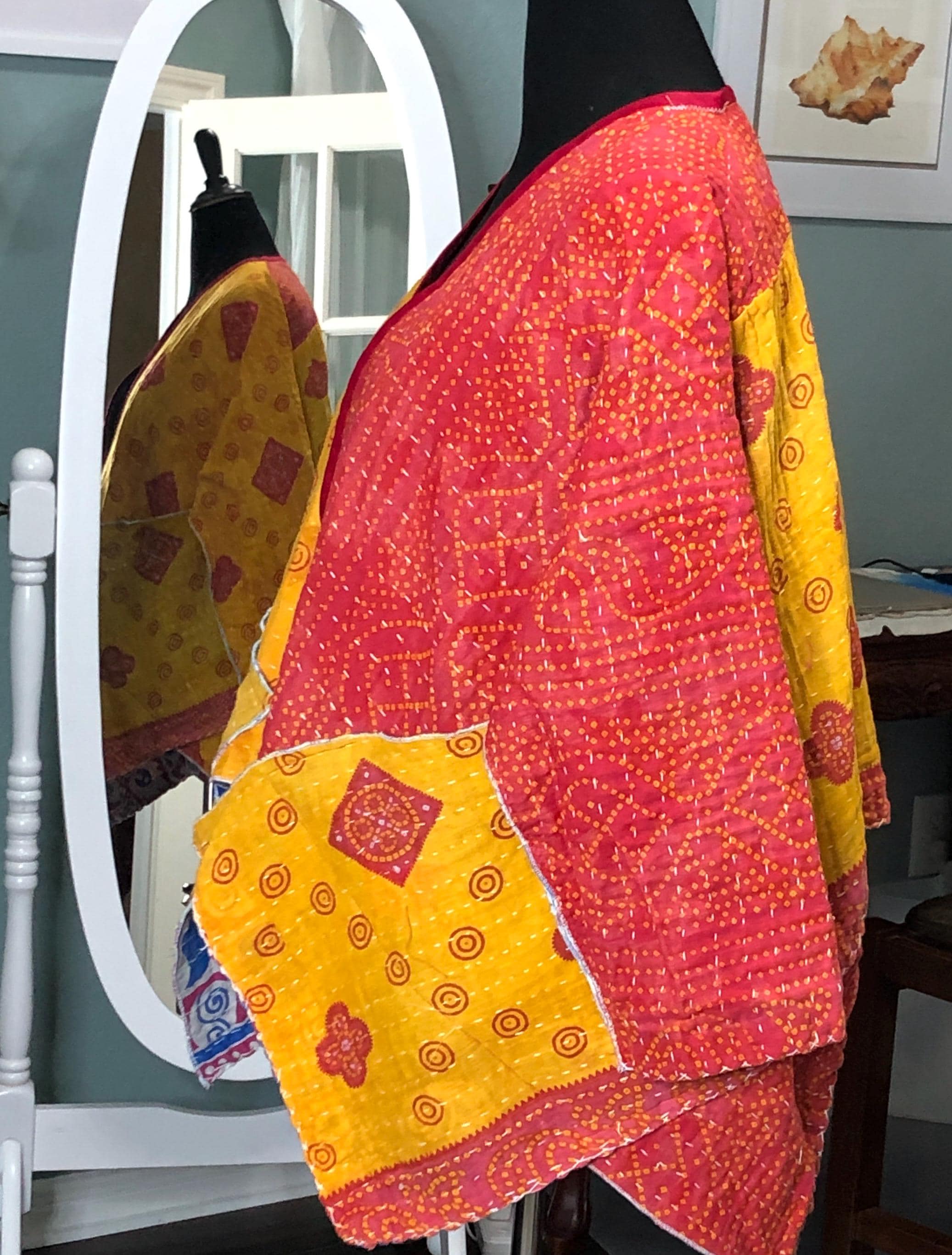 This beautiful one of a kind women’s short shrug is made of soft kantha quilted cotton. One side has a blue and red print and the other side is red with an orange print. This jacket is perfect for any occasion. The open sides and front with 3/4 length kimono sleeves is easy fitting and stylish. The sides are wrapped up in front to form large pockets.