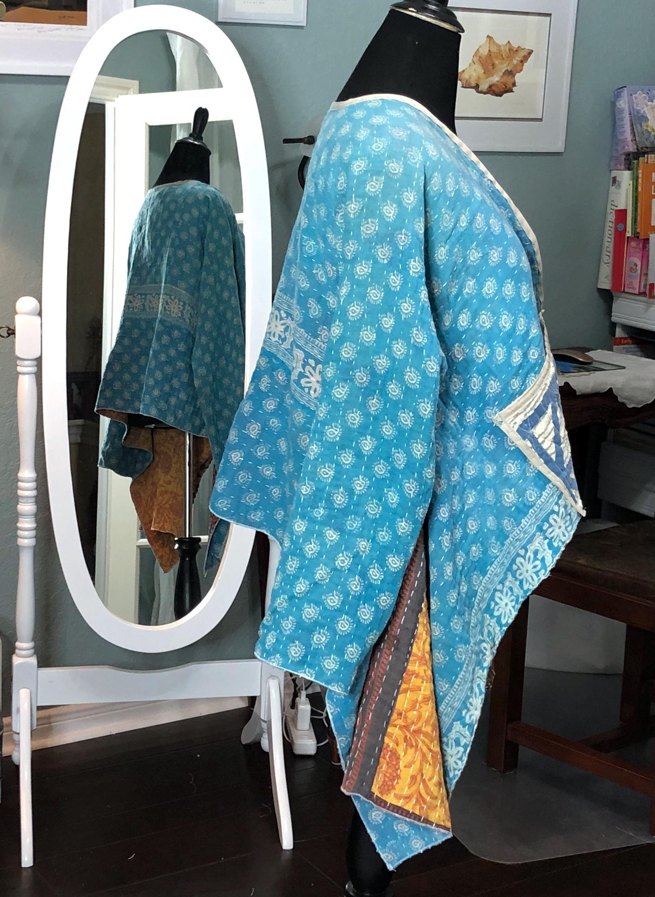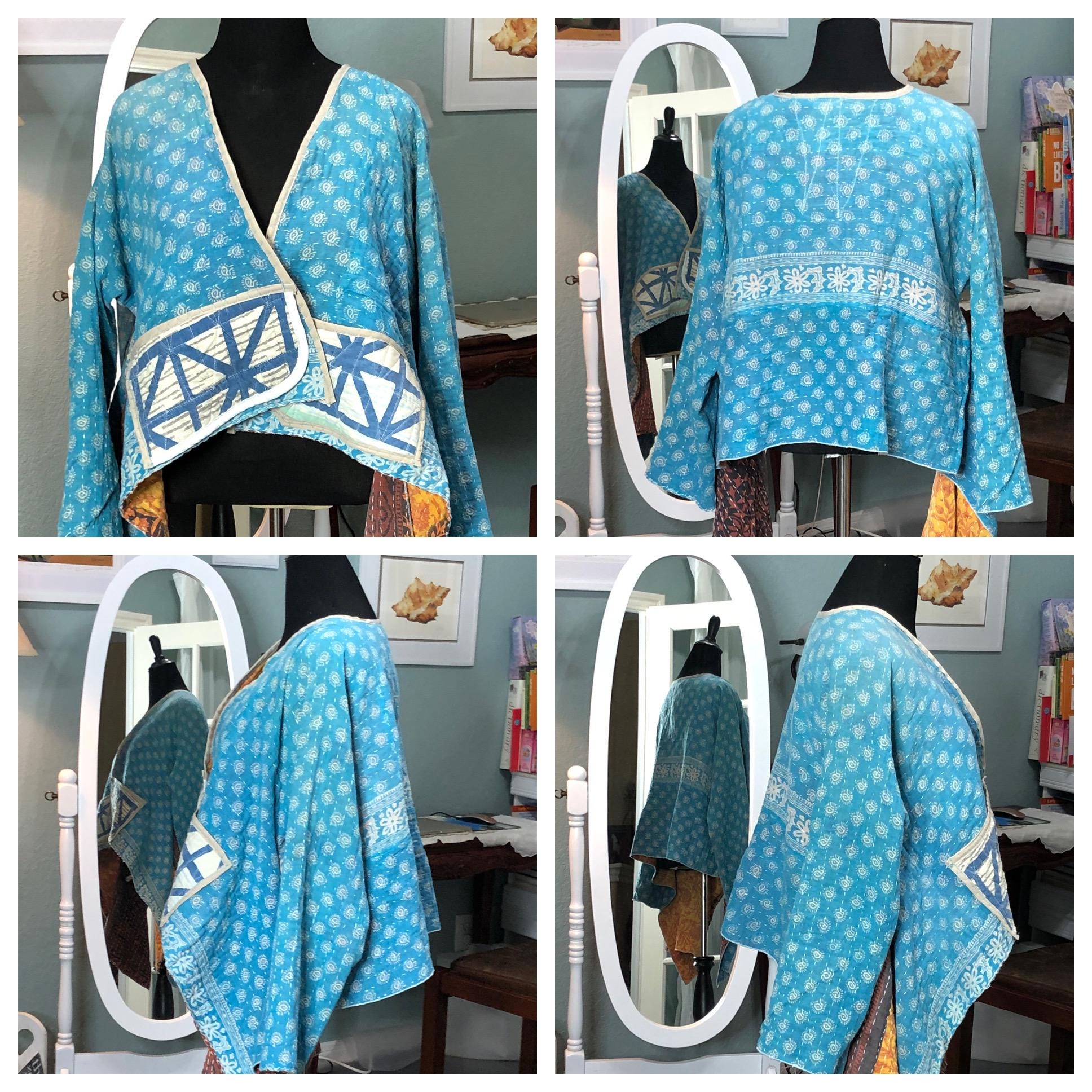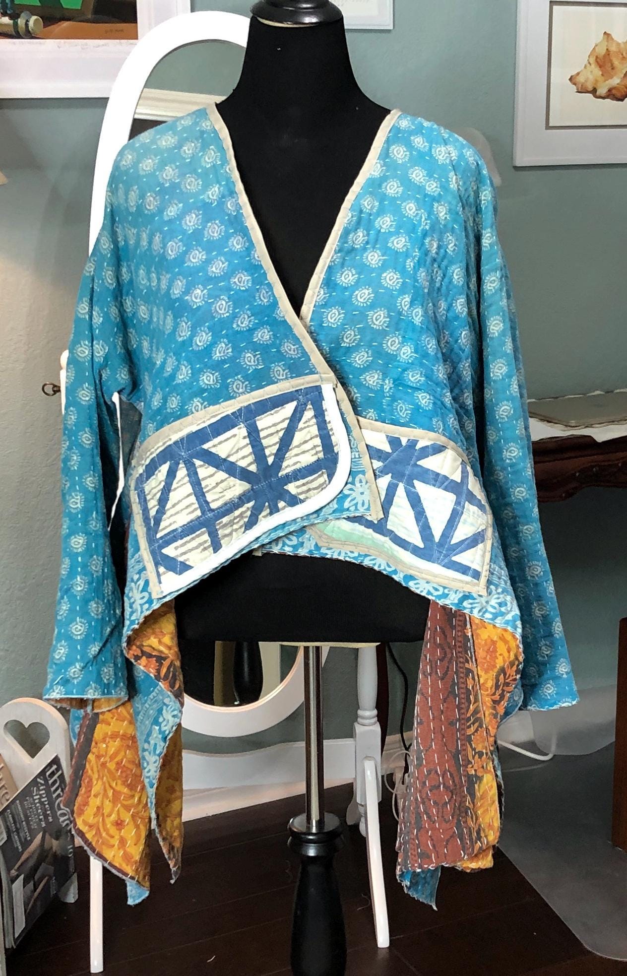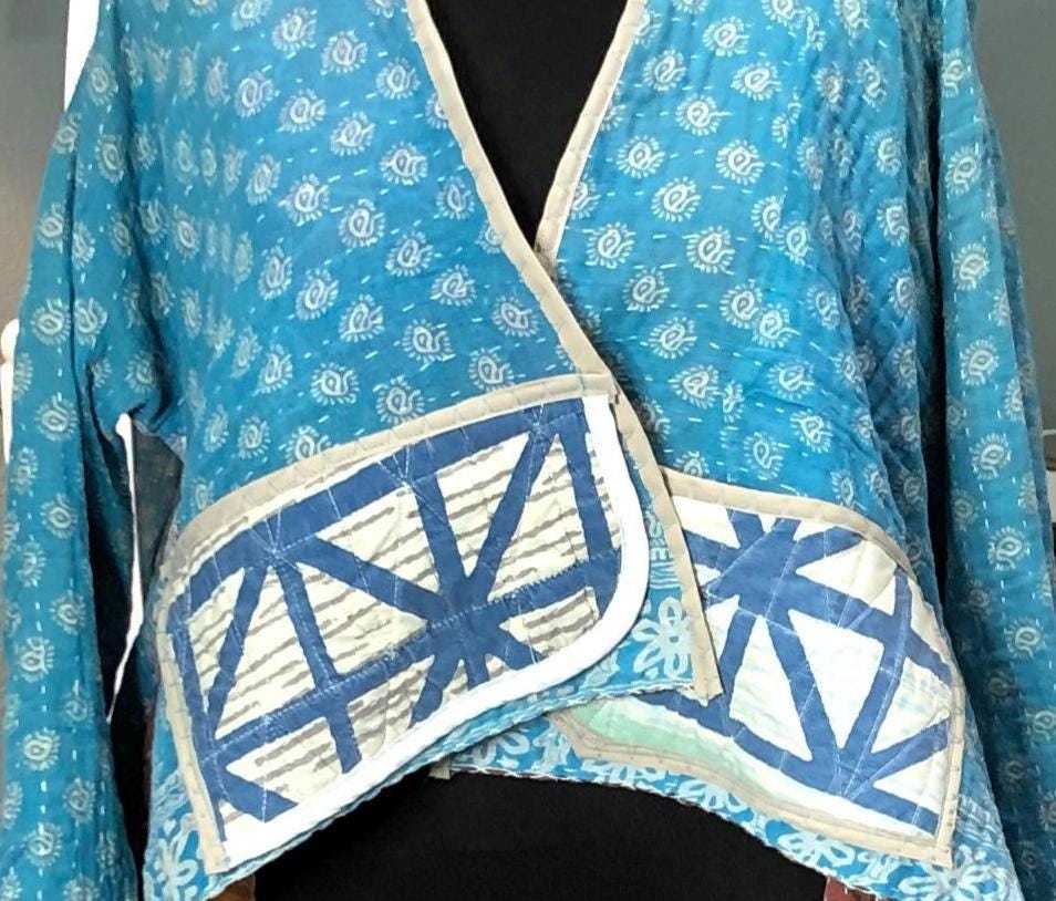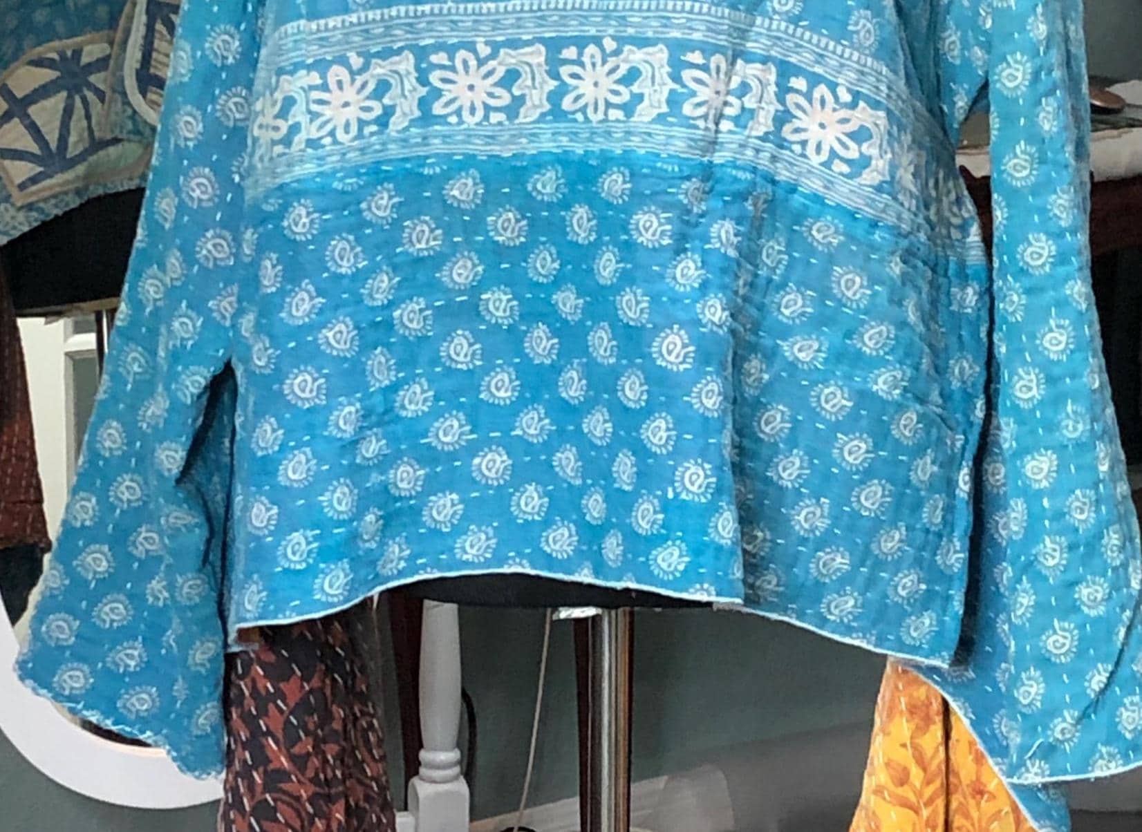 This beautiful one of a kind women’s short shrug is made of soft kantha quilted cotton. It has a blue background print with small white flowers and there are two special blue quilted pockets. This jacket is perfect for any occasion. The open sides and front with 3/4 length kimono sleeves is easy fitting and stylish.