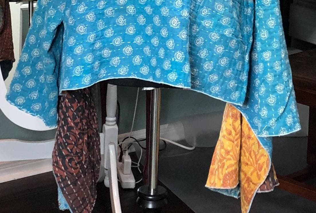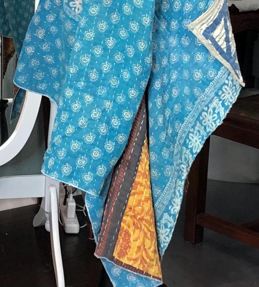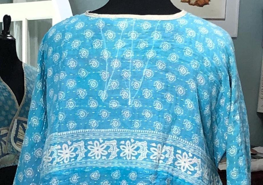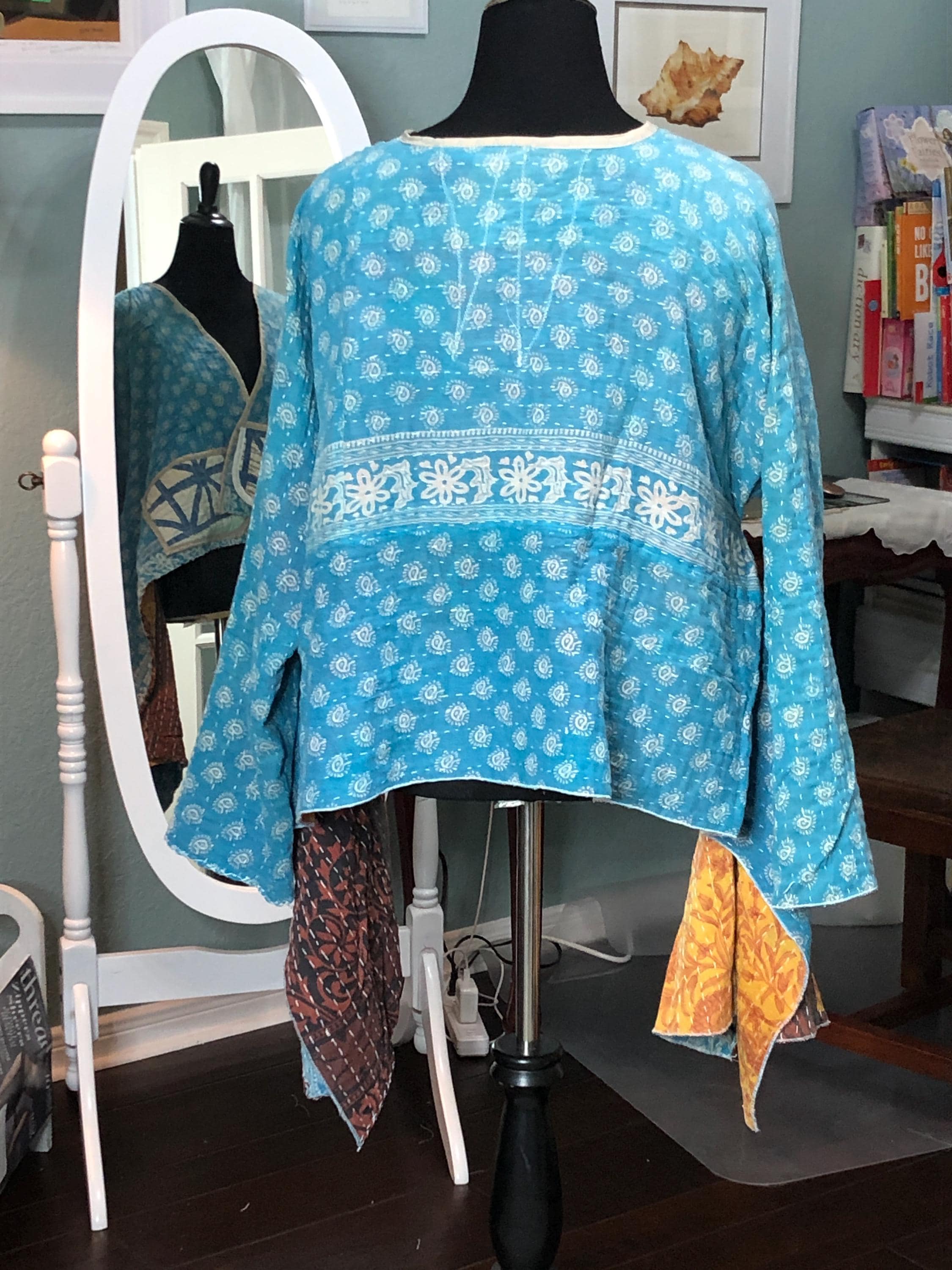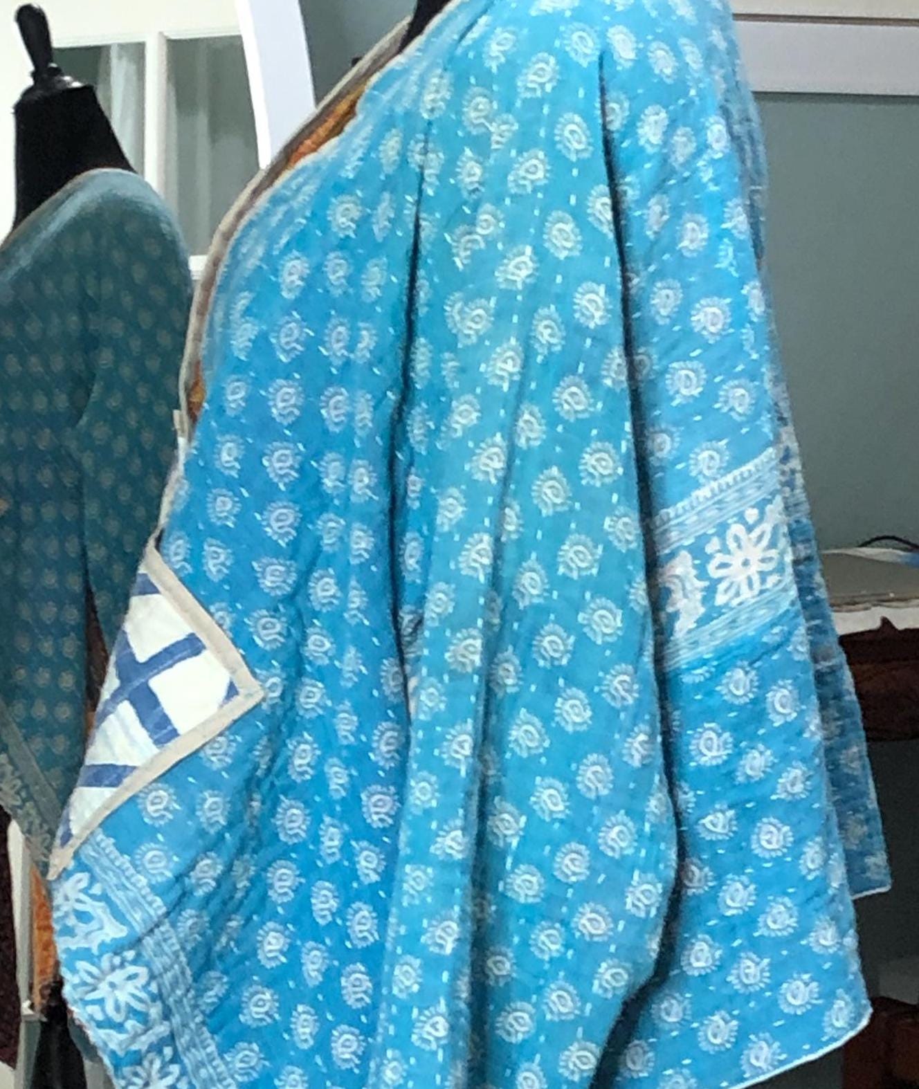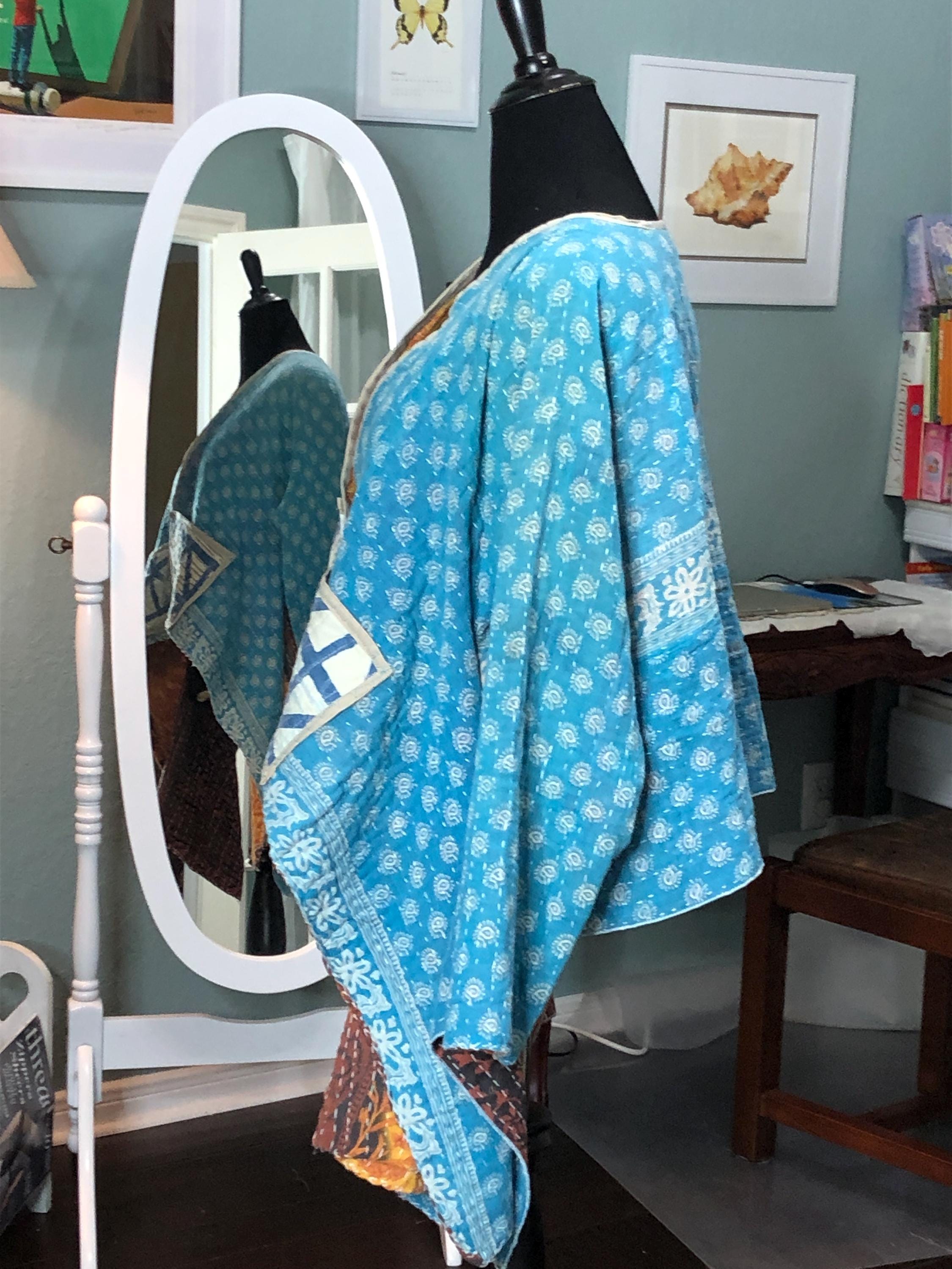 This beautiful one of a kind women’s short shrug is made of soft kantha quilted cotton. It has a blue background print with small white flowers and there are two special blue quilted pockets. This jacket is perfect for any occasion. The open sides and front with 3/4 length kimono sleeves is easy fitting and stylish.