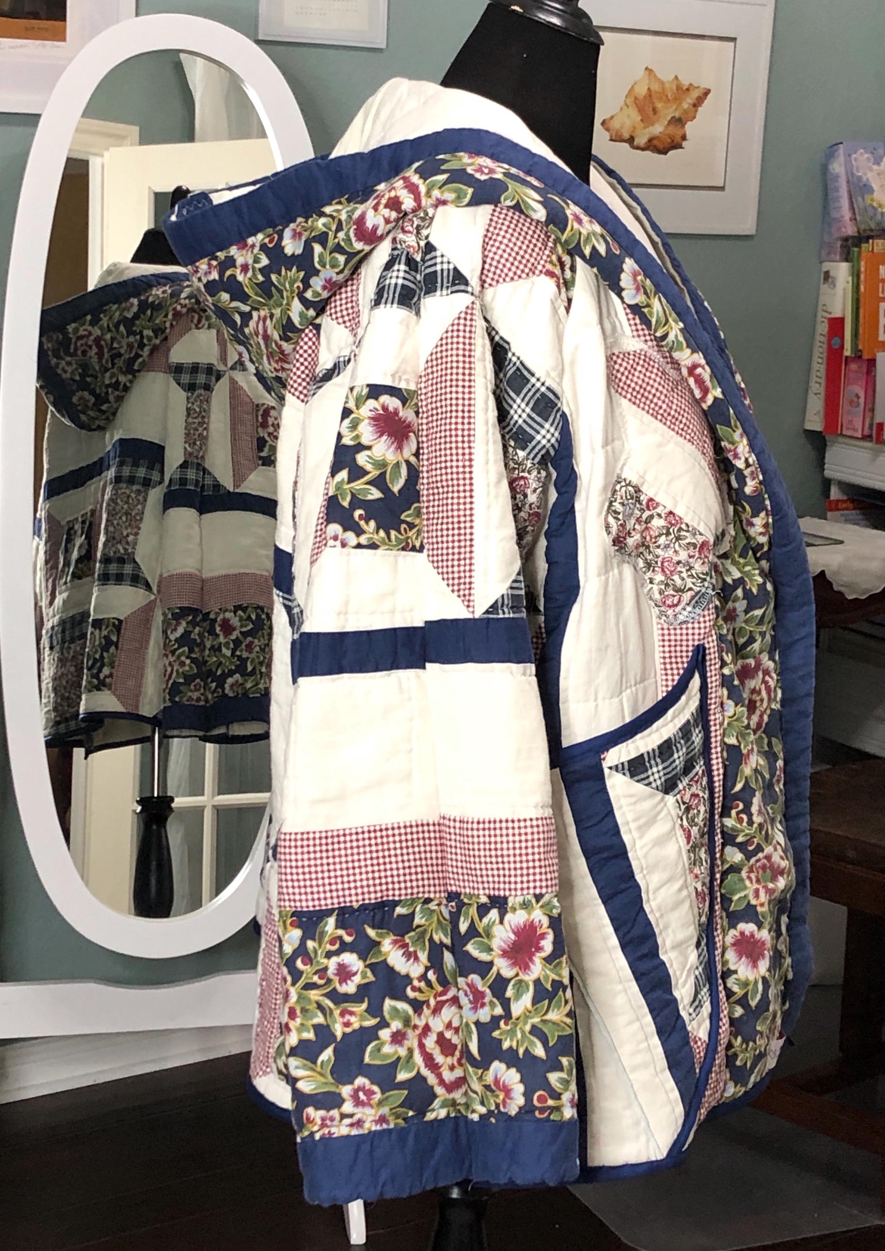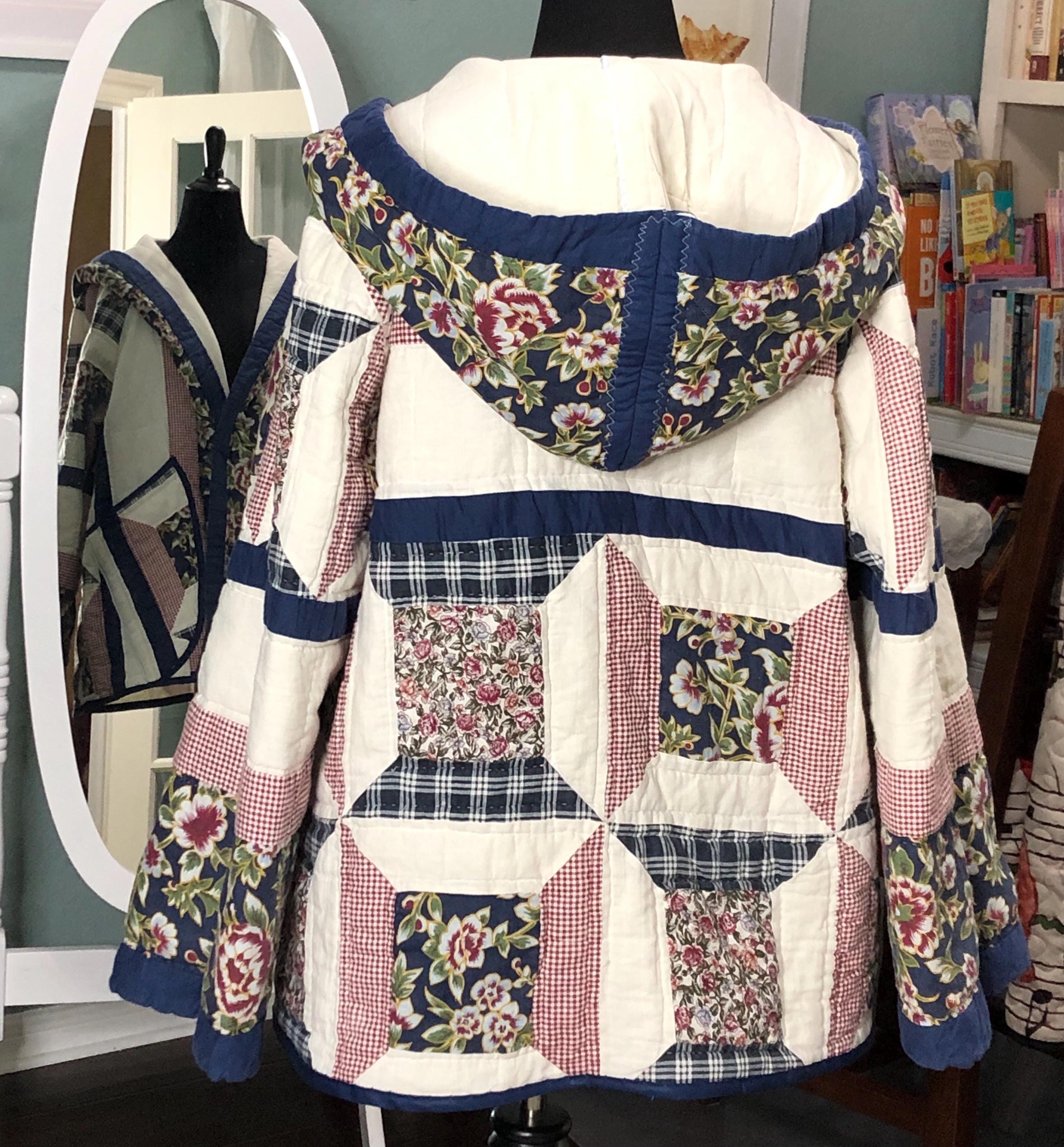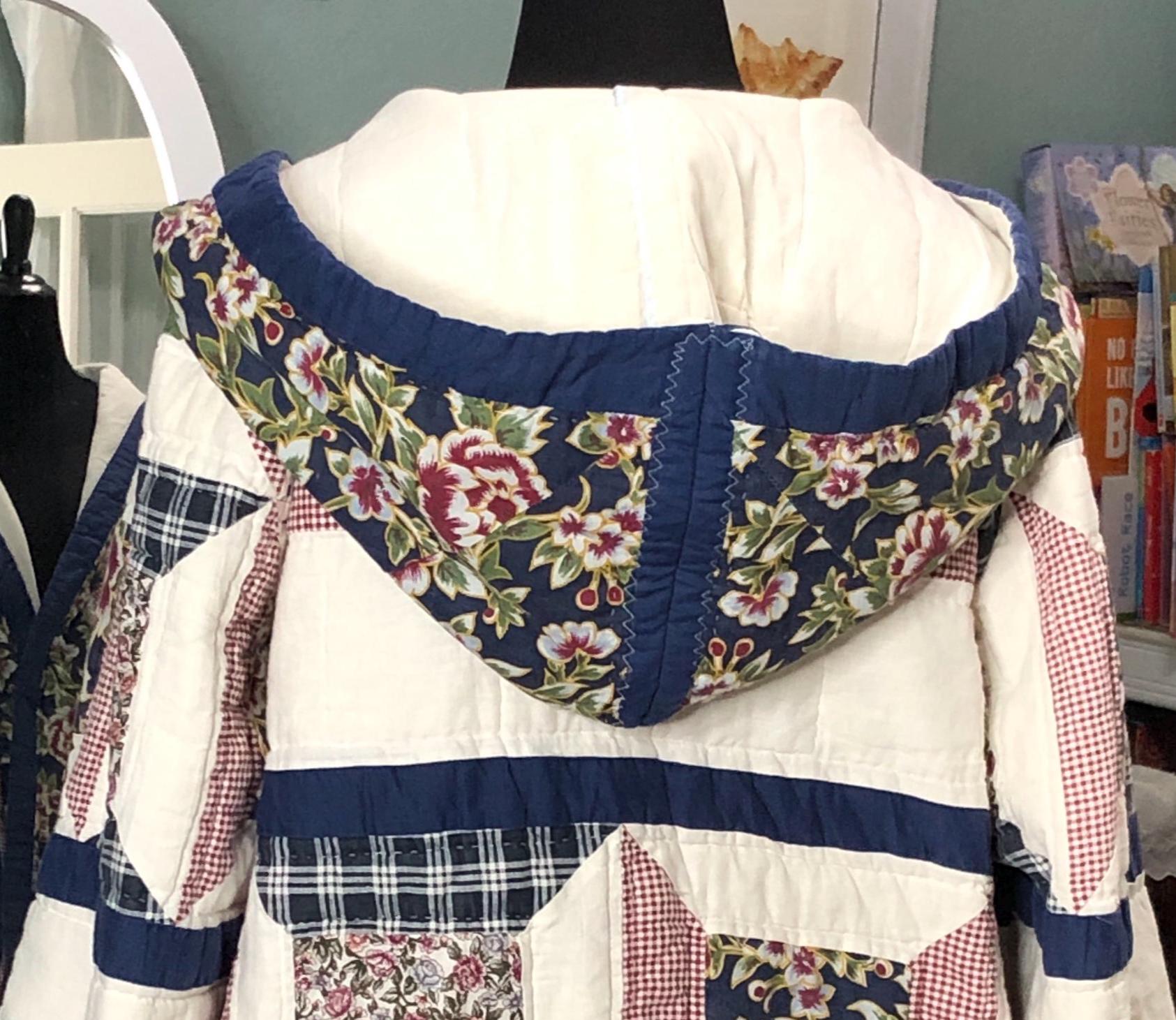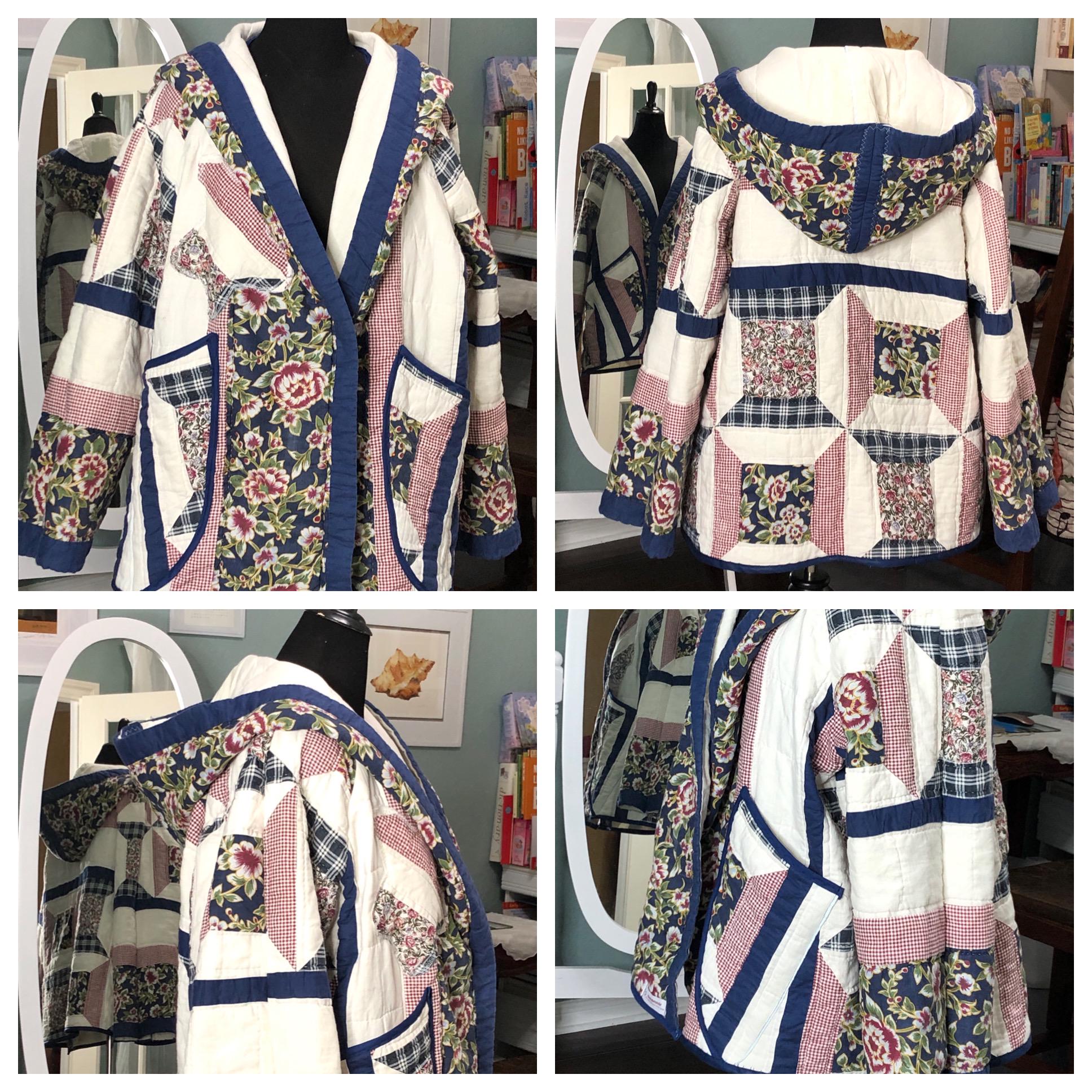 This one of a kind quilted hooded coat is perfect for any occasion. Pretty in white, blue, and a small burgundy flower print with large pockets this jacket was created using a pre loved quilted bedspread.