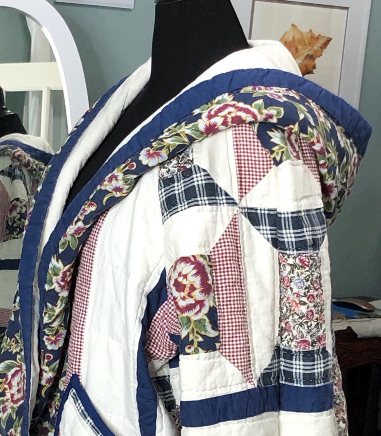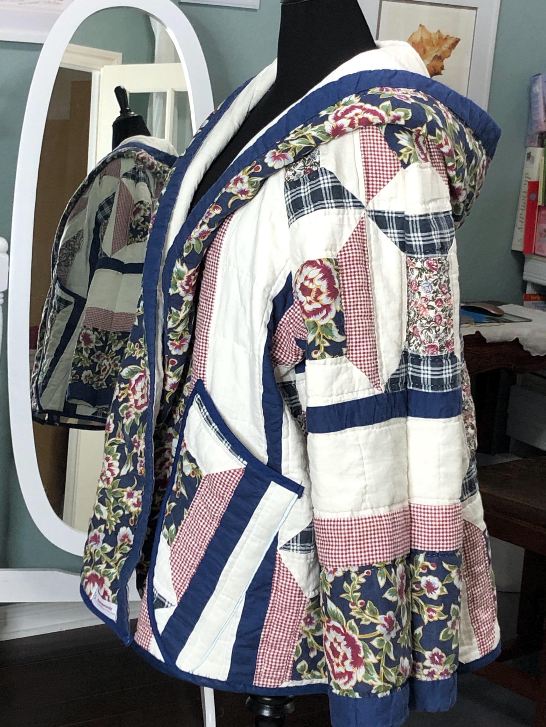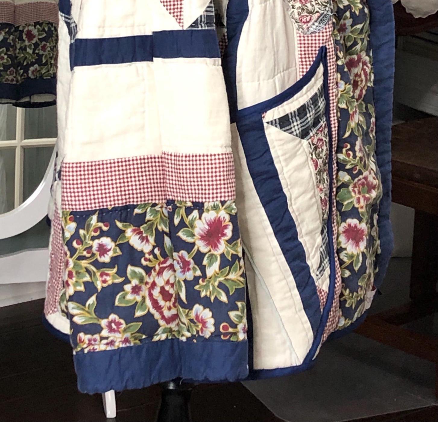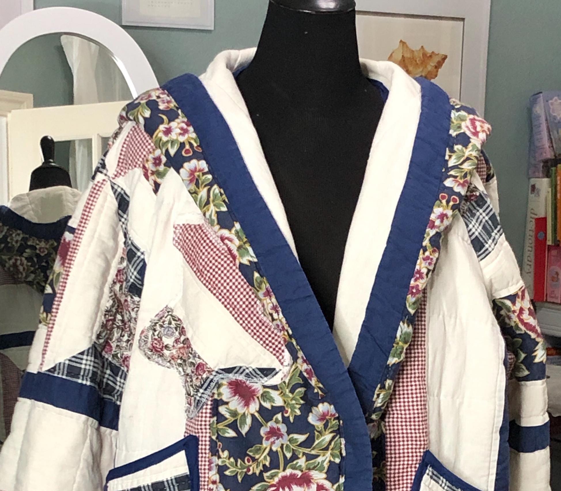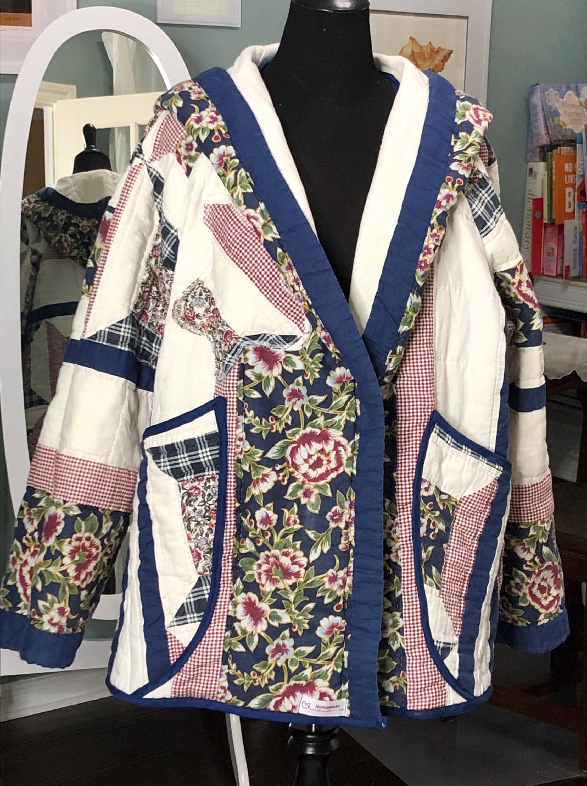 This one of a kind quilted hooded coat is perfect for any occasion. Pretty in white, blue, and a small burgundy flower print with large pockets this jacket was created using a pre loved quilted bedspread.