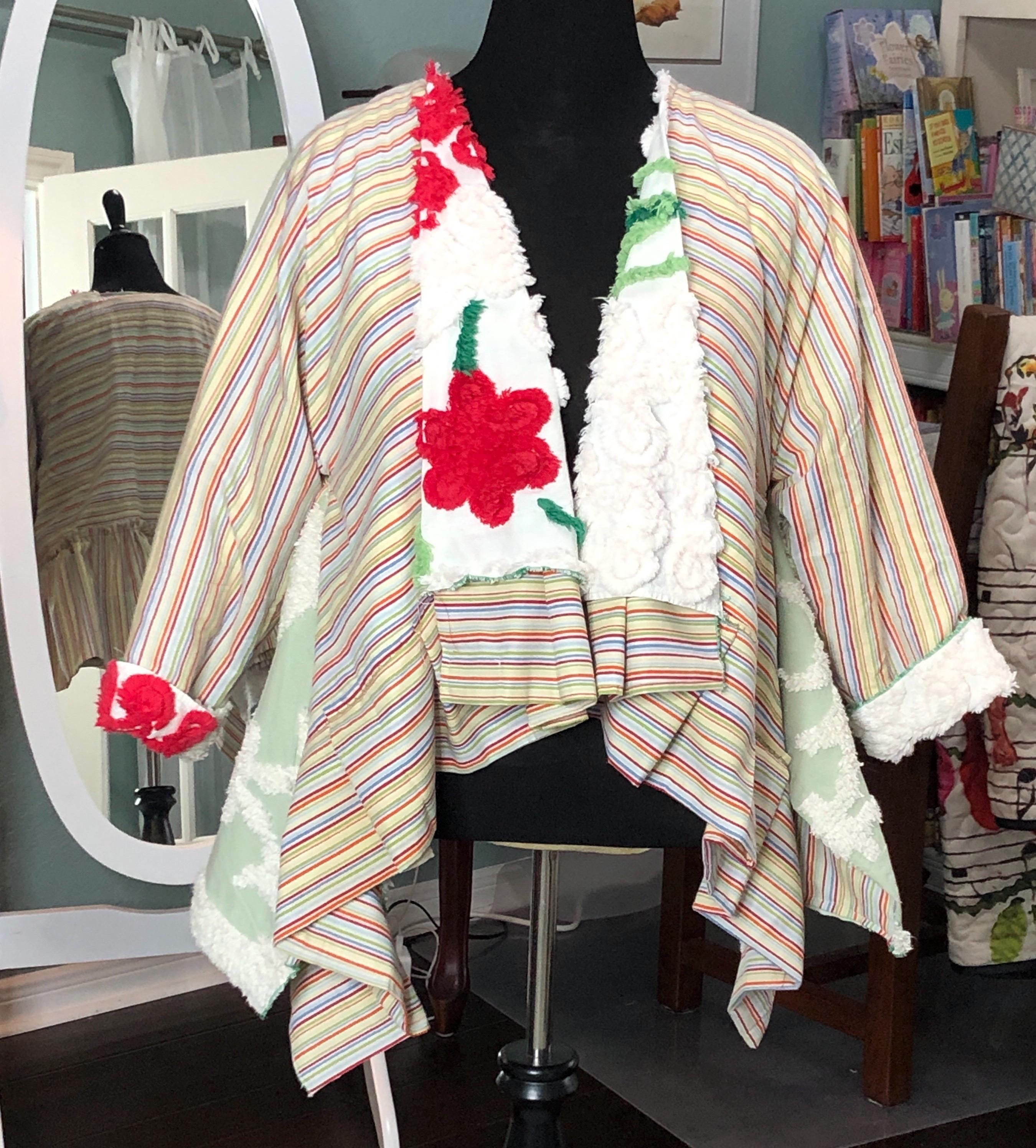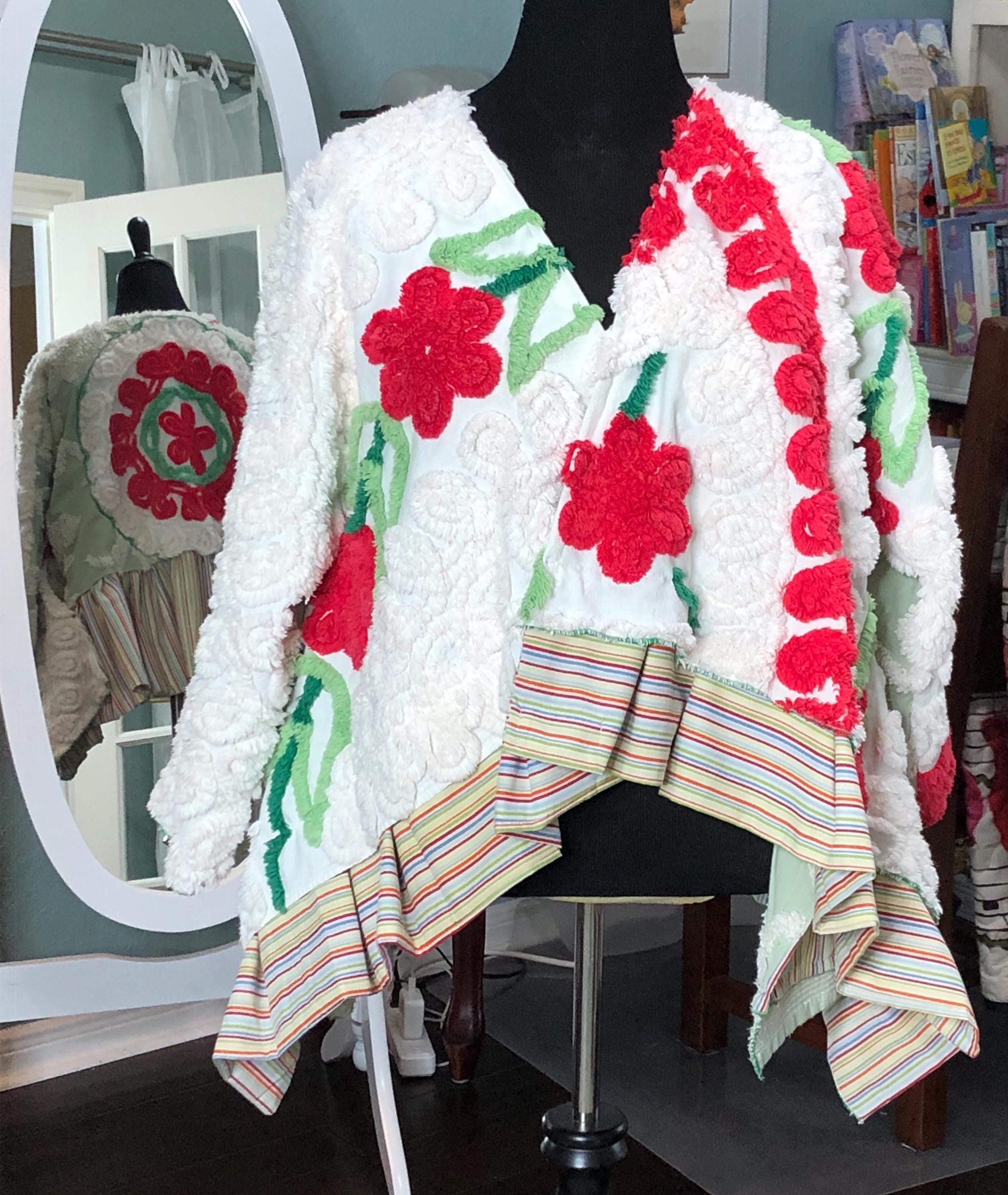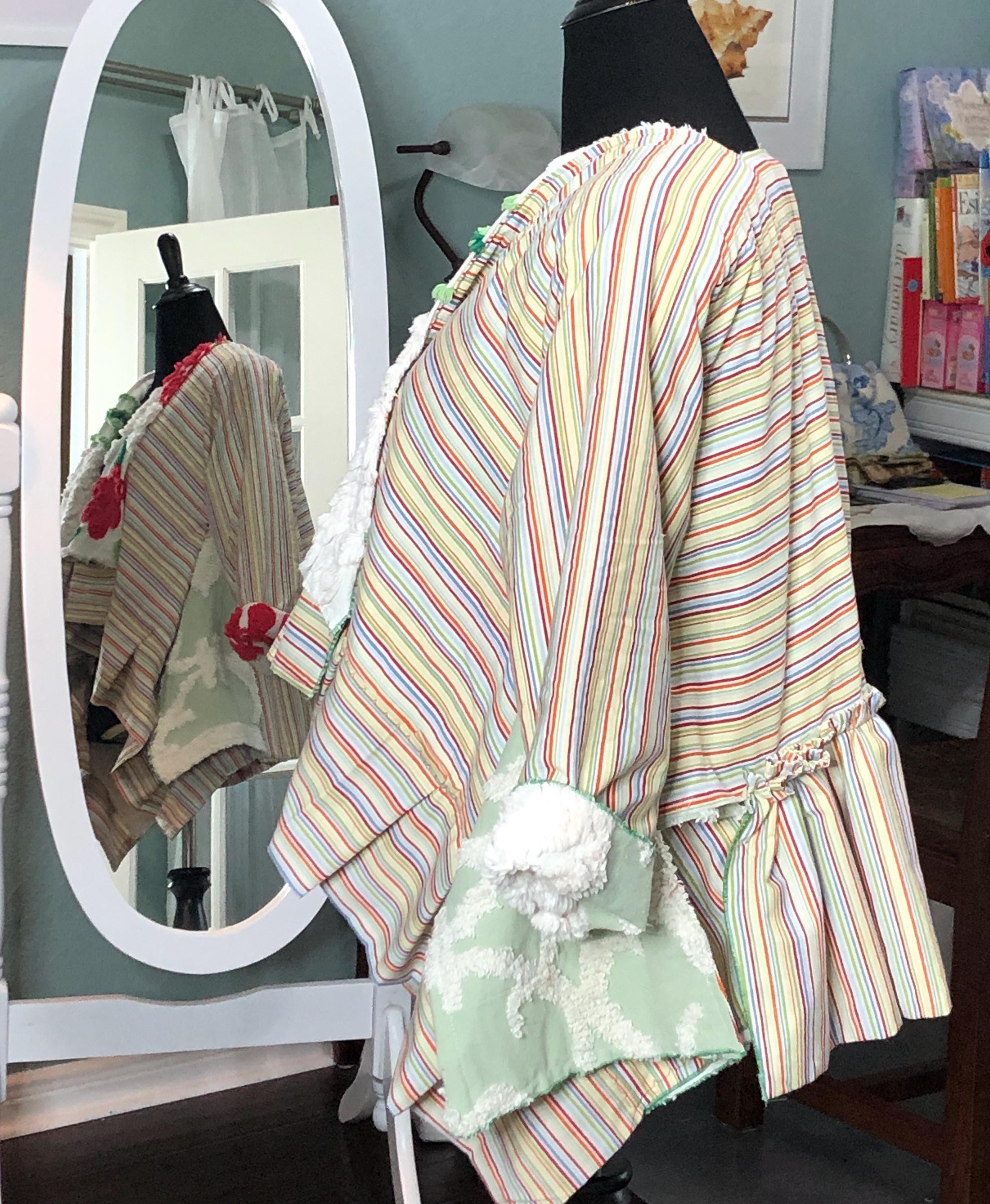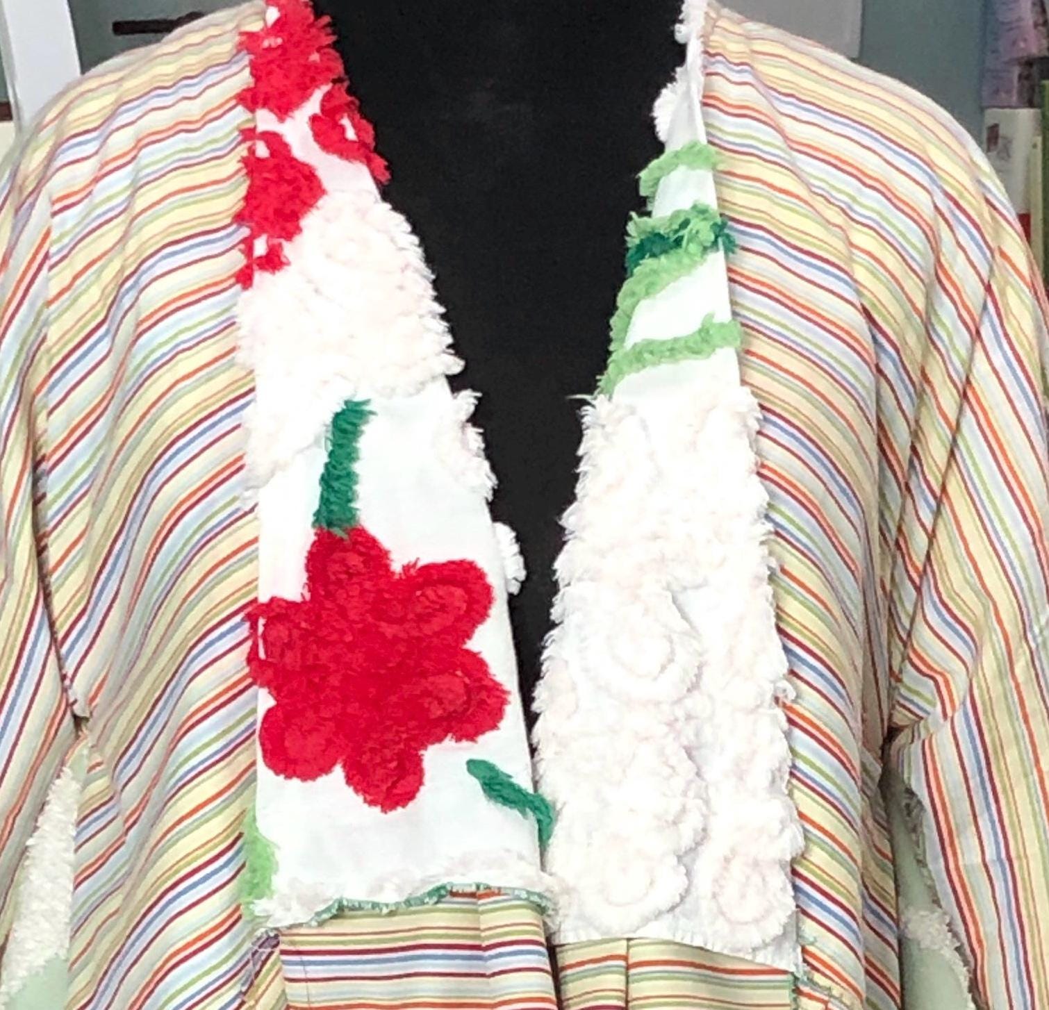 This easy fitting short kimono sleeve shrug jacket is a must have for your wardrobe. It was made using a beautiful piece of vintage chenille and striped cotton. The chenille had served its useful life a bed spread and was fussy cut to make this one of a kind jacket. The jacket is soft and warm and is easy fitting. This jacket is fully lined and is reversible. It’s the perfect weight for those chilly evenings.