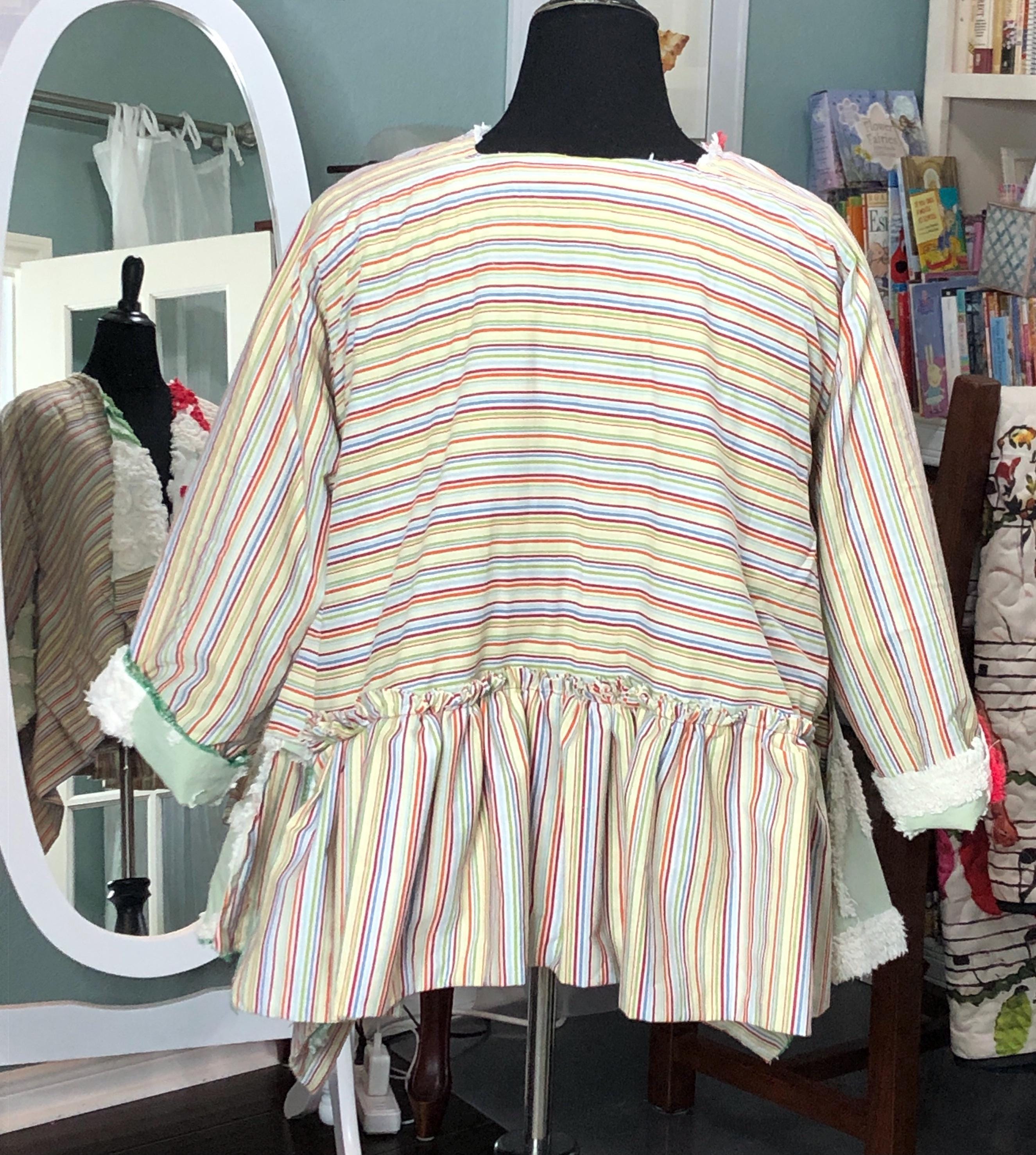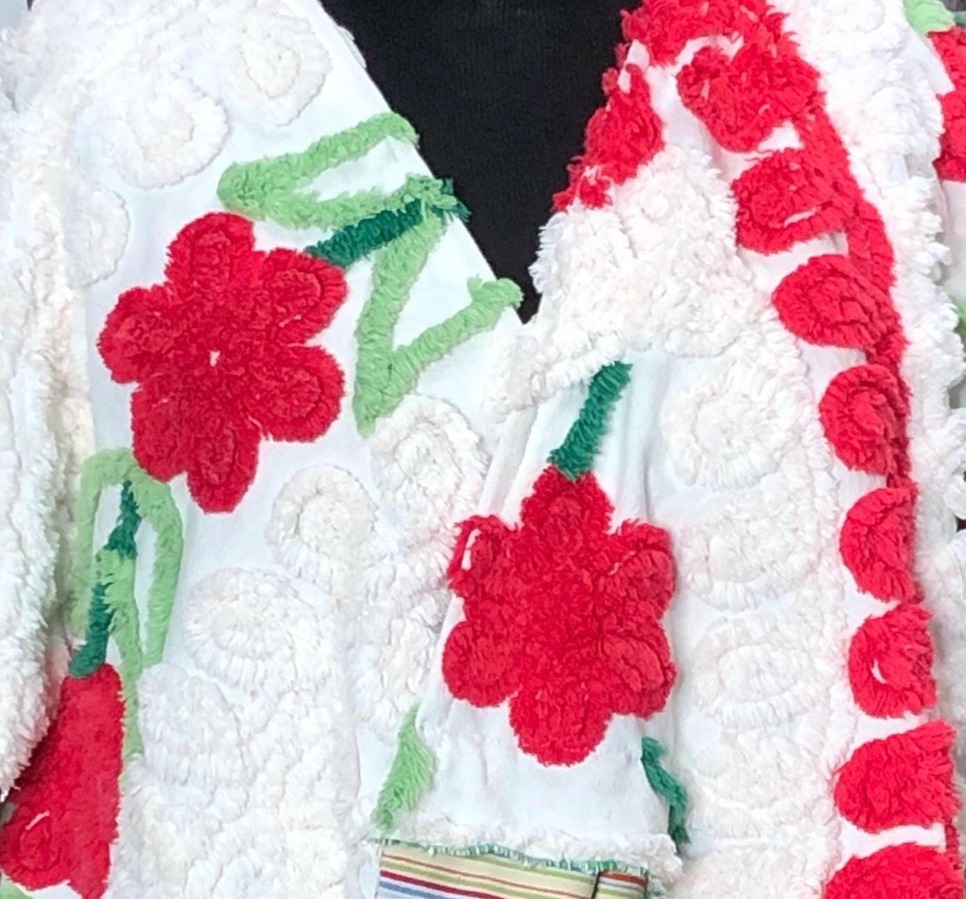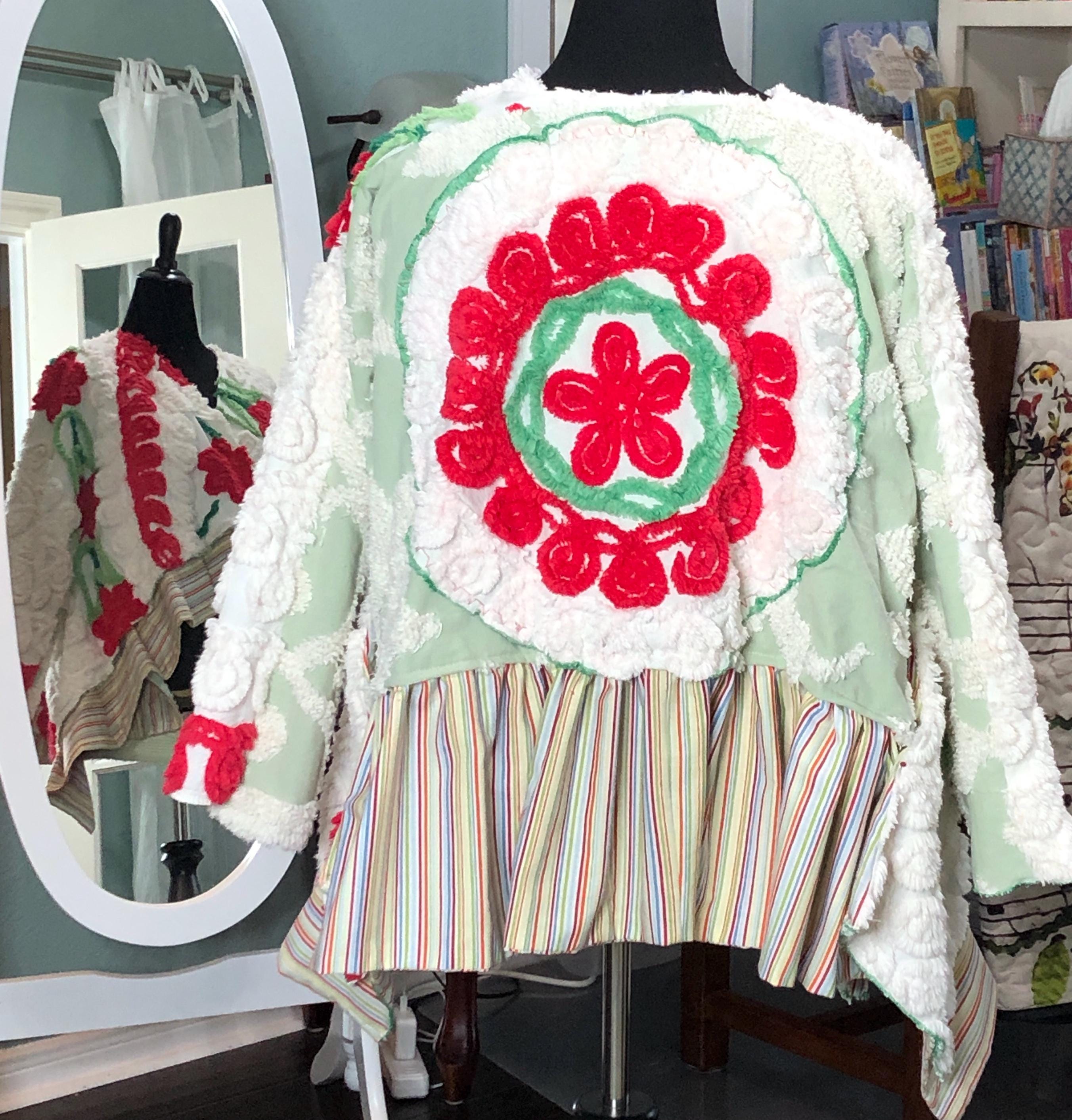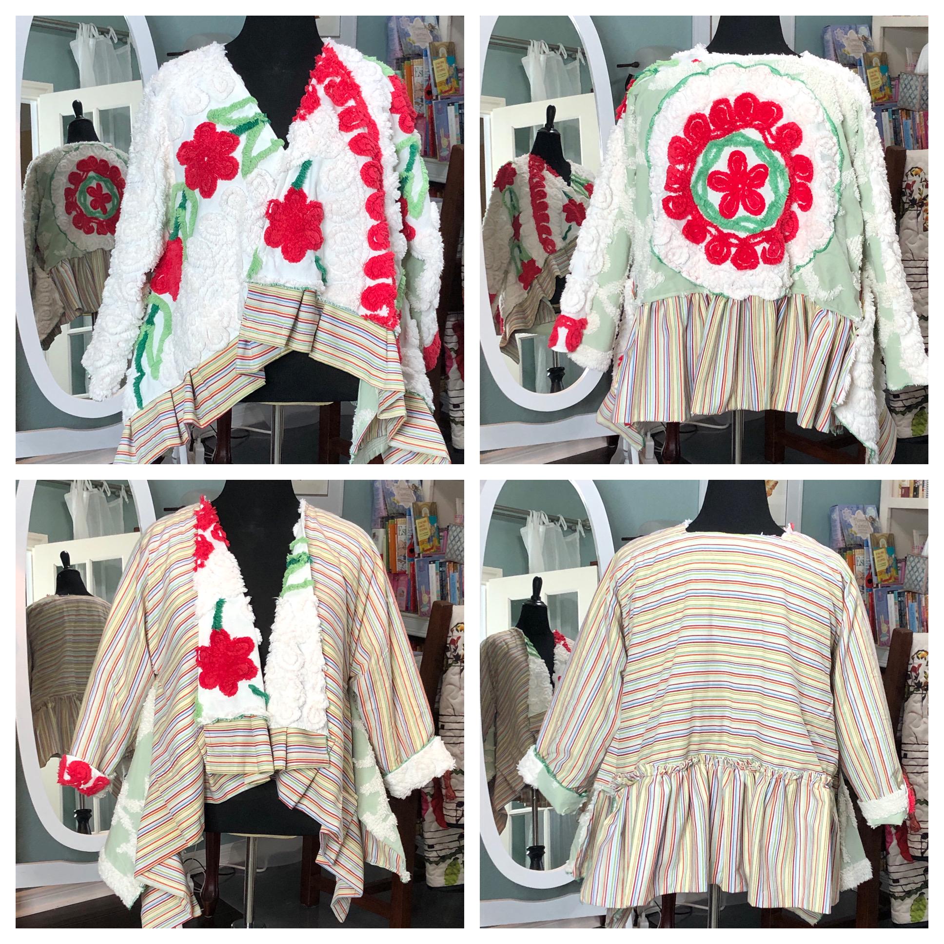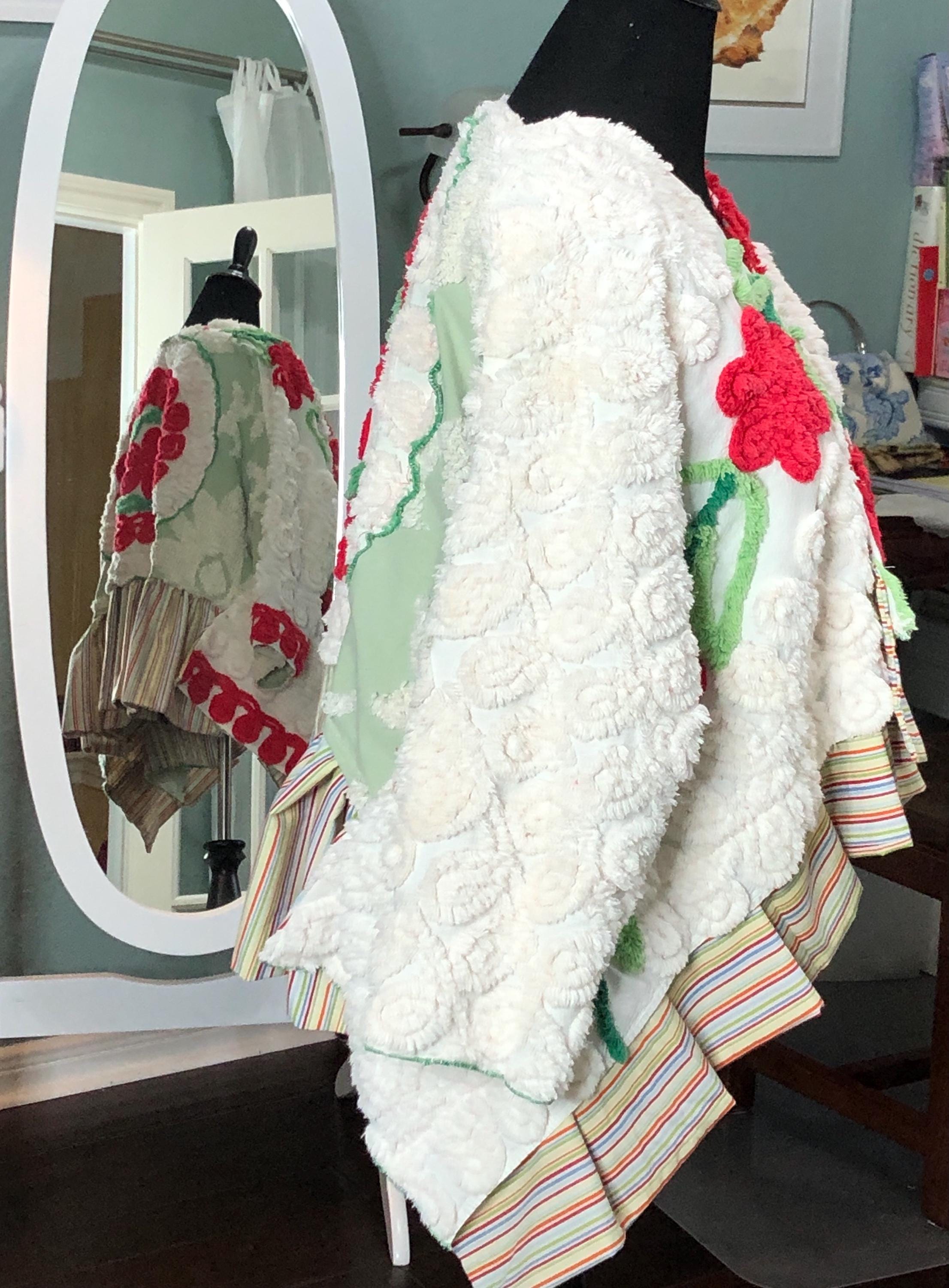 This easy fitting short kimono sleeve shrug jacket is a must have for your wardrobe. It was made using a beautiful piece of vintage chenille and striped cotton. The chenille had served its useful life a bed spread and was fussy cut to make this one of a kind jacket. The jacket is soft and warm and is easy fitting. This jacket is fully lined and is reversible. It’s the perfect weight for those chilly evenings.
