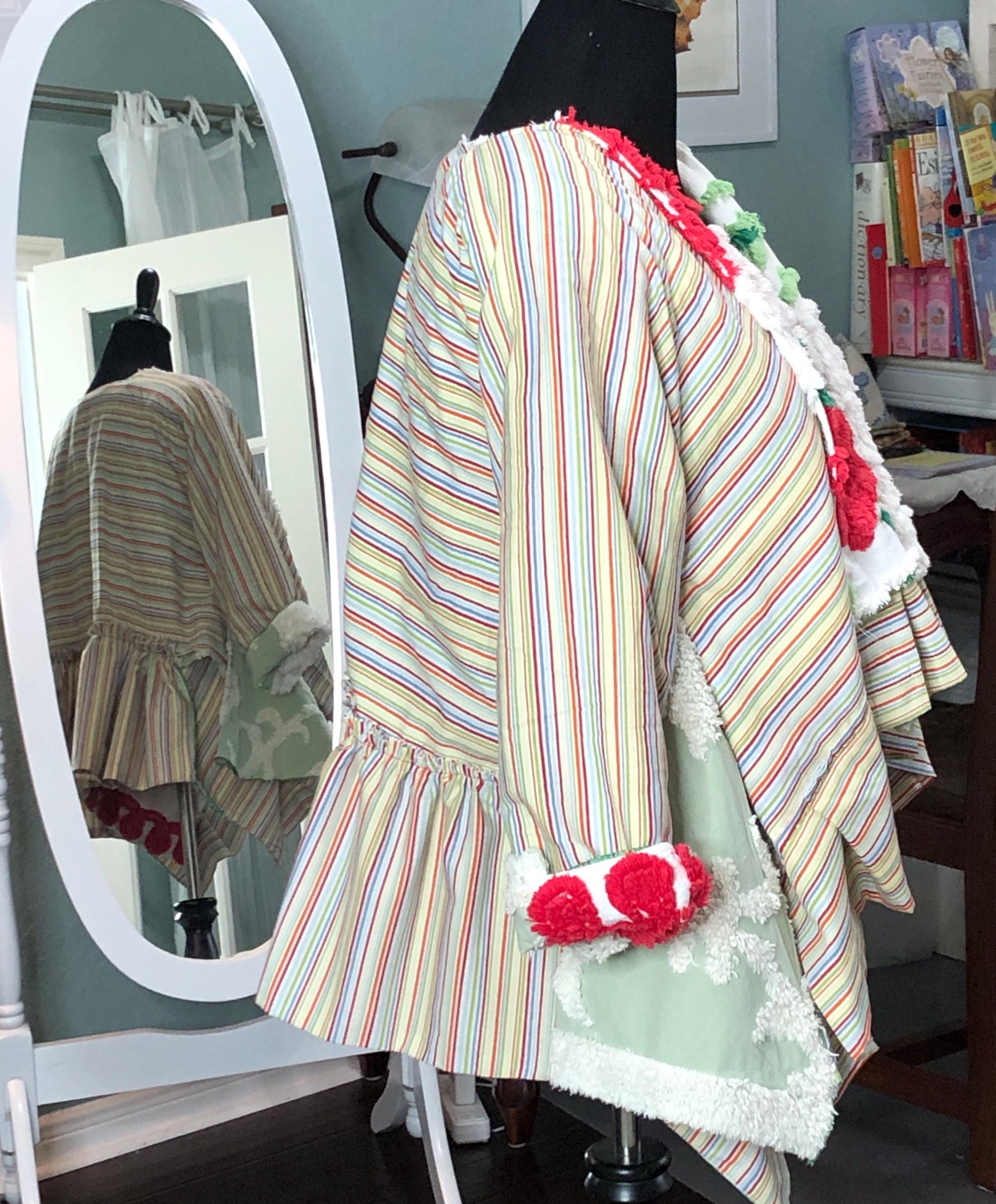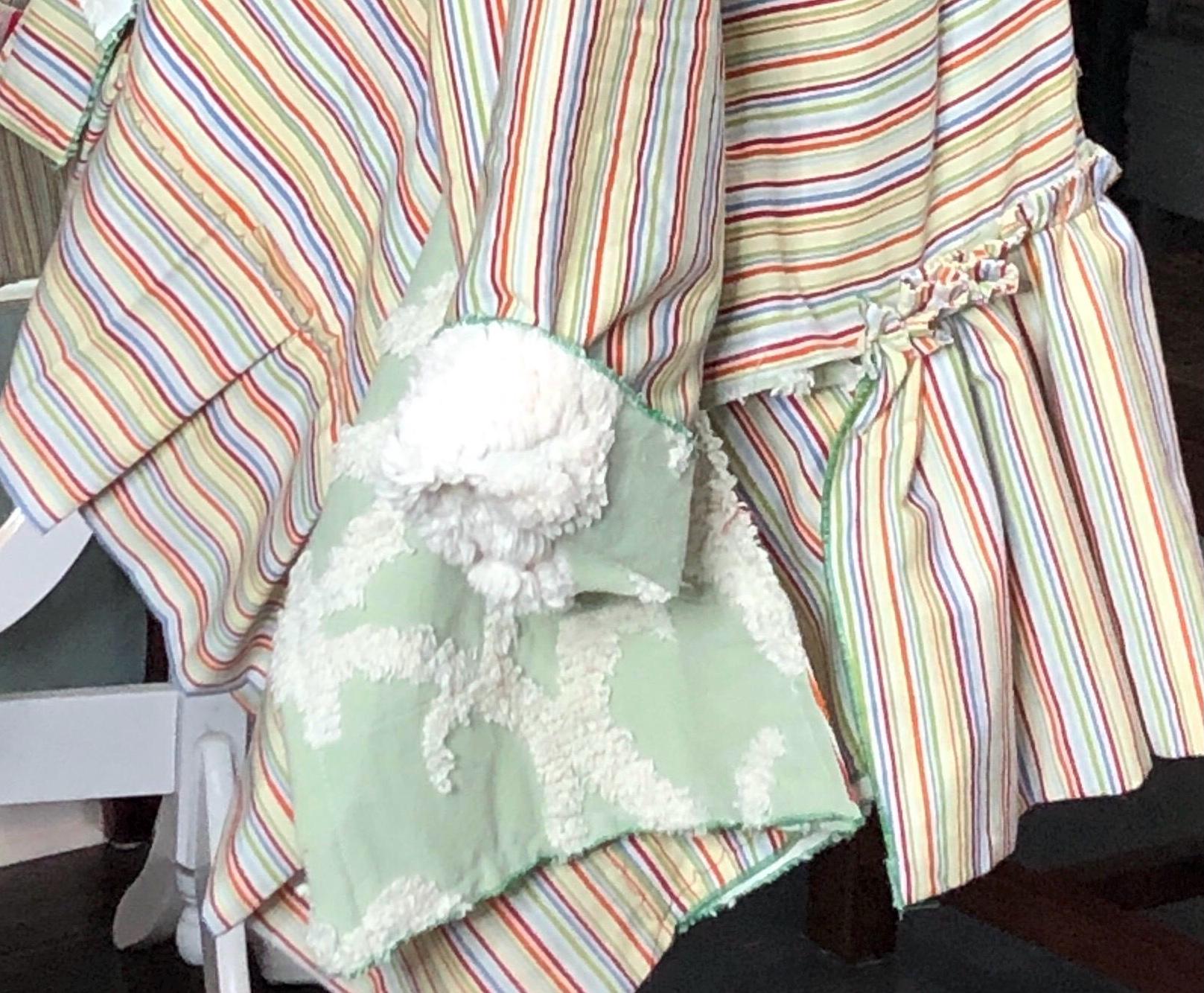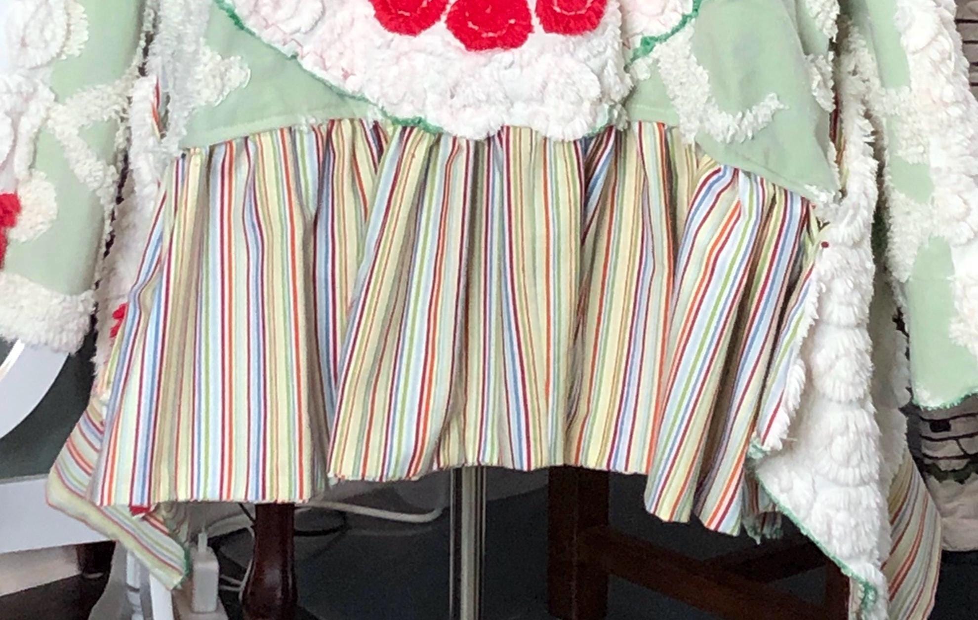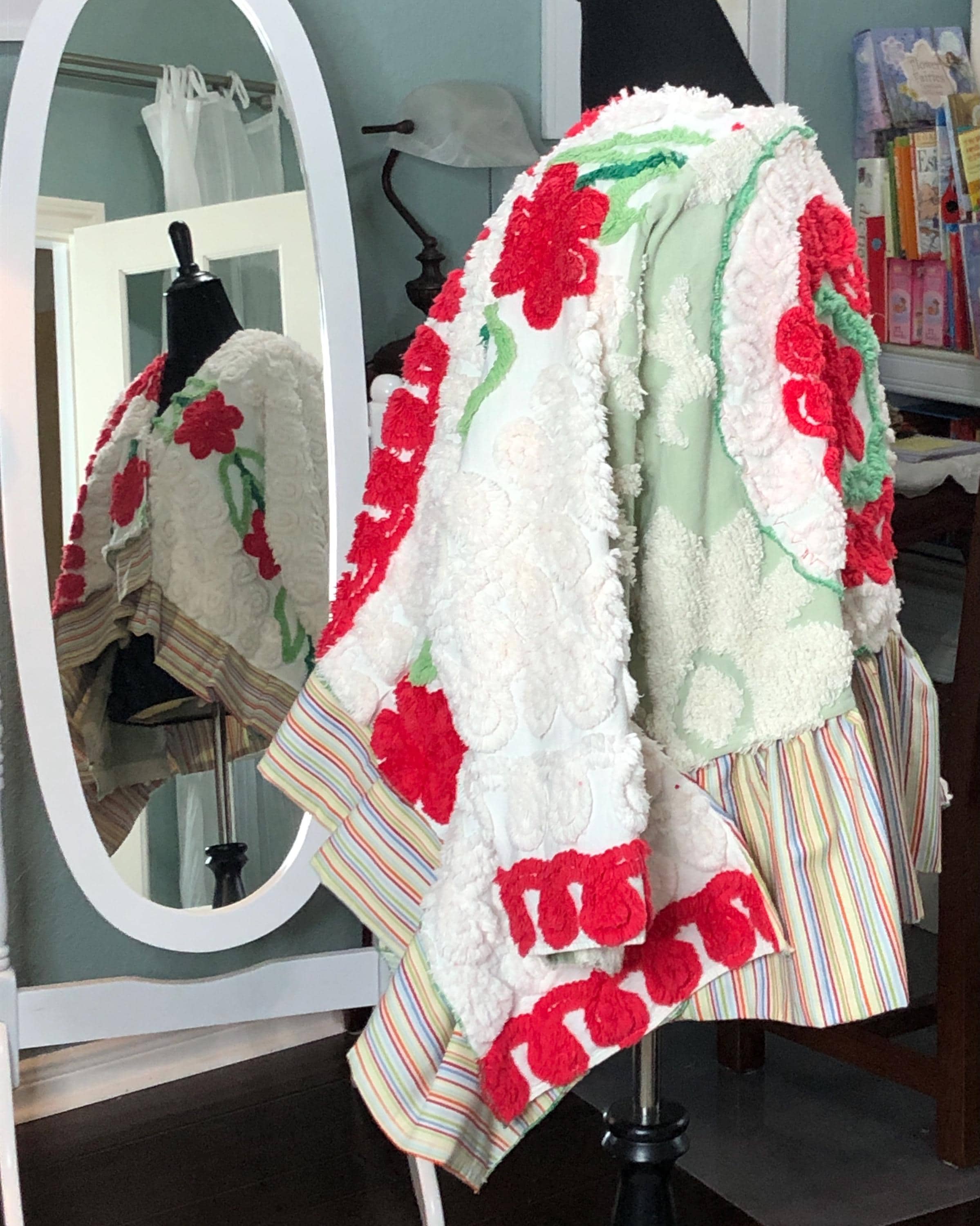 This easy fitting short kimono sleeve shrug jacket is a must have for your wardrobe. It was made using a beautiful piece of vintage chenille and striped cotton. The chenille had served its useful life a bed spread and was fussy cut to make this one of a kind jacket. The jacket is soft and warm and is easy fitting. This jacket is fully lined and is reversible. It’s the perfect weight for those chilly evenings.