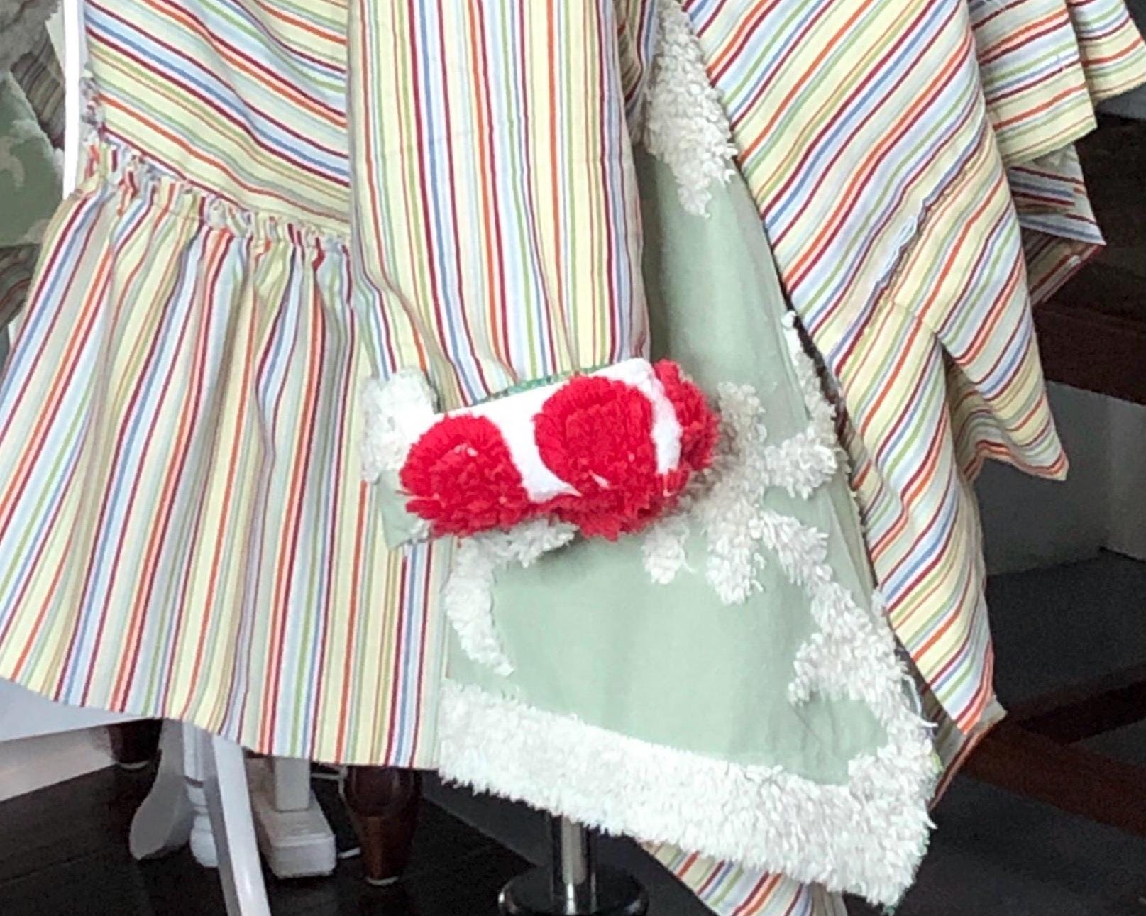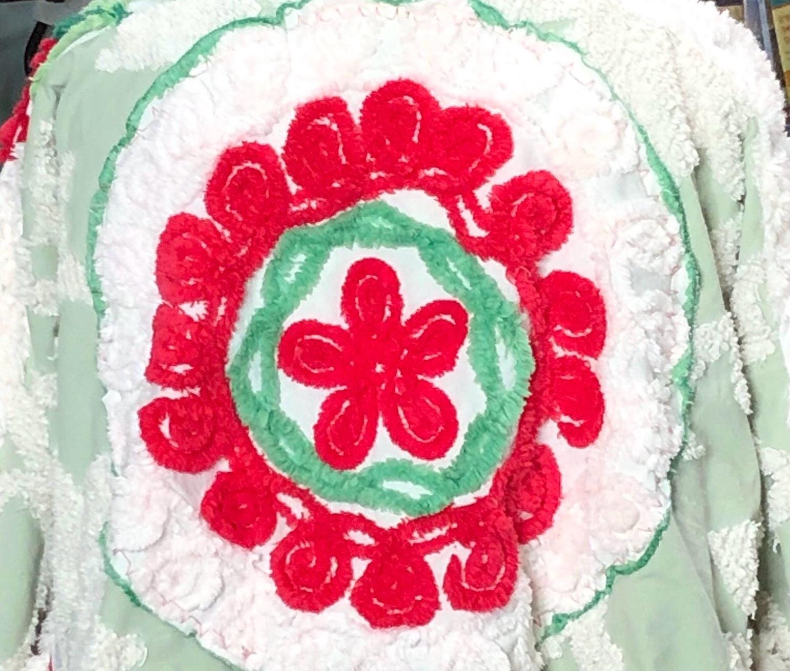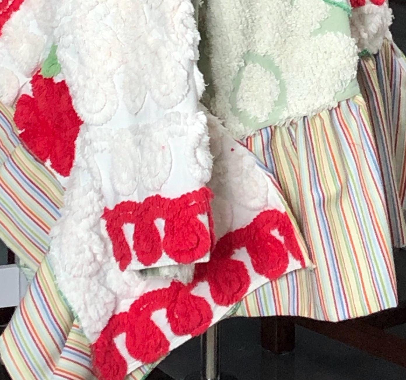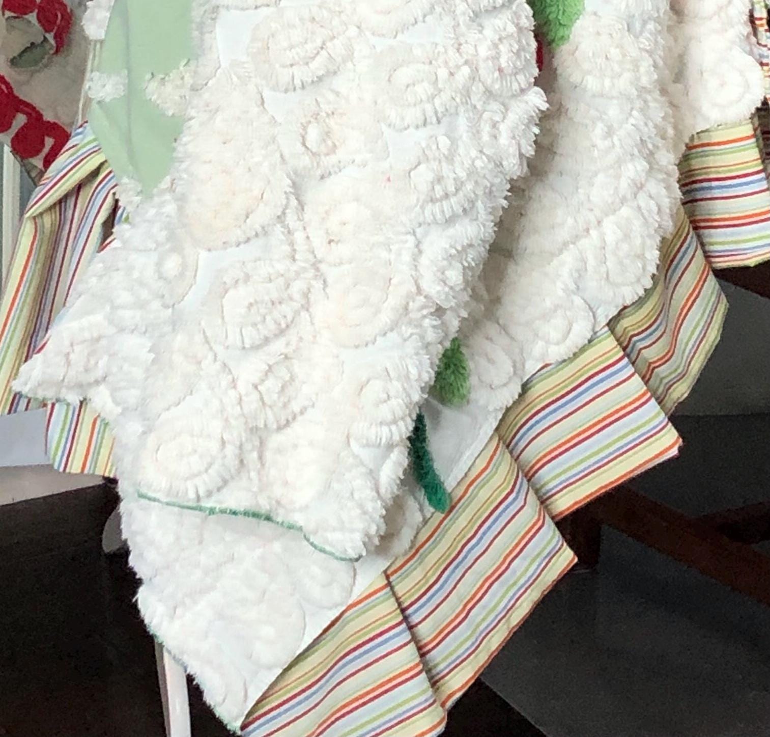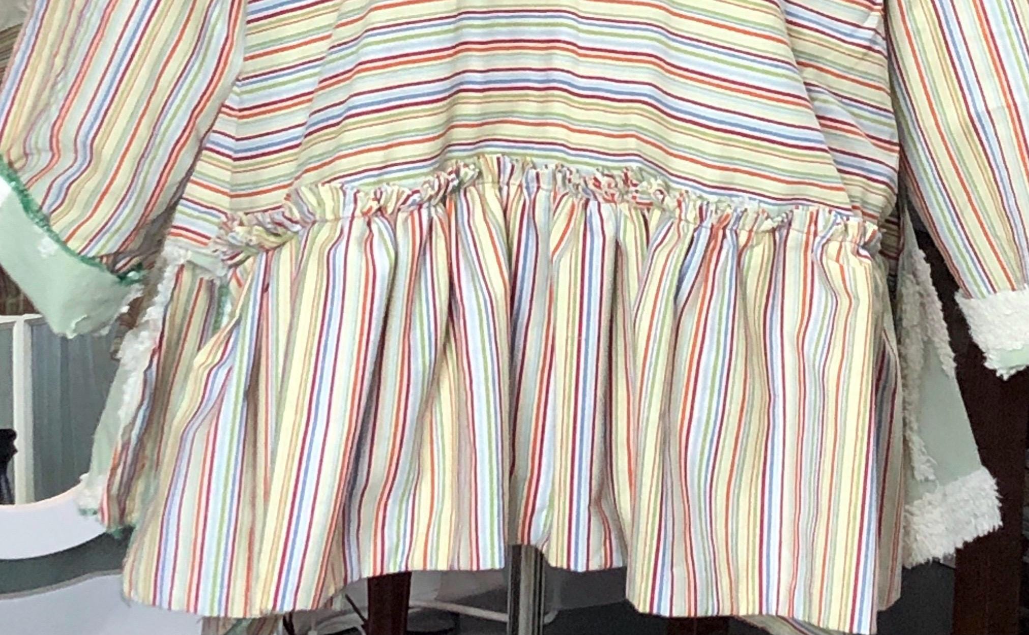 This easy fitting short kimono sleeve shrug jacket is a must have for your wardrobe. It was made using a beautiful piece of vintage chenille and striped cotton. The chenille had served its useful life a bed spread and was fussy cut to make this one of a kind jacket. The jacket is soft and warm and is easy fitting. This jacket is fully lined and is reversible. It’s the perfect weight for those chilly evenings.