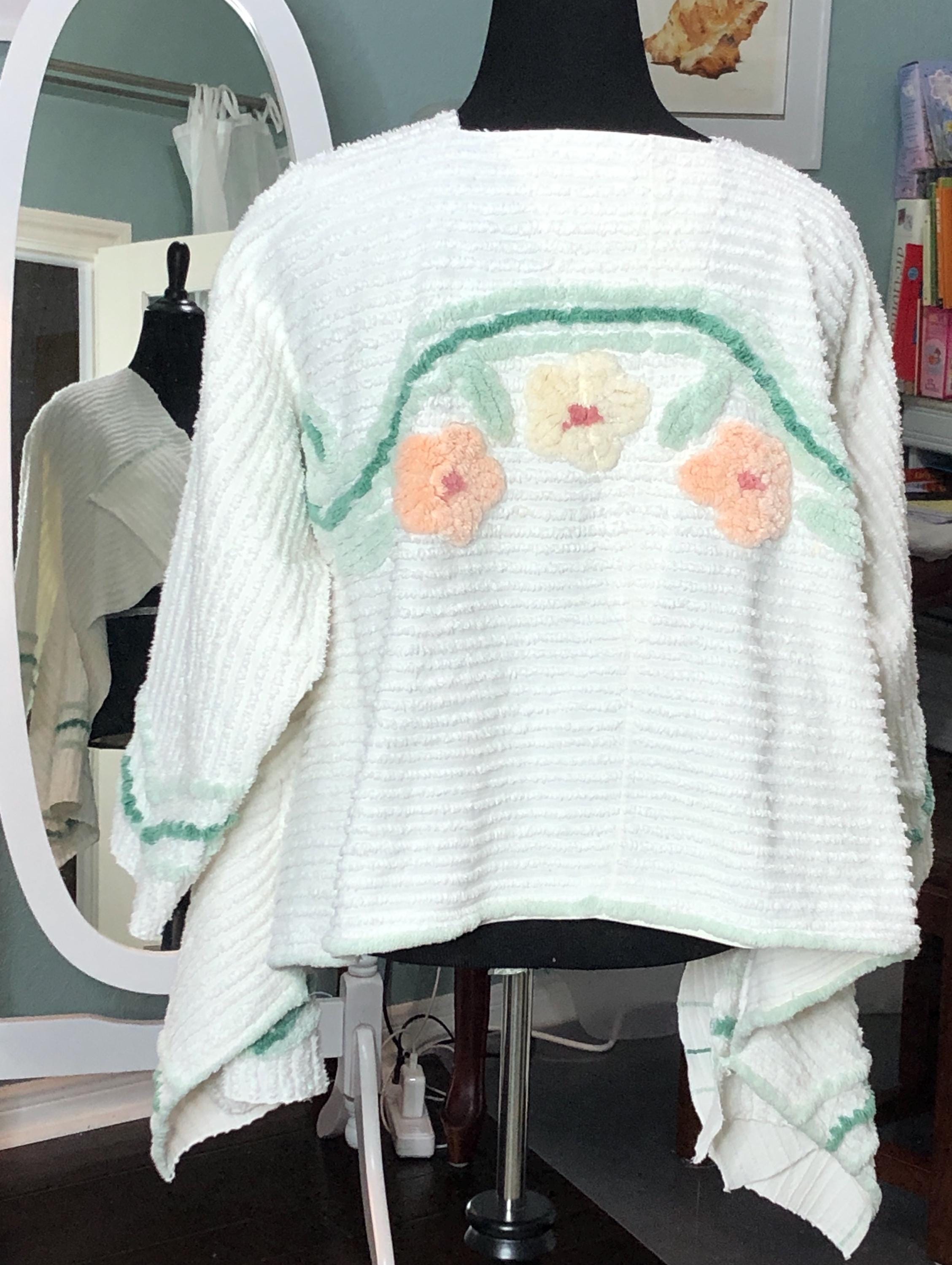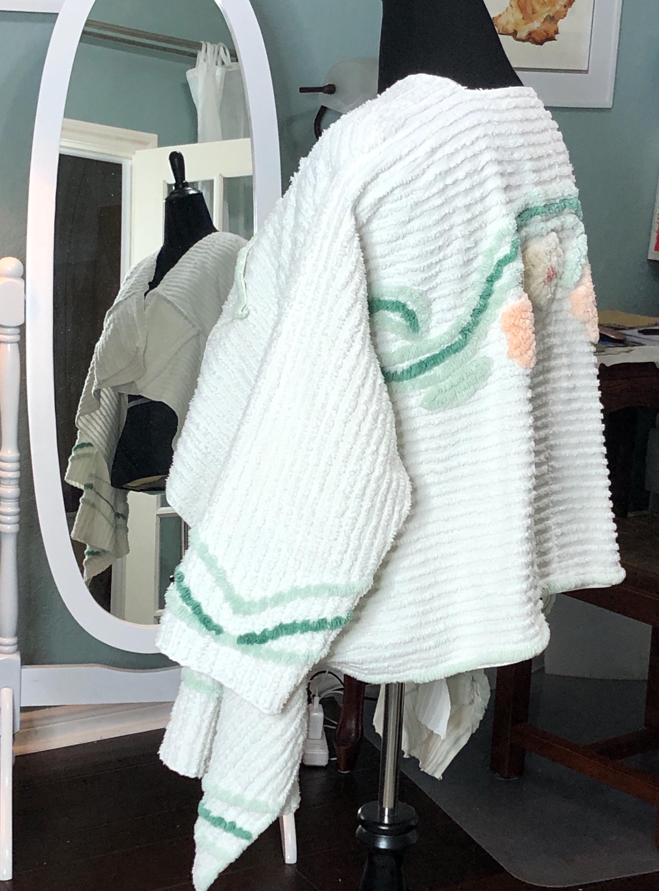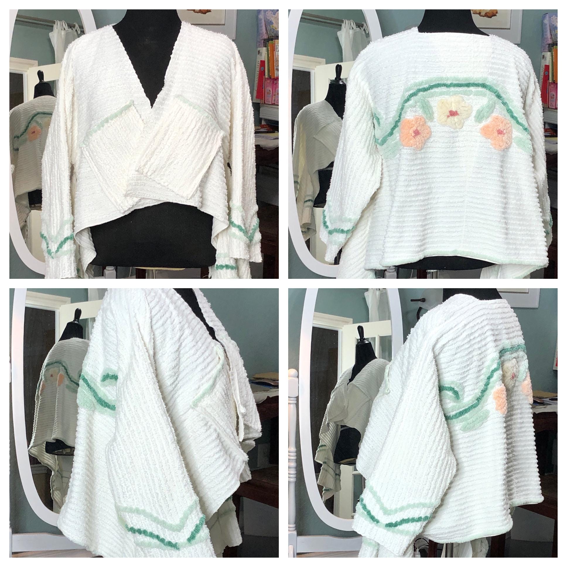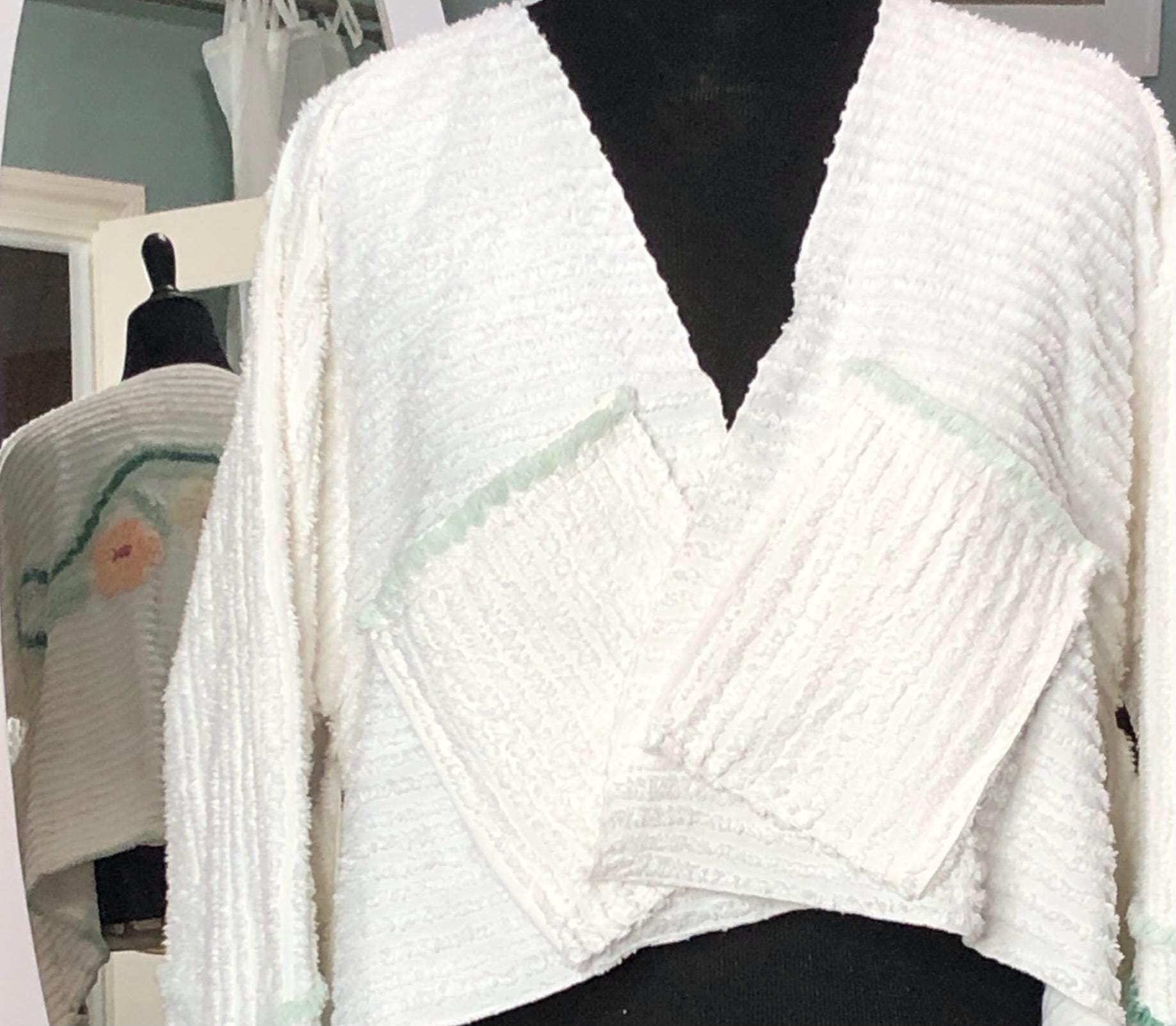 This easy fitting short kimono jacket is a must have for your wardrobe. It was made using a beautiful piece of vintage chenille. The white vintage chenille has a flower motif in peach and yellow on the center back. This chenille had served its useful life as a bed spread and was fussy cut to make this one of a kind jacket. The jacket is soft and light and a has an easy fitting style. It even has two front breast pockets.