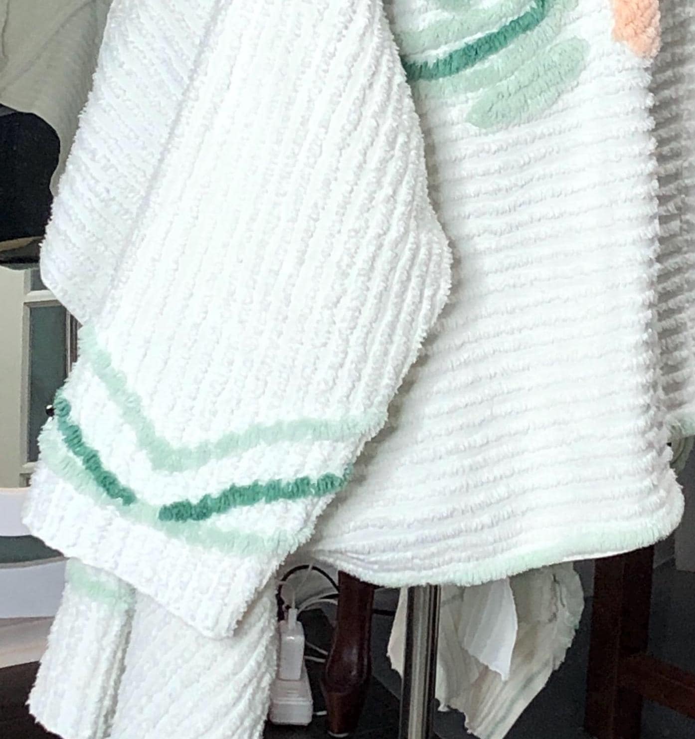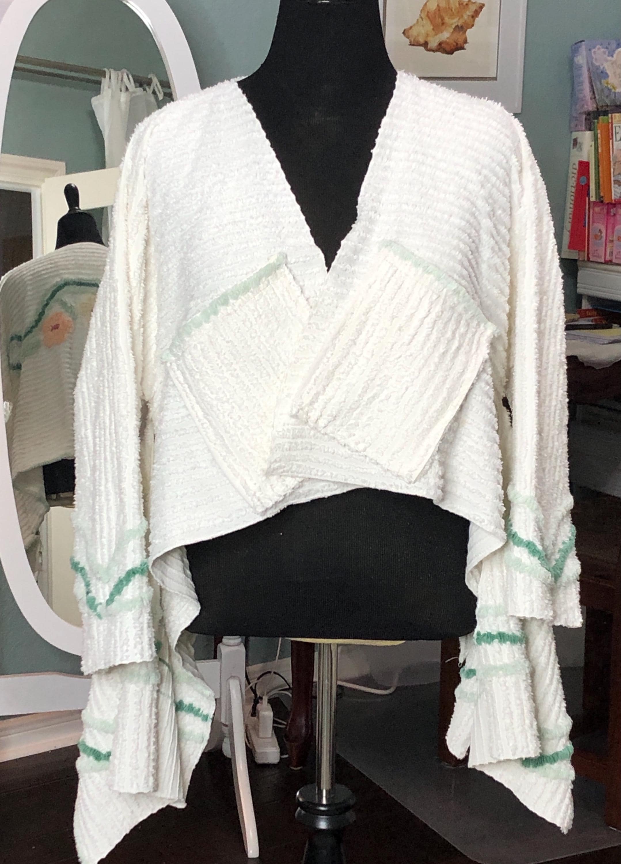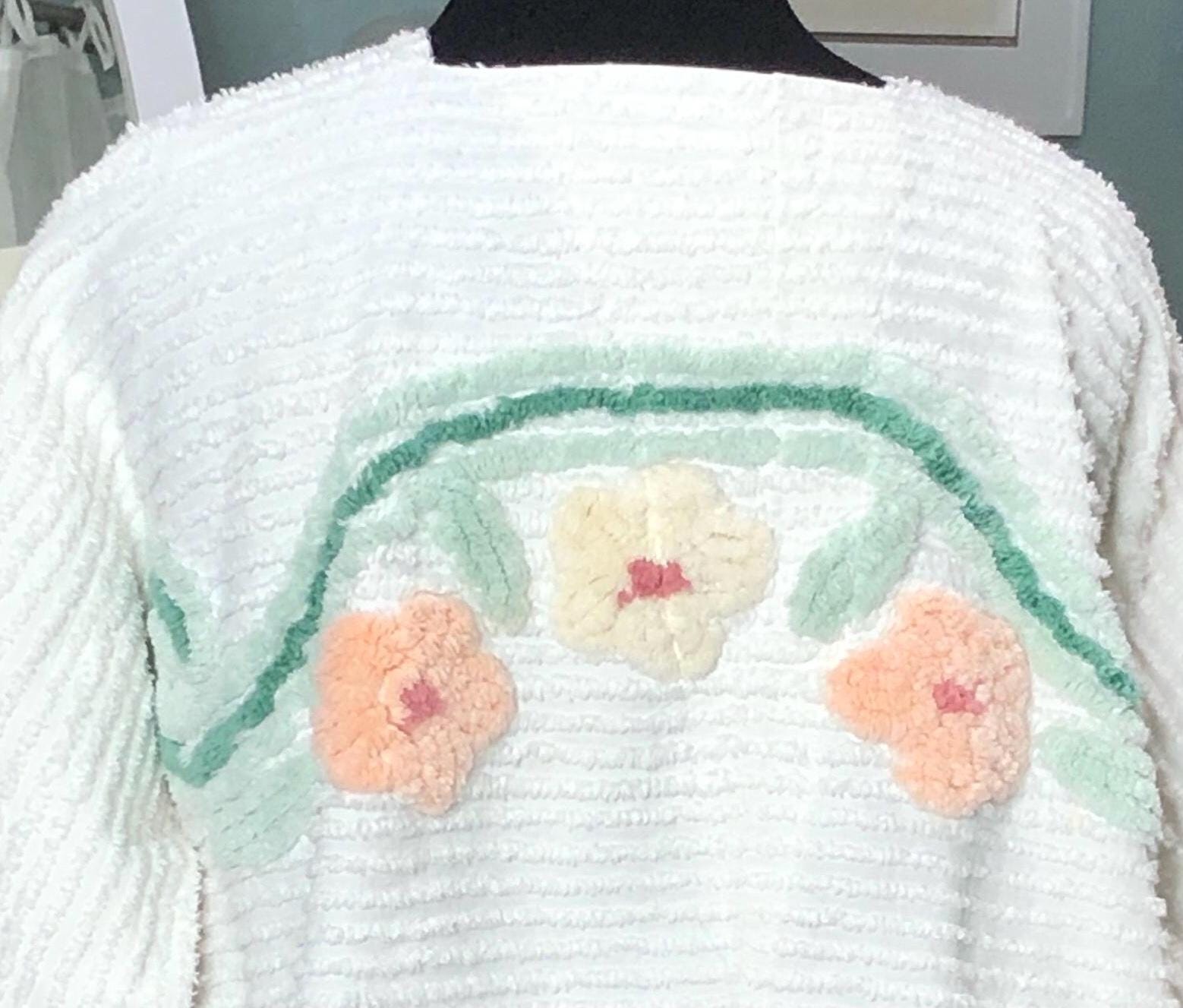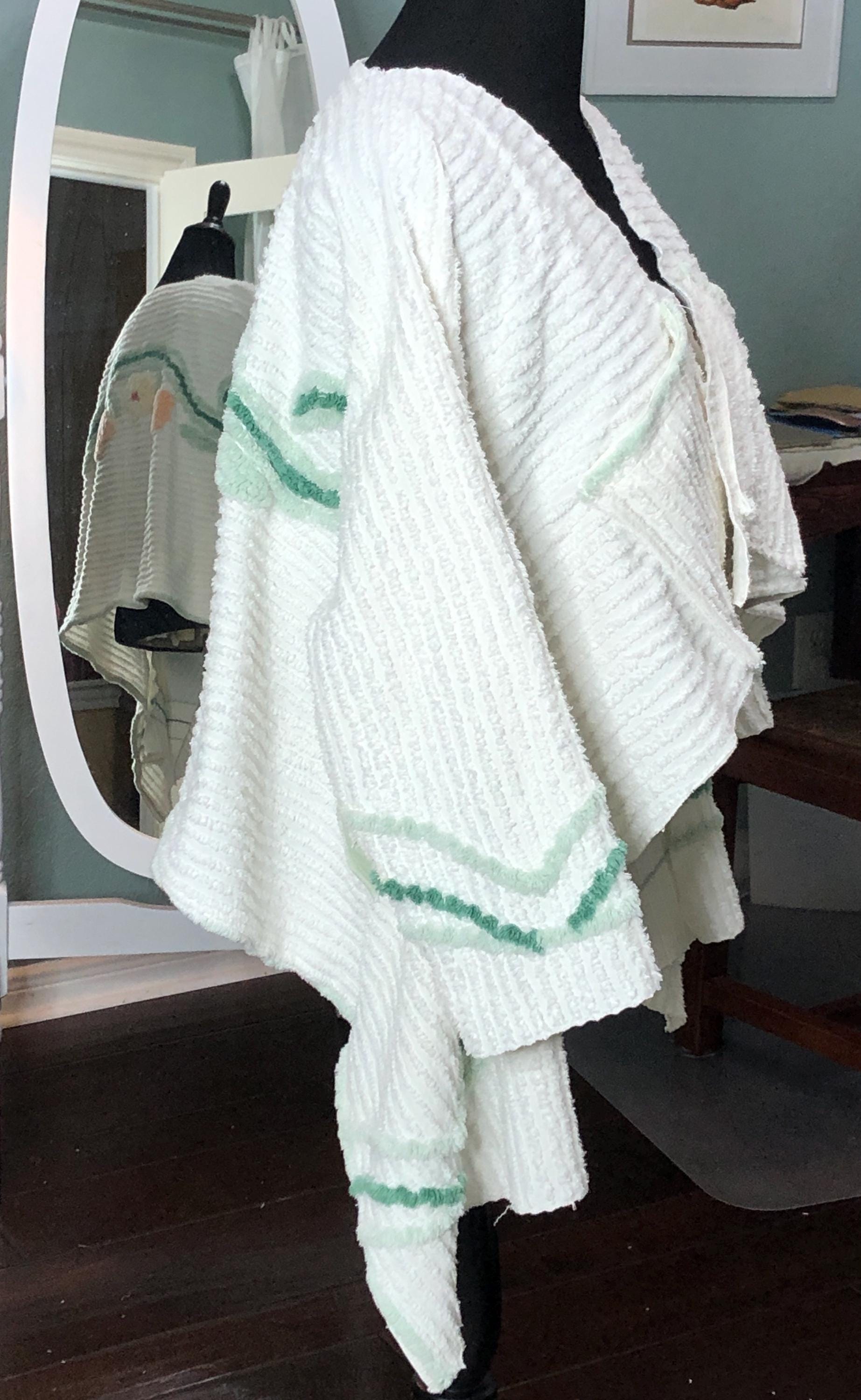 This easy fitting short kimono jacket is a must have for your wardrobe. It was made using a beautiful piece of vintage chenille. The white vintage chenille has a flower motif in peach and yellow on the center back. This chenille had served its useful life as a bed spread and was fussy cut to make this one of a kind jacket. The jacket is soft and light and a has an easy fitting style. It even has two front breast pockets.