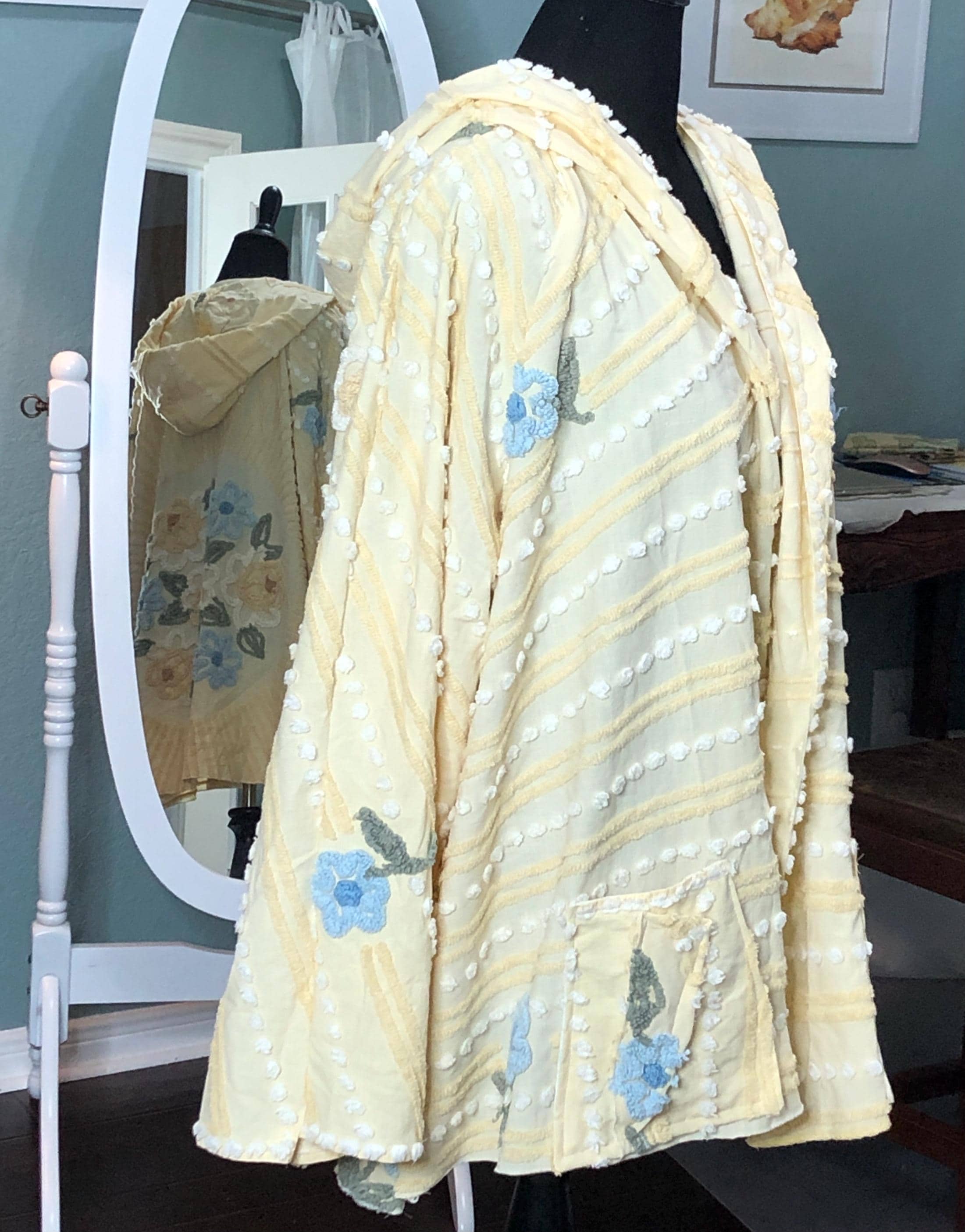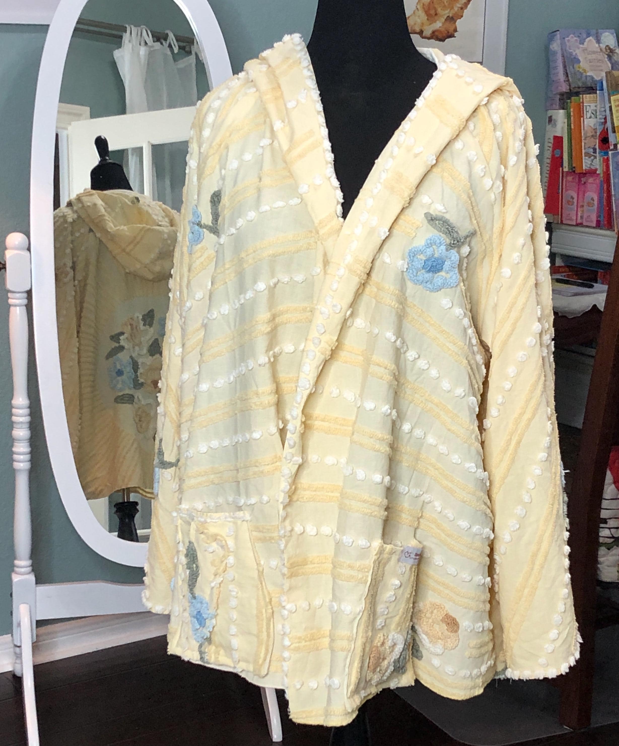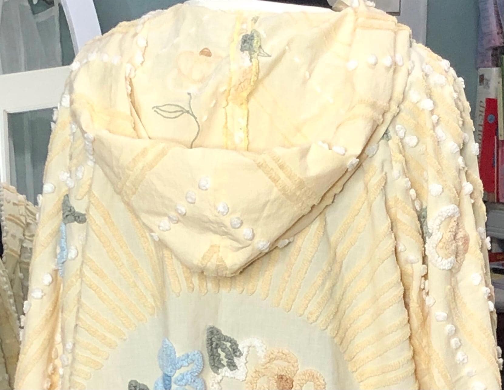 This easy fitting hooded kimono jacket is a must have for your wardrobe. It was made using a beautiful piece of vintage light yellow with white pops and flowered chenille. The vintage chenille has a flower motif in the center back in aqua blue. This chenille had served its useful life as a bed spread and was fussy cut to make this one of a kind jacket. The jacket is soft and light and a has an easy fitting style. It even has two extra special pockets.