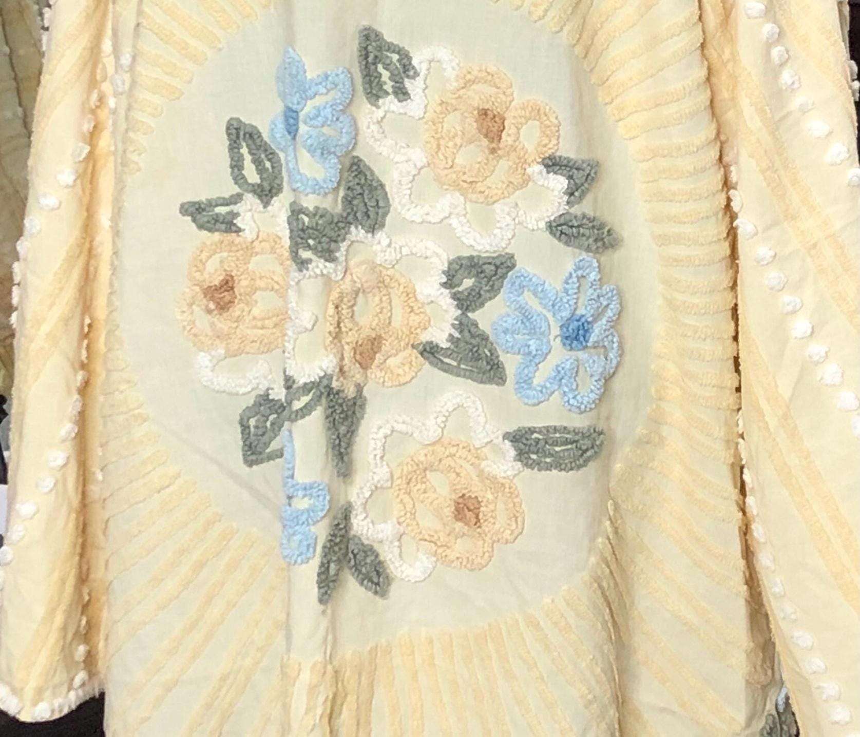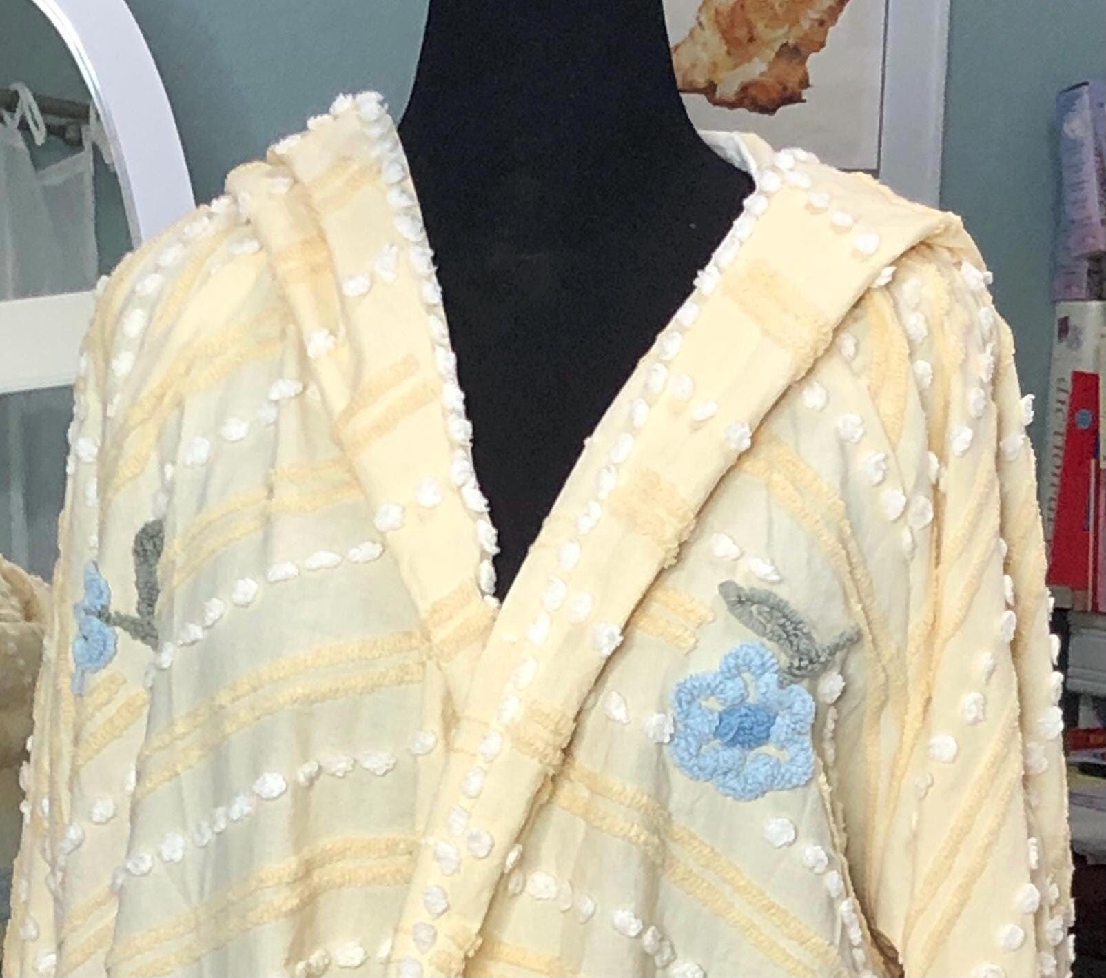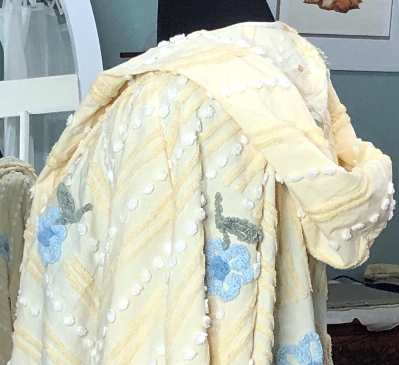 This easy fitting hooded kimono jacket is a must have for your wardrobe. It was made using a beautiful piece of vintage light yellow with white pops and flowered chenille. The vintage chenille has a flower motif in the center back in aqua blue. This chenille had served its useful life as a bed spread and was fussy cut to make this one of a kind jacket. The jacket is soft and light and a has an easy fitting style. It even has two extra special pockets.