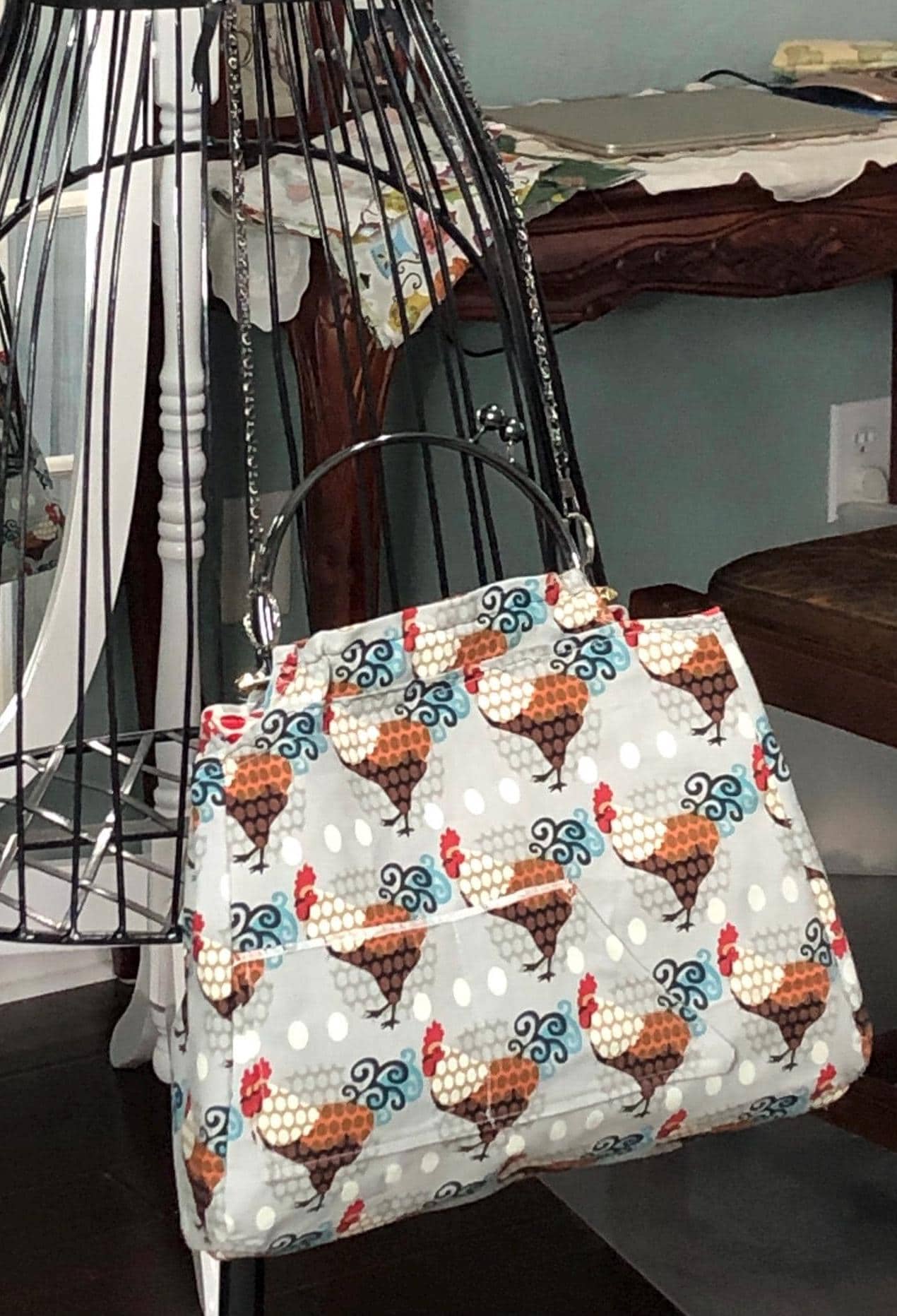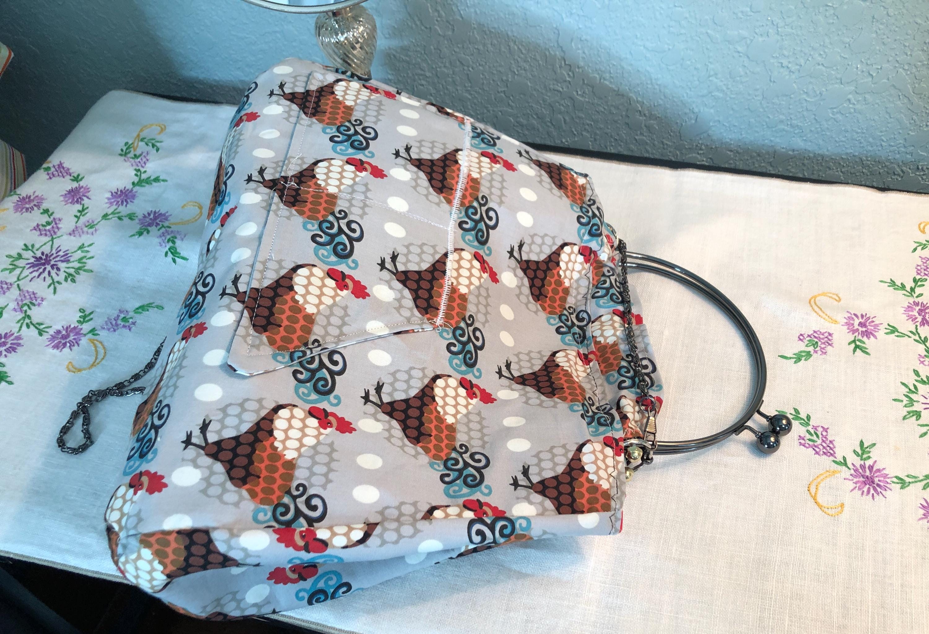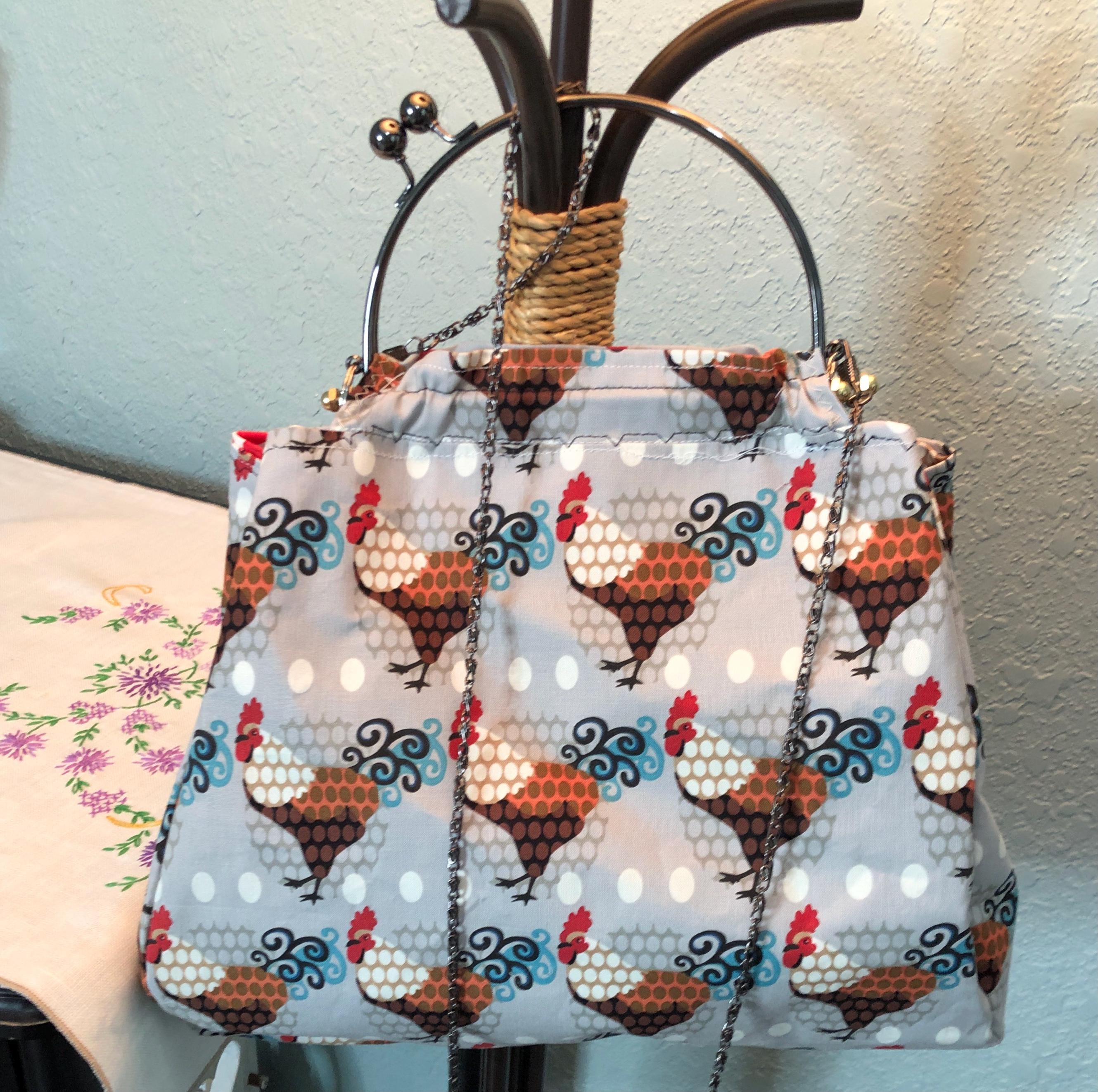 This beautiful fabric purse has a bronze colored kiss lock round metal frame. The purse was handmade by me using repurposed quilt cotton fabric. The cotton fabric has beautiful red and gray roosters printed on gray and is lined in a complimentary cotton fabric with a red egg print The metal frame has two rods with acorn nut screws on the ends so that you can use the same frame for multiple purses. If you would like to purchase another purse in a different color, to have an interchangable purse just message me and the backup purse can be custom made for you.