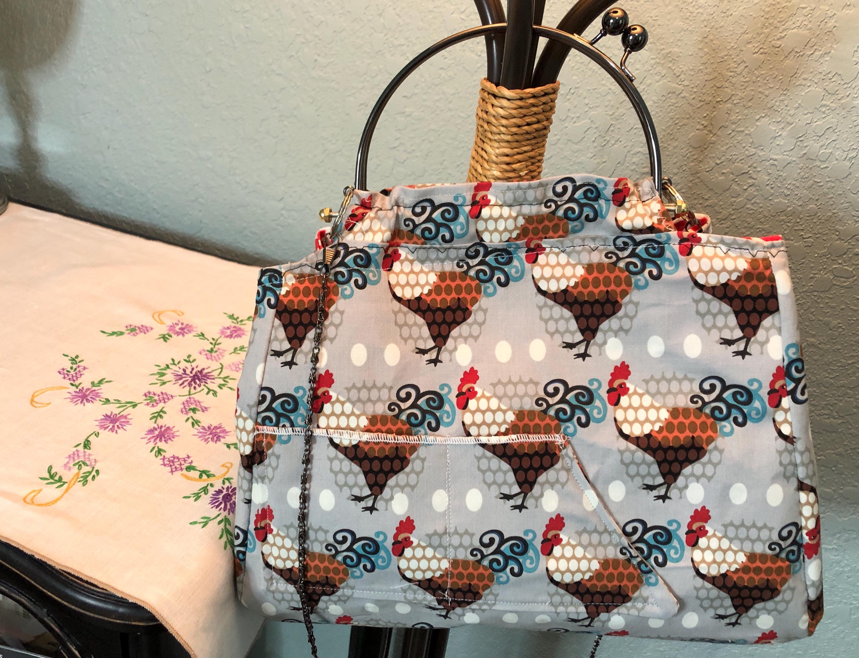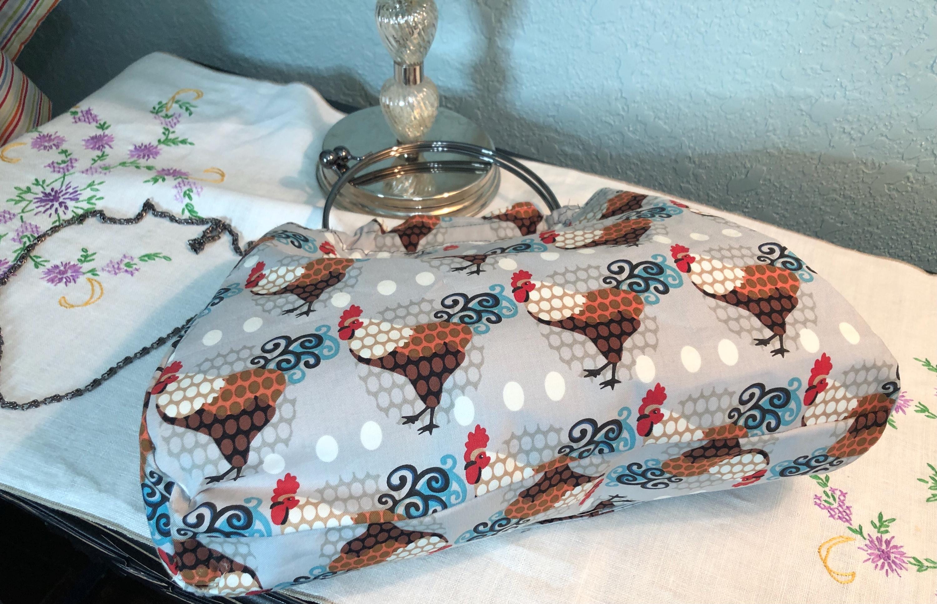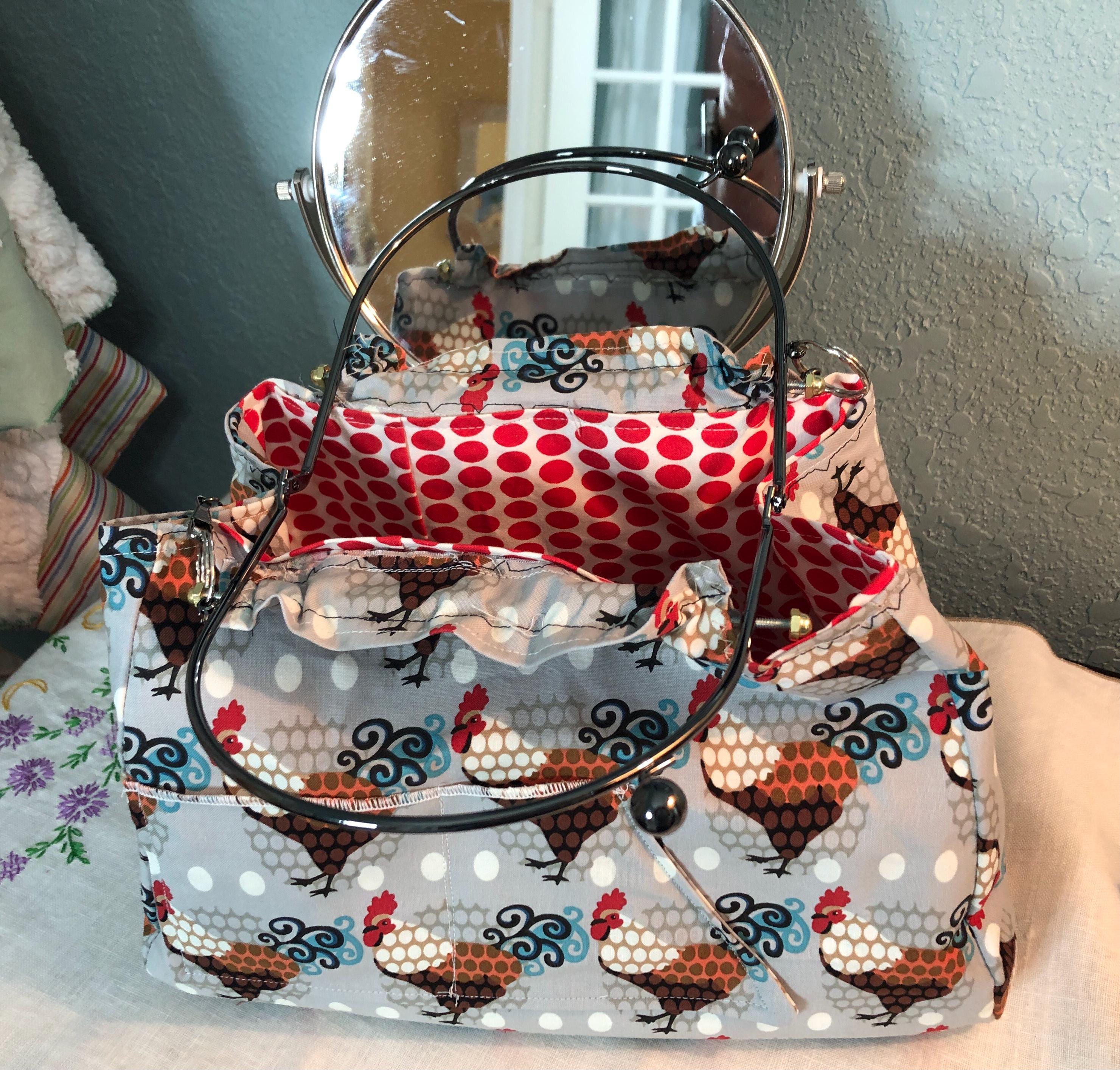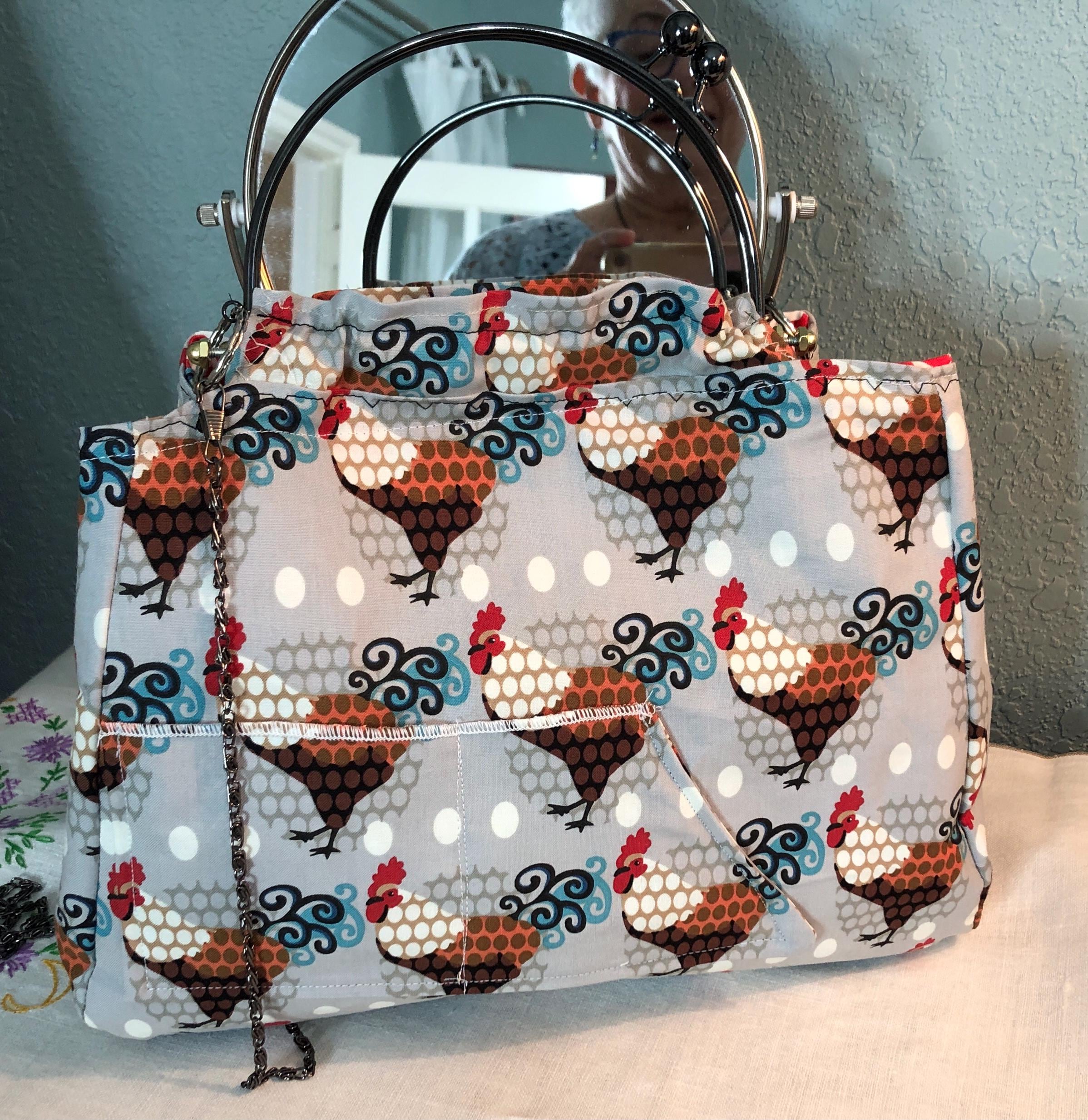 This beautiful fabric purse has a bronze colored kiss lock round metal frame. The purse was handmade by me using repurposed quilt cotton fabric. The cotton fabric has beautiful red and gray roosters printed on gray and is lined in a complimentary cotton fabric with a red egg print The metal frame has two rods with acorn nut screws on the ends so that you can use the same frame for multiple purses. If you would like to purchase another purse in a different color, to have an interchangable purse just message me and the backup purse can be custom made for you.