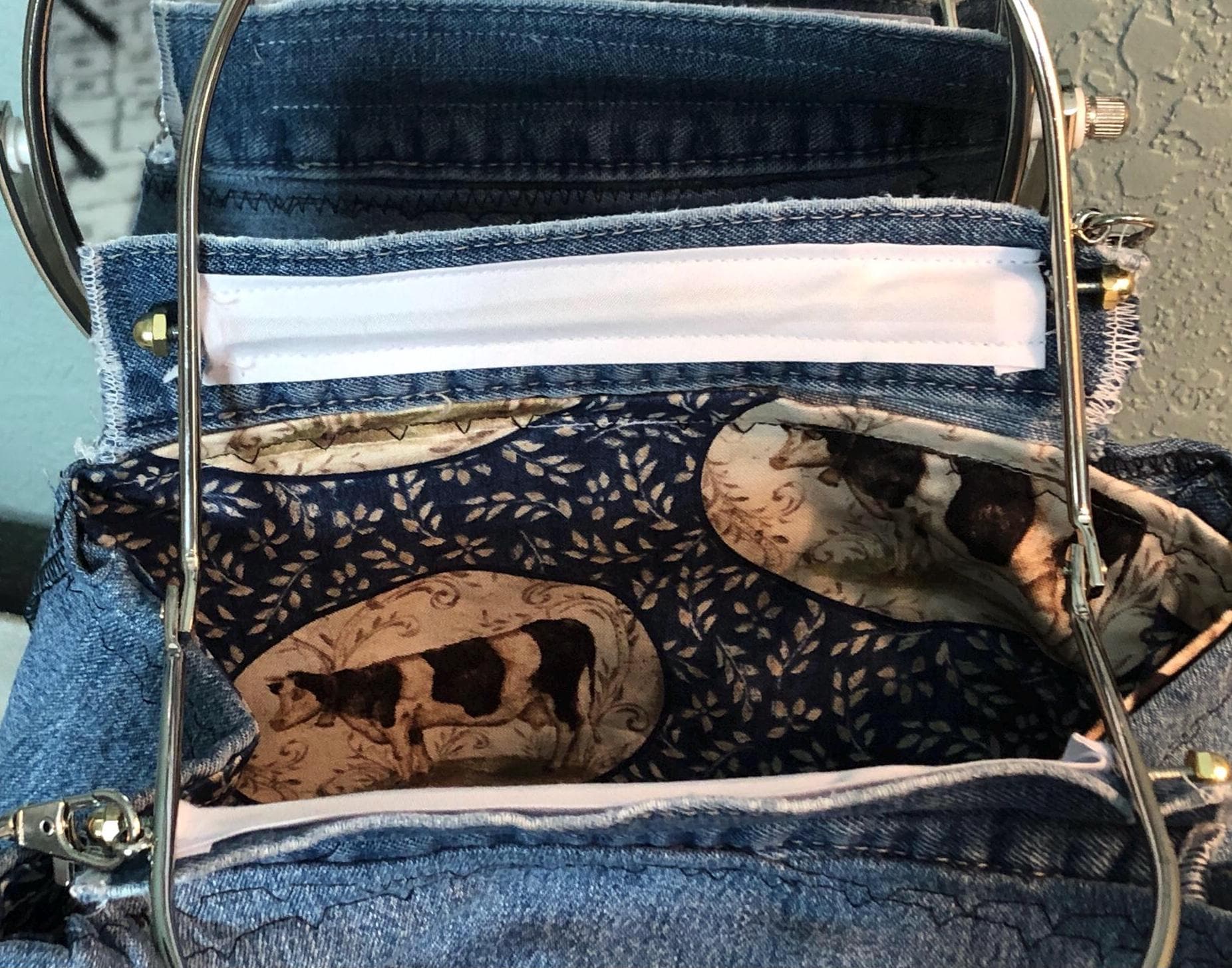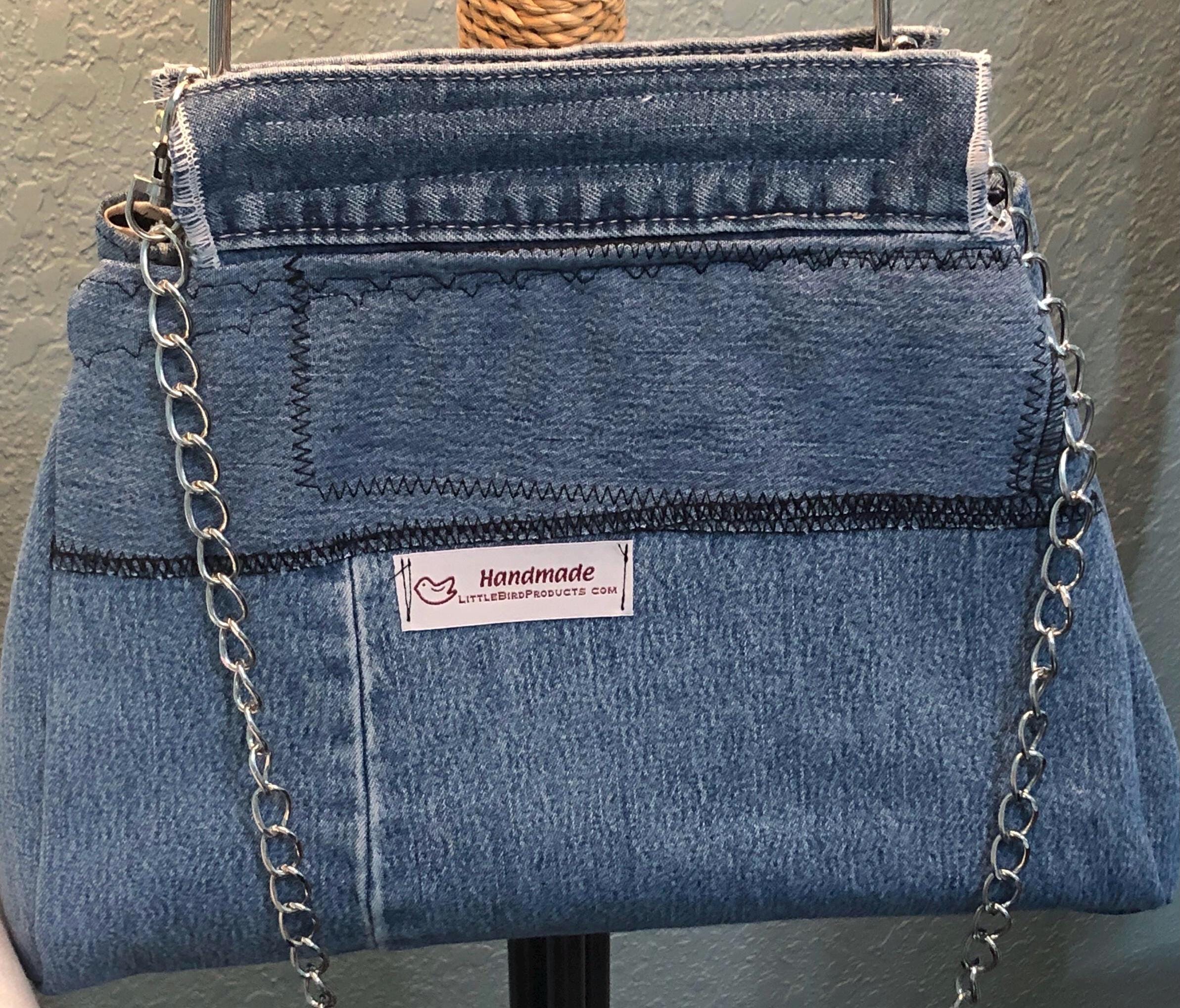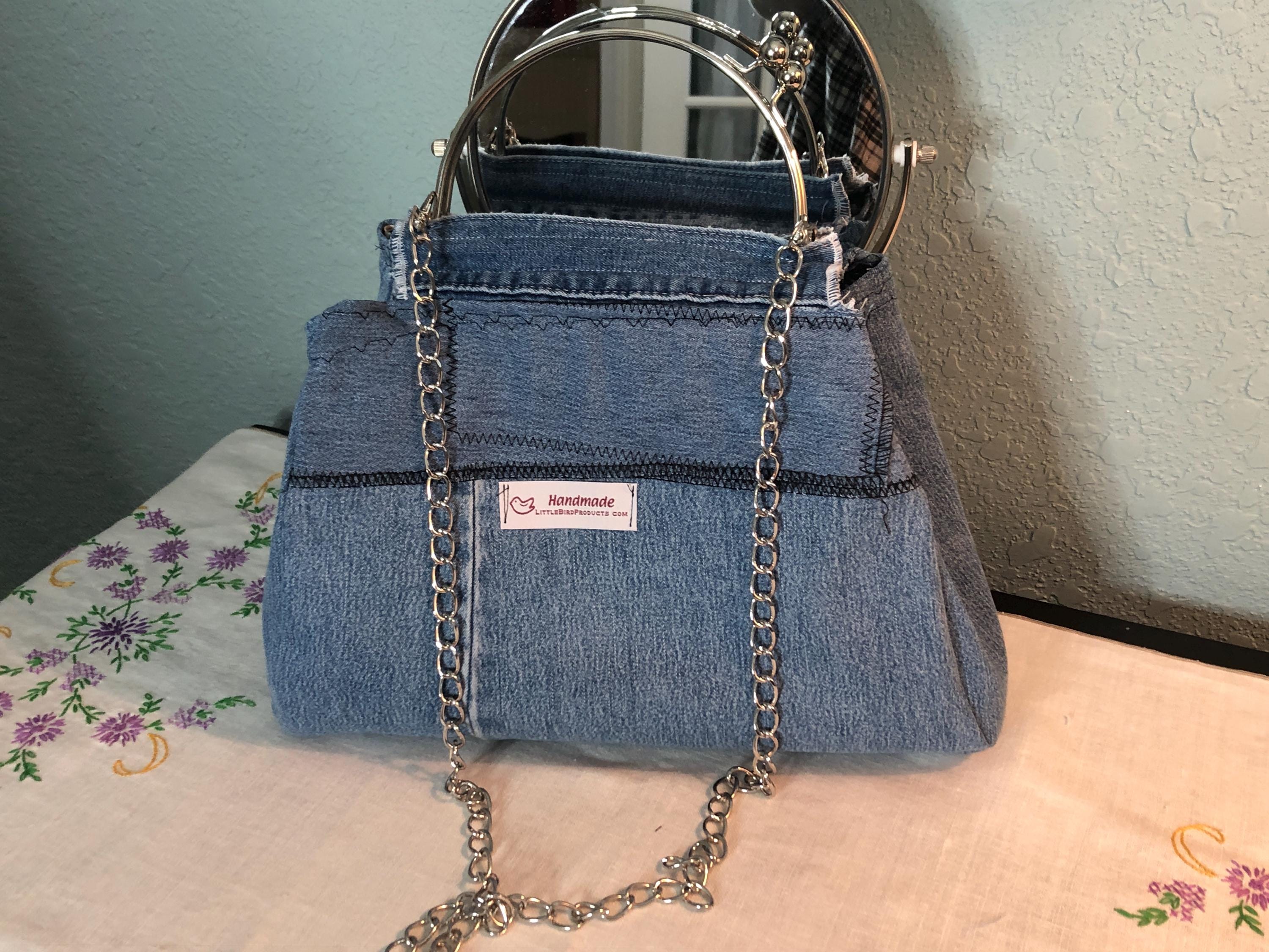 This beautiful fabric purse has a silver colored kiss lock round metal frame. The purse was handmade by me using a patchwork of upcycled blue denim fabric. The cotton fabric lining in white and blue in a cow print. The metal frame has two rods with acorn nut screws on the ends so that you can use the same frame for multiple purses. If you would like to purchase another purse in a different color, to have an interchangable purse just message me and the backup purse can be custom made for you.