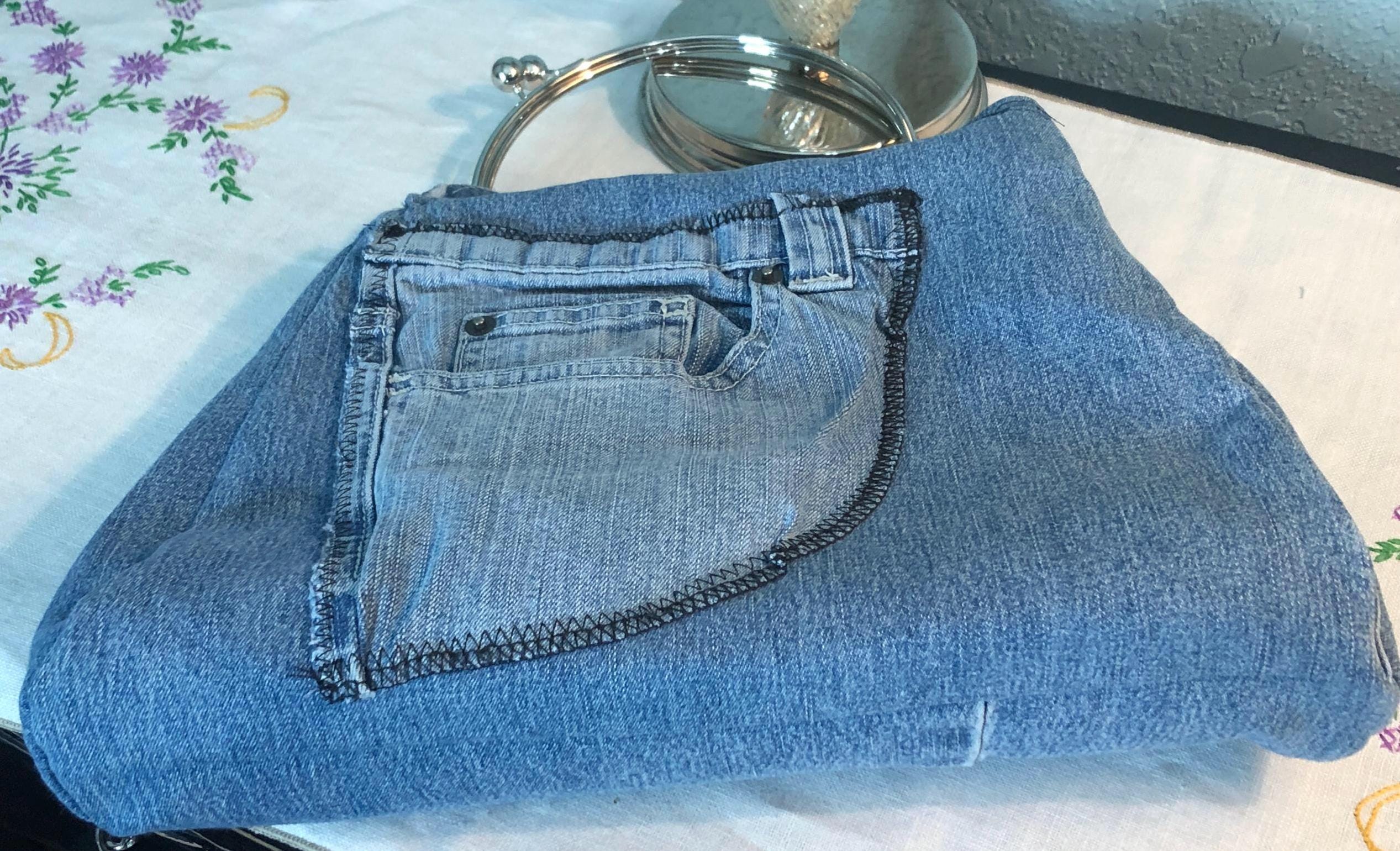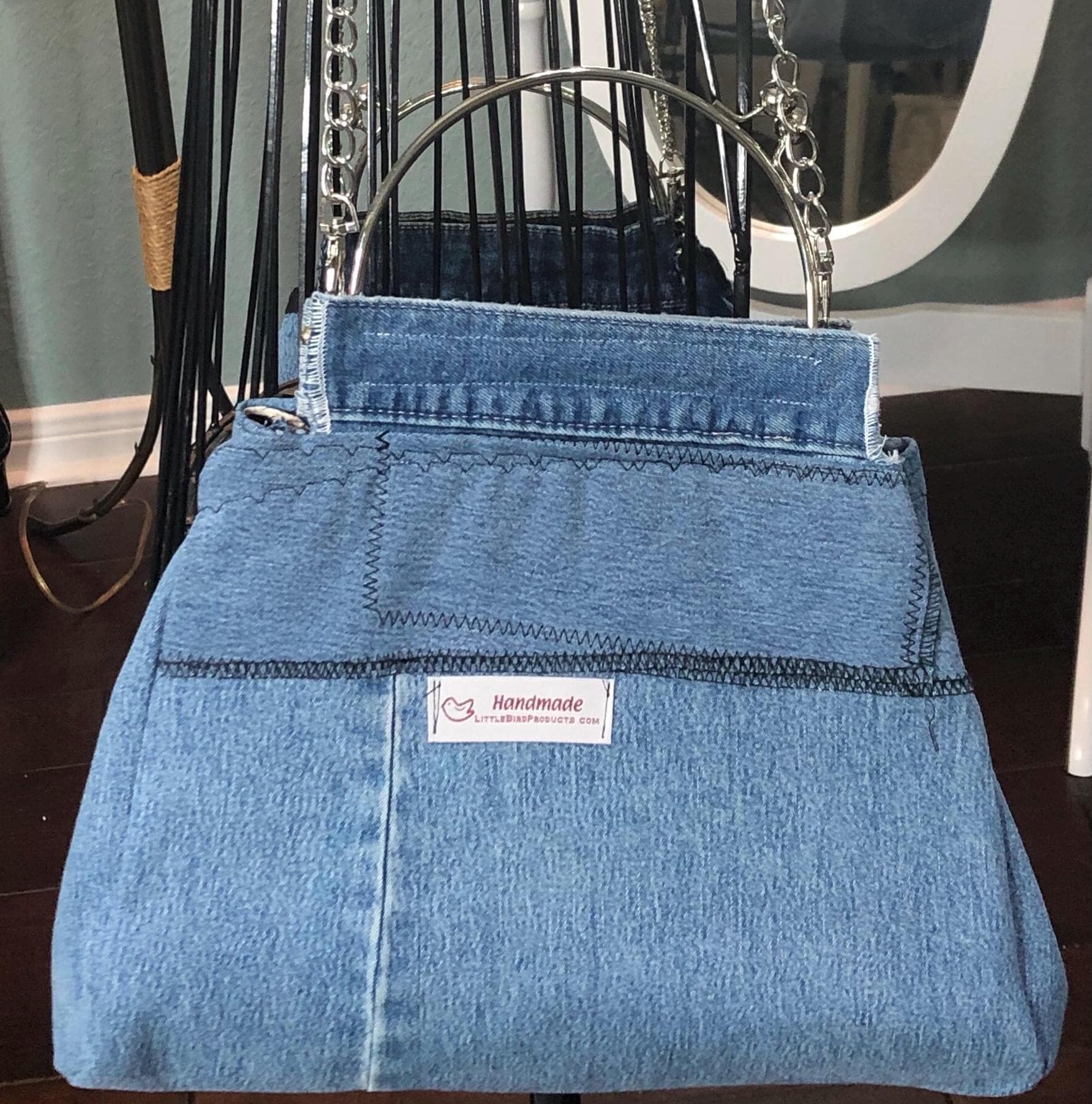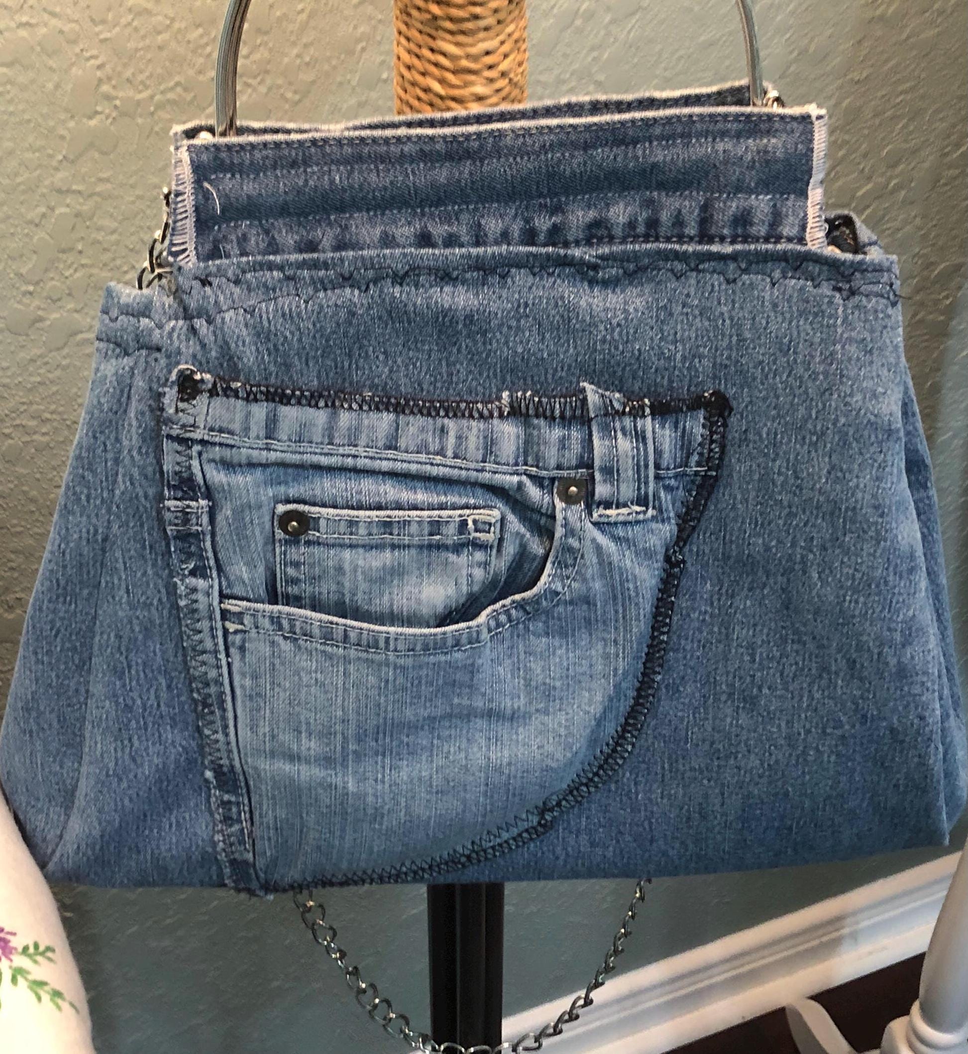 This beautiful fabric purse has a silver colored kiss lock round metal frame. The purse was handmade by me using a patchwork of upcycled blue denim fabric. The cotton fabric lining in white and blue in a cow print. The metal frame has two rods with acorn nut screws on the ends so that you can use the same frame for multiple purses. If you would like to purchase another purse in a different color, to have an interchangable purse just message me and the backup purse can be custom made for you.