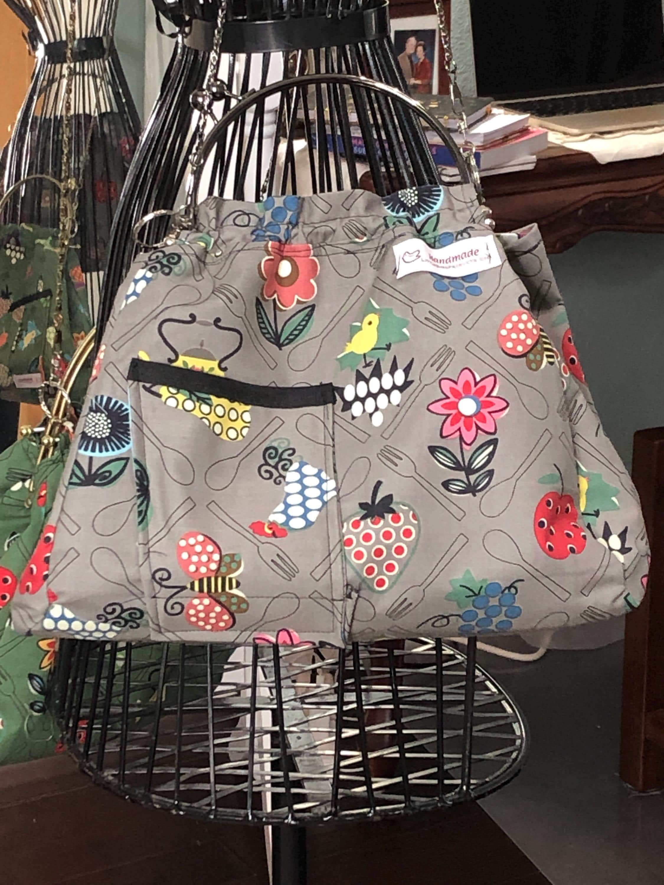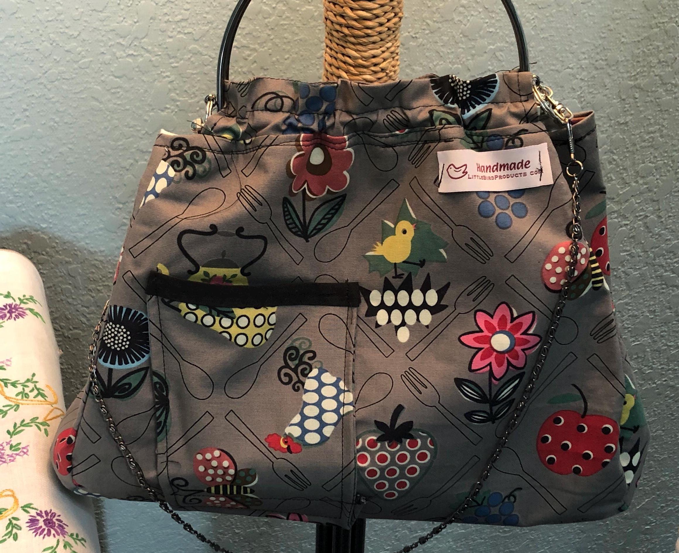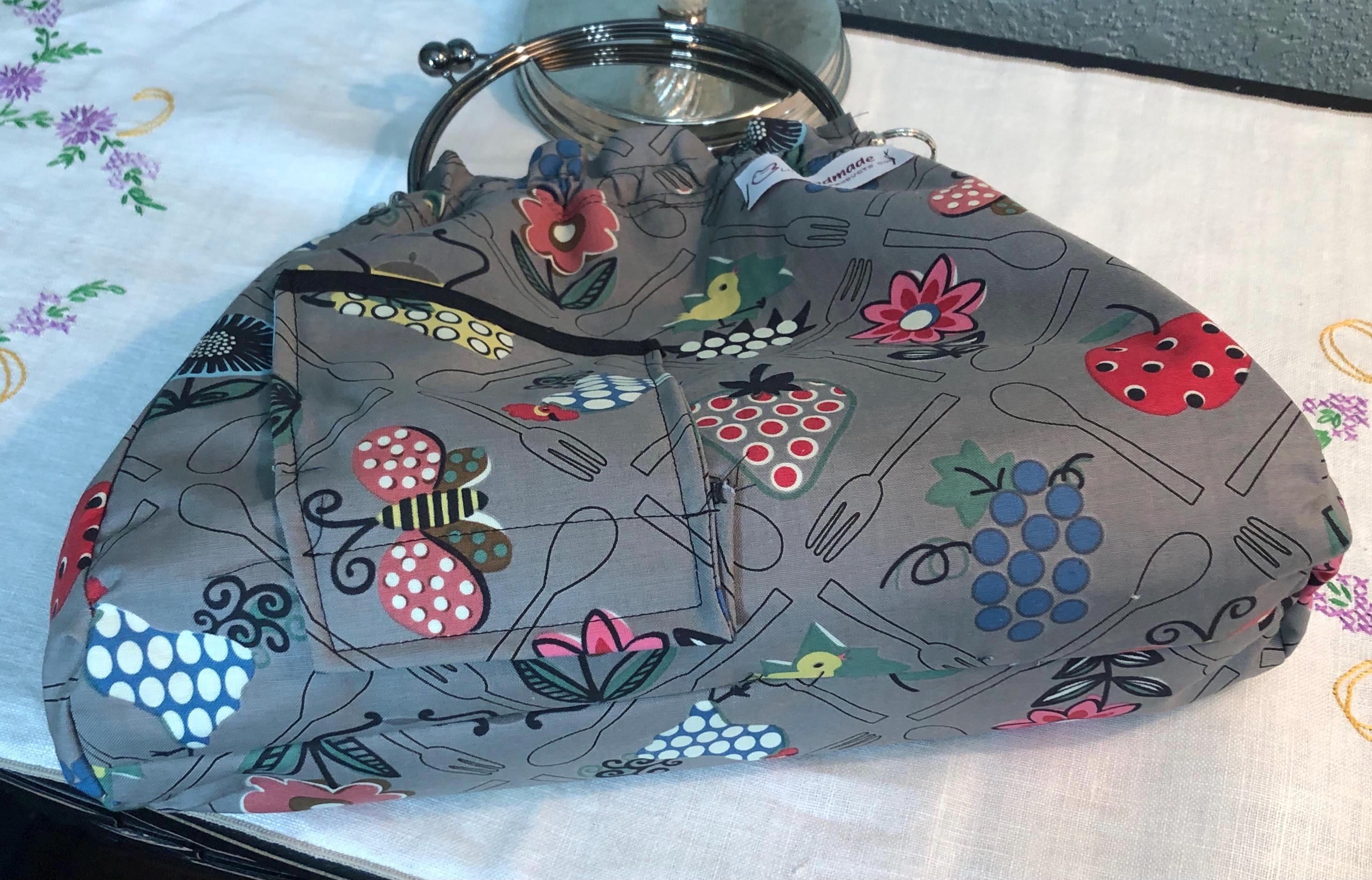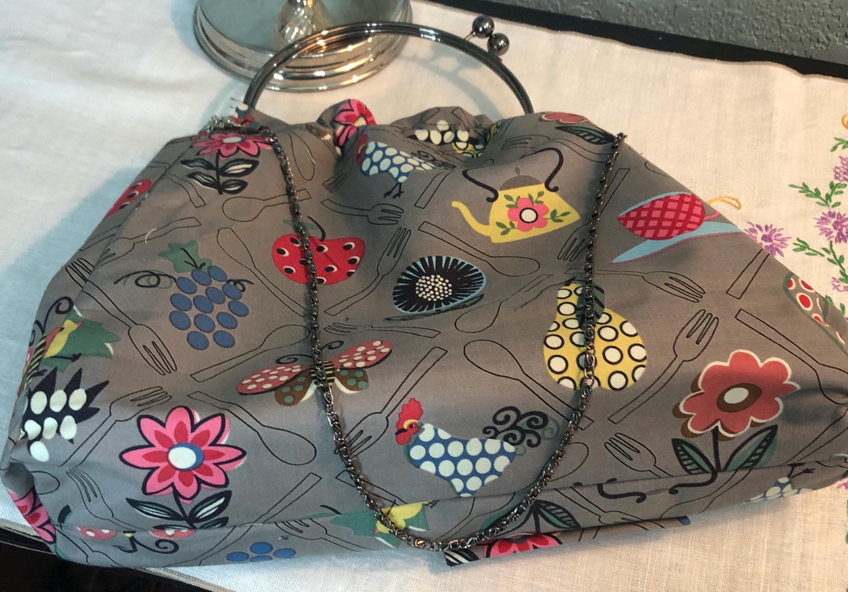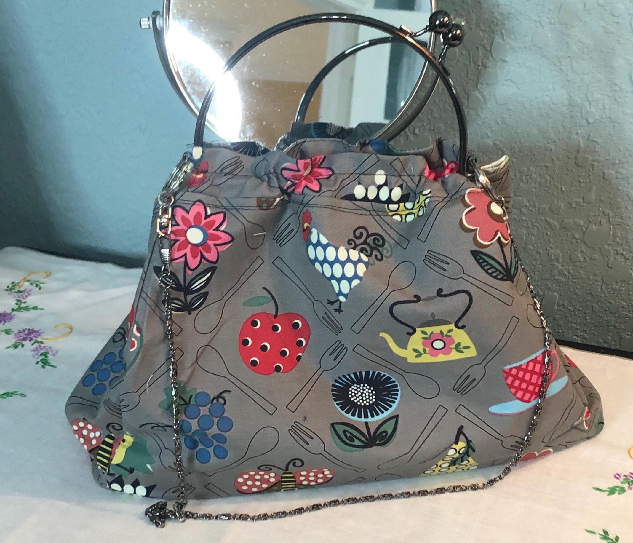 This beautiful fabric purse has a black colored kiss lock round metal frame. The purse was handmade by me using repurposed quilt cotton fabric. The cotton fabric has beautiful roosters, fruit, flowers and teapots printed on gray and is lined in a complimentary cotton fabric with a tea pot print The metal frame has two rods with acorn nut screws on the ends so that you can use the same frame for multiple purses. If you would like to purchase another purse in a different color, to have an interchangable purse just message me and the backup purse can be custom made for you.