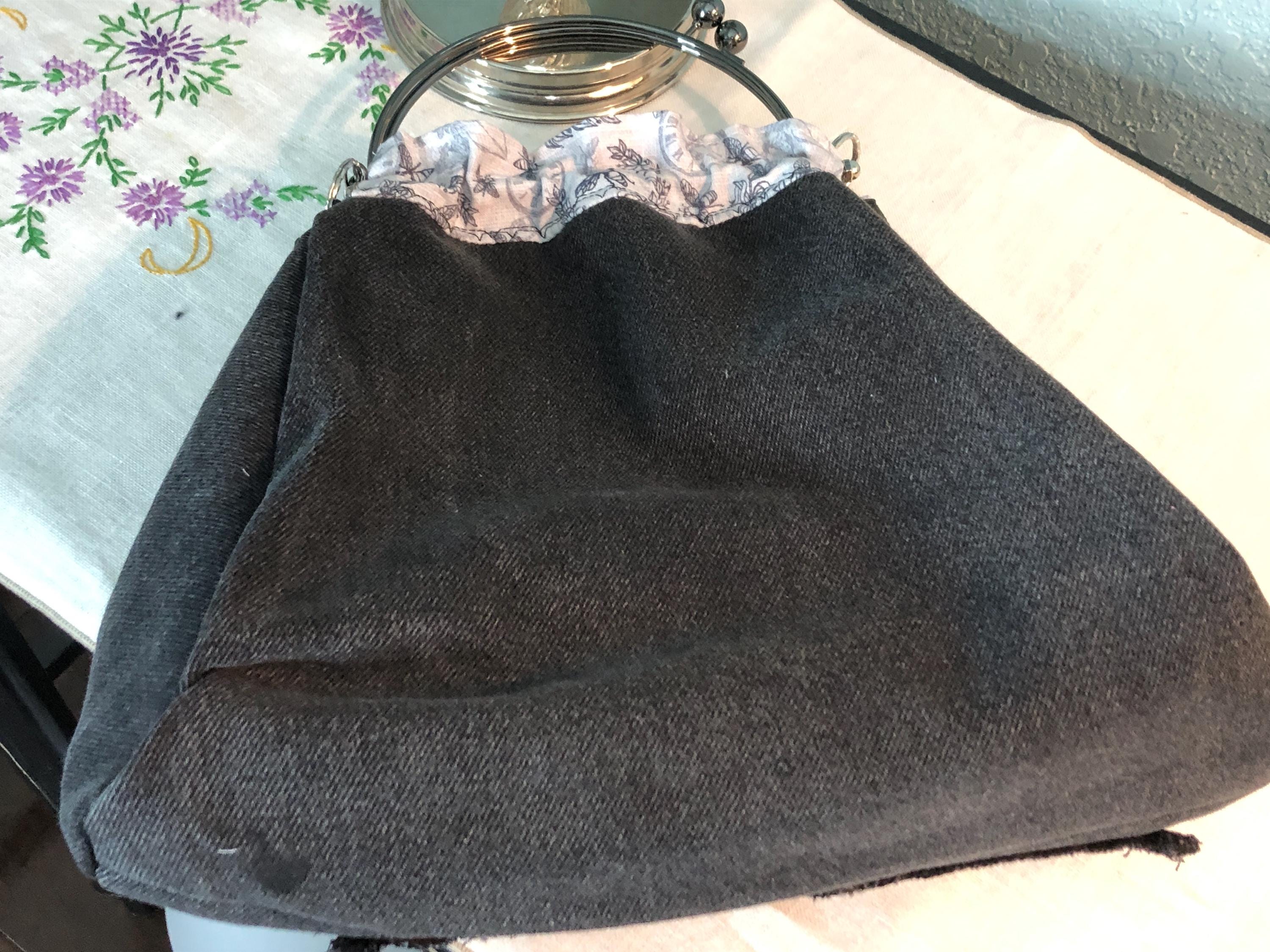 This beautiful fabric purse has a black kiss lock round metal frame. The purse was handmade by me using upcycled black denim fabric. The cotton fabric lining in gray with bees, crowns, and other cute prints. The metal frame has two rods with acorn nut screws on the ends so that you can use the same frame for multiple purses. If you would like to purchase another purse in a different color, to have an interchangable purse just message me and the backup purse can be custom made for you.