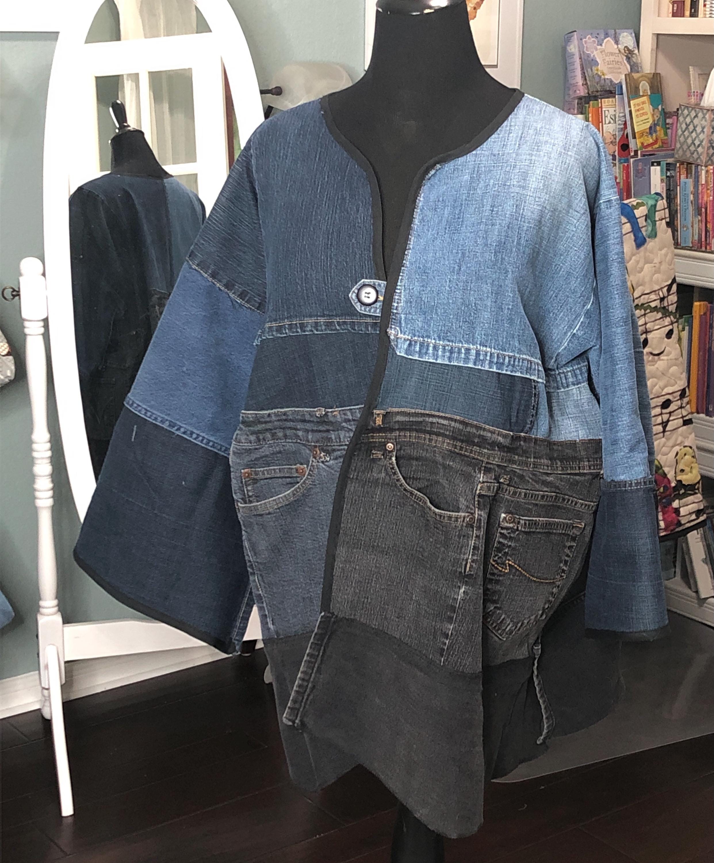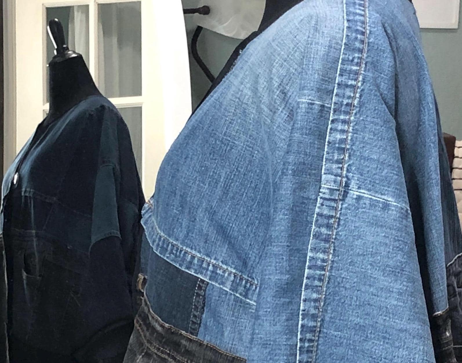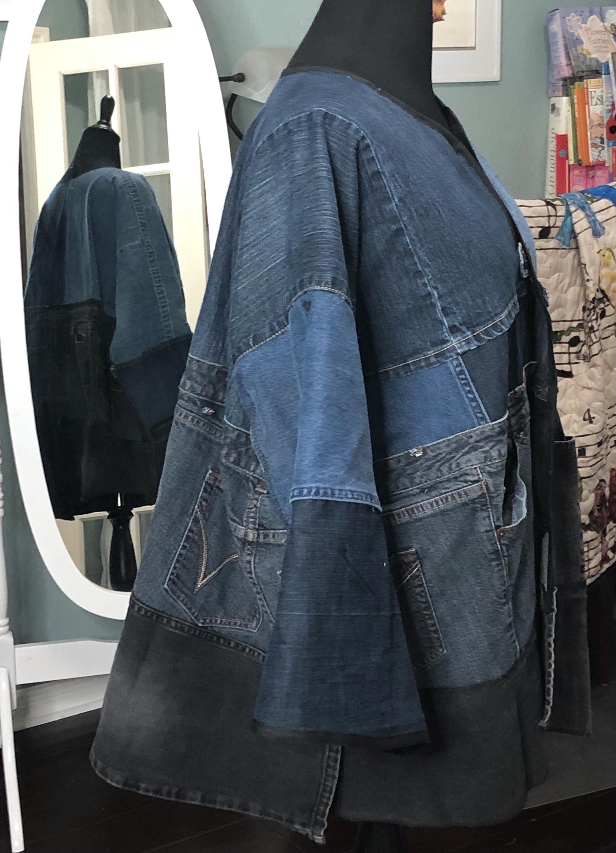 This unique bog coat is made from a patchwork collage of black and blue denim fabrics. Upcycled from many pairs of jeans, I call this a coat of many pockets. Bog coats are easy fitting minimal waste designed. In keeping with this zero waste intent, I kept all of the top part of the jeans with the pockets and retained their function.