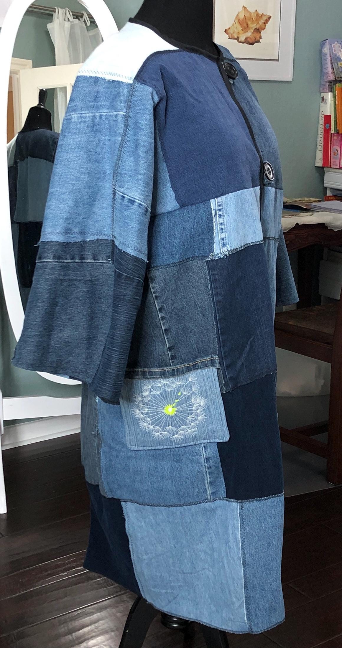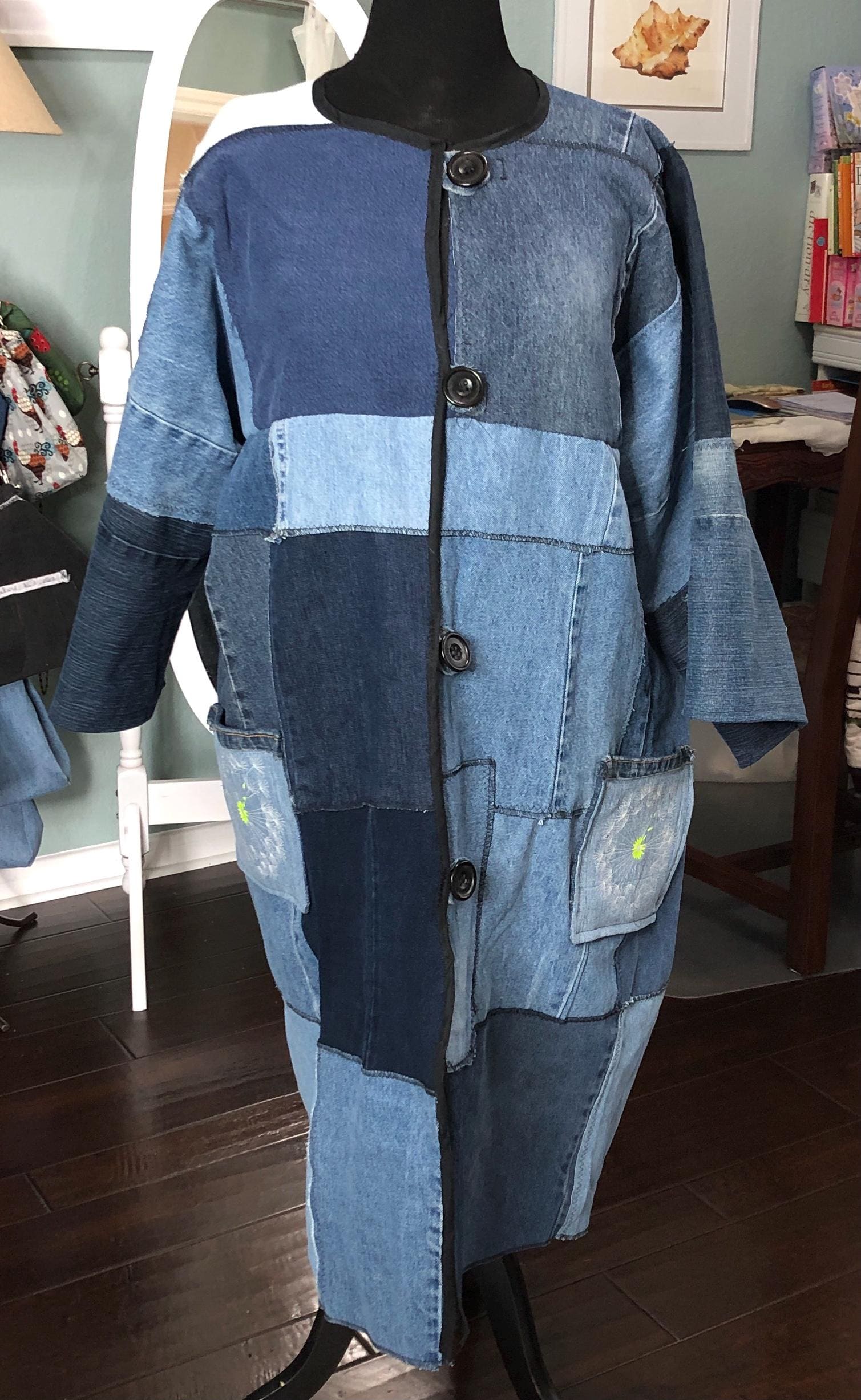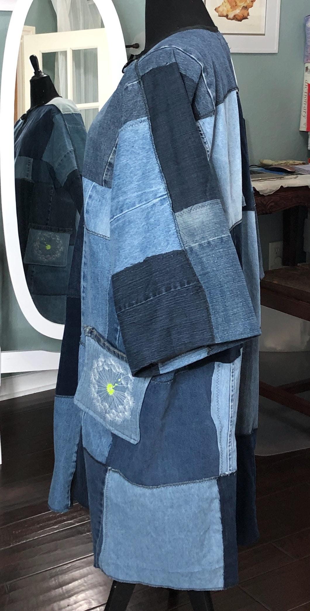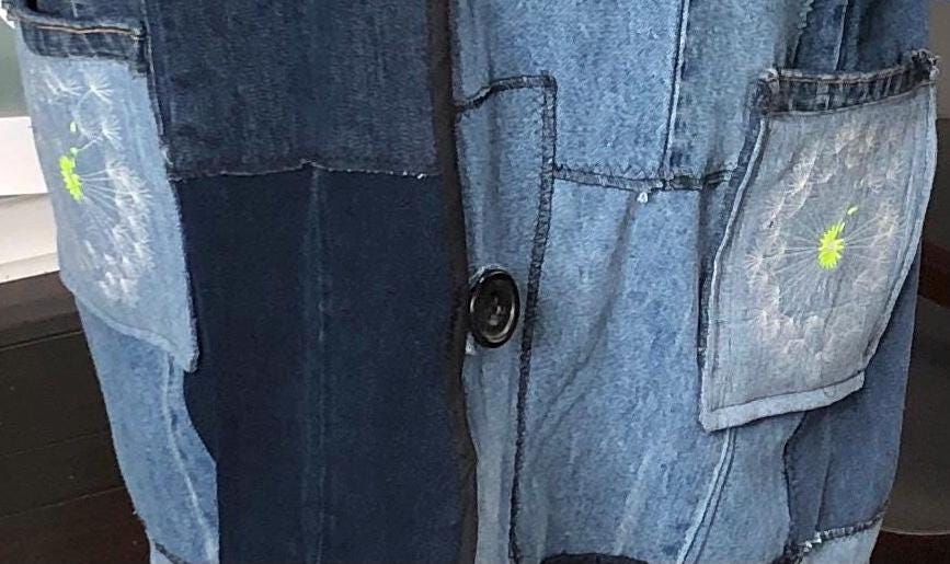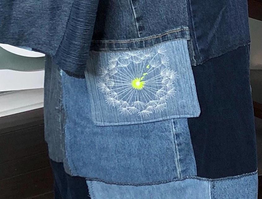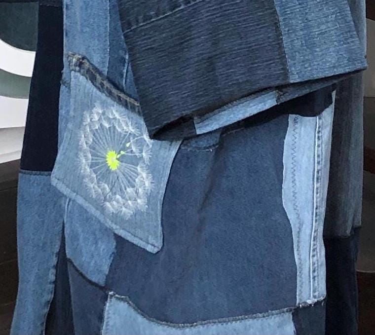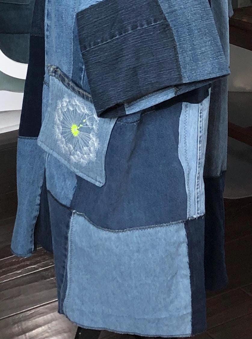 This unique bog coat is made from a patchwork of black and blue denim fabrics. It was upcycled from many pairs of jeans. Bog coats are easy fitting minimal waste designed. In keeping with this zero waste intent, I assembled approximately 35 10” squares of a variety of denim pieces into a rectangle of fabric and two extra squares that I embroidered with a wind swept dandelion for the pockets. The front of the coat is trimmed with black bias binding and there are four denim loops that form the front closure around four large vintage buttons.