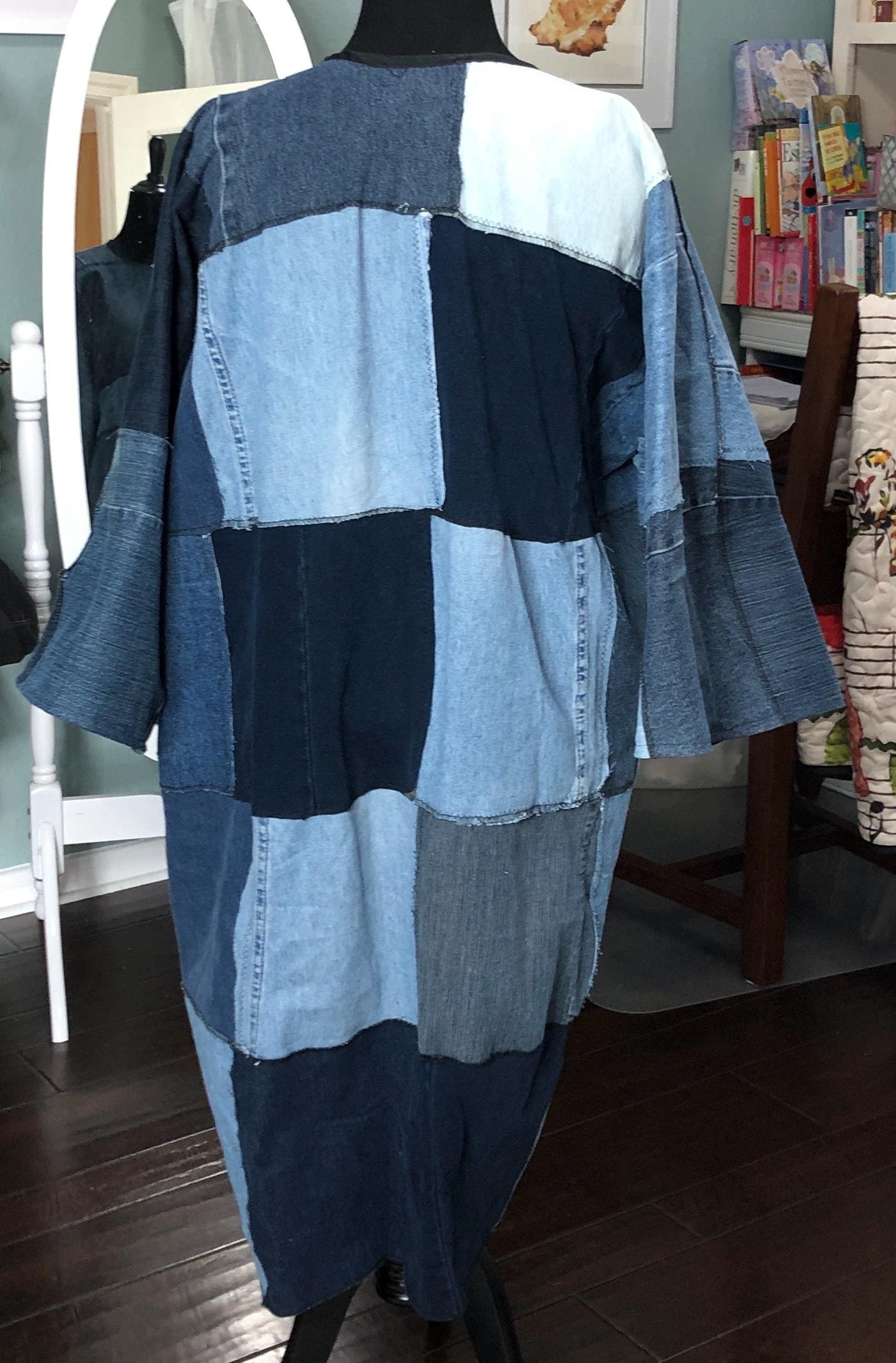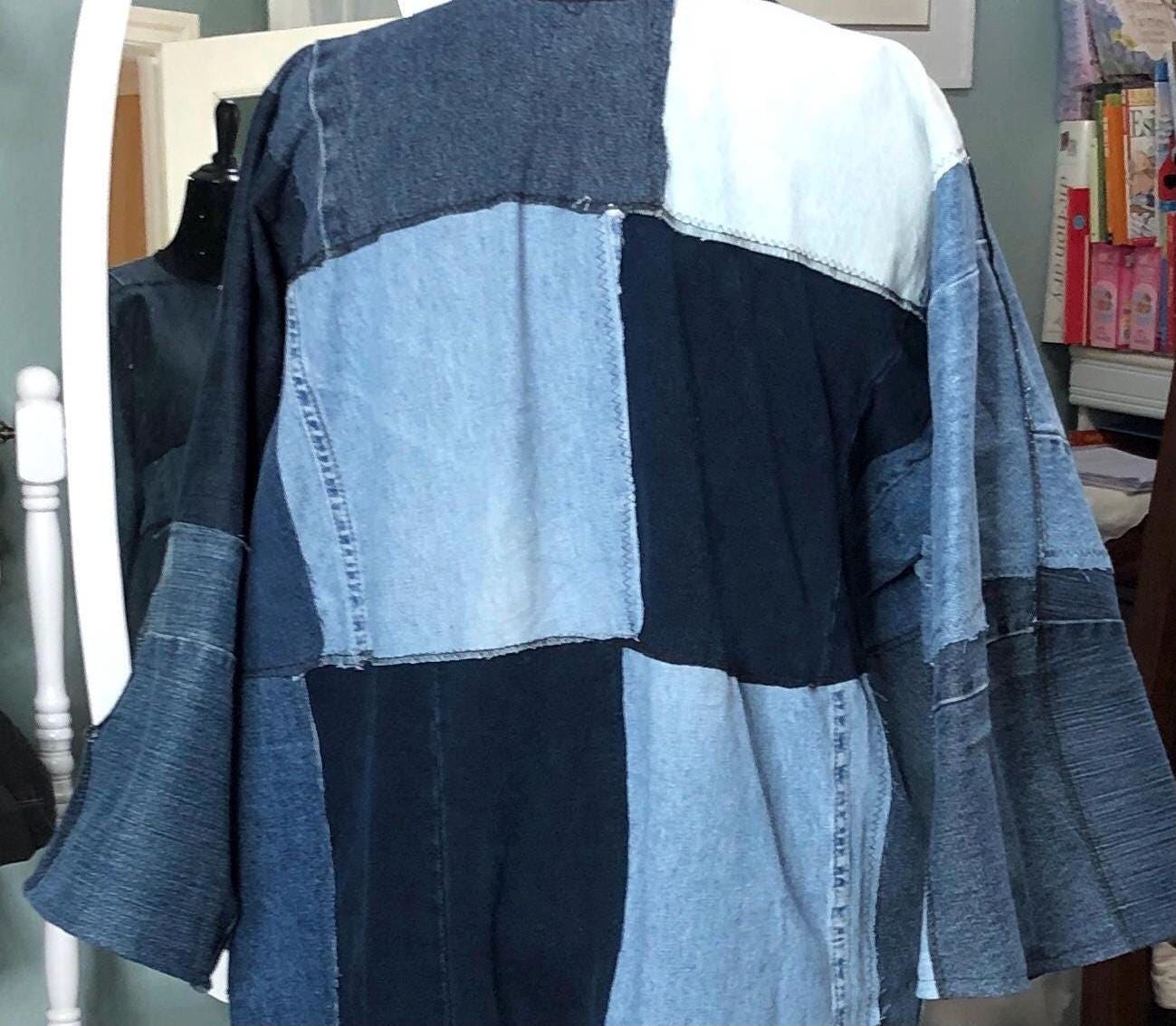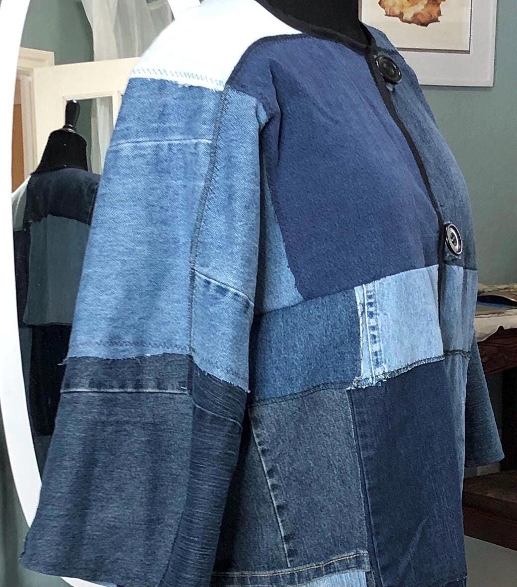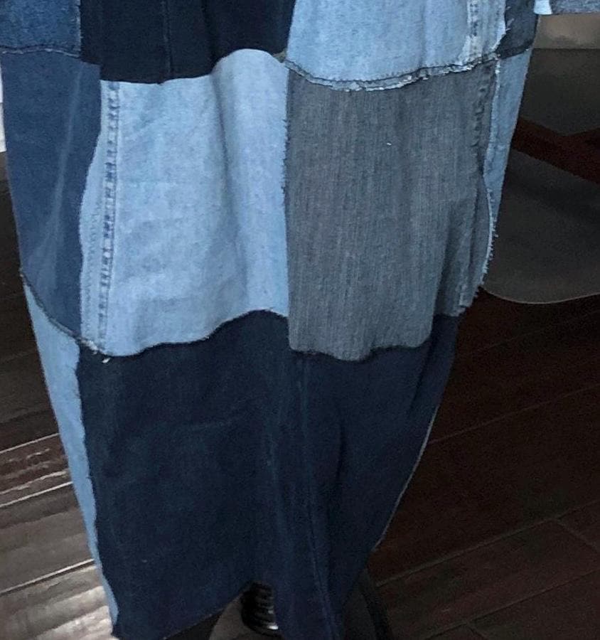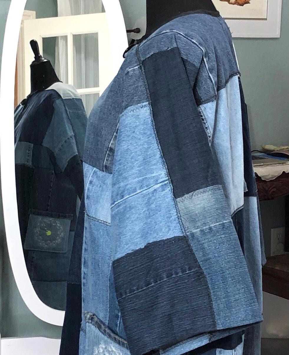 This unique bog coat is made from a patchwork of black and blue denim fabrics. It was upcycled from many pairs of jeans. Bog coats are easy fitting minimal waste designed. In keeping with this zero waste intent, I assembled approximately 35 10” squares of a variety of denim pieces into a rectangle of fabric and two extra squares that I embroidered with a wind swept dandelion for the pockets. The front of the coat is trimmed with black bias binding and there are four denim loops that form the front closure around four large vintage buttons.