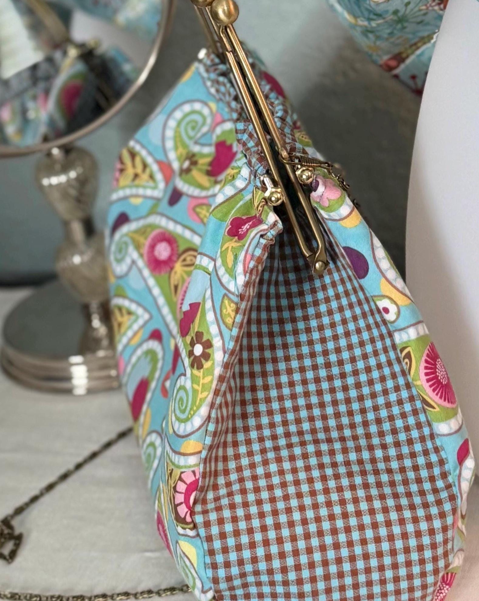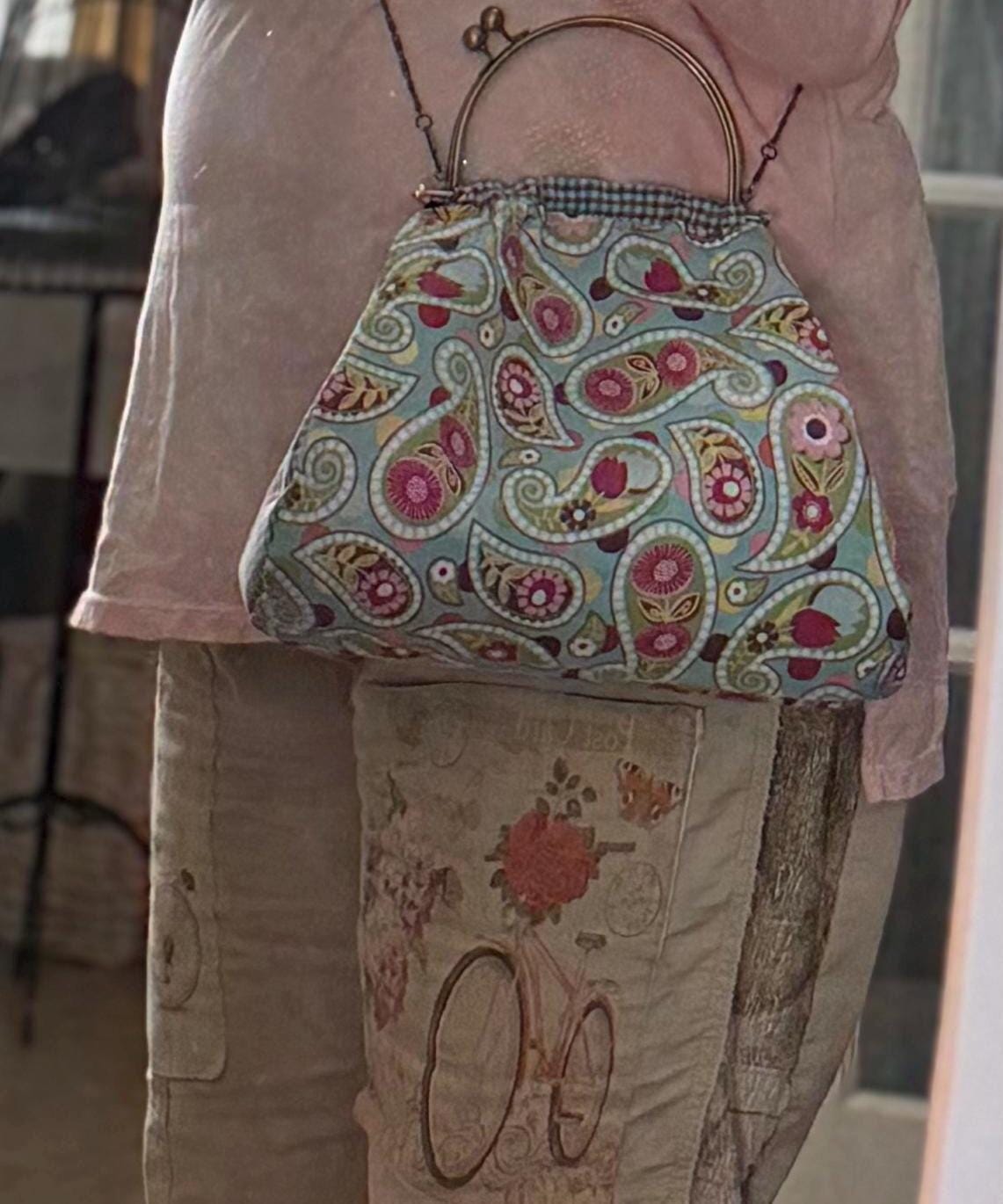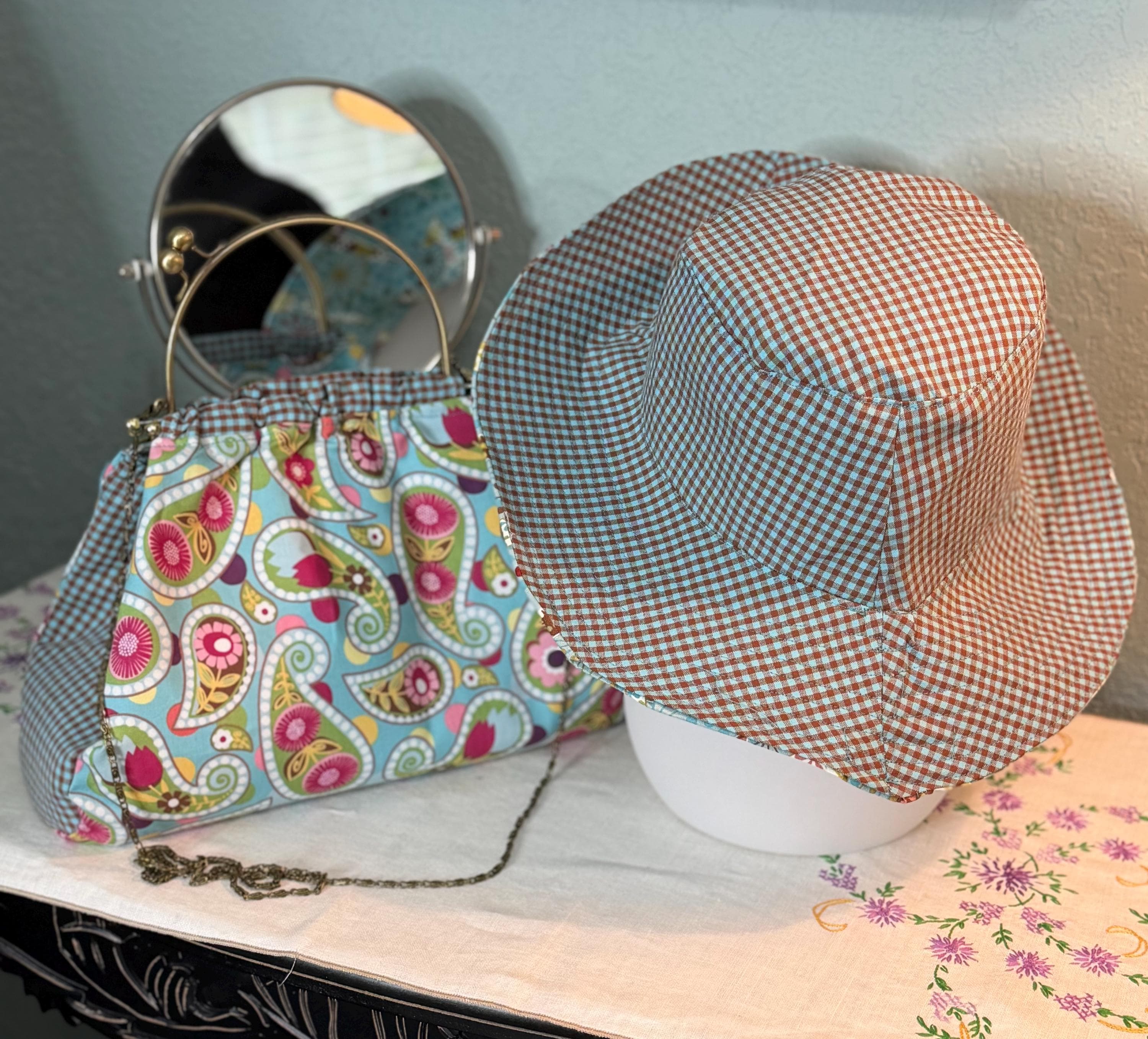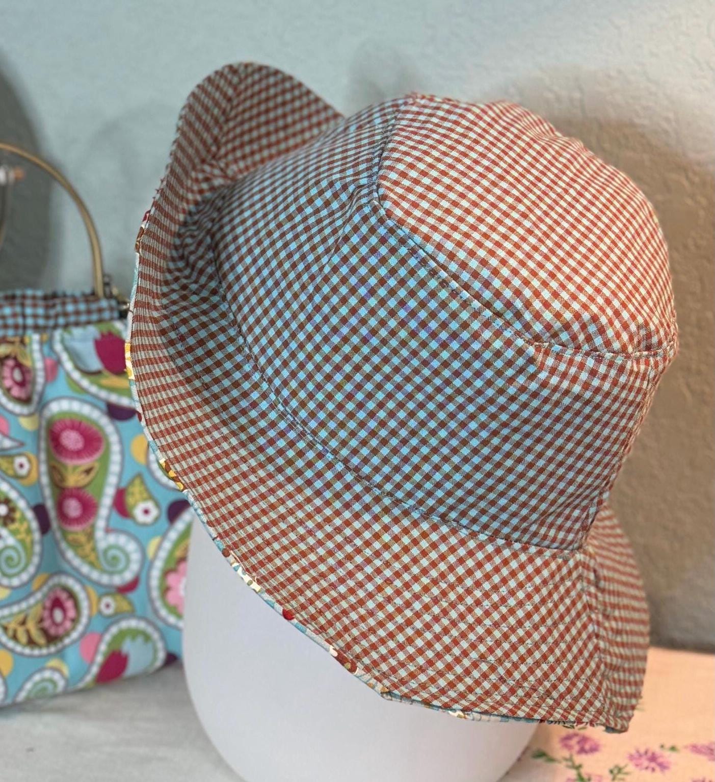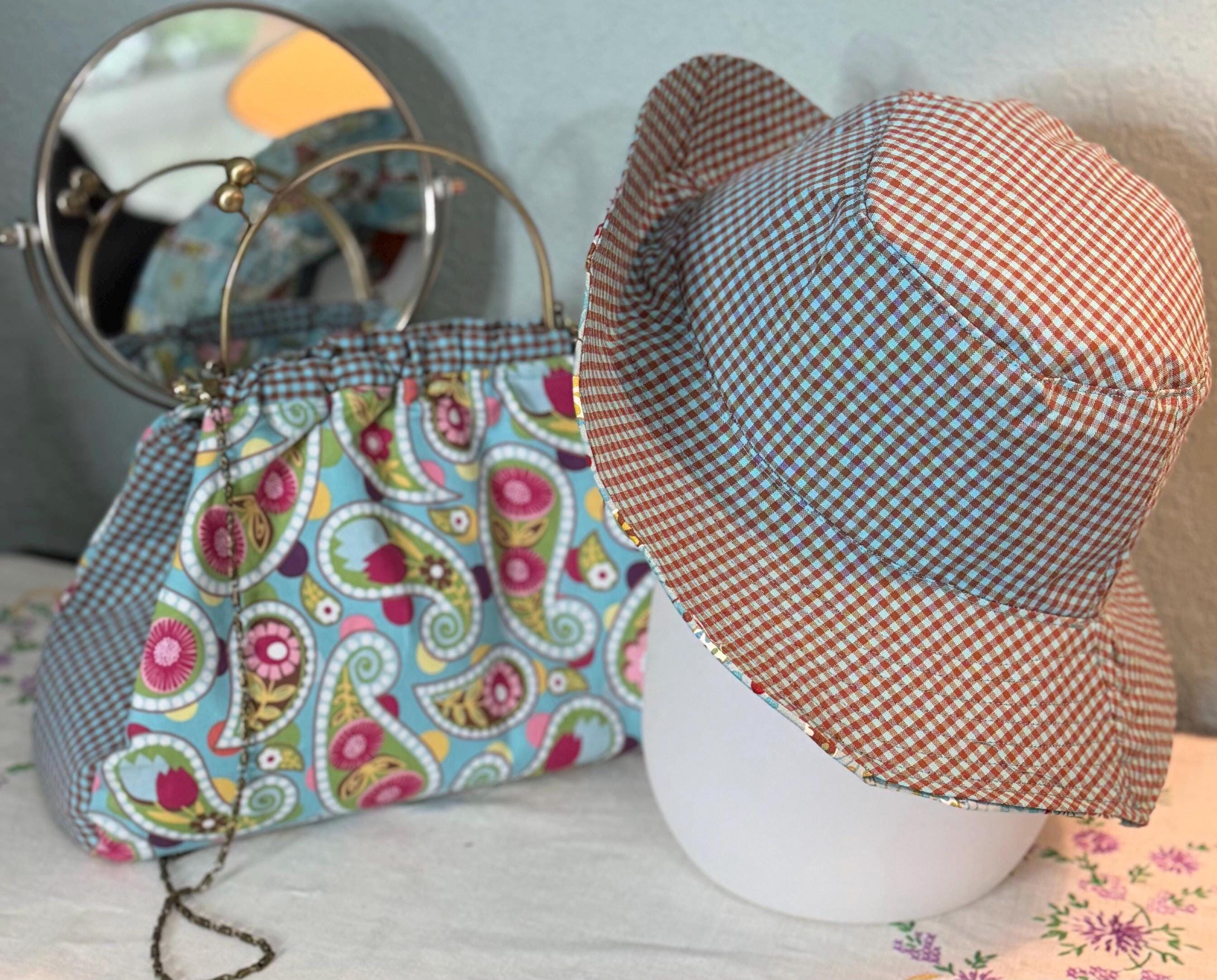 This beautiful bucket hat and framed purse set is one of a kind perfect. The fabric purse has a bronze colored kiss lock round metal frame. The bucket hat is reversible with Paris and Eiffel Tower aqua print on one side and blue gingham check on the other, This hat will fit small to large comfortably. The purse was handmade by me using repurposed quilt cotton fabric. The cotton fabric has paisley aqua swirls and blue gingham checks and is lined in a complimentary cotton fabric. The metal frame has two rods with acorn nut screws on the ends so that you can use the same frame for multiple purses.