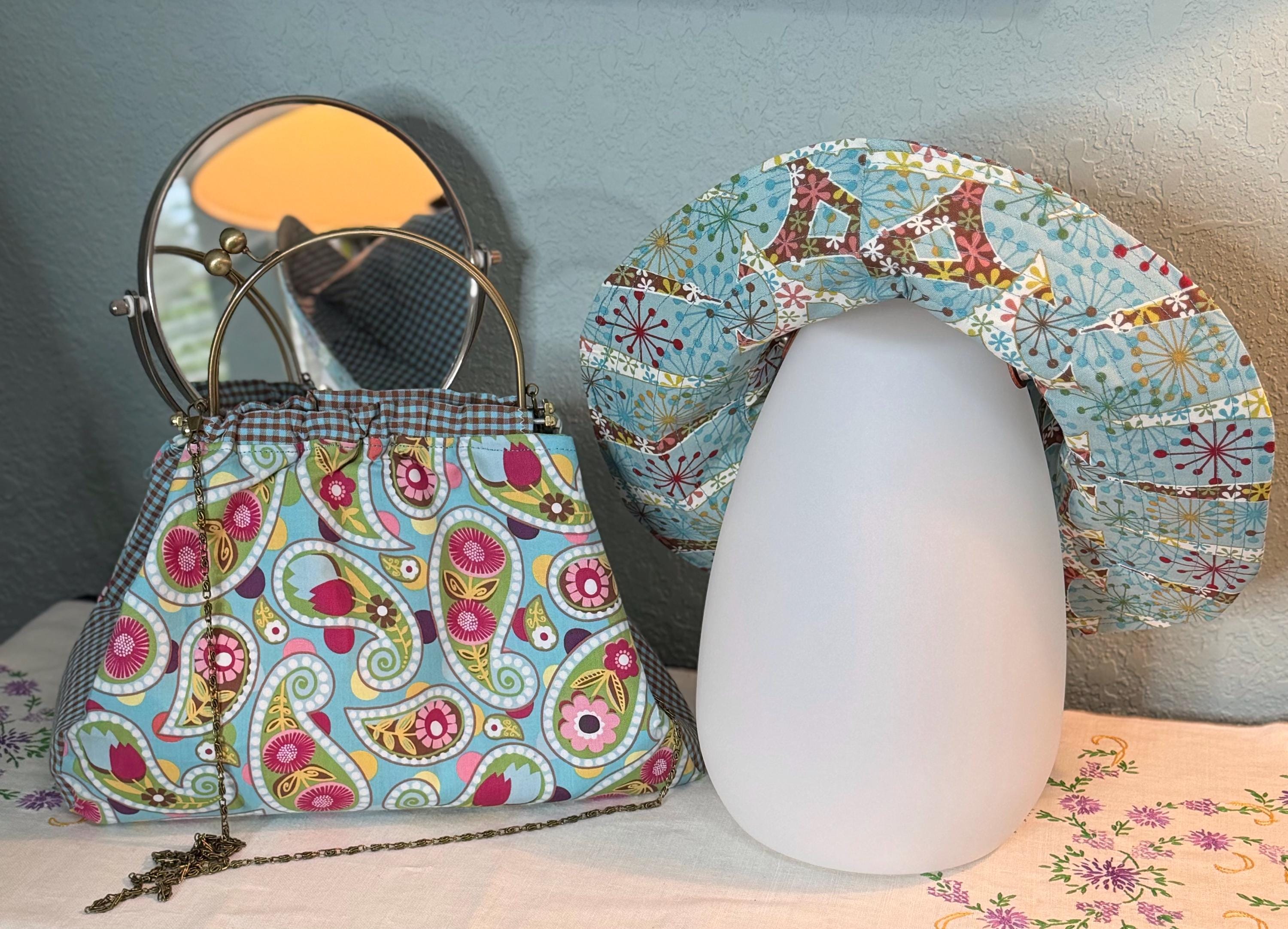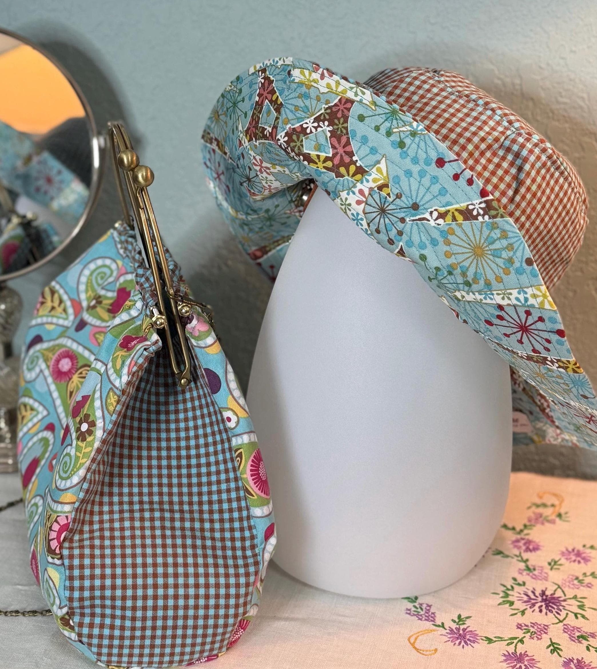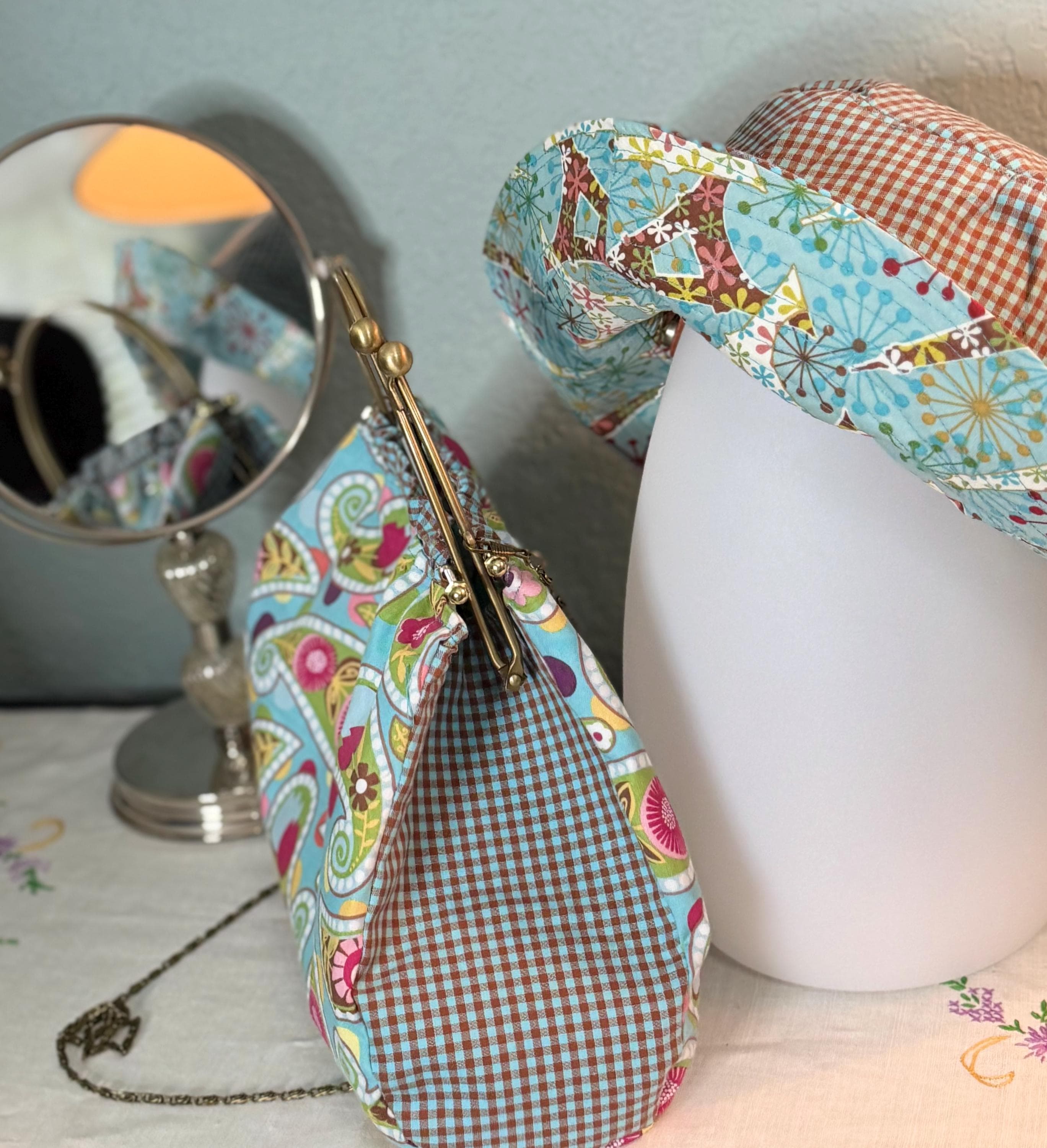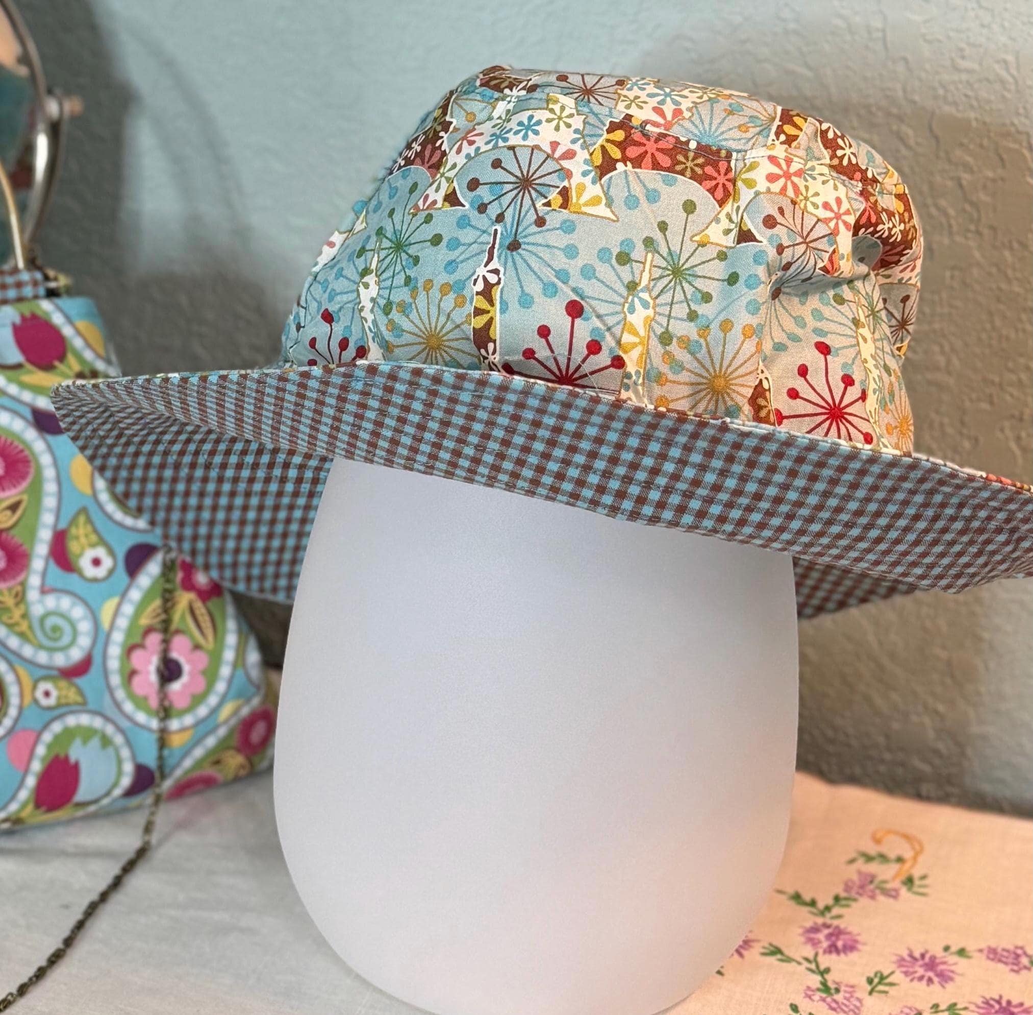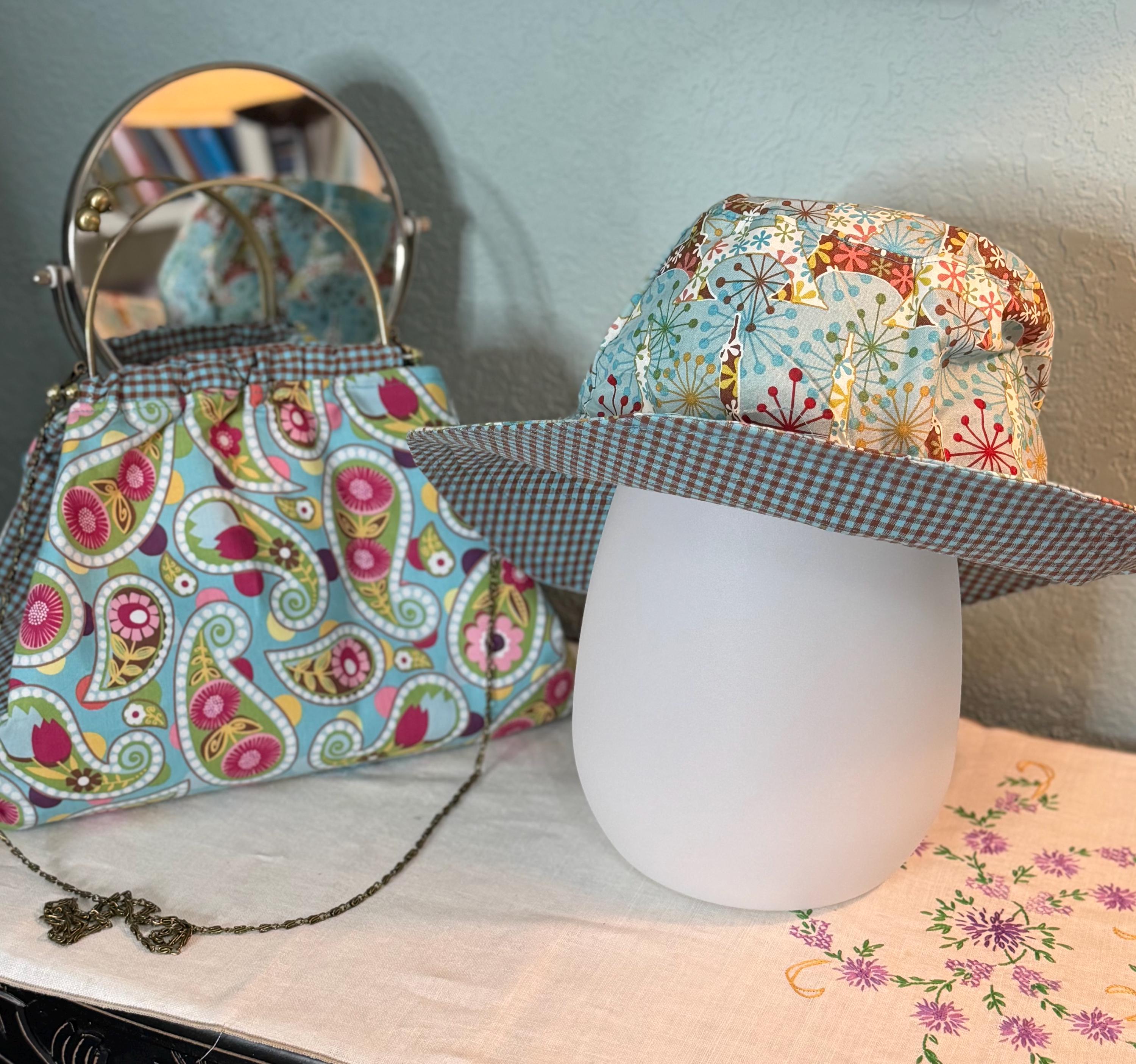 This beautiful bucket hat and framed purse set is one of a kind perfect. The fabric purse has a bronze colored kiss lock round metal frame. The bucket hat is reversible with Paris and Eiffel Tower aqua print on one side and blue gingham check on the other, This hat will fit small to large comfortably. The purse was handmade by me using repurposed quilt cotton fabric. The cotton fabric has paisley aqua swirls and blue gingham checks and is lined in a complimentary cotton fabric. The metal frame has two rods with acorn nut screws on the ends so that you can use the same frame for multiple purses.